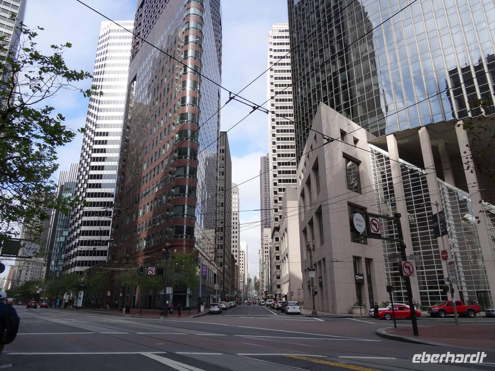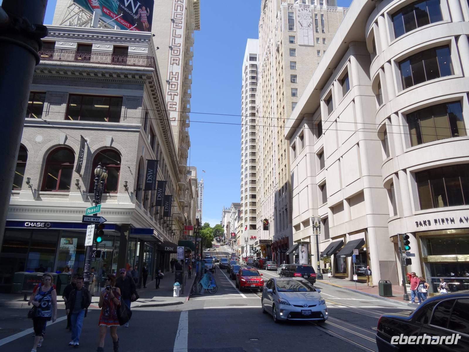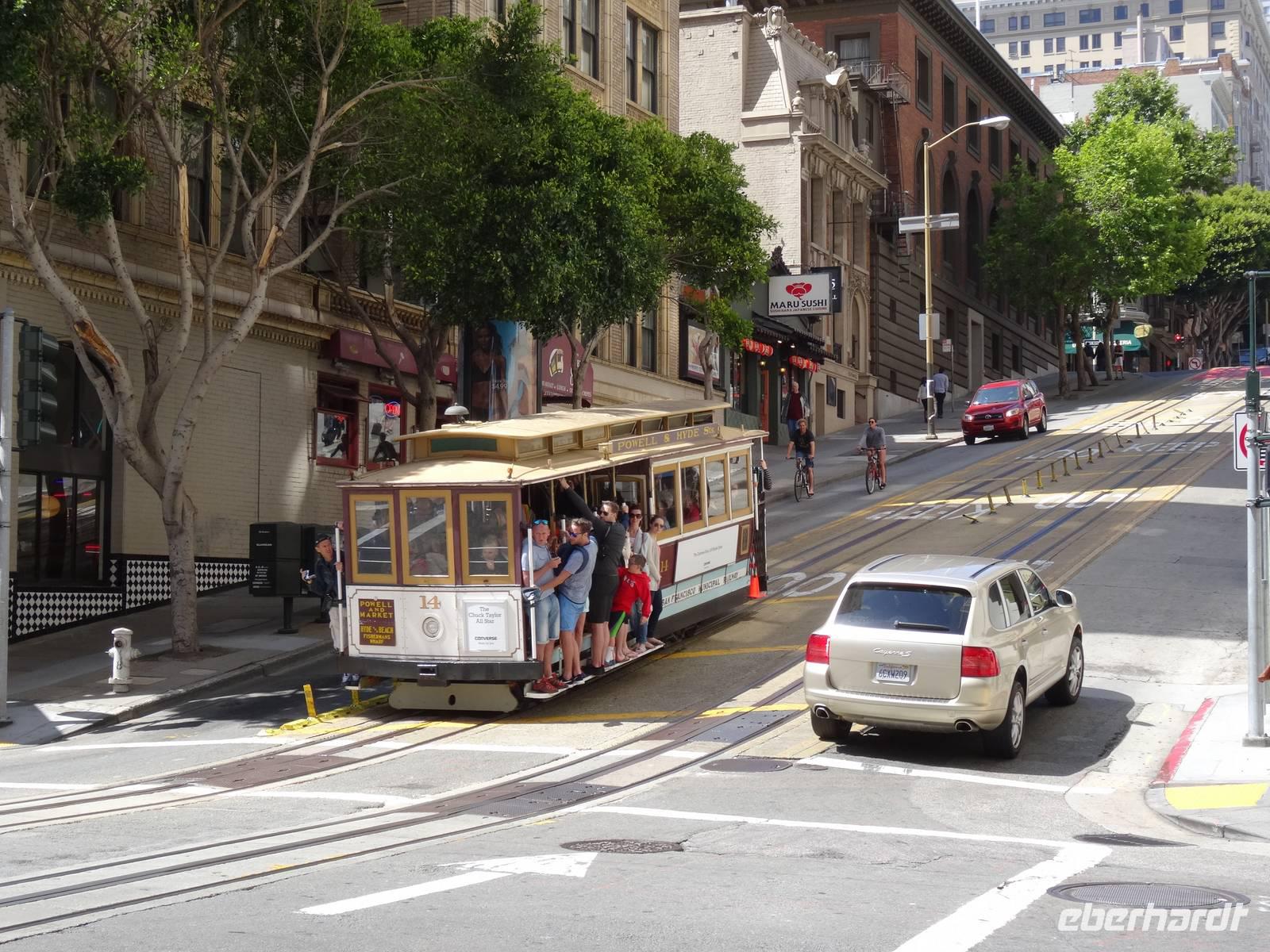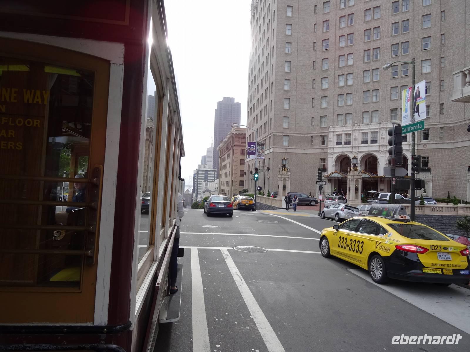 Bevor wir uns endgültig aus Kalifornien verabschiedeten, wollten wir die verbleibende Zeit bis zum Rückflug noch nutzen, um eine weitere weltberühmte Besonderheit in San Francisco kennenzulernen. Direkt ums Eck von unserem Hotel hatte eine der drei Cable-Car-Linien der Stadt ihren Endhaltepunkt. Nach einem ausgedehnten Frühstück schwangen wir uns im wahrsten Sinne des Wortes auf die Trittbretter der einzigen verbliebenen Kabelstraßenbahn der Welt, um im historischen Ambiente der heute nostalgisch anmutenden Vehikel durch die Stadt zu fahren. Die California-Street-Linie führte von unserem Hotel bis zum Ende des Finanzdistrikts, wo wir ausstiegen und das in der Nähe befindliche Embarcadero Ferry Terminal mit seinen kleinen Geschäften und dem angrenzenden Wochenmarkt besichtigten. Von hier aus hatten wir auch einen tollen Blick auf die Bay Bridge, die San Francisco mit der Nachbarstadt Oakland verbindet. Da das Wetter sehr schön war und wir noch Zeit bis zum Flughafentransfer hatten, spazierten wir die Market Street, eine der Hauptverkehrsadern der Stadt und gleichzeitig wichtige Einkaufs- und Geschäftsstraße, bis in Höhe Union Square entlang, um dann langsam den Rückweg zu unserem Hotel anzutreten. Am späten Vormittag hieß es dann endgültig Abschied nehmen, als uns der Bus in knapp fünfundzwanzig Minuten von Downtown San Francisco zum Internationalen Flughafen brachte. Nachdem wir eingecheckt und die obligatorische Sicherheitszeremonie hinter uns gebracht hatten, traten wir pünktlich und mit etwas Wehmut im Herzen den Heimflug an. Was wir aus dem Westen der USA mitnahmen, waren zwei überaus erlebnisreiche Wochen, angefüllt mit neuen Erfahrungen, vielen wunderbaren Momenten und eine Vielzahl von schönen Erinnerungen an die kulturelle und landschaftliche Vielfalt dieses einzigartigen Landstrichs. Wir verabschiedeten uns mit dem Gedanken, vielleicht irgendwann einmal ein „Welcome back" in unseren Ohren zu hören. Denn Raum für Entdeckungen ist noch immer genügend vorhanden...