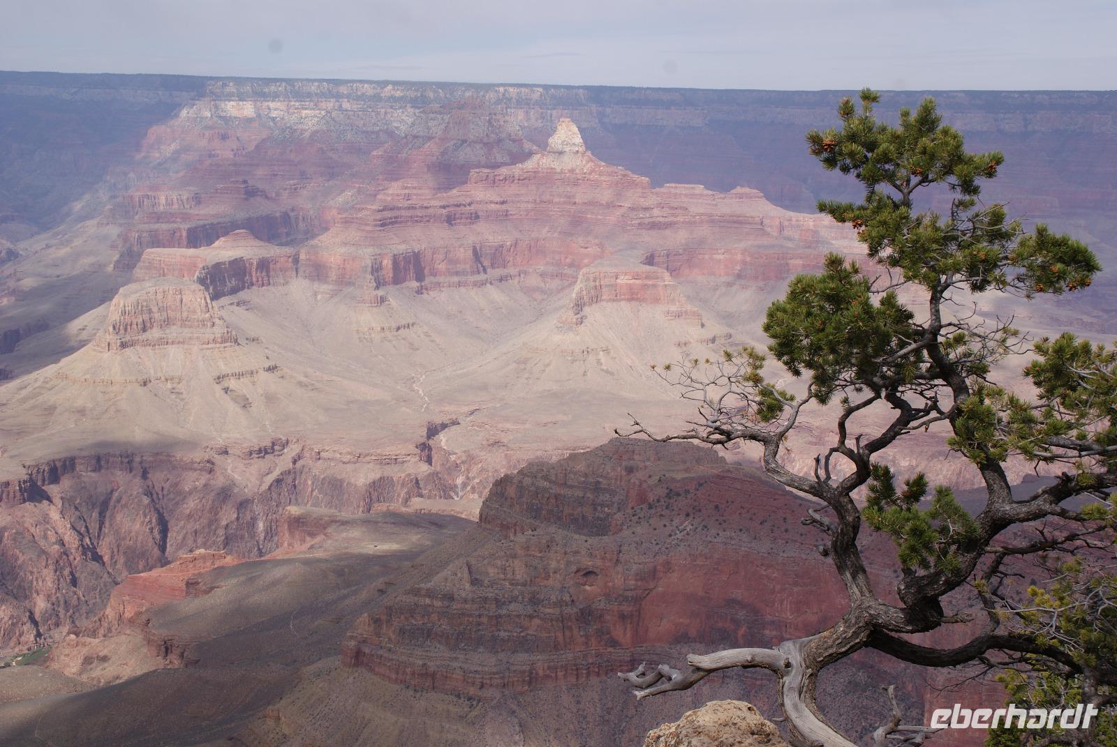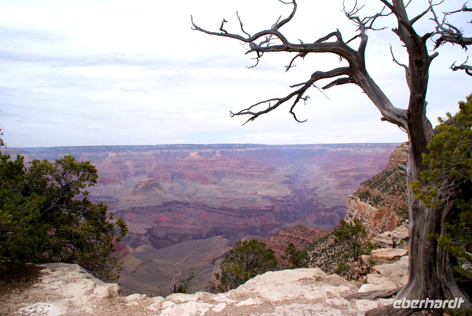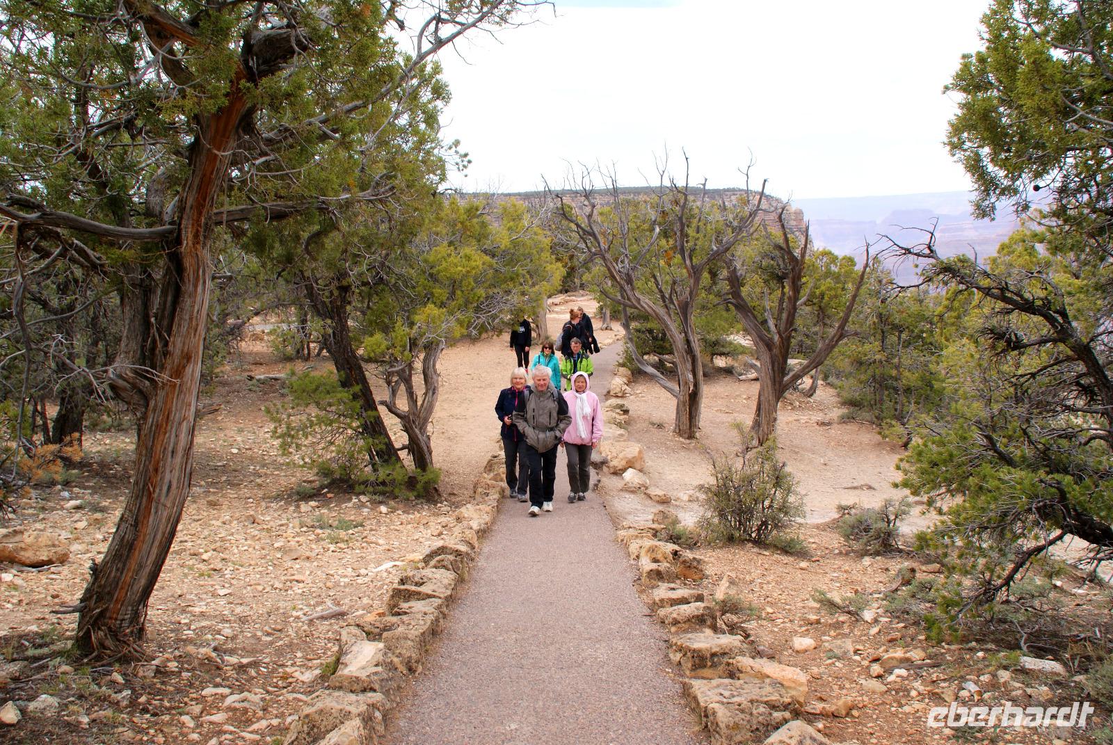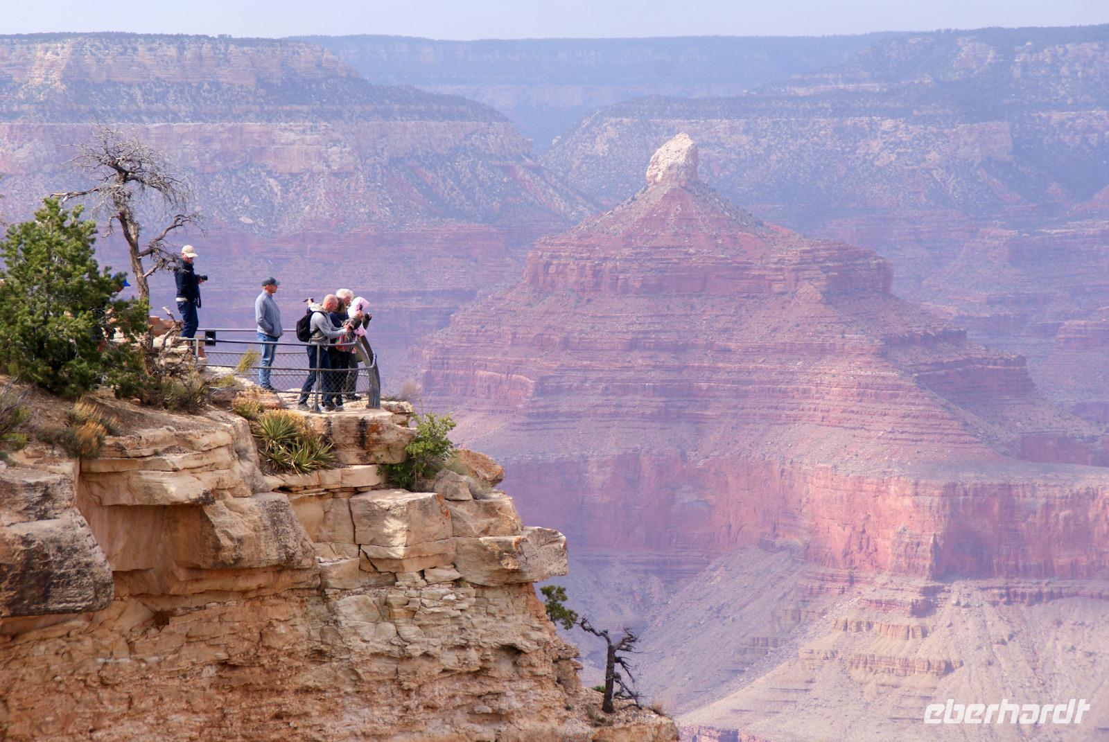 Nachdem wir ein gutes Frühstück mit Sekt genossen haben, werden wir förmlich aus dem Hotel geweht. Ein stürmischer Abschied, wir verlassen Laughlin und begeben uns bald auf die weltberühmte Route 66, die 3945 Km lang ist und von Chicago bis Santa Monica führt. Unsere Herzen schlagen höher, als wir im wunderschönen Örtchen Seligman halten, welches einst von der jüdischen Familie Seligman gegründet wurde. Hier gibt es unzählige Fotomotive... Oldtimer und Kuriositäten überall, wir können uns nicht satt sehen, hier könnten wir noch viel länger bleiben. Alles weist auf die Route 66 hin und wir könnten endlos Souvenirs erwerben. Aber der Grand Canyon ruft und wir haben noch viel vor heute. Auf dem Weg dorthin erklärt uns Chris viel Interessantes, was aufgrund des Baus der Route 66, der „Mutterstraße der Vereinigten Staaten" alles entstand. Von Mc Donalds, über Hilton's Holiday Inn bis Samuel Philipps, der die Tankstellen erfand. Unser Reiseleiter ist einfach unschlagbar und zieht uns mit seinen Ausführungen immer wieder in seinen Bann. Am Grand Canyon angekommen fahren wir zunächst zu unserem geplanten Helikopterflug...leider geht es heute aufgrund starken Windes nichts und unsere Flüge werden auf den nächsten Tag verschoben. Somit beginnen wir nach unserer Mittagspause mit der 2-stündigen Wanderung auf dem „Rim-Trail" entlang der Kante des Grand Canyons. Wir sind uns alle einig. Was für eine Kulisse, welch ein Anblick, einfach atemberaubend. Niemand hätte es sich in Natura so gewaltig vorgestellt. Unvergessliche Stunden spazieren wir und es entstehen nicht enden wollende Aufnahmen. Abschließend entdecken wir noch einen Condor auf einem Felsvorsprung, welch ein Erlebnis. Komplett beeindruckt verlassen wir den Grand Canyon, der die Schlucht des Colorado Rivers, 350 Km lang und 29 Km breit ist. Nach dem Check-in in der Red Feather Lodge treffen wir uns im Big E Steakhouse and Saloon zum Abendessen. Ein schöner Tag neigt sich dem Ende und wir drücken uns allen die Daumen, dass wir am nächsten Morgen fliegen können.