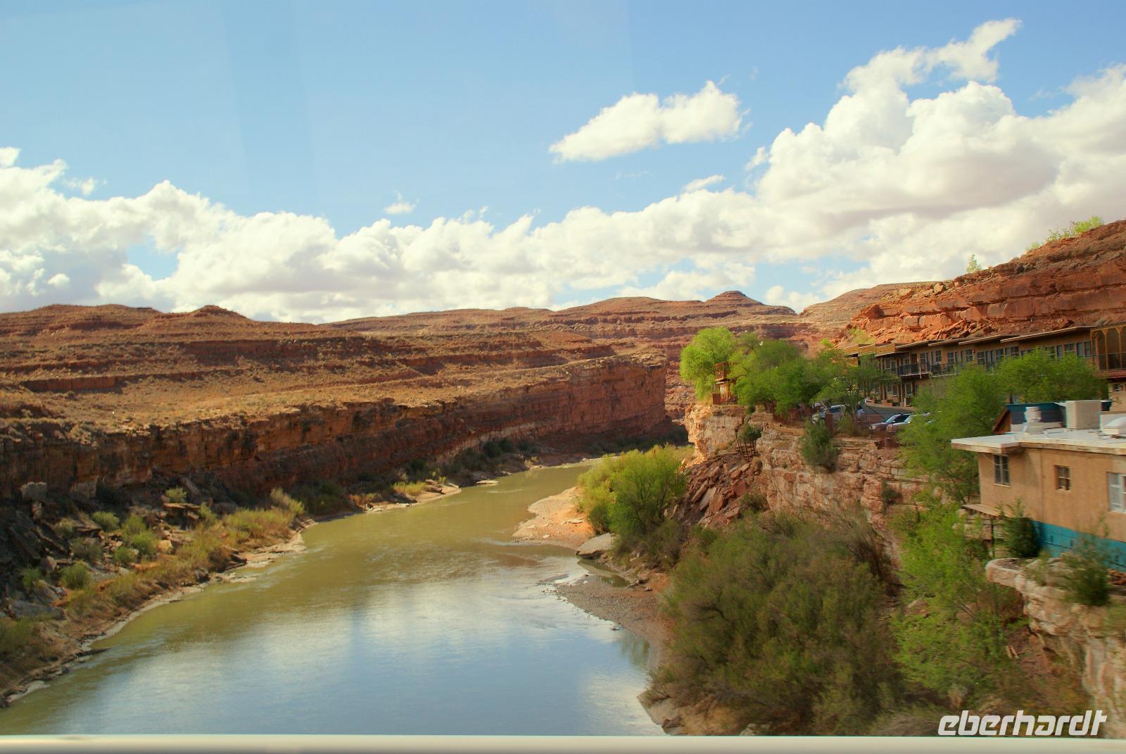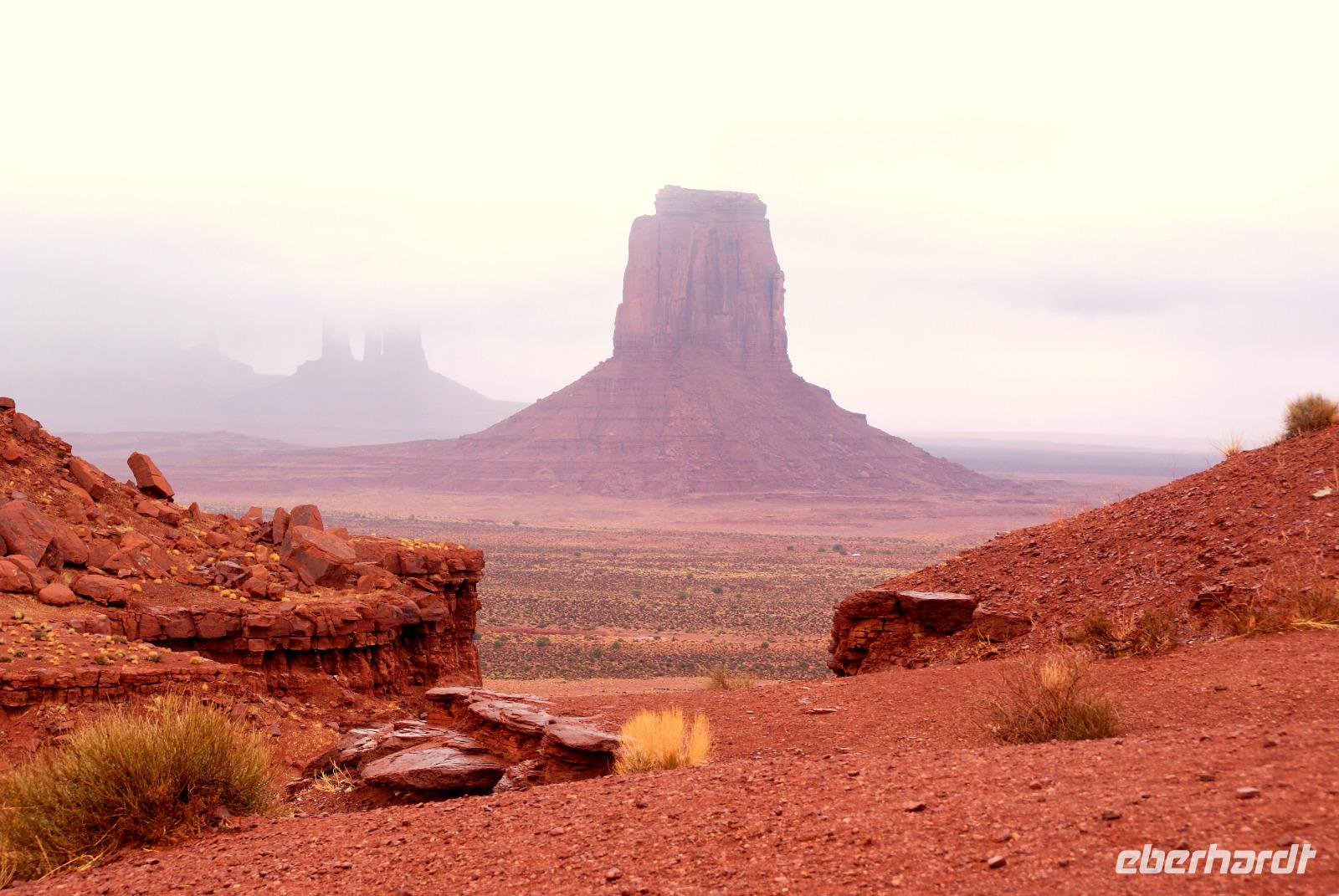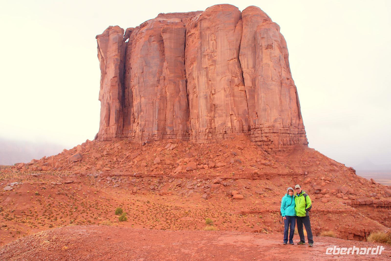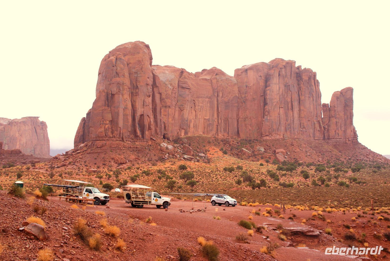 Leider lassen es die heutigen Wetterverhältnisse auch nicht zu, dass wir fliegen können und so reisen wir nach einem schönen Frühstück im Plaza Bonita ab. Wir sehen den Grand Canyon in tiefstem Nebel, bei Außentemperatur von 0 Grad und leichtem Schneefall. Entlang der Painted Desert, der farbigen Wüste geht die Reise weiter und es erfolgt ein Fotostopp mit Blick auf den Little Colorado. Auch die heutige Fahrt unterhält uns Chris mit seinem ungemeinen Wissen. So erfahren wir, dass es in Amerika 460 First Nations (Indianerstämme) gibt und er berichtet uns über die eher traurige Geschichte der damaligen Konflikte mit der Urbevölkerung und den weißen Siedlern, welche zu den Reservatsgründungen im Jahre 1878 führte. Am frühen Nachmittag erreichen wir das Monument Valley, welches den Navajo Indianern gehört und somit kein Nationalpark ist. Dicke Wolken und Regen empfangen uns, als wir uns auf die 1.5-stündige Jeeptour begeben. Irgendwann hat Petrus mit uns ein Einsehen, der Himmel reißt auf und wir können endlich doch noch tolle Aufnahmen von dieser grandiosen Kulisse machen. Eine wahre Traumlandschaft, deren Schönheit sich nun so richtig entfalten kann. Auf der Weiterfahrt nach Moab halten wir noch am sogenannten „Forrest Gump Point", an dem eine berühmte Filmszene entstand. Ein letzter Blick auf das Monument Valley in der Ferne mit der weiten Landschaft davor und wir sind froh, dies hautnah erlebt zu haben. Ein schönes Abendessen im Eddie McStiff's Microbrewery rundet den erlebnisreichen Tag ab.