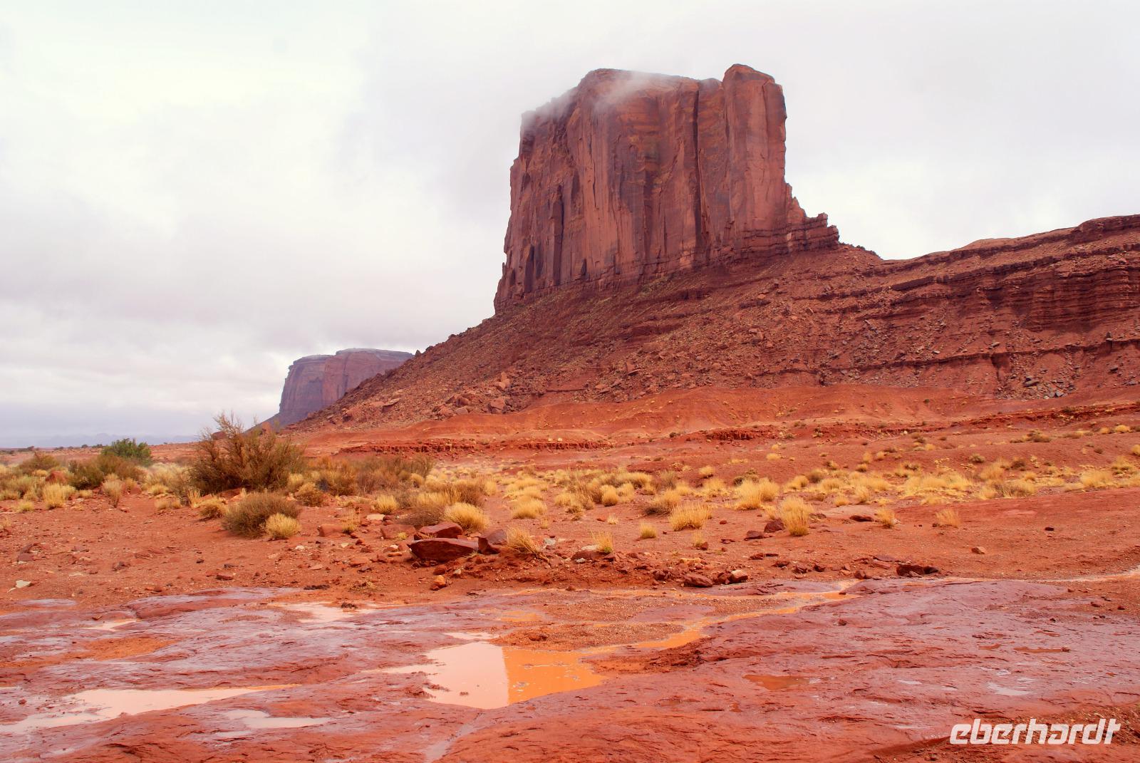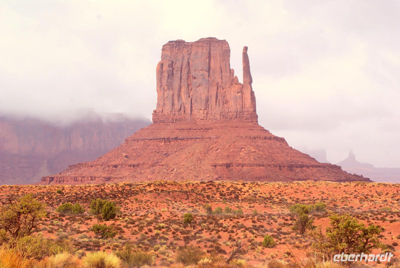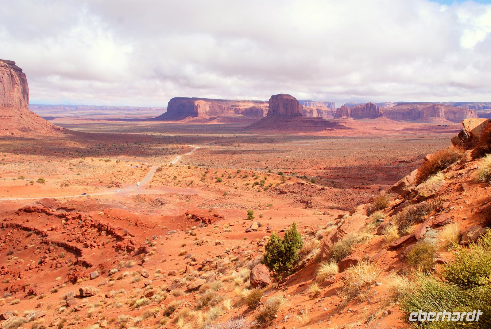 Leider lassen es die heutigen Wetterverhältnisse auch nicht zu, dass wir fliegen können und so reisen wir nach einem schönen Frühstück im Plaza Bonita ab. Wir sehen den Grand Canyon in tiefstem Nebel, bei Außentemperatur von 0 Grad und leichtem Schneefall. Entlang der Painted Desert, der farbigen Wüste geht die Reise weiter und es erfolgt ein Fotostopp mit Blick auf den Little Colorado. Auch die heutige Fahrt unterhält uns Chris mit seinem ungemeinen Wissen. So erfahren wir, dass es in Amerika 460 First Nations (Indianerstämme) gibt und er berichtet uns über die eher traurige Geschichte der damaligen Konflikte mit der Urbevölkerung und den weißen Siedlern, welche zu den Reservatsgründungen im Jahre 1878 führte. Am frühen Nachmittag erreichen wir das Monument Valley, welches den Navajo Indianern gehört und somit kein Nationalpark ist. Dicke Wolken und Regen empfangen uns, als wir uns auf die 1.5-stündige Jeeptour begeben. Irgendwann hat Petrus mit uns ein Einsehen, der Himmel reißt auf und wir können endlich doch noch tolle Aufnahmen von dieser grandiosen Kulisse machen. Eine wahre Traumlandschaft, deren Schönheit sich nun so richtig entfalten kann. Auf der Weiterfahrt nach Moab halten wir noch am sogenannten „Forrest Gump Point", an dem eine berühmte Filmszene entstand. Ein letzter Blick auf das Monument Valley in der Ferne mit der weiten Landschaft davor und wir sind froh, dies hautnah erlebt zu haben. Ein schönes Abendessen im Eddie McStiff's Microbrewery rundet den erlebnisreichen Tag ab.