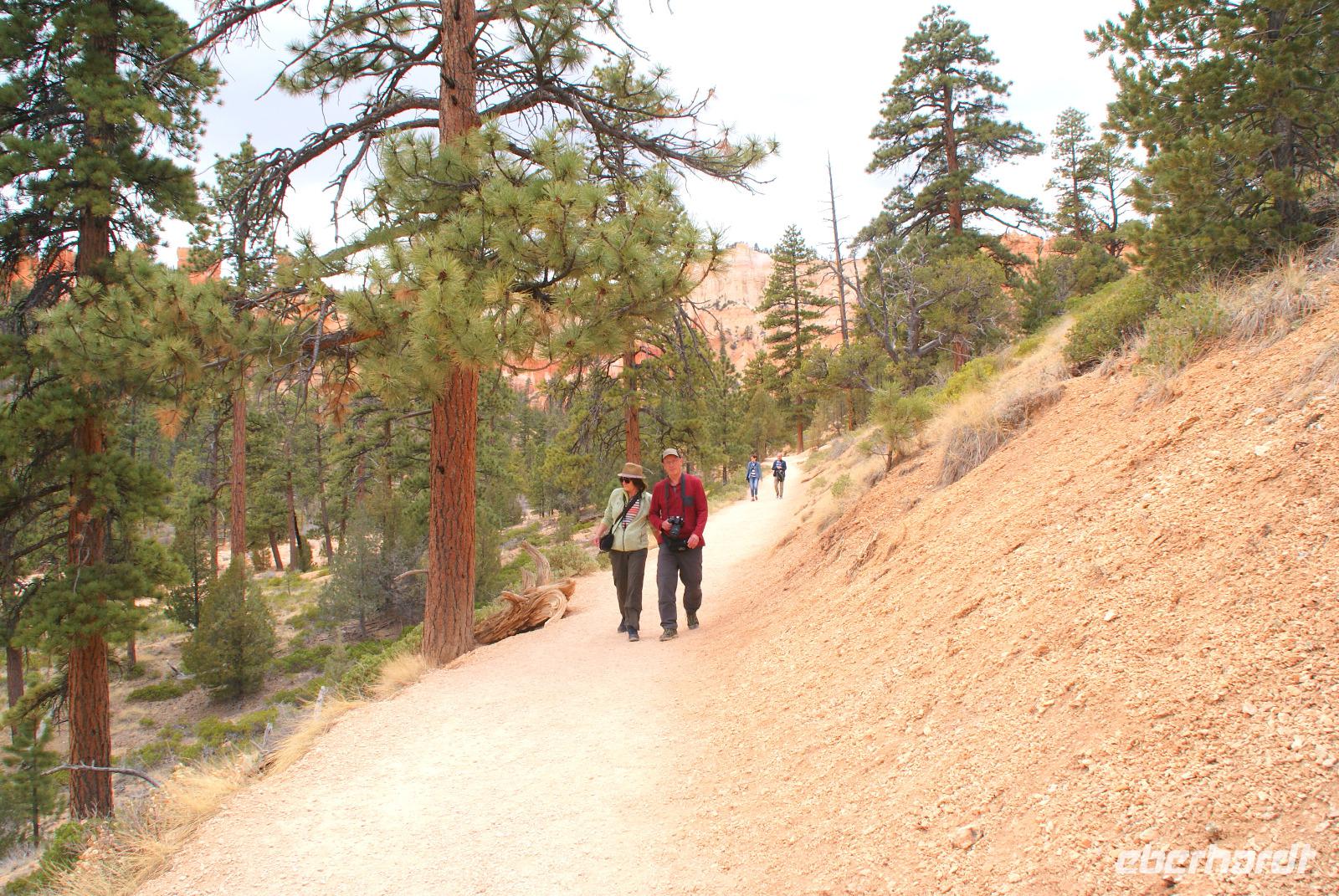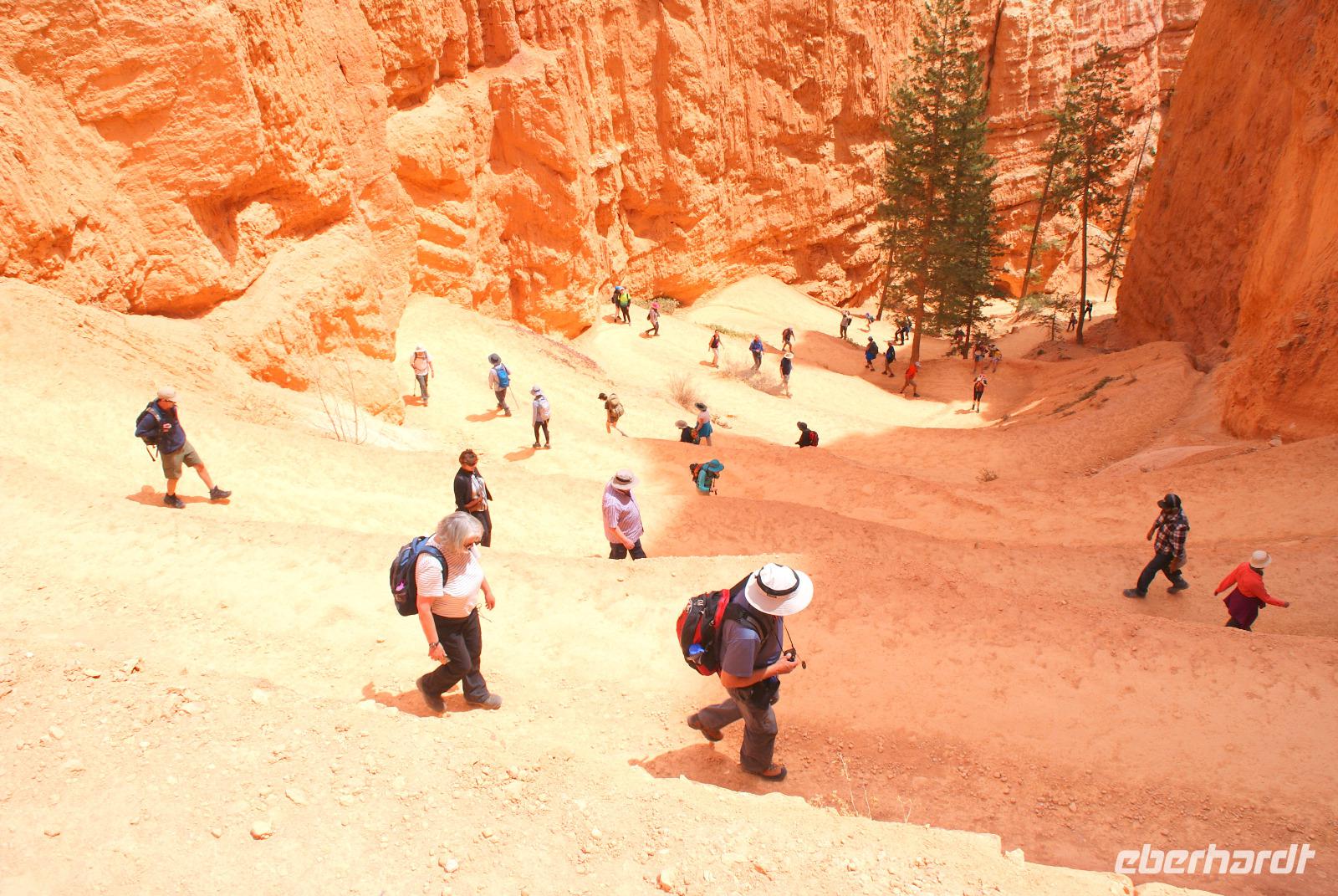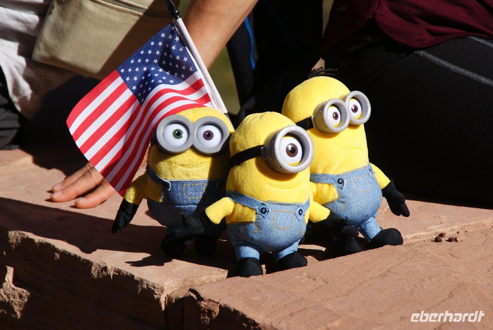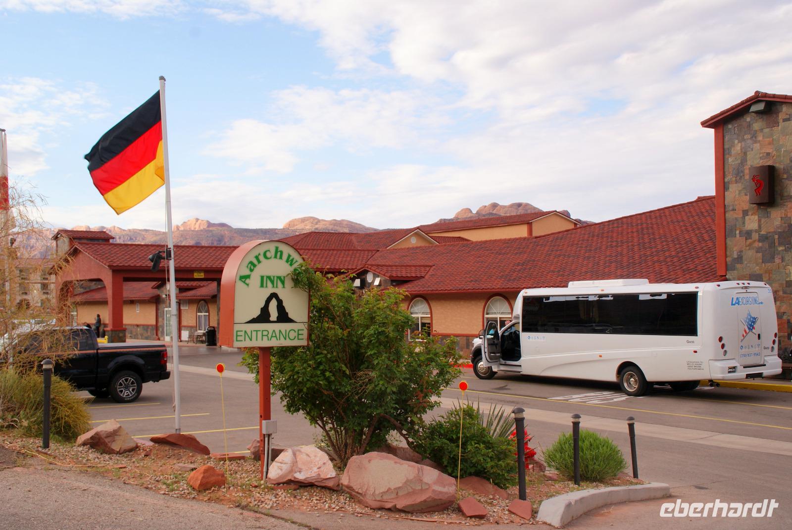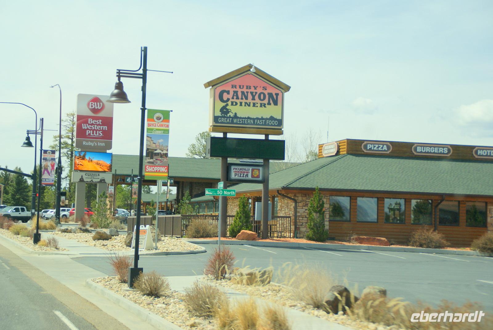 Gut gestärkt verlassen wir Moab und reisen Richtung Bryce Canyon. Reiseleiter Chris versüßt uns die längere Fahrtstrecke mit viel Wissenswertem und wir staunen, was er so alles weiß. Er verdeutlicht uns die Dimensionen der USA und berichtet, dass es 360 Millionen Einwohner gibt, von denen jedoch ca. 80 % an der Ost-und Westküste leben. Somit bleibt noch viel menschenleeres Land übrig. Anhand des Staates Wyoming, der 300.000 Einwohner hat und ¾ der Fläche Deutschlands einnimmt und Alaska, mit 400.000 Einwohnern und der Fläche so groß wie Europa, bekommen wir eine gute Vorstellung davon. Mal abgesehen davon, passt Europa 6x in die USA hinein.... Er erklärt uns, dass das Motto der Vereinigten Staaten auf der Flagge lautet: „Aus vielen Eins", welches den Zusammenschluss der 50 Bundesstaaten bedeutet. Der Weißkopfadler zeigt 13 Pfeile und 13 Olivenzweige in seinen Krallen, welche für die ersten Staaten, Krieg und Frieden stehen. Wir besprechen viele weitere Themen von Obama Care bis Recycling und so vergeht die Zeit wie im Fluge... Gegen Mittag erreichen wir Bryce und stärken uns erst mal in unserem Hotel, welches rundum viele Möglichkeiten bietet. Danach geht es zur Wanderung zum Bryce Canyon. Dort angekommen verschlägt es uns allen die Sprache. So schön und gewaltig hätte es niemand von uns erwartet. Wir sehen endlose „Hoodoos", wie die Indianer die Felsformationen bezeichnen. Nach deren Ansicht verkörpern diese ihre Ahnen und auf unserem Spaziergang sehen wir viele dieser Felsen, wo wir uns sehr gut Gestalten und Gesichter vorstellen können. Ein wunderschöner Nachmittag vergeht und wir können uns wieder mal nicht an diesem Naturschauspiel sattsehen. Nach einem kühlen Bier im General Store am Ende der Wanderung fahren wir noch zum Bryce Point und haben abschließend eine grandiose Kulisse, die uns zu Füßen liegt. Welch ein Erlebnis! Am Abend gibt sich der Wilde Westen alle Ehre. Wir gehen ins Ebernezers, eine Art Saloon mit Country Musik. Bei leckeren Speisen und schöner Livemusik lassen wir den Abend beschaulich ausklingen...