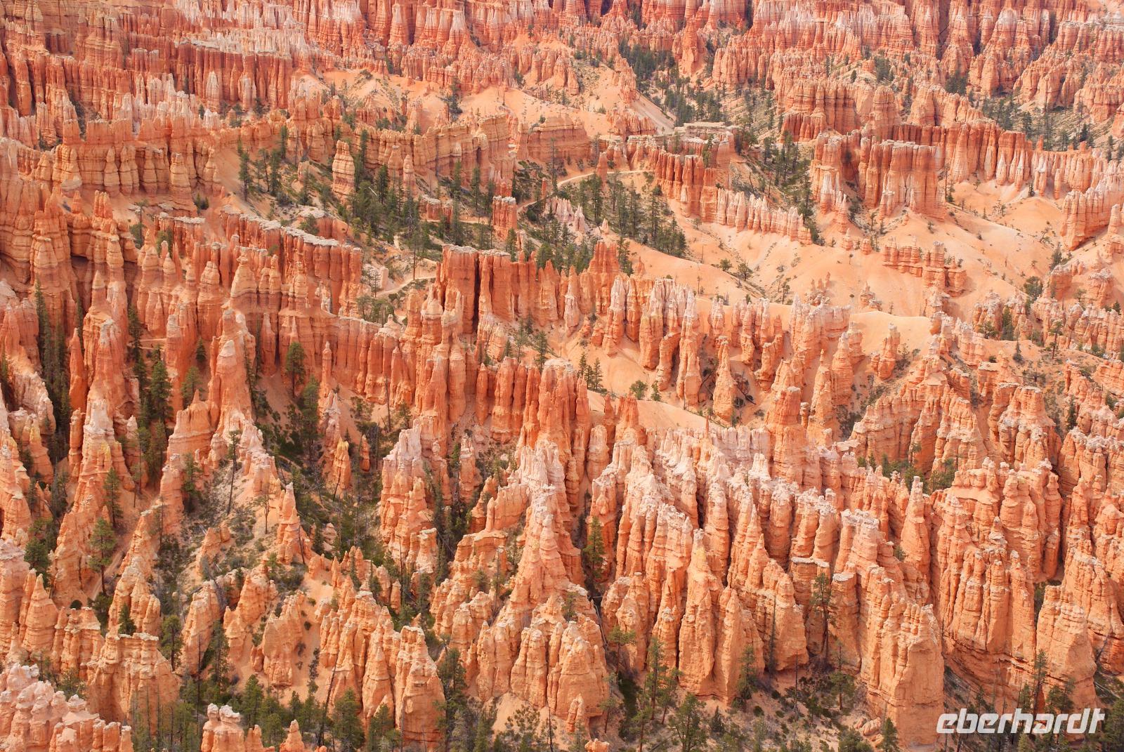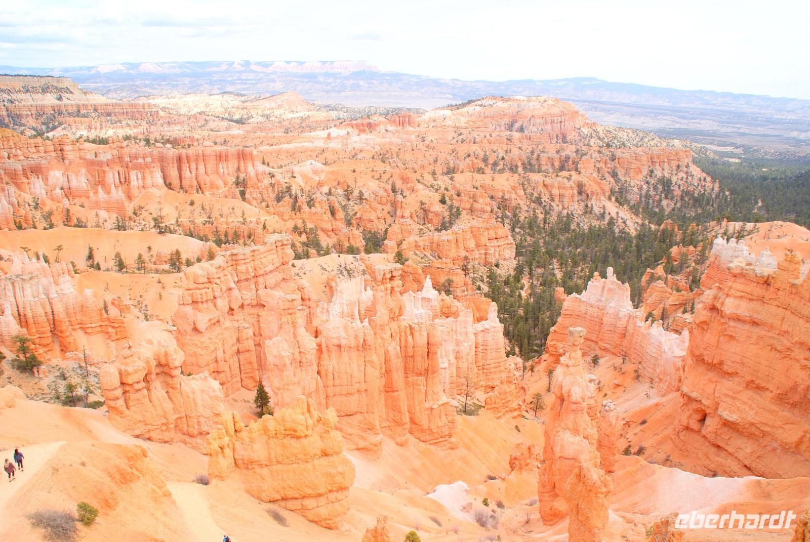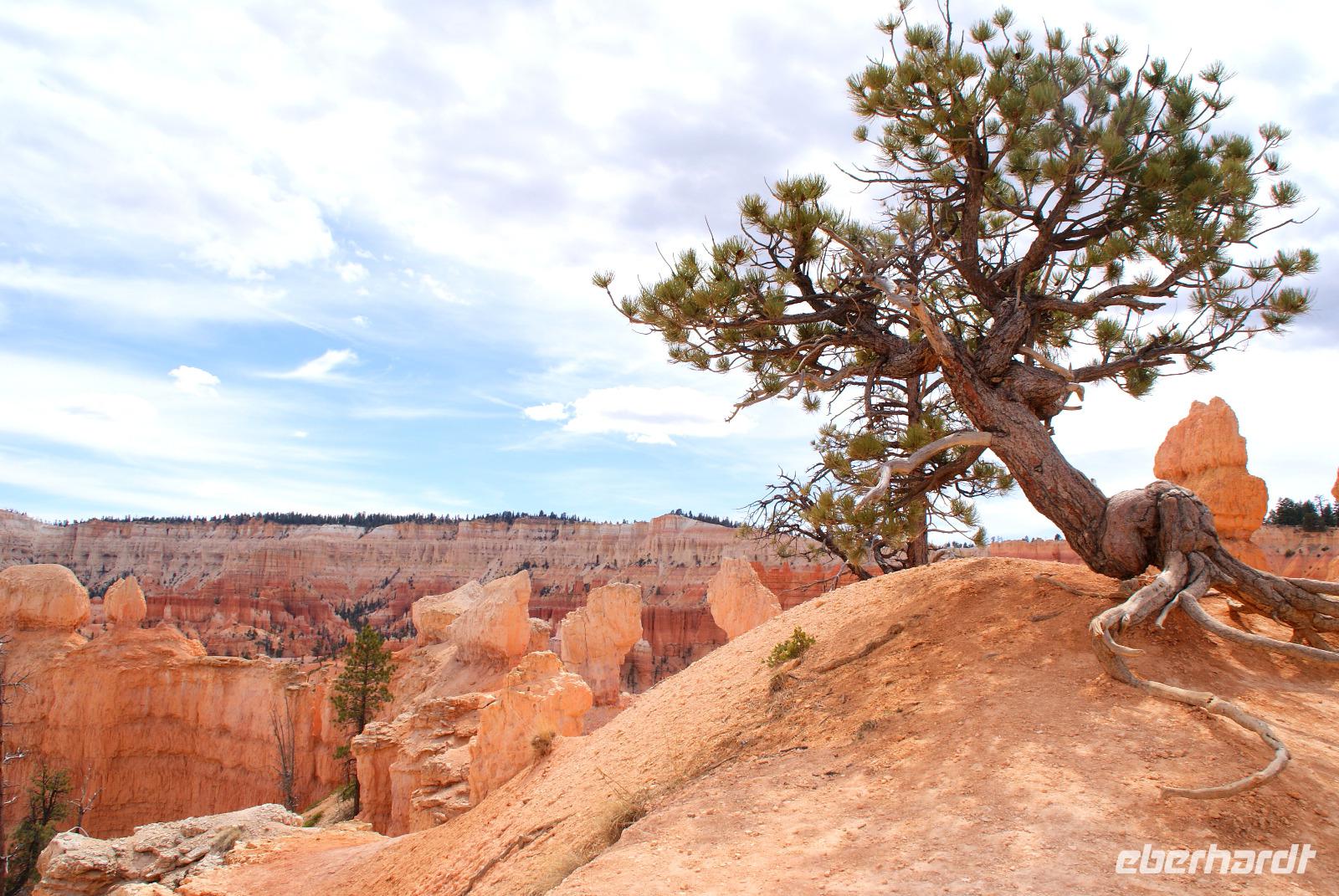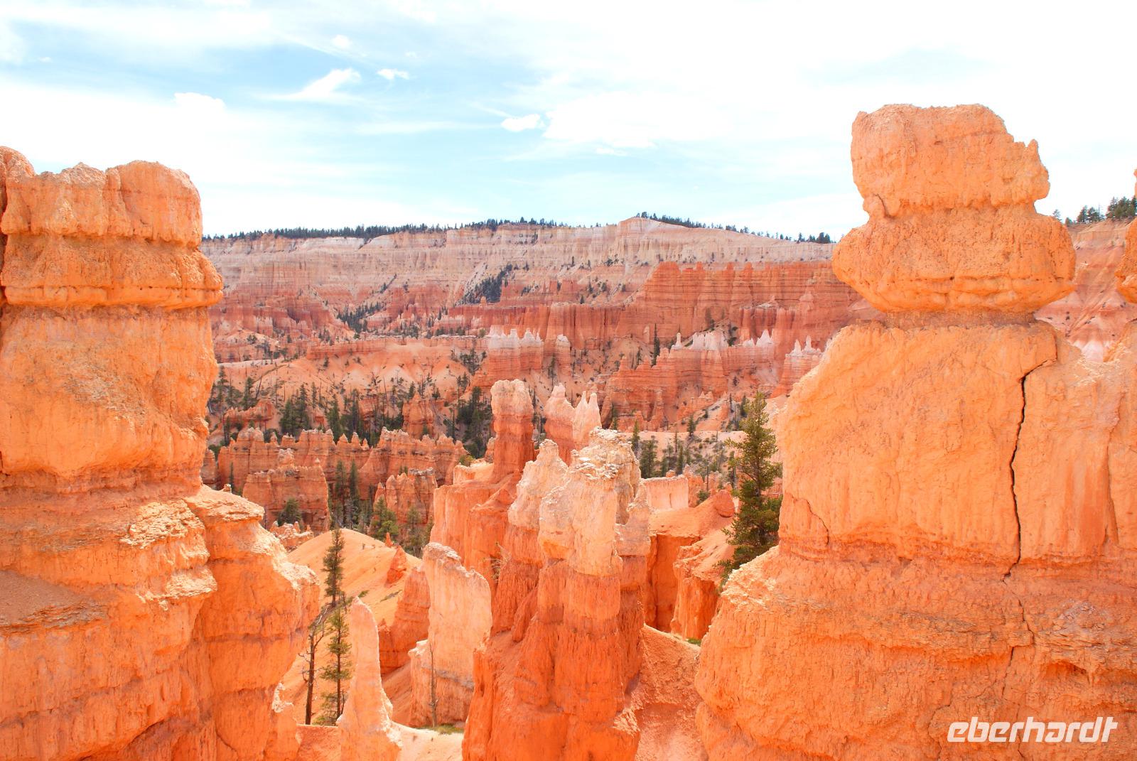 Gut gestärkt verlassen wir Moab und reisen Richtung Bryce Canyon. Reiseleiter Chris versüßt uns die längere Fahrtstrecke mit viel Wissenswertem und wir staunen, was er so alles weiß. Er verdeutlicht uns die Dimensionen der USA und berichtet, dass es 360 Millionen Einwohner gibt, von denen jedoch ca. 80 % an der Ost-und Westküste leben. Somit bleibt noch viel menschenleeres Land übrig. Anhand des Staates Wyoming, der 300.000 Einwohner hat und ¾ der Fläche Deutschlands einnimmt und Alaska, mit 400.000 Einwohnern und der Fläche so groß wie Europa, bekommen wir eine gute Vorstellung davon. Mal abgesehen davon, passt Europa 6x in die USA hinein.... Er erklärt uns, dass das Motto der Vereinigten Staaten auf der Flagge lautet: „Aus vielen Eins", welches den Zusammenschluss der 50 Bundesstaaten bedeutet. Der Weißkopfadler zeigt 13 Pfeile und 13 Olivenzweige in seinen Krallen, welche für die ersten Staaten, Krieg und Frieden stehen. Wir besprechen viele weitere Themen von Obama Care bis Recycling und so vergeht die Zeit wie im Fluge... Gegen Mittag erreichen wir Bryce und stärken uns erst mal in unserem Hotel, welches rundum viele Möglichkeiten bietet. Danach geht es zur Wanderung zum Bryce Canyon. Dort angekommen verschlägt es uns allen die Sprache. So schön und gewaltig hätte es niemand von uns erwartet. Wir sehen endlose „Hoodoos", wie die Indianer die Felsformationen bezeichnen. Nach deren Ansicht verkörpern diese ihre Ahnen und auf unserem Spaziergang sehen wir viele dieser Felsen, wo wir uns sehr gut Gestalten und Gesichter vorstellen können. Ein wunderschöner Nachmittag vergeht und wir können uns wieder mal nicht an diesem Naturschauspiel sattsehen. Nach einem kühlen Bier im General Store am Ende der Wanderung fahren wir noch zum Bryce Point und haben abschließend eine grandiose Kulisse, die uns zu Füßen liegt. Welch ein Erlebnis! Am Abend gibt sich der Wilde Westen alle Ehre. Wir gehen ins Ebernezers, eine Art Saloon mit Country Musik. Bei leckeren Speisen und schöner Livemusik lassen wir den Abend beschaulich ausklingen...