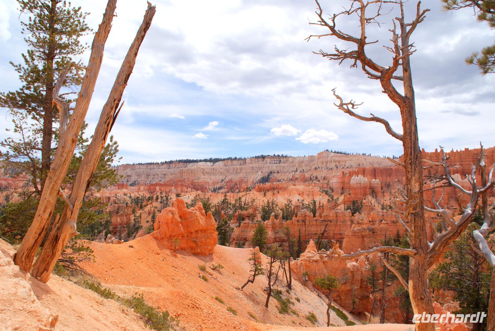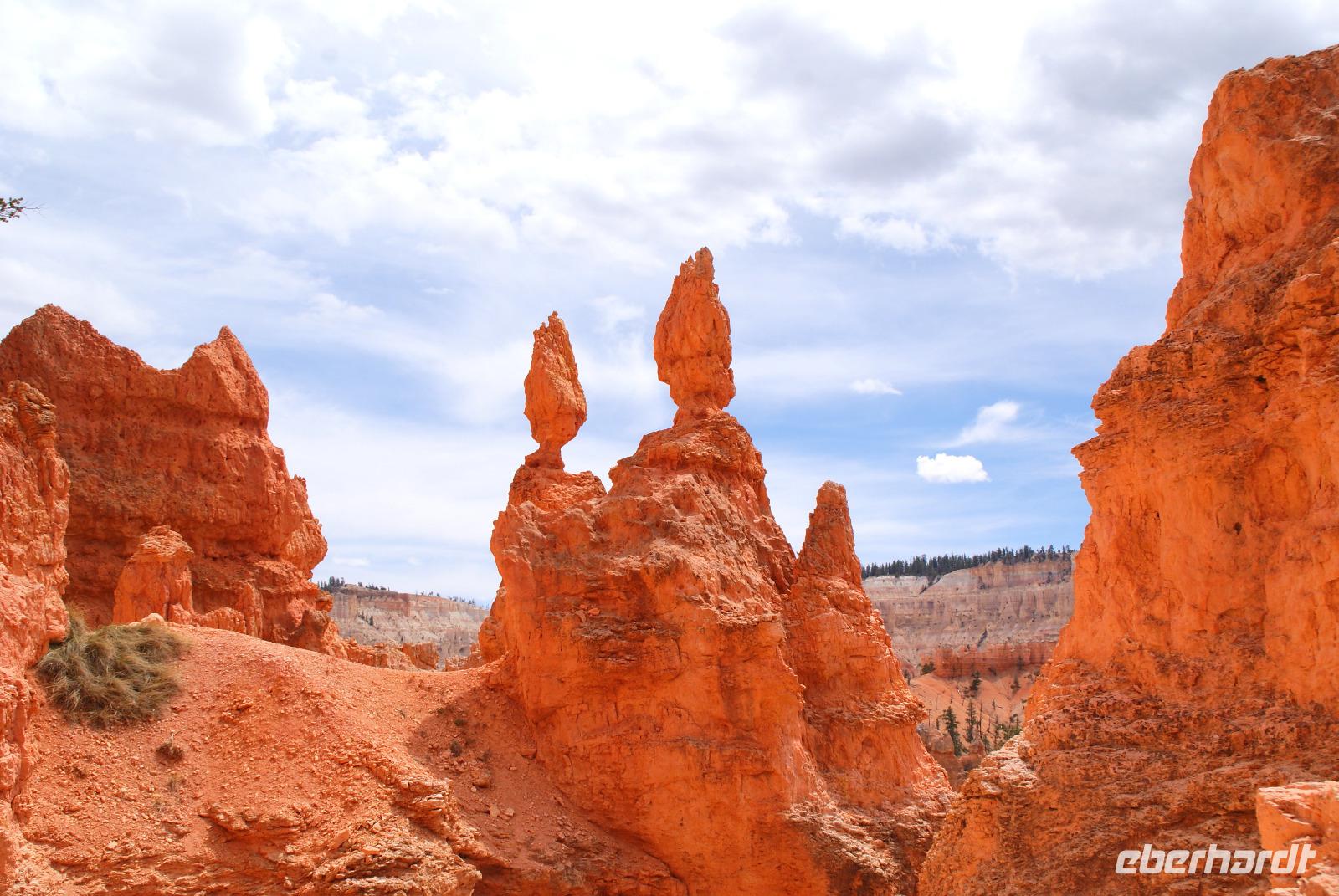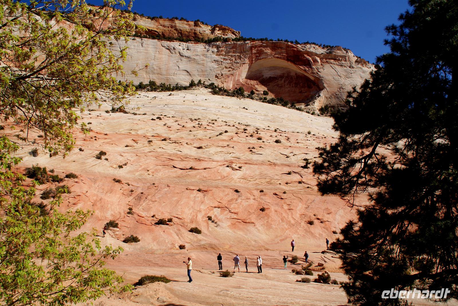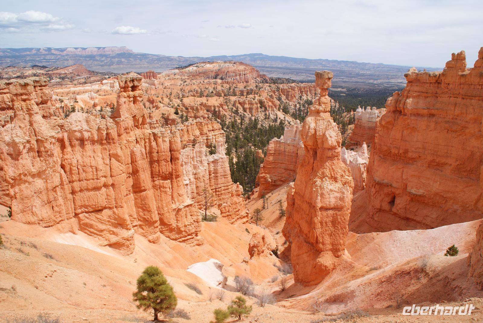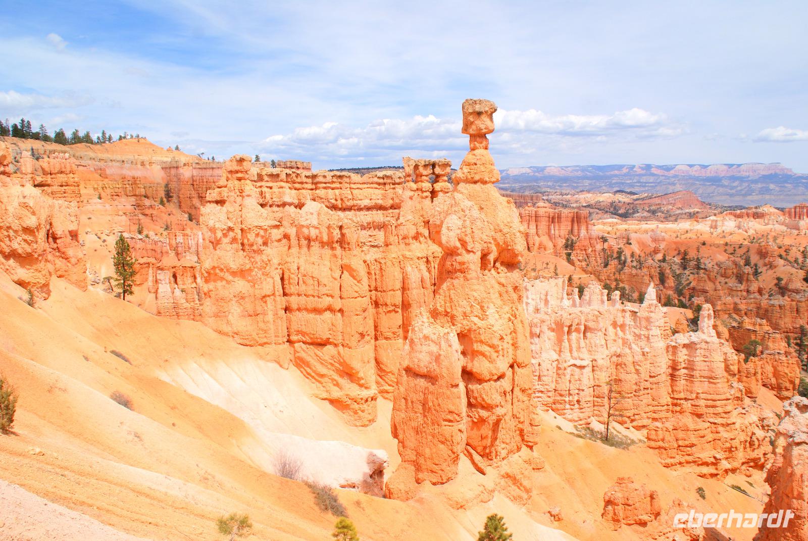 Gut gestärkt verlassen wir Moab und reisen Richtung Bryce Canyon. Reiseleiter Chris versüßt uns die längere Fahrtstrecke mit viel Wissenswertem und wir staunen, was er so alles weiß. Er verdeutlicht uns die Dimensionen der USA und berichtet, dass es 360 Millionen Einwohner gibt, von denen jedoch ca. 80 % an der Ost-und Westküste leben. Somit bleibt noch viel menschenleeres Land übrig. Anhand des Staates Wyoming, der 300.000 Einwohner hat und ¾ der Fläche Deutschlands einnimmt und Alaska, mit 400.000 Einwohnern und der Fläche so groß wie Europa, bekommen wir eine gute Vorstellung davon. Mal abgesehen davon, passt Europa 6x in die USA hinein.... Er erklärt uns, dass das Motto der Vereinigten Staaten auf der Flagge lautet: „Aus vielen Eins", welches den Zusammenschluss der 50 Bundesstaaten bedeutet. Der Weißkopfadler zeigt 13 Pfeile und 13 Olivenzweige in seinen Krallen, welche für die ersten Staaten, Krieg und Frieden stehen. Wir besprechen viele weitere Themen von Obama Care bis Recycling und so vergeht die Zeit wie im Fluge... Gegen Mittag erreichen wir Bryce und stärken uns erst mal in unserem Hotel, welches rundum viele Möglichkeiten bietet. Danach geht es zur Wanderung zum Bryce Canyon. Dort angekommen verschlägt es uns allen die Sprache. So schön und gewaltig hätte es niemand von uns erwartet. Wir sehen endlose „Hoodoos", wie die Indianer die Felsformationen bezeichnen. Nach deren Ansicht verkörpern diese ihre Ahnen und auf unserem Spaziergang sehen wir viele dieser Felsen, wo wir uns sehr gut Gestalten und Gesichter vorstellen können. Ein wunderschöner Nachmittag vergeht und wir können uns wieder mal nicht an diesem Naturschauspiel sattsehen. Nach einem kühlen Bier im General Store am Ende der Wanderung fahren wir noch zum Bryce Point und haben abschließend eine grandiose Kulisse, die uns zu Füßen liegt. Welch ein Erlebnis! Am Abend gibt sich der Wilde Westen alle Ehre. Wir gehen ins Ebernezers, eine Art Saloon mit Country Musik. Bei leckeren Speisen und schöner Livemusik lassen wir den Abend beschaulich ausklingen...
