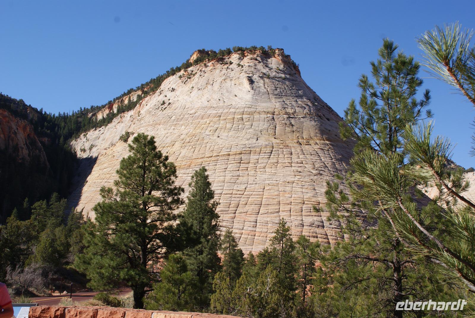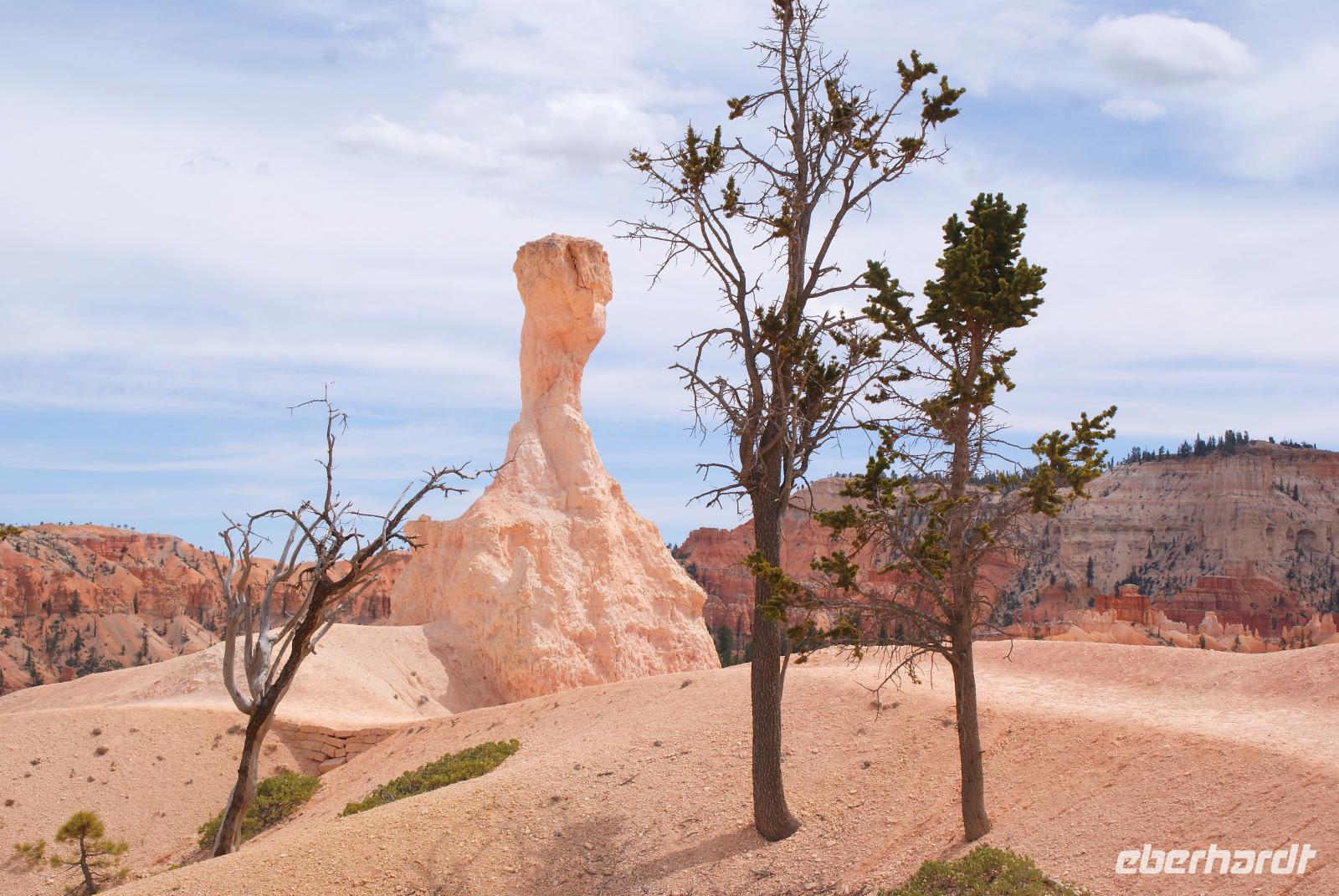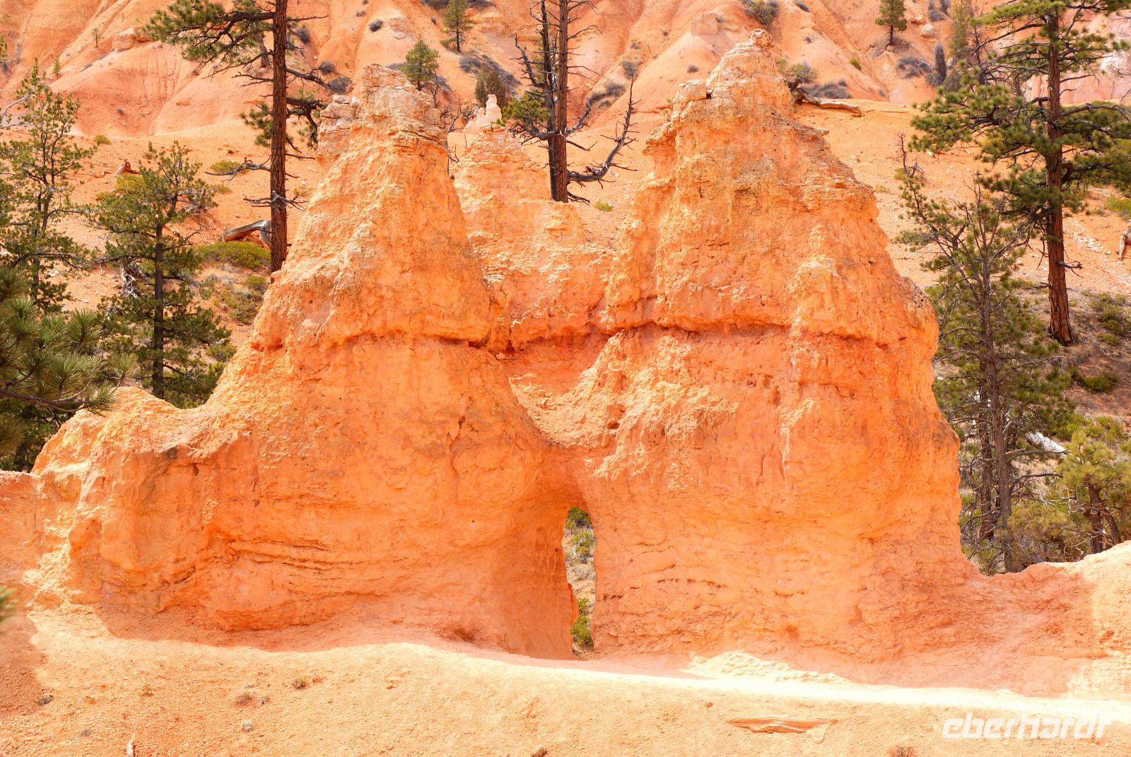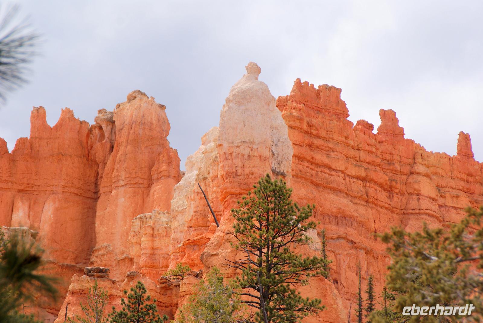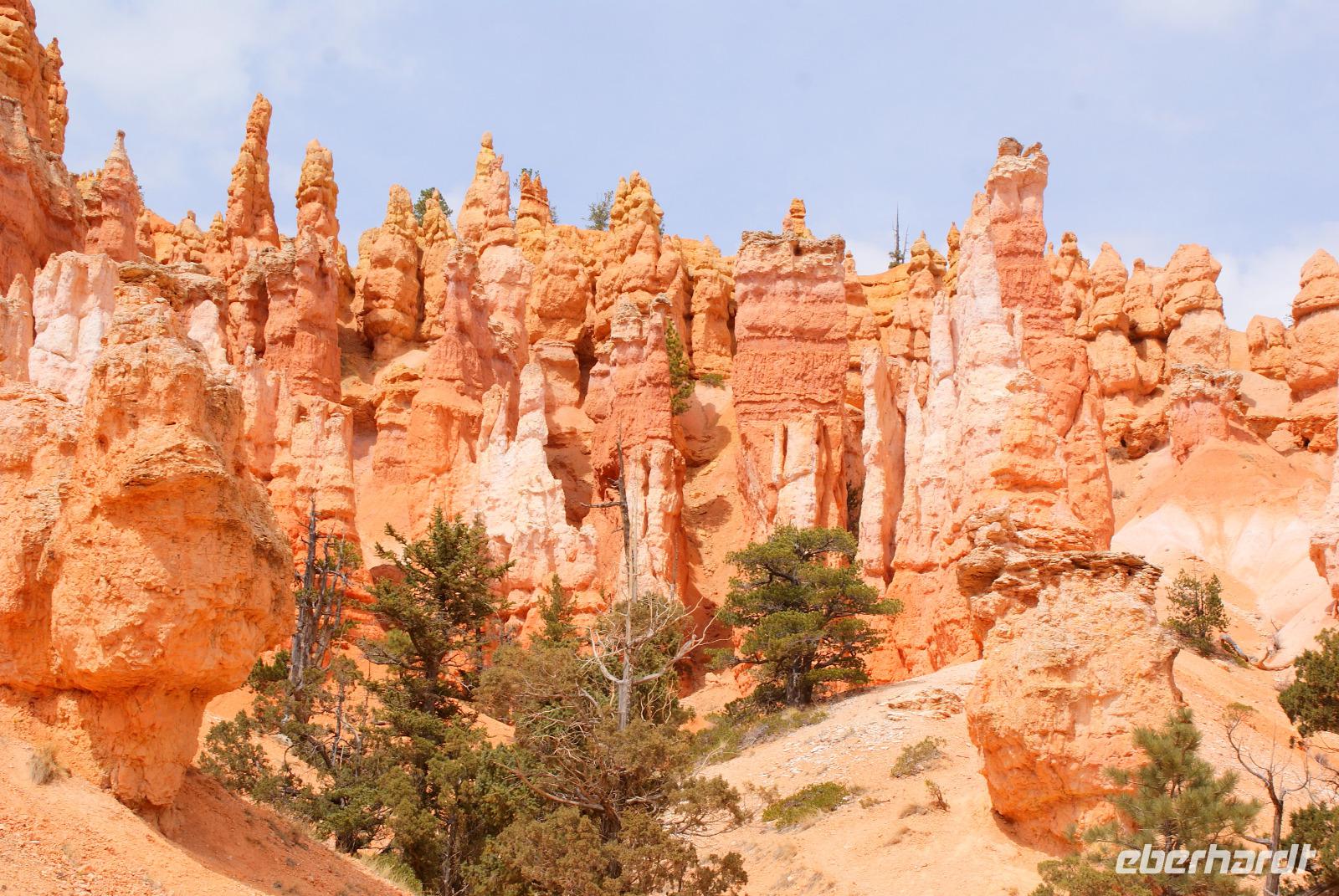 Gut gestärkt verlassen wir Moab und reisen Richtung Bryce Canyon. Reiseleiter Chris versüßt uns die längere Fahrtstrecke mit viel Wissenswertem und wir staunen, was er so alles weiß. Er verdeutlicht uns die Dimensionen der USA und berichtet, dass es 360 Millionen Einwohner gibt, von denen jedoch ca. 80 % an der Ost-und Westküste leben. Somit bleibt noch viel menschenleeres Land übrig. Anhand des Staates Wyoming, der 300.000 Einwohner hat und ¾ der Fläche Deutschlands einnimmt und Alaska, mit 400.000 Einwohnern und der Fläche so groß wie Europa, bekommen wir eine gute Vorstellung davon. Mal abgesehen davon, passt Europa 6x in die USA hinein.... Er erklärt uns, dass das Motto der Vereinigten Staaten auf der Flagge lautet: „Aus vielen Eins", welches den Zusammenschluss der 50 Bundesstaaten bedeutet. Der Weißkopfadler zeigt 13 Pfeile und 13 Olivenzweige in seinen Krallen, welche für die ersten Staaten, Krieg und Frieden stehen. Wir besprechen viele weitere Themen von Obama Care bis Recycling und so vergeht die Zeit wie im Fluge... Gegen Mittag erreichen wir Bryce und stärken uns erst mal in unserem Hotel, welches rundum viele Möglichkeiten bietet. Danach geht es zur Wanderung zum Bryce Canyon. Dort angekommen verschlägt es uns allen die Sprache. So schön und gewaltig hätte es niemand von uns erwartet. Wir sehen endlose „Hoodoos", wie die Indianer die Felsformationen bezeichnen. Nach deren Ansicht verkörpern diese ihre Ahnen und auf unserem Spaziergang sehen wir viele dieser Felsen, wo wir uns sehr gut Gestalten und Gesichter vorstellen können. Ein wunderschöner Nachmittag vergeht und wir können uns wieder mal nicht an diesem Naturschauspiel sattsehen. Nach einem kühlen Bier im General Store am Ende der Wanderung fahren wir noch zum Bryce Point und haben abschließend eine grandiose Kulisse, die uns zu Füßen liegt. Welch ein Erlebnis! Am Abend gibt sich der Wilde Westen alle Ehre. Wir gehen ins Ebernezers, eine Art Saloon mit Country Musik. Bei leckeren Speisen und schöner Livemusik lassen wir den Abend beschaulich ausklingen...