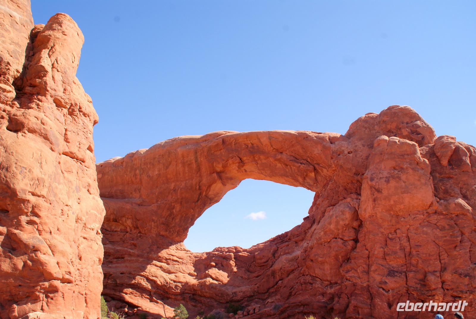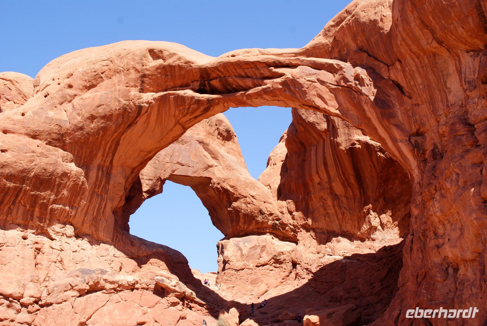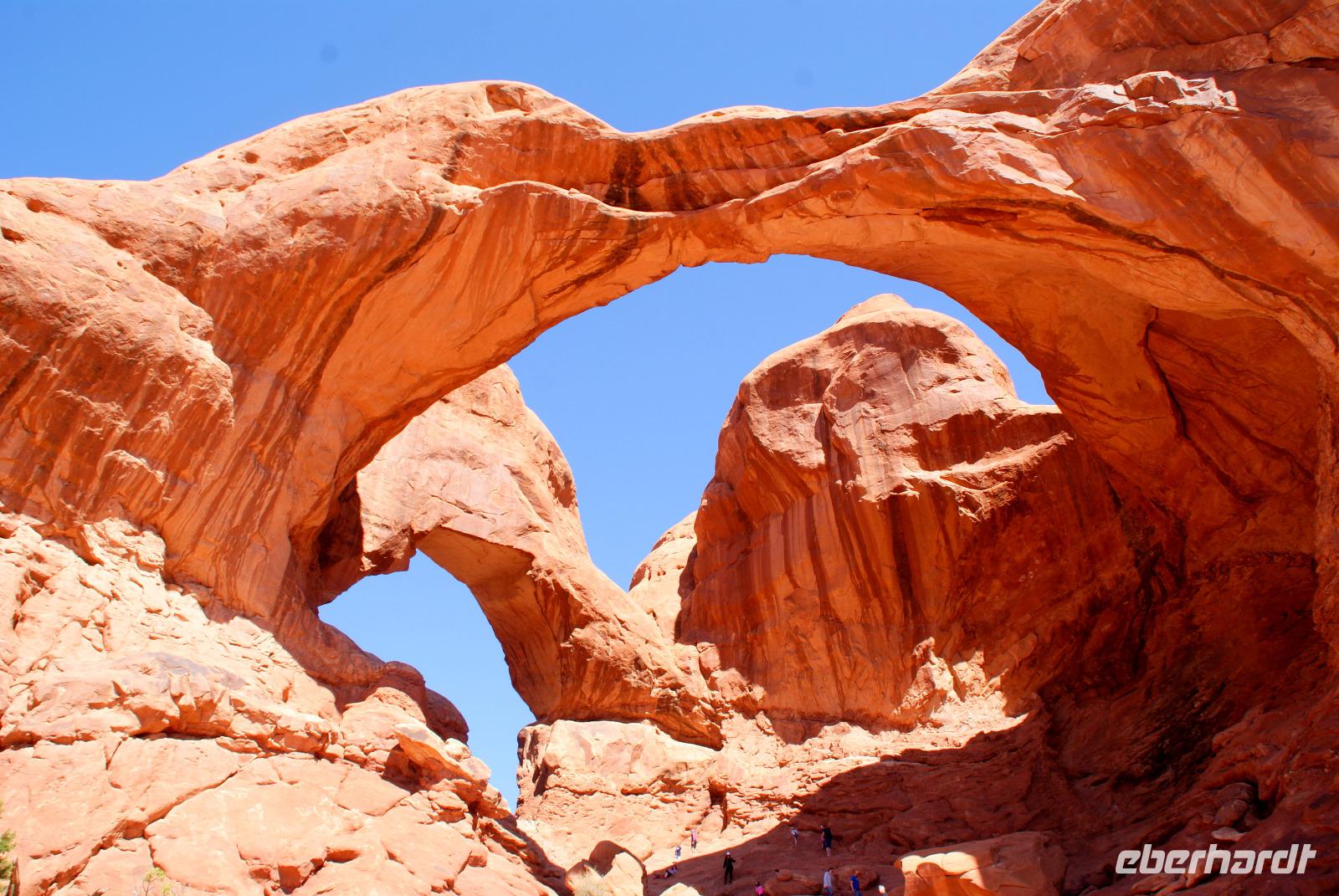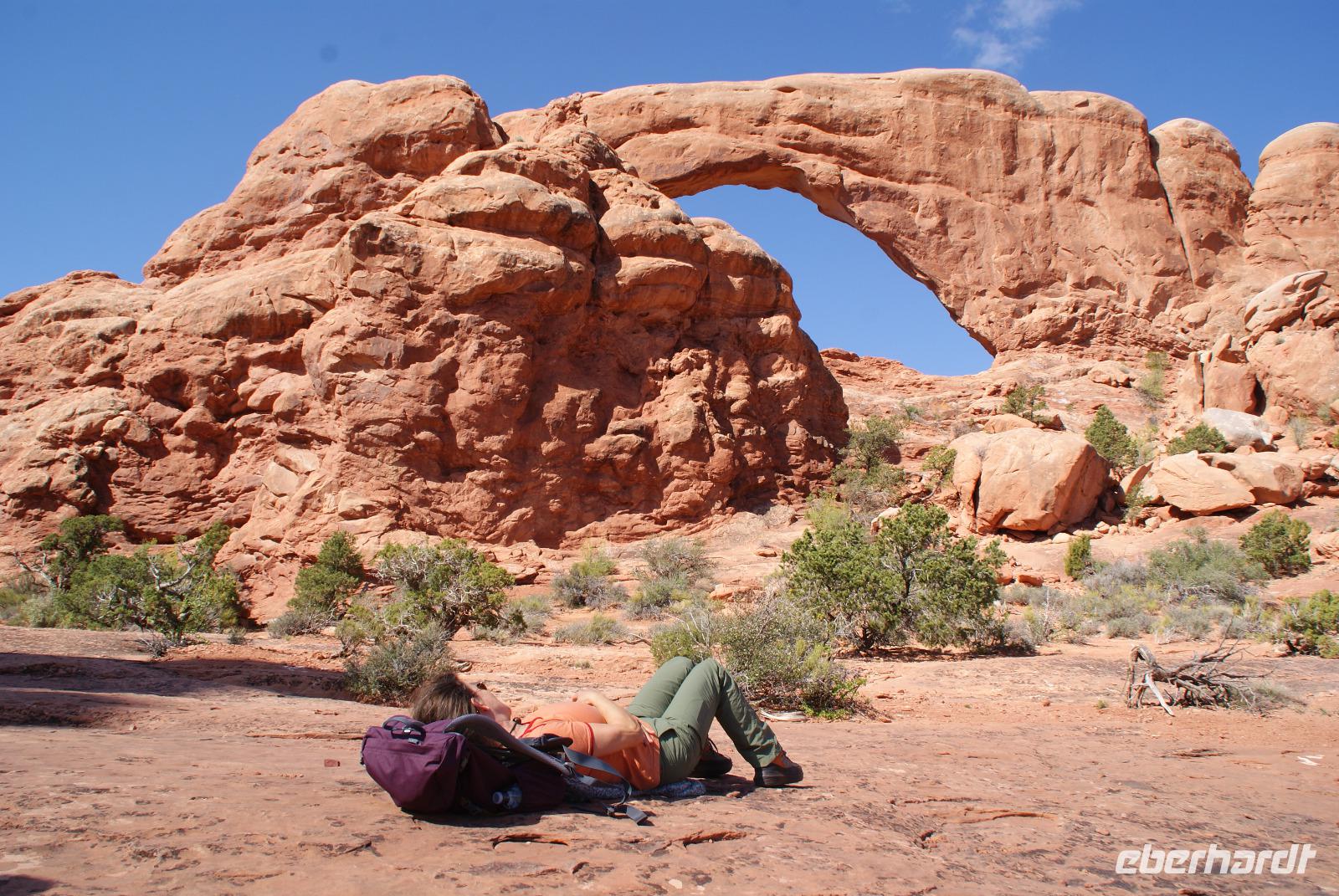 Der heutige Reisetag führt uns nach einem schönen Frühstück des Aarchway Inn Moab zunächst zum Arches Nationalpark. Vorher kaufen wir noch für unser Mittagspicknick im örtlichen Supermarkt ein. Wir haben heute Traumwetter, wolkenloser Himmel, die Sonne lacht und wir umso mehr. Am Visitor's Center des Nationalparks machen wir einen kurzen Halt und begeben uns dann zur „The Windows Section" und erwandern das North und South Window, den Double Arch und die Elefantenparade. Die Arches (Bögen) entstehen und entstanden durch härtere und weichere Gesteinsschichten, denen der Wind zusetzt und mit der Zeit Löcher entstehen. Chris hat große Mühe, uns zum Weitergehen zu bewegen... Wir können uns nicht sattsehen von dieser tollen Kulisse und schießen nicht enden wollende Fotos. So mancher von uns denkt-es ist noch schöner als der Grand Canyon! Ein Traum, welch ein Farbenspiel. Teil 2 führt uns zum Delicate Arch, den berühmten Bogen, den man auf den Nummernschildern des Bundesstaates Utah sieht. Ein schöner Spaziergang mit atemberaubender Kulisse. Die Weiterfahrt führt uns zum Park Avenue Aussichtspunkt, der einen tollen Abschluss des Nationalparks bietet. Unser Mittagspicknick nehmen wir am Dead Horse Point, der seinen Namen aus der Indianerzeit erhielt. Einst trieben die Stämme Wildpferde bis hierher, mit der Absicht, diese einzufangen und zu zähmen. Die, die sich nicht fangen ließen, stürzten hier 600 m in die Tiefe, in der sich auch der Colorado River durch die Schlucht windet. Eine Wahnsinnskulisse, selten haben wir mit einem solchen Ausblick unser Mittagessen genossen. Am Nachmittag kehren wir nach Moab zurück, die einen bummeln durch das beschauliche Örtchen, die anderen entspannen sich am Pool. Abends kehren wir in den Moab Grill ein und lassen es uns bei Steak und Lachs so richtig gut gehen.