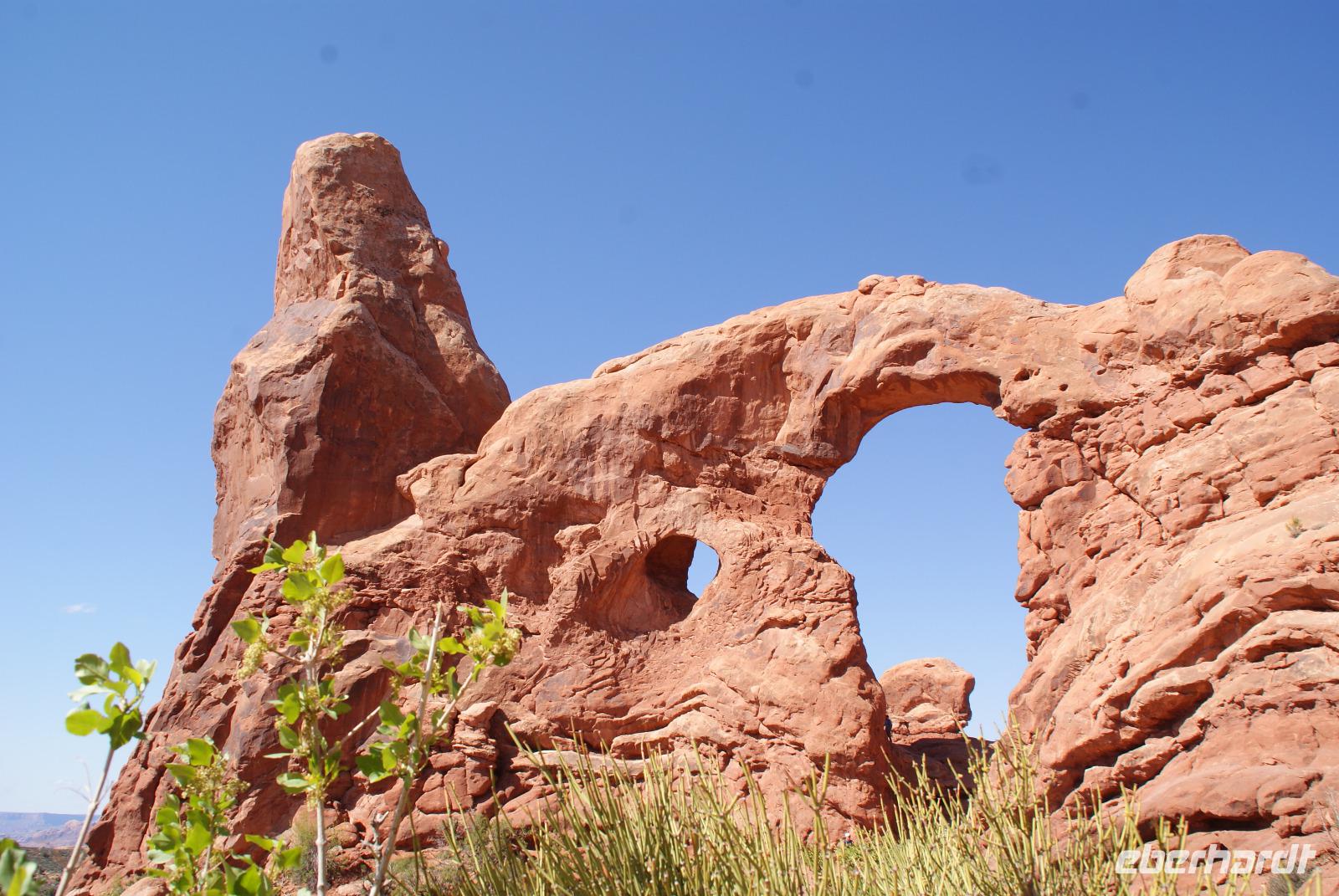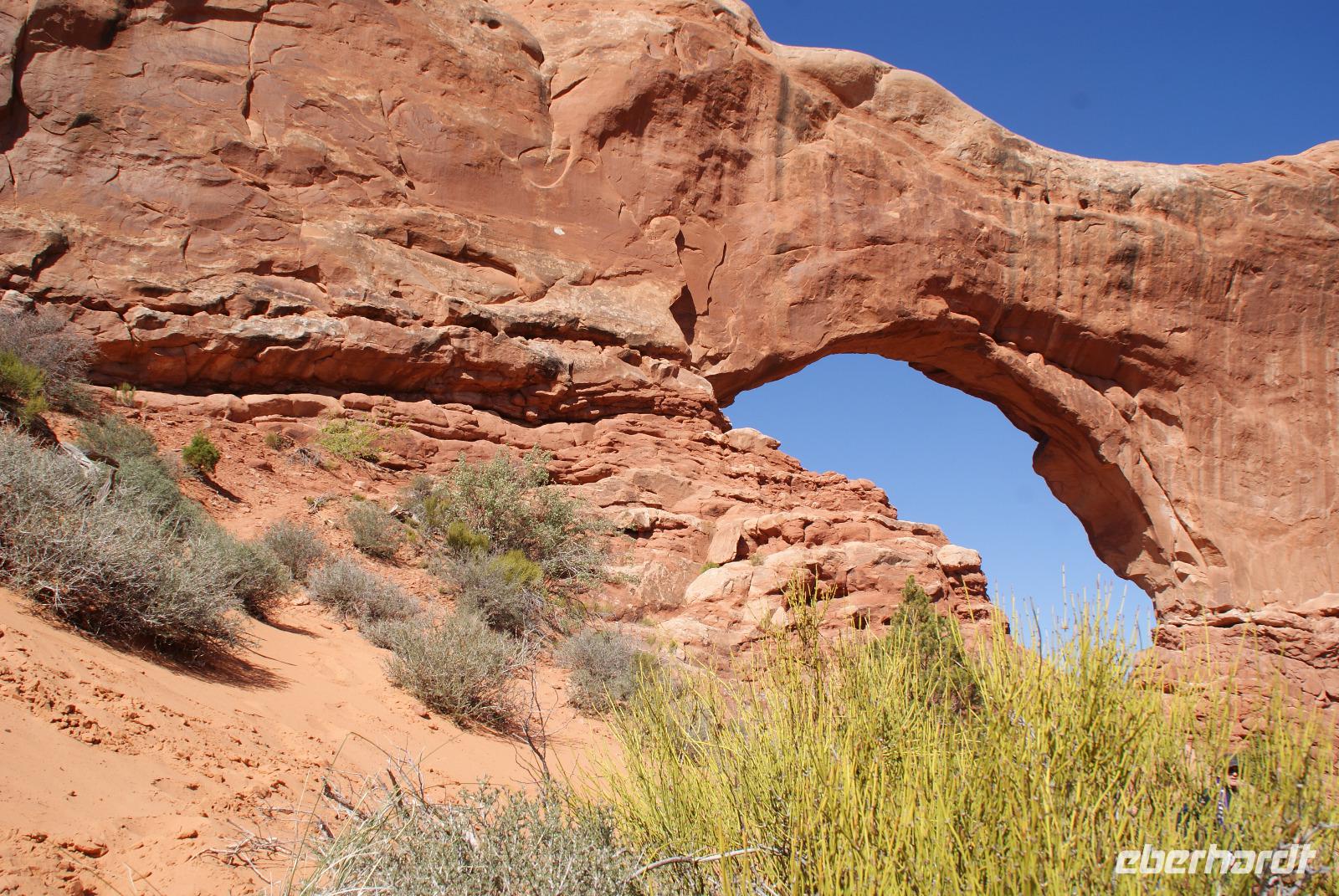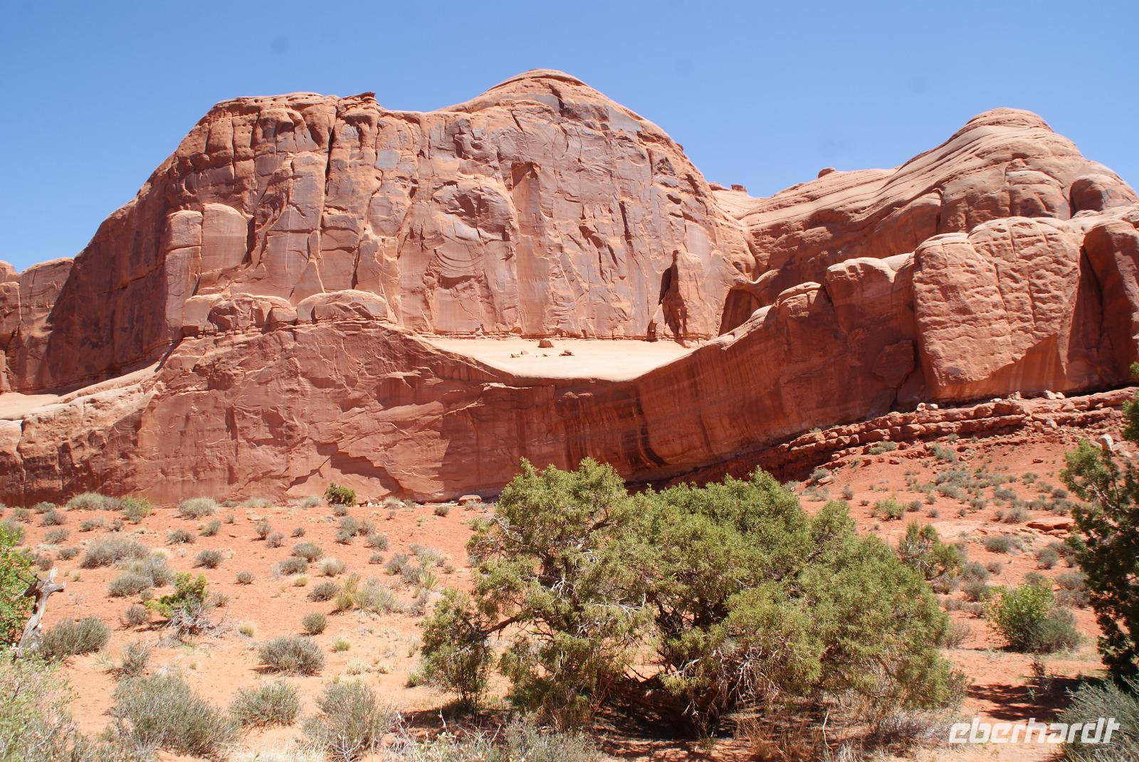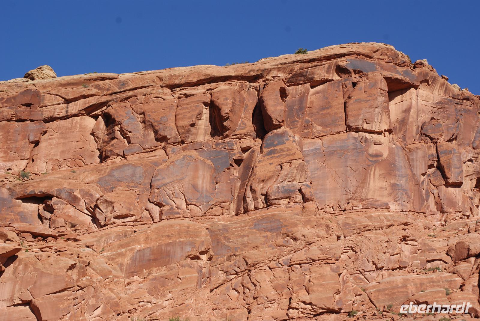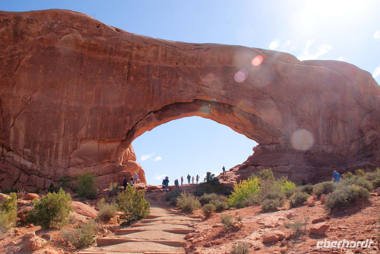 Der heutige Reisetag führt uns nach einem schönen Frühstück des Aarchway Inn Moab zunächst zum Arches Nationalpark. Vorher kaufen wir noch für unser Mittagspicknick im örtlichen Supermarkt ein. Wir haben heute Traumwetter, wolkenloser Himmel, die Sonne lacht und wir umso mehr. Am Visitor's Center des Nationalparks machen wir einen kurzen Halt und begeben uns dann zur „The Windows Section" und erwandern das North und South Window, den Double Arch und die Elefantenparade. Die Arches (Bögen) entstehen und entstanden durch härtere und weichere Gesteinsschichten, denen der Wind zusetzt und mit der Zeit Löcher entstehen. Chris hat große Mühe, uns zum Weitergehen zu bewegen... Wir können uns nicht sattsehen von dieser tollen Kulisse und schießen nicht enden wollende Fotos. So mancher von uns denkt-es ist noch schöner als der Grand Canyon! Ein Traum, welch ein Farbenspiel. Teil 2 führt uns zum Delicate Arch, den berühmten Bogen, den man auf den Nummernschildern des Bundesstaates Utah sieht. Ein schöner Spaziergang mit atemberaubender Kulisse. Die Weiterfahrt führt uns zum Park Avenue Aussichtspunkt, der einen tollen Abschluss des Nationalparks bietet. Unser Mittagspicknick nehmen wir am Dead Horse Point, der seinen Namen aus der Indianerzeit erhielt. Einst trieben die Stämme Wildpferde bis hierher, mit der Absicht, diese einzufangen und zu zähmen. Die, die sich nicht fangen ließen, stürzten hier 600 m in die Tiefe, in der sich auch der Colorado River durch die Schlucht windet. Eine Wahnsinnskulisse, selten haben wir mit einem solchen Ausblick unser Mittagessen genossen. Am Nachmittag kehren wir nach Moab zurück, die einen bummeln durch das beschauliche Örtchen, die anderen entspannen sich am Pool. Abends kehren wir in den Moab Grill ein und lassen es uns bei Steak und Lachs so richtig gut gehen.