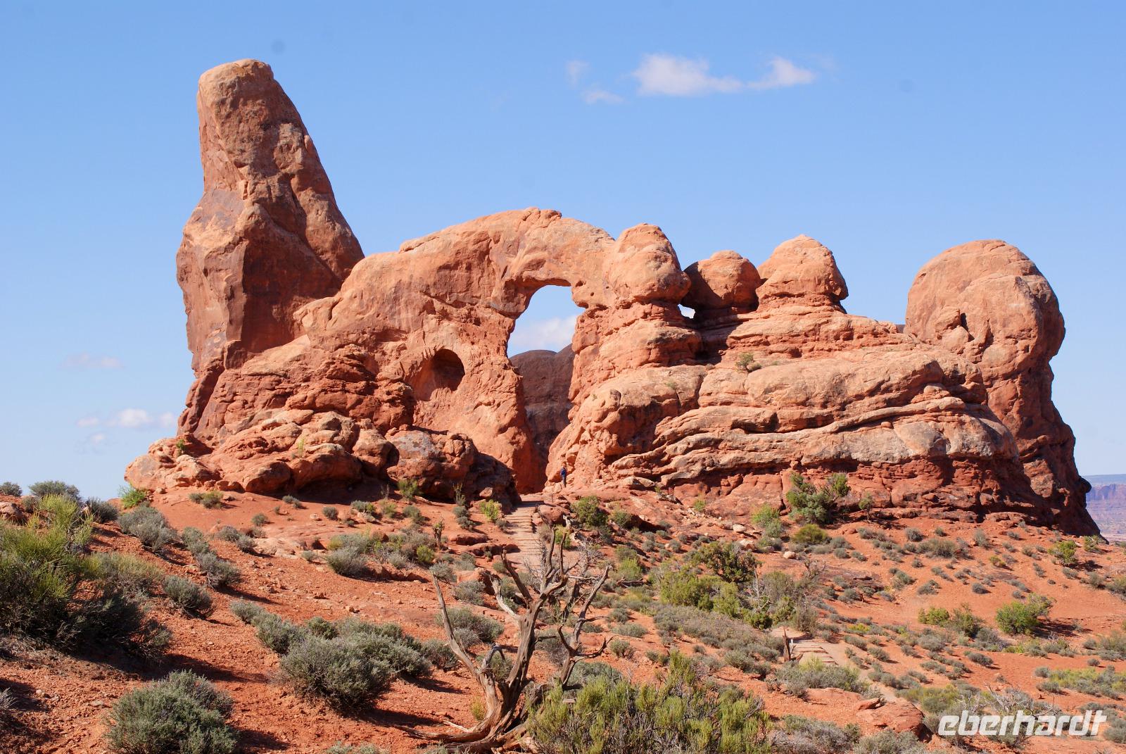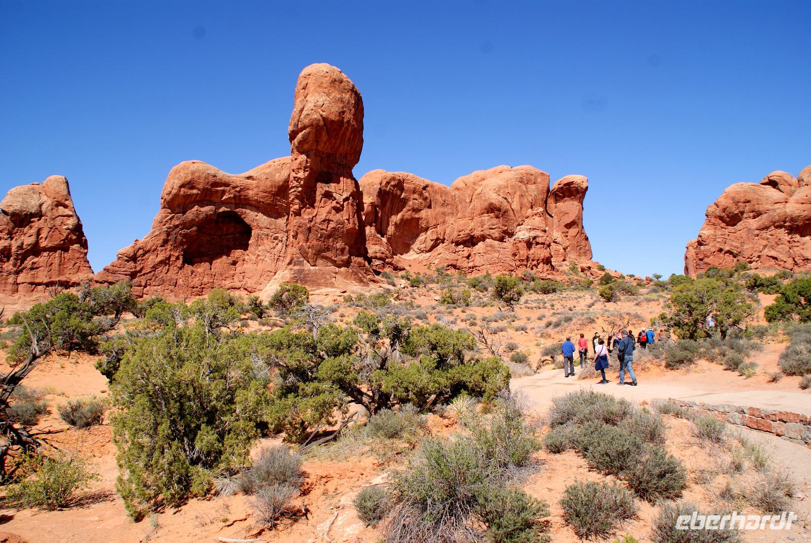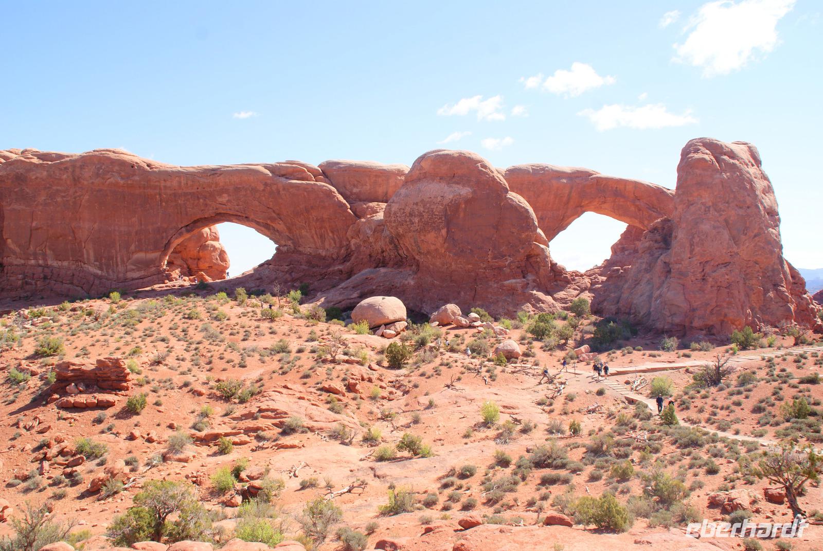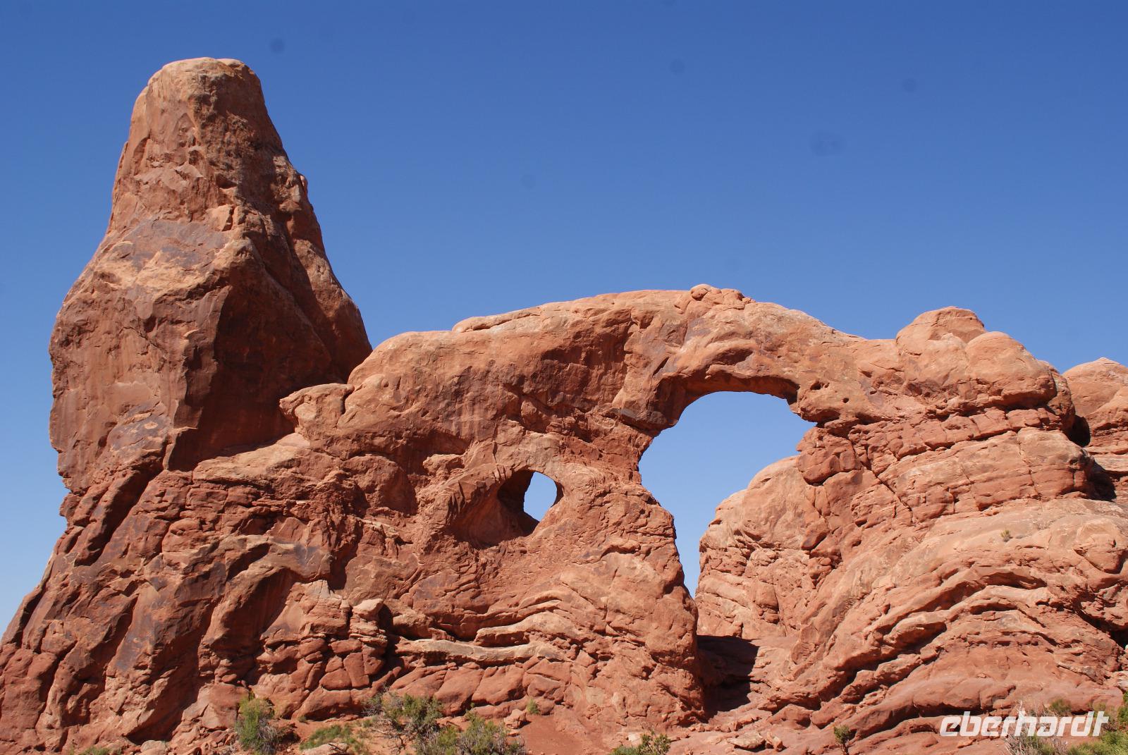 Der heutige Reisetag führt uns nach einem schönen Frühstück des Aarchway Inn Moab zunächst zum Arches Nationalpark. Vorher kaufen wir noch für unser Mittagspicknick im örtlichen Supermarkt ein. Wir haben heute Traumwetter, wolkenloser Himmel, die Sonne lacht und wir umso mehr. Am Visitor's Center des Nationalparks machen wir einen kurzen Halt und begeben uns dann zur „The Windows Section" und erwandern das North und South Window, den Double Arch und die Elefantenparade. Die Arches (Bögen) entstehen und entstanden durch härtere und weichere Gesteinsschichten, denen der Wind zusetzt und mit der Zeit Löcher entstehen. Chris hat große Mühe, uns zum Weitergehen zu bewegen... Wir können uns nicht sattsehen von dieser tollen Kulisse und schießen nicht enden wollende Fotos. So mancher von uns denkt-es ist noch schöner als der Grand Canyon! Ein Traum, welch ein Farbenspiel. Teil 2 führt uns zum Delicate Arch, den berühmten Bogen, den man auf den Nummernschildern des Bundesstaates Utah sieht. Ein schöner Spaziergang mit atemberaubender Kulisse. Die Weiterfahrt führt uns zum Park Avenue Aussichtspunkt, der einen tollen Abschluss des Nationalparks bietet. Unser Mittagspicknick nehmen wir am Dead Horse Point, der seinen Namen aus der Indianerzeit erhielt. Einst trieben die Stämme Wildpferde bis hierher, mit der Absicht, diese einzufangen und zu zähmen. Die, die sich nicht fangen ließen, stürzten hier 600 m in die Tiefe, in der sich auch der Colorado River durch die Schlucht windet. Eine Wahnsinnskulisse, selten haben wir mit einem solchen Ausblick unser Mittagessen genossen. Am Nachmittag kehren wir nach Moab zurück, die einen bummeln durch das beschauliche Örtchen, die anderen entspannen sich am Pool. Abends kehren wir in den Moab Grill ein und lassen es uns bei Steak und Lachs so richtig gut gehen.