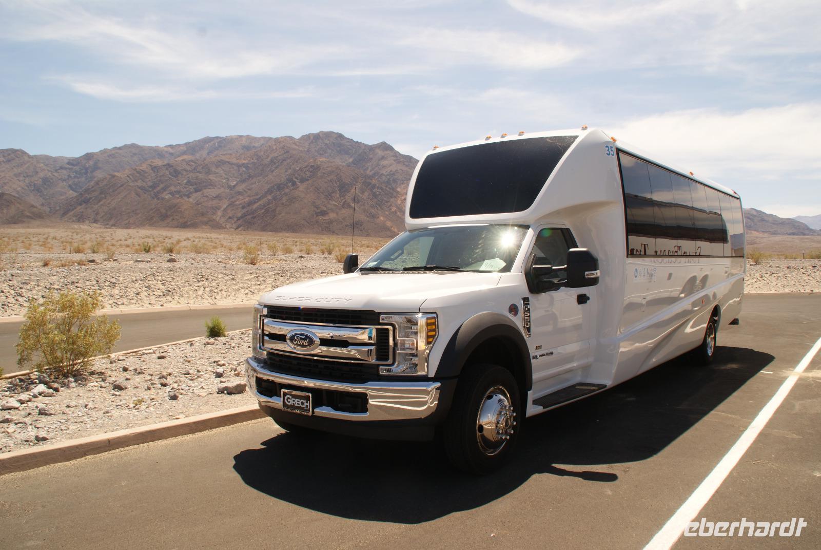 Nach einem atemberaubenden Frühstück im Hotel Luxor verlassen wir Las Vegas und begeben uns zunächst in einen Supermarkt, wo jeder nach Lust und Laune für das heutige Mittagspicknick einkaufen kann. Unser heutiges Tageshighlight ist das Tal des Todes/Death Valley, welches als tiefste und heißeste Stelle der USA gilt. Unterwegs staunen wir über die Stadt Amargosa mit Opernhaus, die heutzutage nur noch aus 6 permanenten Einwohner besteht und deren Zeit längst abgelaufen ist. Wie immer versüßt uns Chris die heutige knapp 700 Km lange Fahrt mit vielen interessanten Informationen, Anekdoten und auch der ein oder andere Witz darf nicht fehlen. In Zabriskies Point angekommen, haben wir einen 360° Blick über das Tal des Todes und sind sprachlos über das Panorama, welches uns umgibt. Unser Mittagsstopp erfolgt heute im Furnace Creek Besucherzentrum, wo es Picknickmöglichkeiten und natürlich auch das ein oder andere Souvenir zu erstehen gibt. Das Thermostat zeigt bereits 37° an und wir stellen uns entsprechend darauf ein... Wir ziehen weiter durch die Landschaft und Chris erklärt uns, dass hier Filmszenen wie u.a. Star Wars und die Mumie gedreht wurden. Für den nächsten Fotostopp halten wir bei Stovepipe Wells und spazieren zu den hiesigen Dünen, nicht ohne vorher vor Klapperschlangen gewarnt zu werden. Lange halten wir uns nicht auf, denn der Sand ist einfach zu heiß und die ein oder andere Schuhsohle muss bereits daran glauben... Um das Death Valley zu verlassen, fahren wir durch das Paramint Valley (Tal) und sehen uns umrahmt von Bergen. Zur Linken die sogenannten Funeral Mountains (die Beerdigungsberge) und zur Rechten die Paramint Mountains. Eine unglaubliche Weite um uns herum und ein nicht enden wollendes Tal vor uns. Nachmittags halten wir in einem Nest namens Trona, welches beinahe menschenleer erscheint und viele Häuser verlassen ihr Dasein fristen. An der örtlichen Tankstelle sorgen wir für einen Besucherandrang und kaufen erst mal die Eistheke leer. Nach Verlassen der Wüste freuen wir uns über die Durchfahrt des San Joaquin Valleys, welches 800 Km lang und bis zu 150 Km breit ist. Landwirtschaft und Viehzucht werden hier betrieben und das satte Grün, die Hügel, Bäume, Tiere sind eine Wohltat für uns. Mit Ankunft in Bakerfield nutzen wir die Gelegenheit und gehen zunächst zu Sizzlers zum Abendessen. Bei Steak und toller Buffetauswahl stärken wir uns und beziehen dann unsere Unterkunft Rosedale, welche für eine Nacht unsere Herberge sein wird. Ein toller Innenhof mit Pool und imposanter Bar um die Ecke lässt uns den Abend gemütlich verbringen.