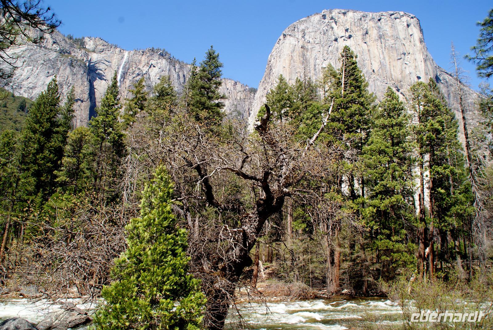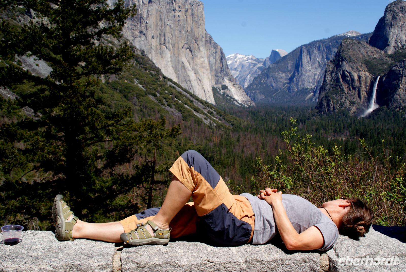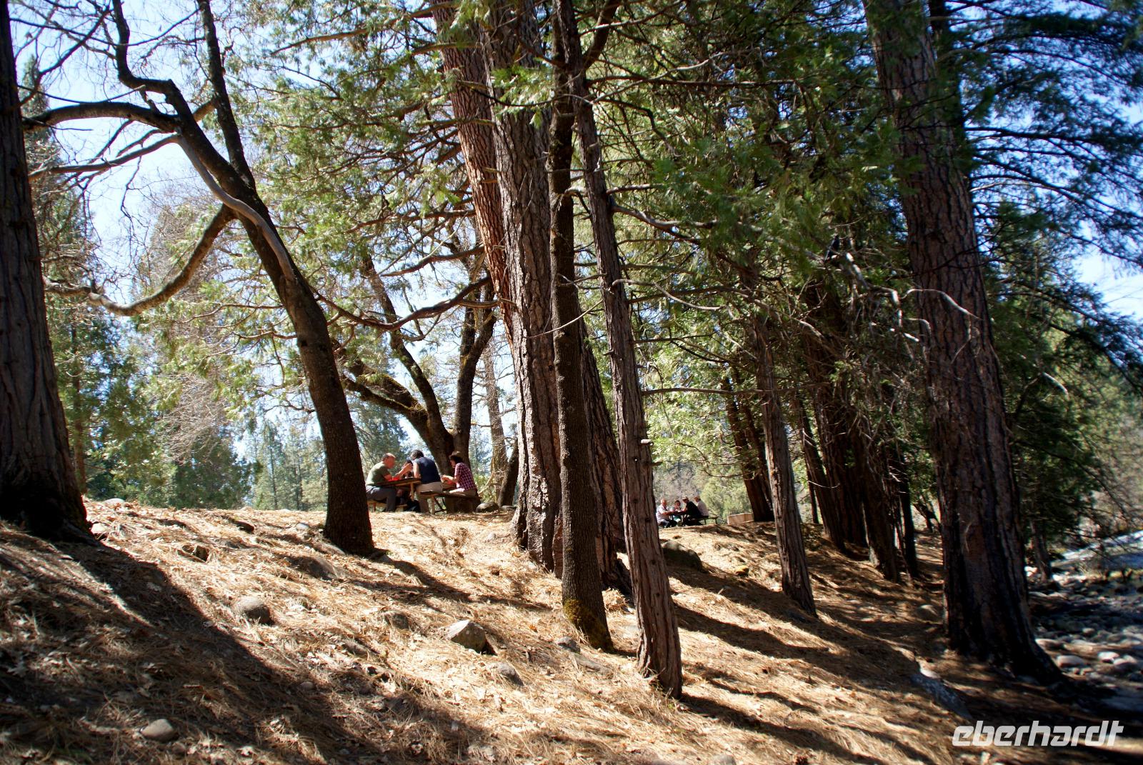 Nachdem wir heute Morgen „im eigenen Salon" gefrühstückt haben, verlassen wir Bakersfield und fahren wir wieder durch das San Joaquin Valley und Chris erläutert, warum die hier wachsenden Nüsse wie Macadamia, Pistazien, Mandeln eher hochpreisig sind. Beim Anbau der Nussbäume vergehen ca. 12 Jahre, ehe diese profitabel werden und man zum ersten Mal ernten kann und daraufhin können diese nur 12-15 Jahr genutzt werden. Im Vergleich dazu brauchen Orangenbäume gerade mal nur 3 Jahre und sie können 30-40 Jahre genutzt werden. Wir fahren vorbei an Fresno, welches für Landwirtschaft und Maschinenbau bekannt ist. In Oakhurst halten wir an einem großen Supermarkt und kaufen wir für unser heutiges von Eberhardt organisiertes Mittagspicknick ein. Im Anschluss fahren wir zum Nationalpark. Wir erfahren, dass Yosemite ursprünglich in der Indianersprache einen anderen Namen, nämlich Land der Bären hatte. Jedoch verstanden die damaligen französischen Pelzjäger im Jahre 1830 es falsch und machten daraus Yosemite. Es war Abraham Lincoln, der das Yosemite Gebiet (auf einen Antrag auf Naturgebiet von Mr. Stanford) zum ersten Nationalpark der Vereinigten Staaten erklären ließ. Noch in der heutigen Zeit tragen die Parkranger eine Uniform, die an die Kavalleriekleidung von 1902 erinnert. Unser Mittagspicknick nehmen wir am Wawona Fluss ein und Chris zeigt uns einen super idyllischen Picknickplatz. Es fehlt uns an nichts und wir speisen fürstlich bei Wein, Bier, Säften und köstlichen Speisen. Bis zu unserer heutigen Wanderung zum Spiegelsee legen wir noch etliche Fotostopps ein und sind erneut tief beeindruckt von der Schönheit des Yosemite Nationalparks. Unzählige Wasserfälle links und rechts unseres Weges, wie beispielsweise die Yosemite Falls mit 700 m Höhe führen unsere Fahrt schließlich zum Ausgangspunkt der Wanderung. Ein schöner Spaziergang durch die Natur bringt uns zum Mirror Lake, der leider sehr wenig Wasser führt. Zurück von unserer Wanderung stoßen wir mit den restlichen Getränken auf einen tollen Tag an und lassen den letzten Wasserfall auf uns wirken, bevor es zu unserer heutigen Unterkunft, der Cedar Lodge, geht. Mitten in der Natur des Nationalparks wohnt es sich besonders idyllisch und so lassen wir den Abend in der Bar beim Abendessen und kühlem Bier oder einfach vor unseren Zimmern auf den Terrassen ausklingen.