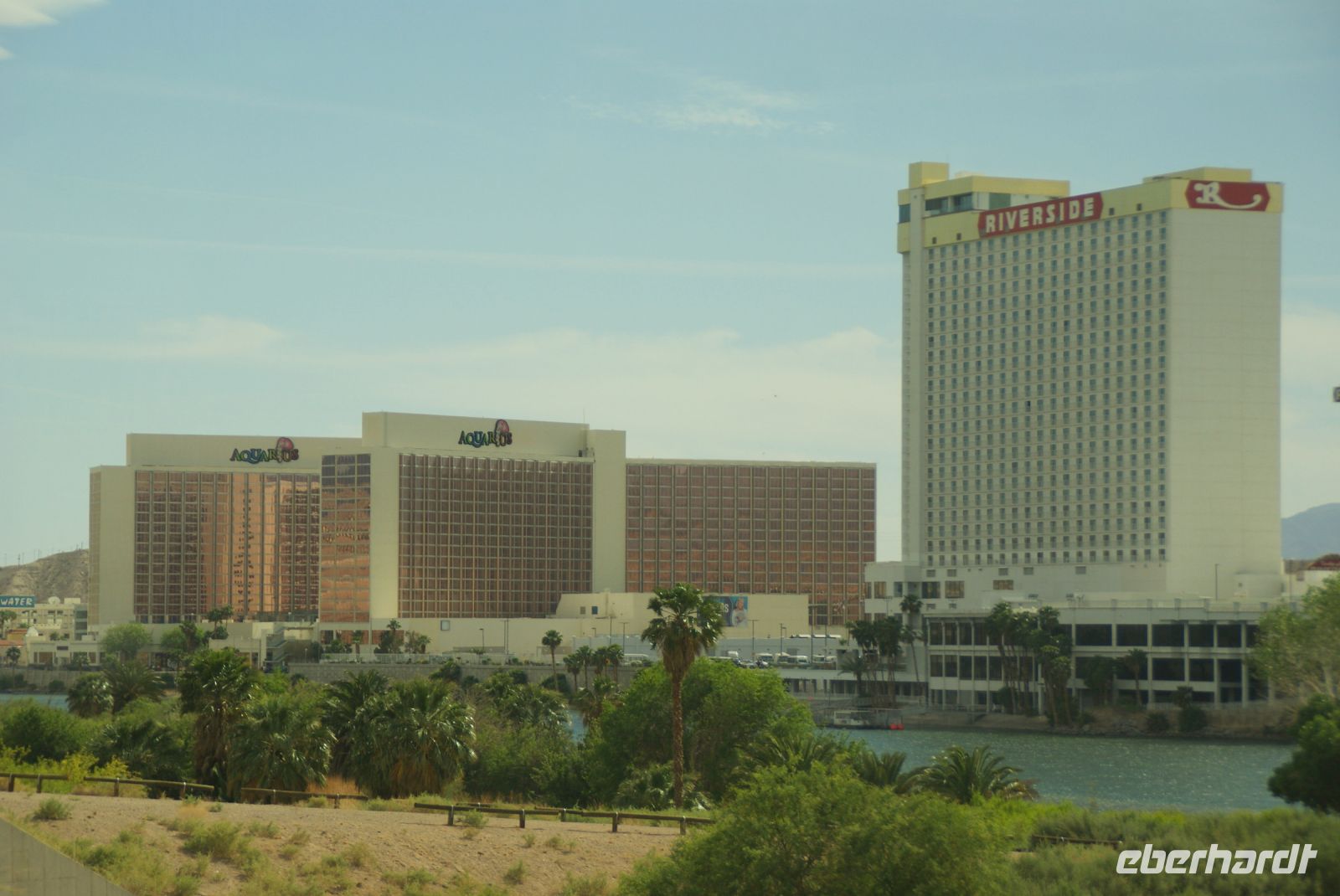 Heute nehmen wir Abschied von den „Angelinos“, wie die Bewohner Los Angeles liebevoll genannt werden. Unsere Fahrtzeit bis Calico, der ehemaligen Silberminenstadt, nutzt Chris, um uns viel Wissenswertes über die USA zu vermitteln. Wir hören, dass Kalifornien „Caldo Forno“ also "heißer Ofen" bedeutet und der Bär im Wappen darauf beruht, dass die einstigen Entdecker in der Sierra Nevada unzählige Bären vorfanden und somit Kalifornien zur „Bärenrepublik“ erklärten. Der Bundesstaat ist zweisprachig, da mehr als die Hälfte der Bewohner Spanisch sprechen. Dies sehen wir auch sehr häufig an öffentlichen Schildern, die auf Englisch und Spanisch beschriftet sind. Ein für uns heikles Thema wird erklärt-das amerikanische Waffengesetz. Wir erfahren, dass dies tief in der amerikanischen Verfassung verankert ist und aus der Gründerzeit von 1776 stammt. Einst stand jedem US-Bürger, sofern er nicht vorbestraft war, das Recht auf Verteidigung zu und so ist es bis heute. Das Resultat ist, dass es bei 340 Millionen US-Einwohnern ca. 400 Millionen Schusswaffen gibt-wir staunen nicht schlecht. Mit Blick auf den San Bernadino, 2700 m und somit höchste Spitze der südlichen Sierra Nevada und Fahrt durch die Mojave Wüste, welche so groß ist wie halb Europa, erreichen wir die einstige Silberminenstadt Calico. Der Name entstand als Abkürzung von California Company, die hier einst Silber entdeckt und Minen geschaffen hat. Die Stadt bestand 26 Jahre von 1881 bis 1907 und wurde 1951 liebevoll von Walter Knott restauriert. Wir sehen noch viele Originalbauten aus der damaligen Zeit und fühlen uns mitten in den Wilden Westen versetzt. Umgeben vom Büro des Sheriffs über den Saloon bis hin zur alten Schule und Waschhaus fühlen wir uns in einer anderen Zeit und Welt. Mit rasanten 10 km/h ziehen wir mit der Bimmelbahn über das Minengelände und genießen die wilde Fahrt. Unser Tagesziel, die Spielerstadt Laughlin in Nevada, erreichen wir am späten Nachmittag. Wir haben nun den 3 Staaten Punkt erreicht, denn hier treffen sich Kalifornien, Nevada und Arizona. Nevada und Arizona trennt der Colorado River. Somit befindet sich Laughlin mit all seinen Spielkasinos in Nevada, wo Glücksspiel erlaubt ist und auf der anderen Seite des Flusses Arizona. Der Gründer der Spielerstadt war einst Don Laughlin, der eigentlich Viehzucht betrieb. Er baute für seine Arbeiter und Geschäftspartner Unterkünfte und legte so den Grundstein der Stadt. Später kamen dann Spielsalons, die späteren Kasinos hinzu, die Herrn Laughlin wesentlich lukrativer als die Viehzucht erschienen. Vieles im Ort erinnert noch an ihn, unter anderem das Automobilmuseum, welches seinen Fuhrpark bestehend aus wunderschönen Oldtimern zeigt. Nach dem Check-in im Tropicana Hotel spazieren wir am Colorado River entlang und versuchen es bei 36 Grad gemütlich angehen zu lassen. Abends ziehen wir nochmals los, um bei Dennys zu speisen. Die nächtliche Atmosphäre bildet eine tolle Farbkulisse, bei der unser Hotel herrlich beleuchtet ein tolles Fotomotiv bietet.