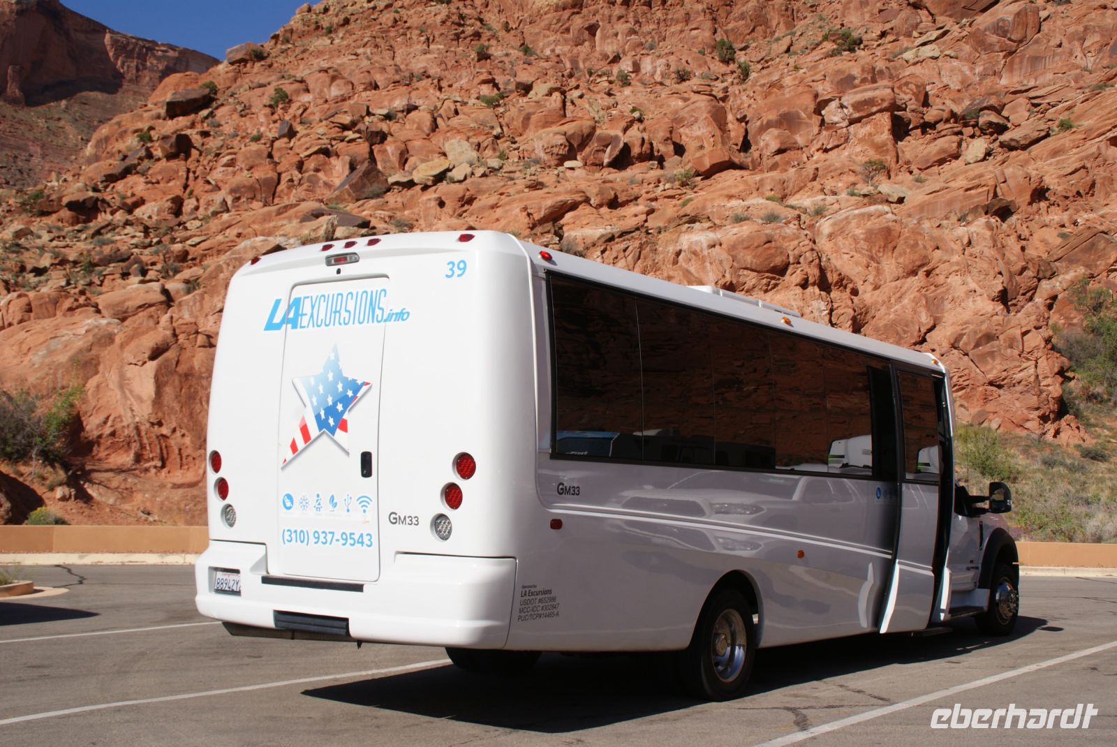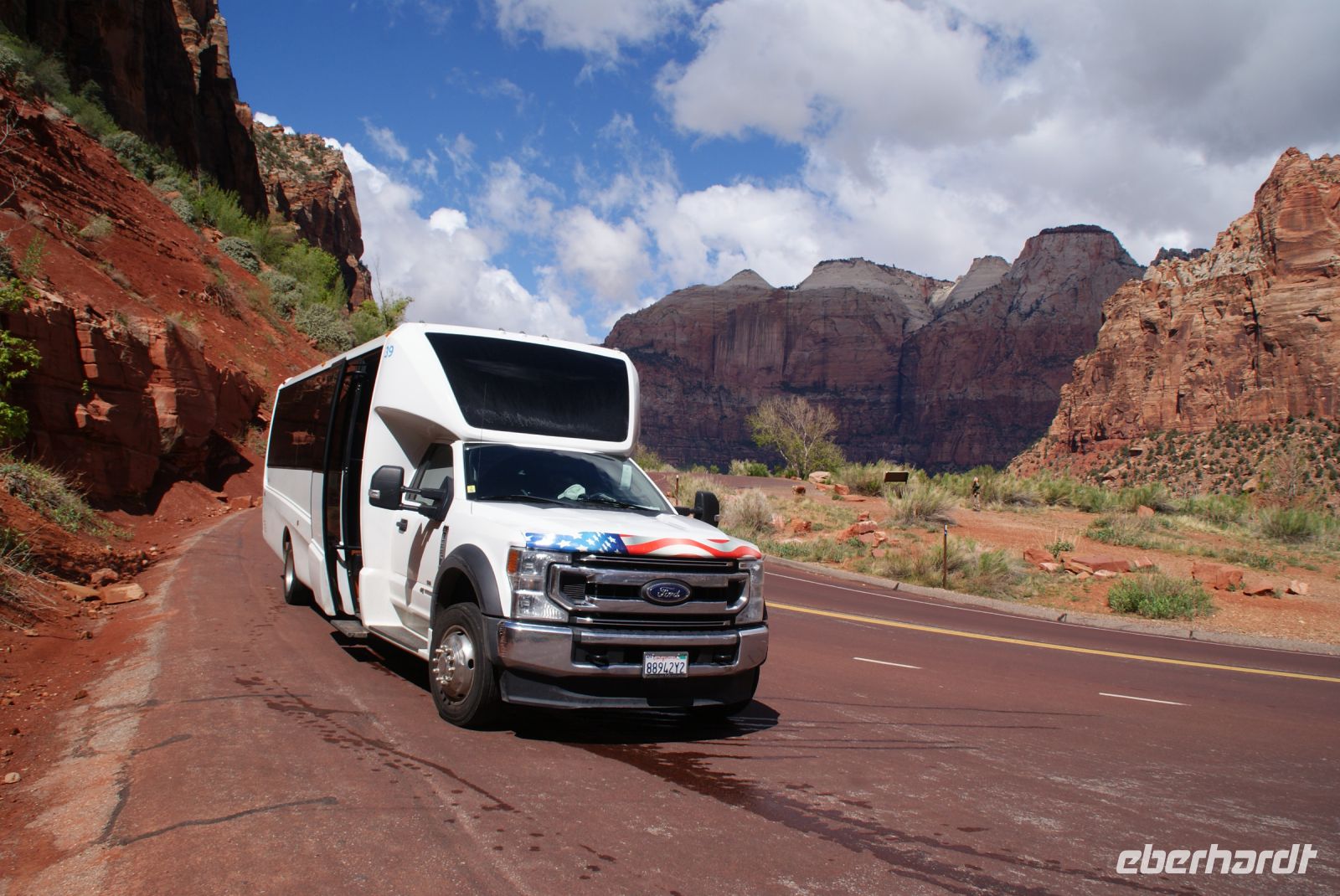 Heute Morgen trauen wir unseren Augen nicht. Es hat über Nacht etwas geschneit und alles ist verzuckert. Nach einem Frühstück vom großen Buffet starten wir nochmals, um den Bryce Canyon vom Bryce Point aus zu bewundern. Beinahe vom Winde verweht kämpfen wir uns bis zur Aussichtsplattform durch und haben das gesamte „Amphitheater“ nochmals vor-und unter uns liegen. Eine unglaubliche Aussicht mit winterlichen Häubchen-ein sicher unvergesslicher Anblick. Weiter geht unsere Reise zum heutigen Tagesziel Las Vegas. Chris weiß wieder viel Interessantes zu berichten und wie immer vergeht die Fahrt wie im Flug. Wir haben sogar das große Glück, einige Bisons in der Nähe der Straße zu sehen und erleben nun den Zion Nationalpark in all seiner Pracht. Zu bestaunen gibt es den sogenannten Checkboard Mesa, einen schachbrettartigen Felsen mit Längs-und Querstreben, die Wasser und Wind geformt haben. Dieser Felsen ist aus versteinertem Sand entstanden und bildet eine majestätische Kulisse. Am Giant Arch sehen wir nochmals einen Bogen, der sich in einen Felsen gebildet hat. Nach einem Mittagsstopp in St. George erreichen wir am Nachmittag die Spielerstadt Las Vegas, die 1937 anlässlich des Baus des sich in der Nähe befindenden Hoover Damms entstand. Wir checken zunächst in unser 4100 Betten großes pyramidenförmiges Hotel Luxor ein. Allein der Check-in Bereich gleicht in seiner Größe einem Flughafen. Bald darauf starten wir zur Las Vegas Tour. Zunächst speisen wir themengerecht im Hard Rock Café mit Burger und Co. Weiter geht’s zum alten Teil von Las Vegas, zur Fremont Street. Diese ist bekannt für ihre Hightech Lichtershow, die stündlich gezeigt wird. Wie schon von Chris angekündigt, sind wir etwas erschlagen von der Vielzahl der Menschen, dem Ambiente und auch den schrägen Gestalten, die sich dort tummeln. Wir besuchen das Caesars Palace und spazieren hindurch, staunen über den künstlichen Himmel, die nicht enden wollenden Geschäfte. Weiter gehen unsere Erkundungen zu „The Venetian“ nach Venedig und wir staunen nicht schlecht über den Markusplatz sowie die Gondeln, die auf richtigen Kanälen fahren, etc. Eine verrückte Welt, Europa auf einer Straße greifbar. Auf unserer Weiterfahrt zum Las Vegas Strip kommen wir an unzähligen Hochzeitskapellen vorbei und sehen sogar eine, bei der man im Auto sitzend in Windeseile getraut werden kann. Abschließend sehen wir das Spektakel der Wasserspiele des Bellagio Hotels an und vorbei an Paris Paris mit Eiffelturm davor, fallen wir bald aufgrund all dieser bunten Eindrücke und einem erlebnisreichen Tag müde in unsere Betten…