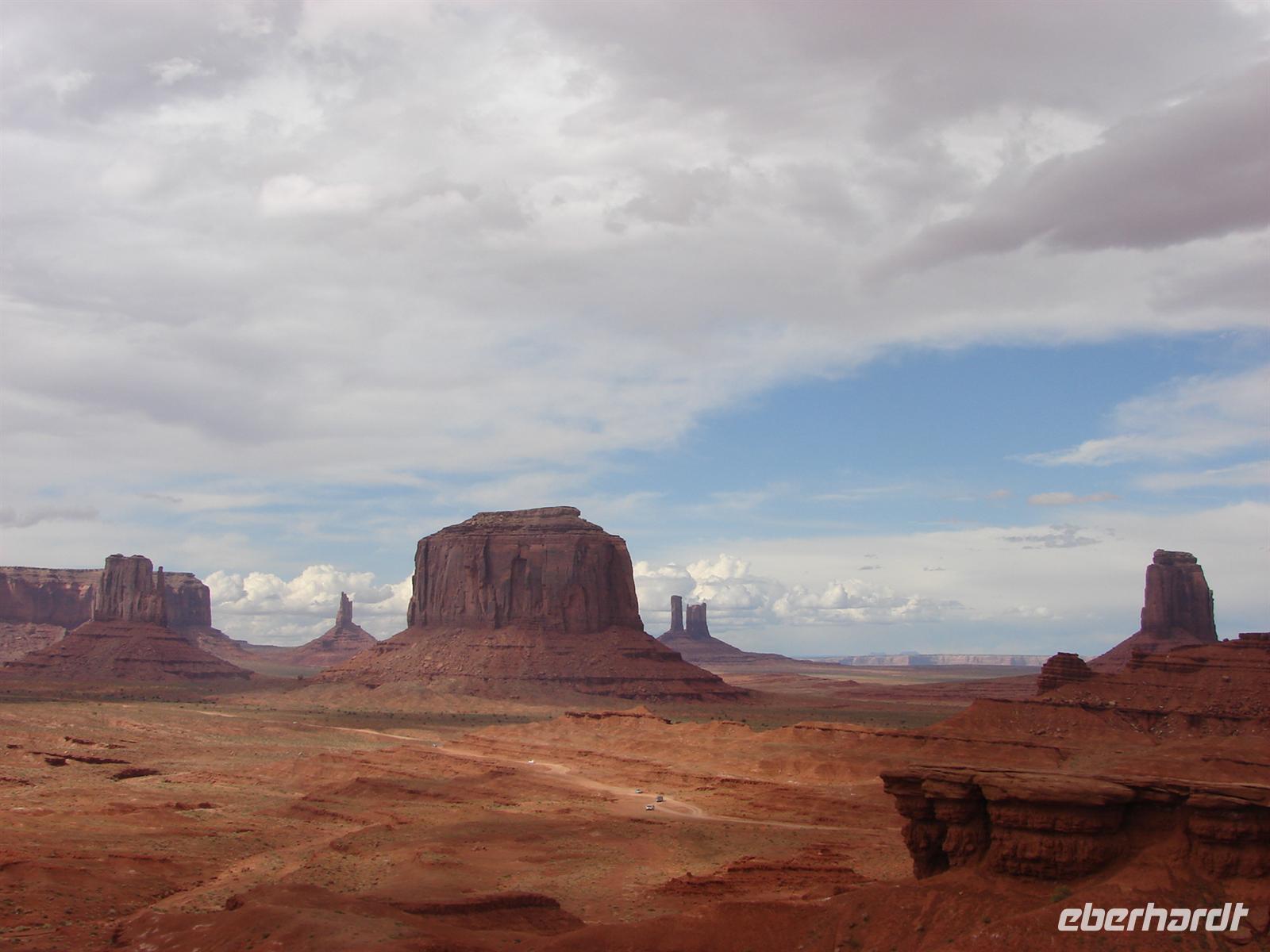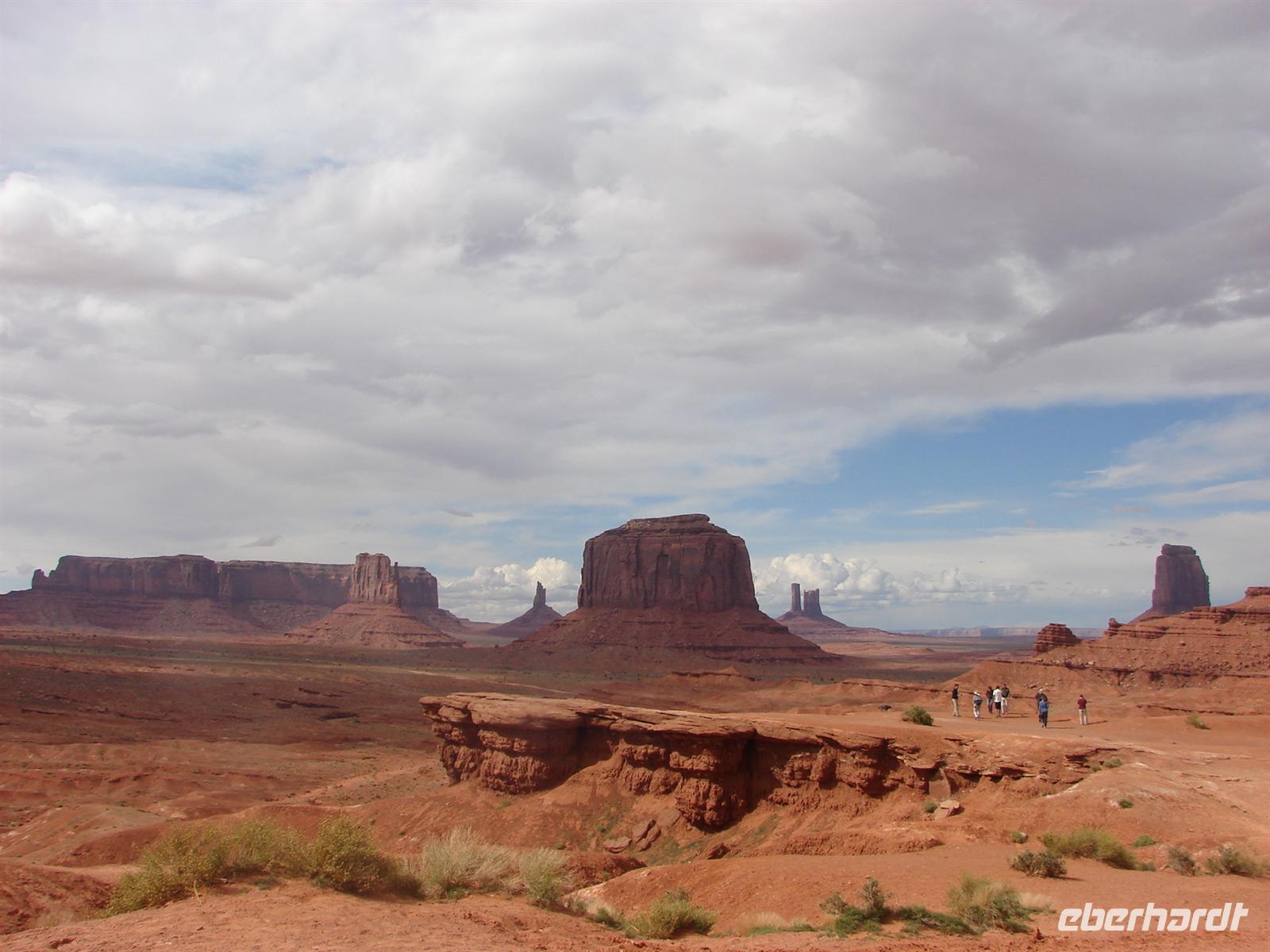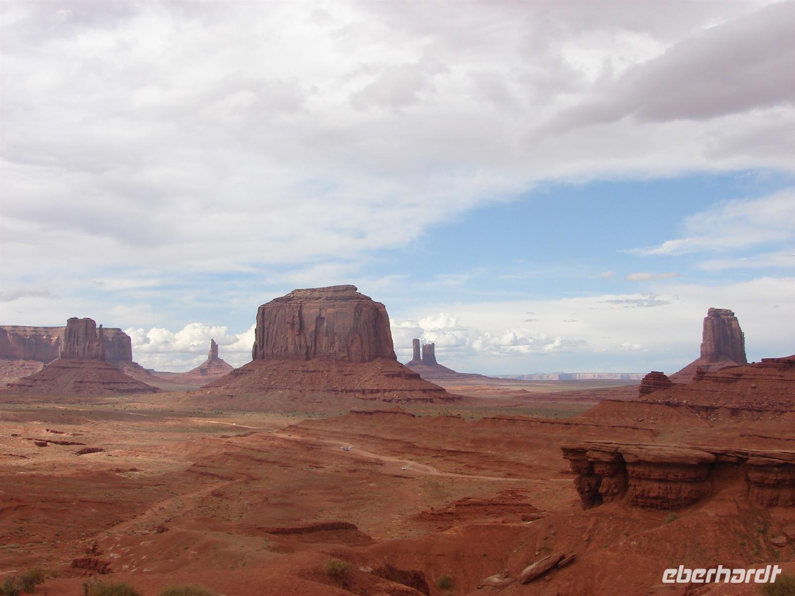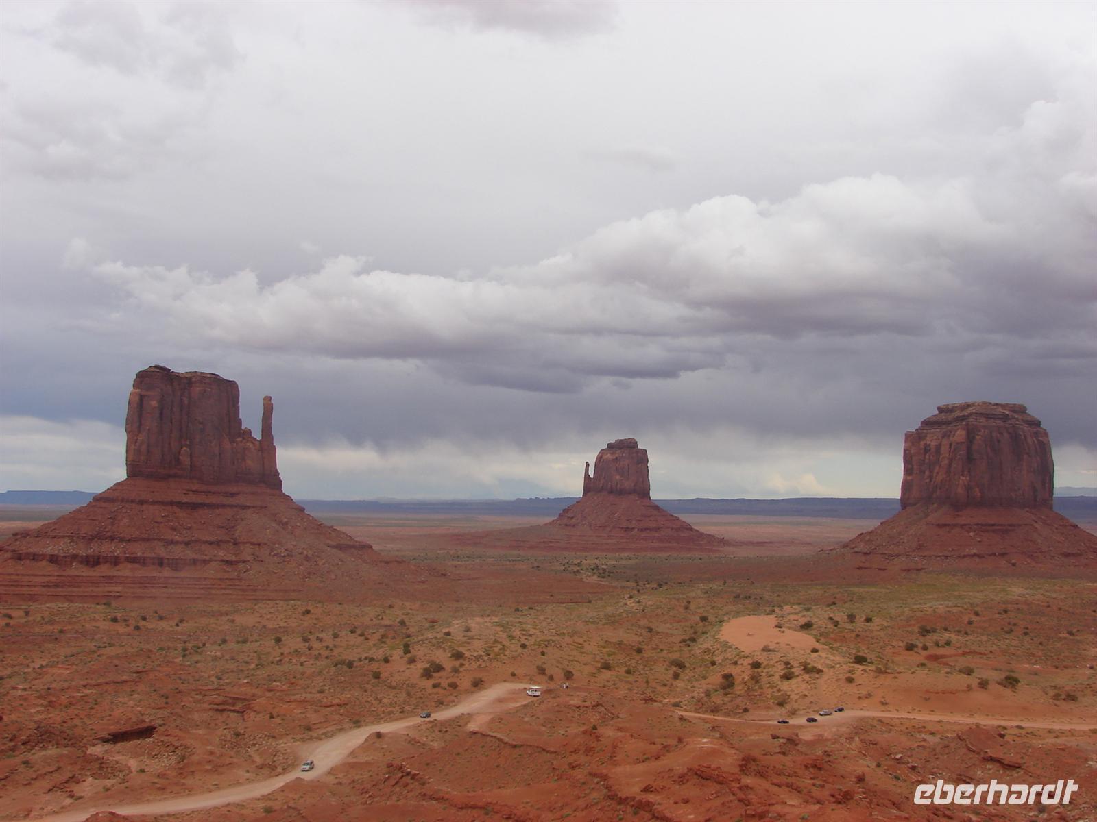 Leider mussten wir heute vom Grand Canyon Abschied nehmen, aber ein neuer Tag mit wiederum vielen Erlebnissen wartete auf uns. Zuerst machten wir noch einen kurzen Stop am Desert View und erklommen den Desert View Watch Tower. Von oben hatte man einen letzten, wunderbaren Blick über den Grand Canyon. Und dann ging es direkt zum Monument Valley. Bevor wir zum Jeep Abenteuer starteten, stärkten wir uns noch mit „lecker“ Navajo Tacos, die einfach riesig waren. Da es beim Mittagessen noch zu regnen anfing, fragten sich viele ganz bang, wie wird das Wetter direkt im Monument Valley sein? Pünktlich zum Start der Jeep Safari hörte es auf zu regnen und es lugte ab und zu sogar die Sonne hervor. Von den Navajo-Indianern wurden wir mit Jeeps, auf denen jeweils 12 Gäste Platz nehmen konnten, zu den Highlights gefahren. Und wieder staunten wir nur so, welche Gesteinsformationen die Natur geschaffen hatte. Und am Ende gab es natürlich auch noch das bekannte „Marlboro-Foto“. Am späten Abend kamen wir voller Eindrücke in Moab, der amerikanischen Hauptstadt des Mountainbikings an. Schon unterwegs hatte es wieder zu regnen begonnen und das mitten in der Wüste! Da unser Abendessen in einem netten mexikanischen Restaurant reserviert war, konnte uns der Regen nichts anhaben. Kaum zu schaffen, waren die riesigen Portionen und wir ließen uns das Corona Bier schmecken.