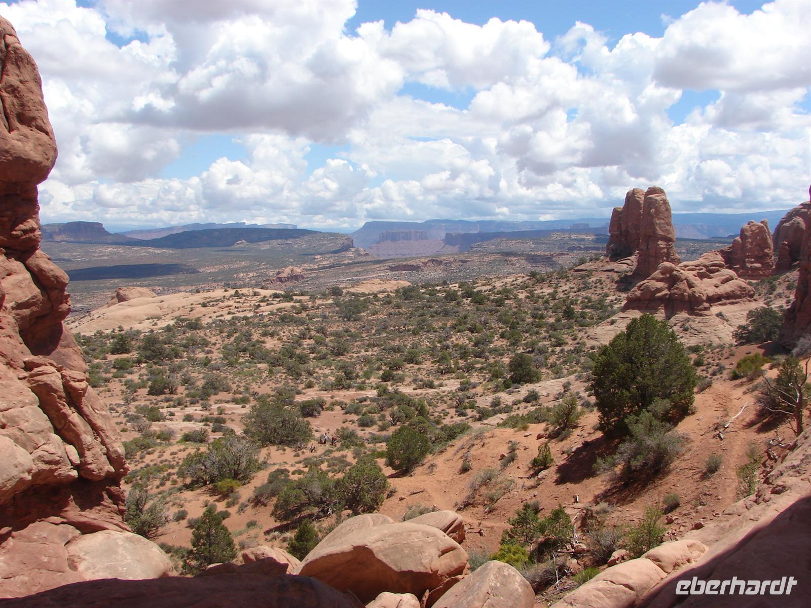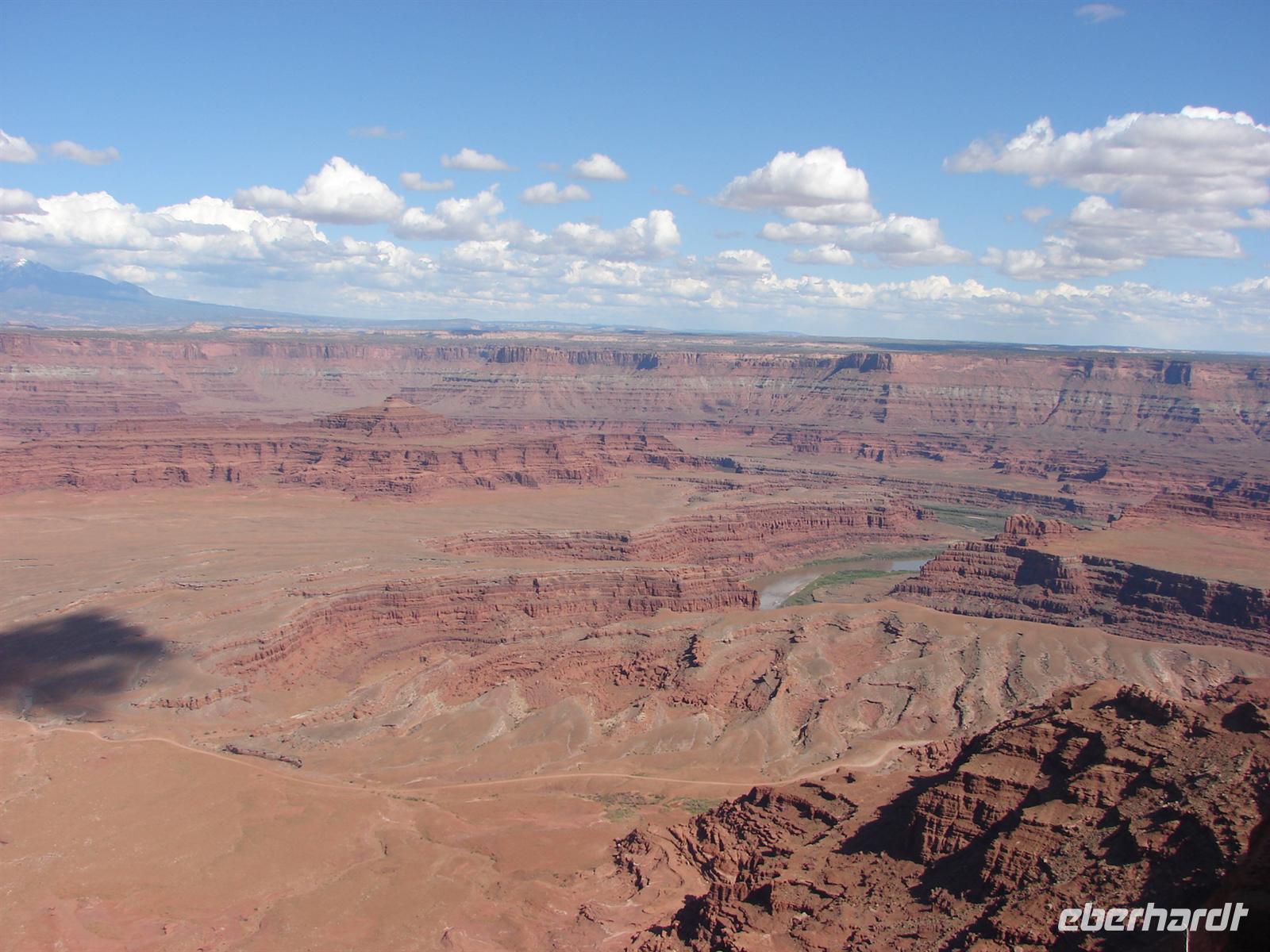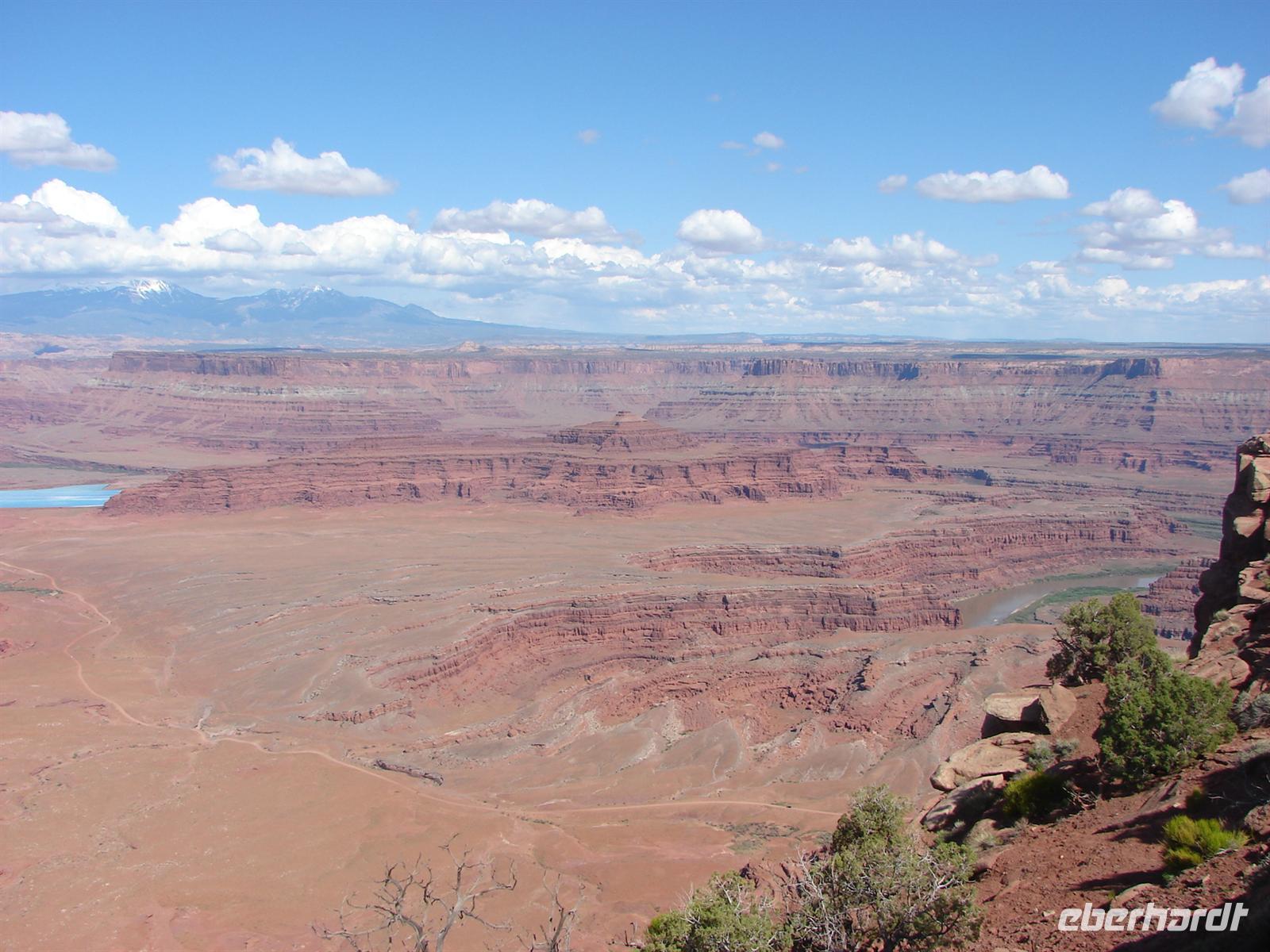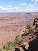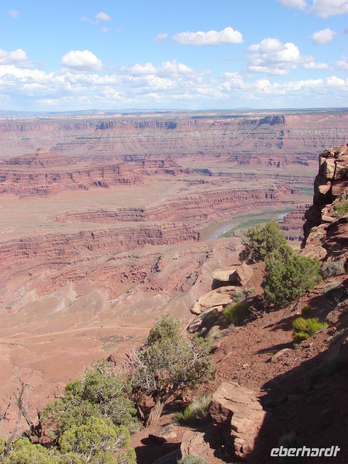 Besonders gespannt waren wir heute auf das kontinentale Frühstück, welches uns Margaruite angekündigt hatte. Es ist schon ungewöhnlich von Papptellern mit Plastebesteck zu essen. Aber da für das Frühstück nur für uns auch Käse und Wurst organisiert waren, nahmen wir die amerikanische Eigenheit hin und starteten ausgelassen in den Tag, denn auch die Sonne schien heute endlich wieder. Bevor wir zum Arches NP fuhren, legten wir noch einen kurzen Stop beim Supermarkt ein. Unsere Reiseleiterin hatte uns für Mittag ein Picknick angekündigt und jeder kaufte noch einige Kleinigkeiten dazu ein. Bei einer kleinen Wanderung durch den Arches Nationalpark erkundeten wir den Devils Garden und wurden am Ende des Weges mit einem tollen Ausblick auf den Landscape Arch belohnt. Unterwegs entdeckten wir außerdem so manche interessante Pflanze oder beobachteten die wieselflinken Geckos. Anschließend hatten wir noch Zeit für einen kurzen Fotostop am Delicate Arch und schauten durch die sogenannten „Nord- & Südfenster“. Wie versprochen picknickten wir direkt am Fluss, ließen uns die rustikale Mahlzeit schmecken und waren erstaunt, wie gut unsere Busfahrerin Juvelyn vorbereitet war. Da fehlte nicht einmal die Tischdecke für den Picknickplatz. Am Nachmittag standen die Canyonlands auf dem Programm. Unbeschreiblich ist der Ausblick vom Death Horse Point auf den ca. 600 m tiefer gelegenen Colorado River. Abends nutzen wir die Möglichkeit, individuell im netten Städtchen Moab ein paar Souvenirs einzukaufen oder in einem der zahlreichen Restaurants zu essen.