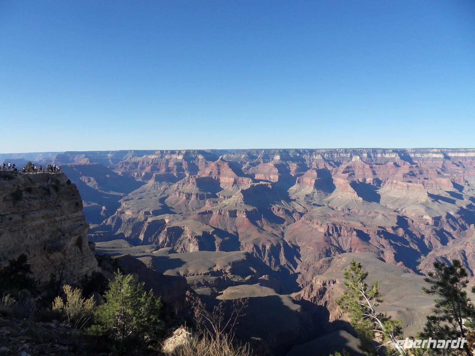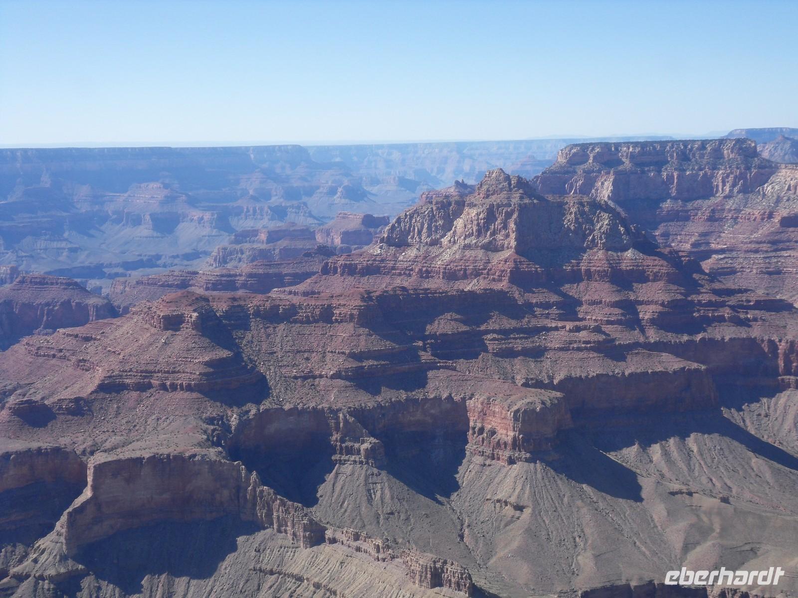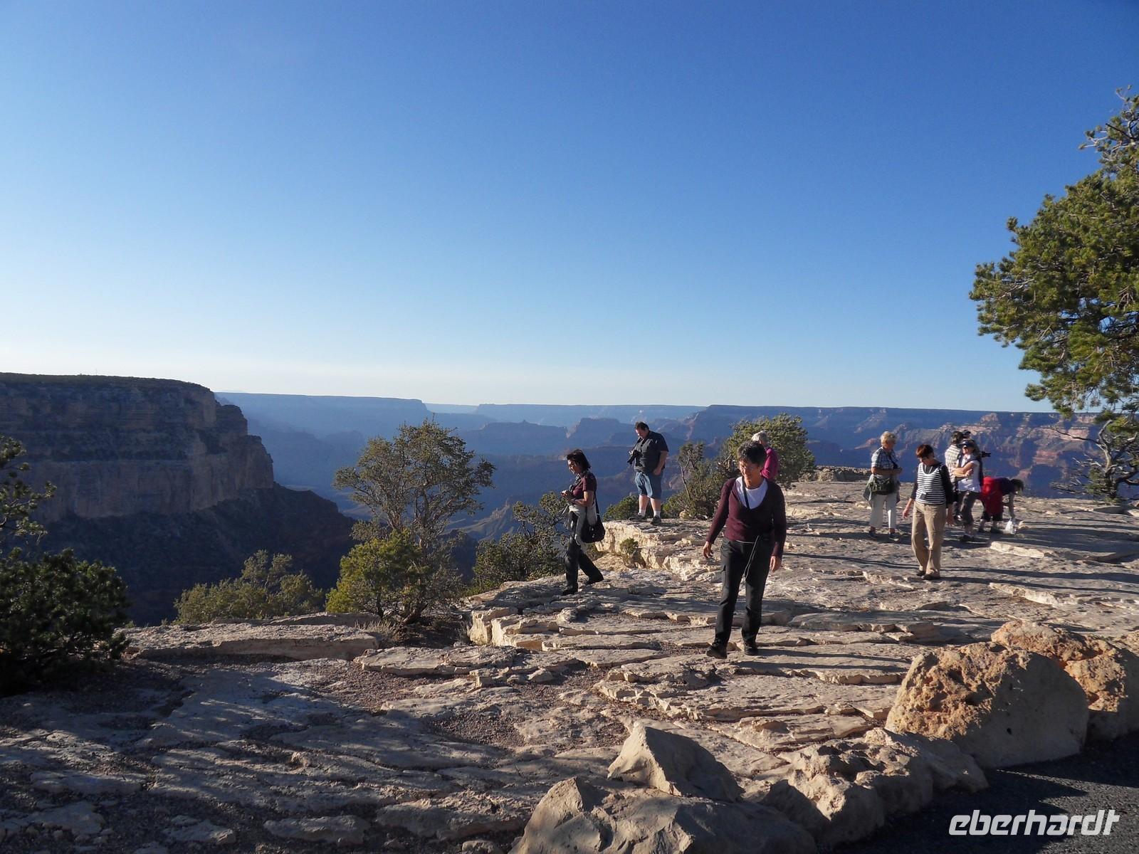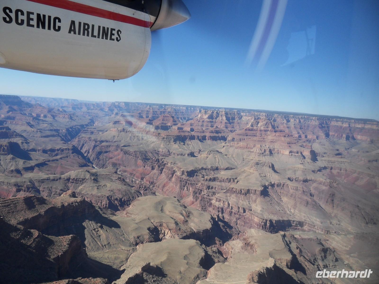 Der heutige Morgen begann feucht-fröhlich, denn zum Frühstücksbuffet gehörte hier in Laughlin gleich ein Glas Sekt, was man aber selbstverständlich nicht trinken musste. Mit gepackten Koffern ging es dann weiter über den Colorado-Fluss hinein nach Arizona. Nach einer Buskontrolle fuhren wir u.a. durch den Ort Kingman. Hier gibt es Motels wie in Filmen, wo man sein Auto direkt vor der Zimmertür parken kann, doch diese sollten wir während unserer Rundreise noch öfter sehen. Schließlich hielten wir in Seligman an der Route 66, wo man Souvenirs der berühmten Straße erstehen, aber auch Oldtimer und mit etwas Glück sogar einen Motorradfahrer sehen konnte. Weiter ging es dann zu einem der Höhepunkte der Reise. Auf uns wartete der Grand Canyon, den viele von uns „von oben“ sehen wollten. So wurde unsere Reisegruppe auf 2 Flugzeuge aufgeteilt. Der Rundflug, bei dem wir atemberaubende Ausblicke hatten, dauerte ca. 45 Minuten und war sicher für alle von uns ein unvergessliches Erlebnis. An Nachmittag legten wir dann an einem Supermarkt/Cafeteria eine Mittagspause ein, bevor wir ca. 3 Stunden in gemütlichem Tempo und mit vielen Fotostopps am Grand Canyon entlang spazierten. Als es dunkel wird, machen wir uns auf den kurzen Weg zu unserem Hotel. Nach dem Abendessen hatten wir hier die Möglichkeit, im IMAX-Kino nebenan einen 40-minütigen Film über das Innere des Grand Canyon zu sehen, der beinahe ebenso beeindruckend ist wie das Original vom Rand aus und aus der Luft. Zudem erfuhren wir auch Wissenswertes über die früheren Bewohner des Canyons sowie seine „Entdecker“, die mit Booten zu Expeditionen aufbrachen.
