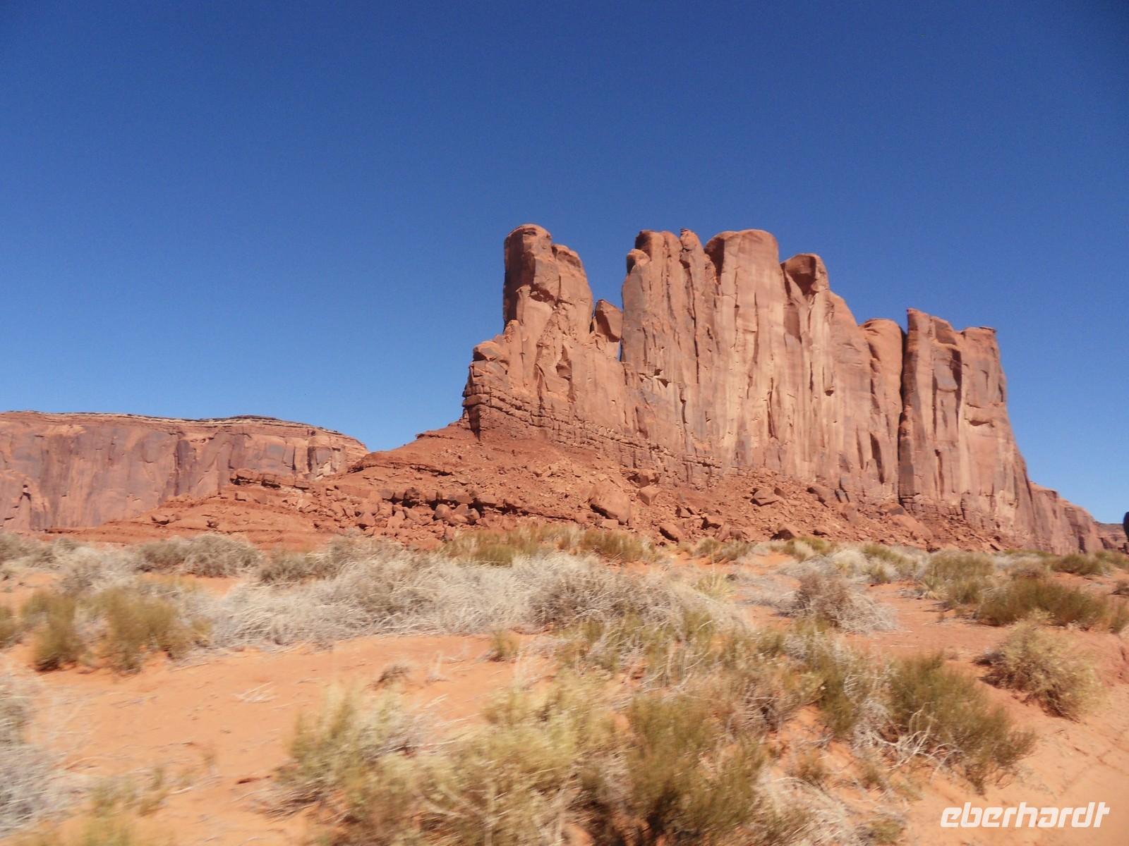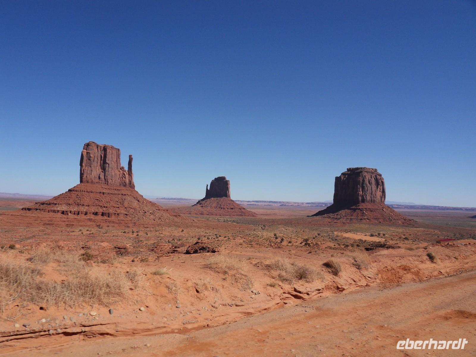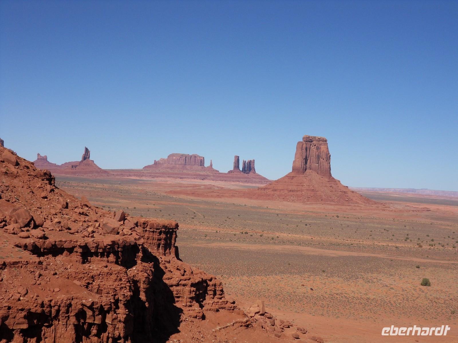 Am Morgen erwartete uns ein erneuter Abstecher zum Grand Canyon, den wir nun wieder in einem ganz anderen Farb- und Lichtspiel bewundern durften. So machten wir einen Stopp am Aussichtspunkt „Desert View“, der auch einen Aussichtsturm besitzt. Danach fuhren wir weiter in Richtung Monument Valley, wobei wir durch das Navajo-Reservat und die sogenannte „painted desert“ mit ihren beeindruckenden Felsformationen und Farbschichten fuhren. Die Fahrt wurde uns von Marguerite zusätzlich verkürzt, indem wir mehr über das Leben der Indianer im Reservat erfuhren und uns danach passend zur Landschaft traditionelle indianische Musik sowie Westernfilmtitel anhörten. Im Monument Valley angekommen, dass sich im Bundesstaat Utah befindet, stiegen wir auf zwei Jeeps um, mit denen uns zwei Navajo-Indianer näher an die tollen Felsformationen brachten. Direkt an einer riesigen Felswand gab es dann zum Mittag ein Essen der Indianer: frittierte Brote mit Bohnen, Käse, Tomaten, Oliven und Zwiebeln. Unser letzter Fotostopp bringt uns zur Aussicht, die uns aus der Werbung nur allzu bekannt vorkommt: für 2 US-Dollar kann man sich hier mit Lasso und Cowboyhut ganz wie der „Marlboro-Mann“ auf einem Pferd fotografieren lassen. Nachdem ich einige unserer Gäste dabei fotografiert hatte, wollte ich selbst auch ein solches Bild, doch leider verletzte ich mir beim Aufsteigen das Knie, so dass ich nach einem Krankenhausbesuch am nächsten Tag die Reisegruppe nun für die restlichen Tage mit Kniebandage und auf Krücken begleitete. Mit den Jeeps fahren wir zurück zum Ausgangspunkt, wo Dennis mit dem Bus auf uns wartet. Im Dunkeln erreichen wir die typisch amerikanische Bar „Frankie D‘s“ in Moab, wo wir heute unser Abendessen einnehmen. Hier werden uns riesige Steaks serviert und viele unserer Gäste freuen sich, dass sie auch einmal eine typische Bar von innen sehen. Danach fahren wir nur noch wenige Minuten bis zu unserem Hotel Aarchway Inn, wo wir die nächsten zwei Nächte bleiben.