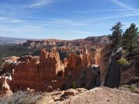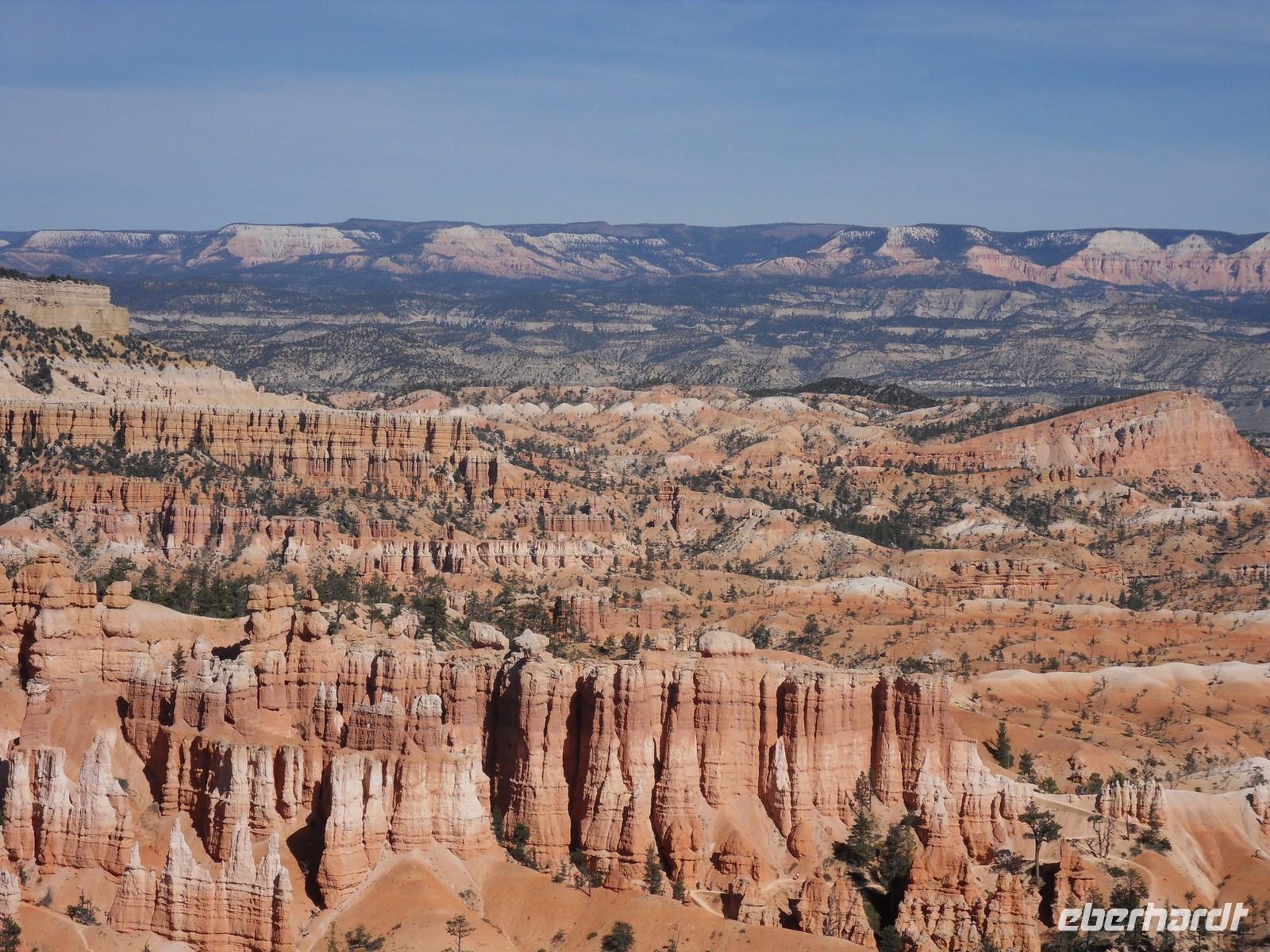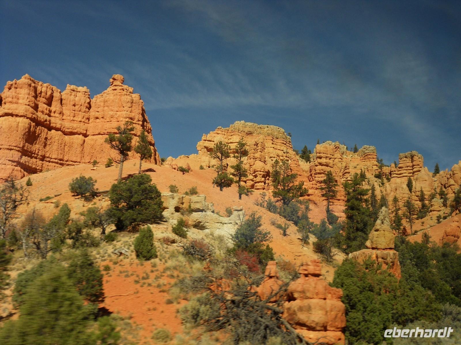 Heute erwartet uns der berühmte Bryce Canyon, doch zunächst fahren wir vorbei an anderen, z.T. in der Ferne sogar schneebedeckten Felsformationen, die ebenfalls interessant sind und die wir vom Bus aus genießen können. Nach einer recht langen Fahrtstrecke, die mit Westernmusik untermalt wurde, erreichen wir den Red Canyon, wo wir an der Felsformation „Max & Moritz“, oder „Salz und Pfeffer“, wie es die Amerikaner nennen, einen Fotostopp einlegen. Unsere Mittagspause machen wir im Ruby’s Inn, wo wir heute abend auch schlafen werden. Danach geht es endlich zum Bryce Canyon. Diese Landschaft aus Kalksteintürmchen ist unbeschreiblich schön und man kann immer wieder neue Farbschattierungen in den „Feen-Felsen“ entdecken. So konnte man hier entweder auf eigene Faust spazieren gehen oder zusammen mit Marguerite hinunter in den Canyon steigen. Gegen 17 Uhr kamen wir dann wieder an unserem Hotel an, wo wir etwas abseits des Hauptgebäudes in der „Lake View Lodge“ untergebracht waren. Beim Abendessen mussten wir aber leider sehr lange anstehen und auf einen Tisch warten, da mehrere Reisegruppen vor Ort waren und es nicht genügend Kellner für die Größe des Restaurants gab.