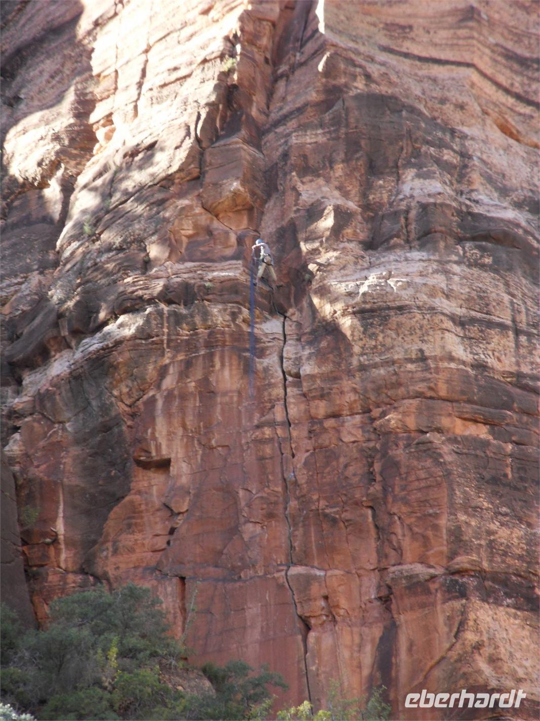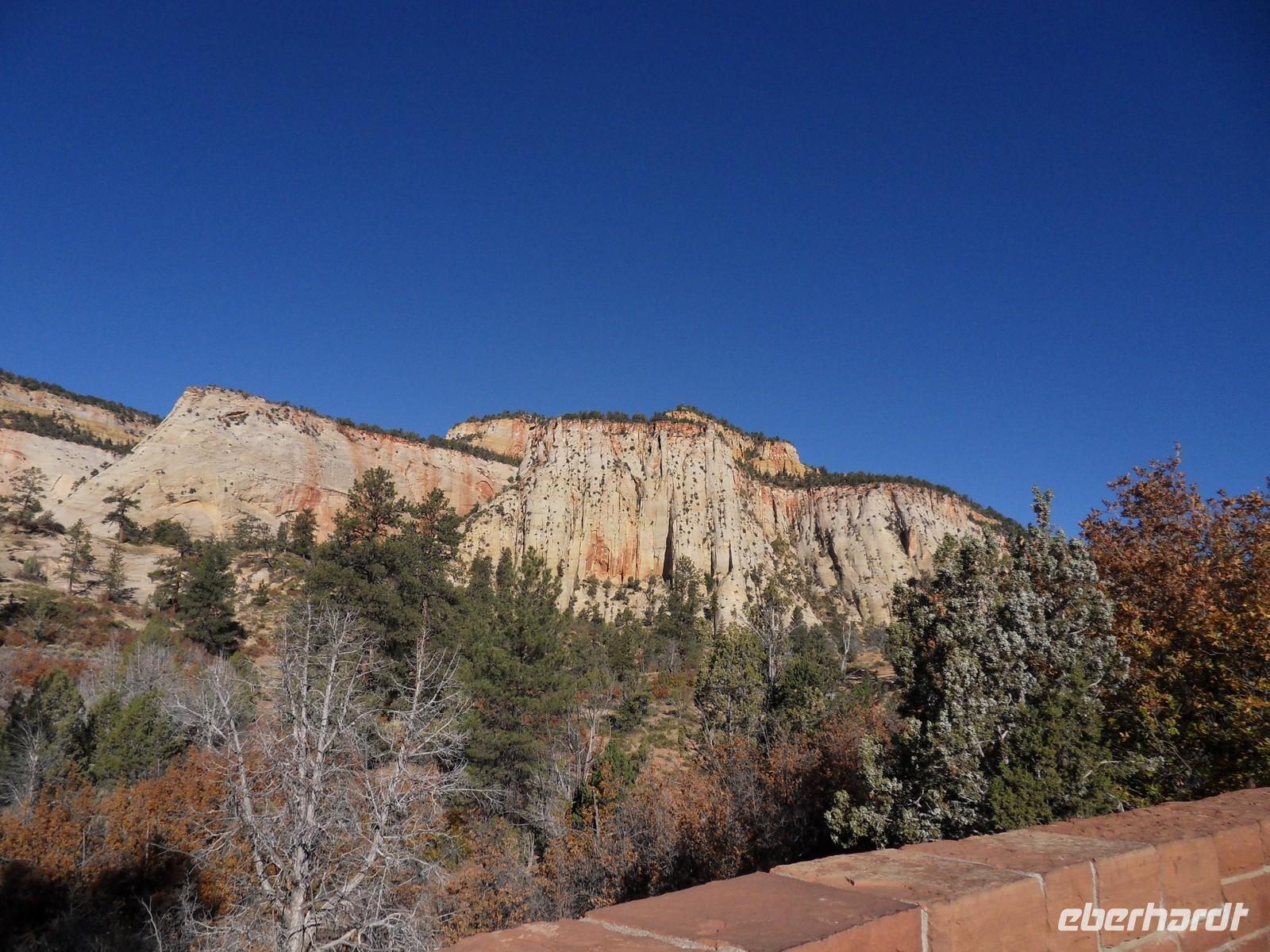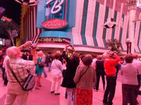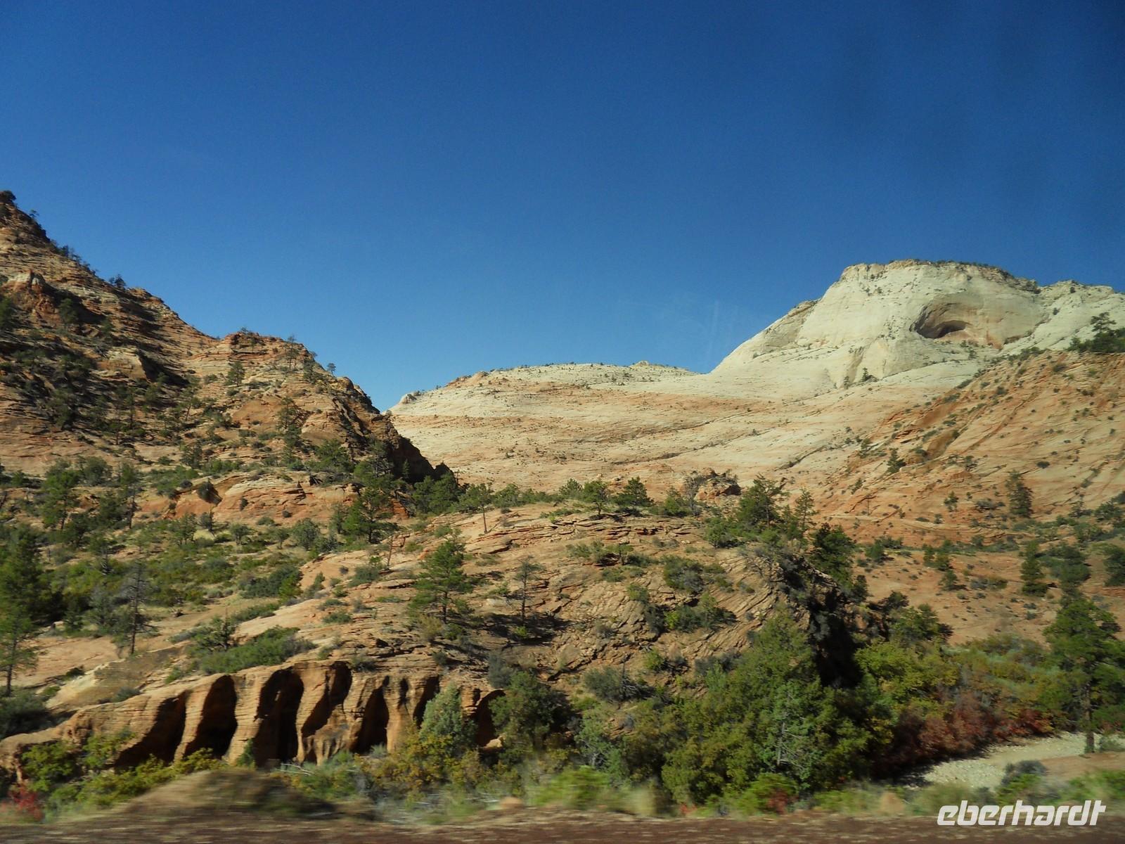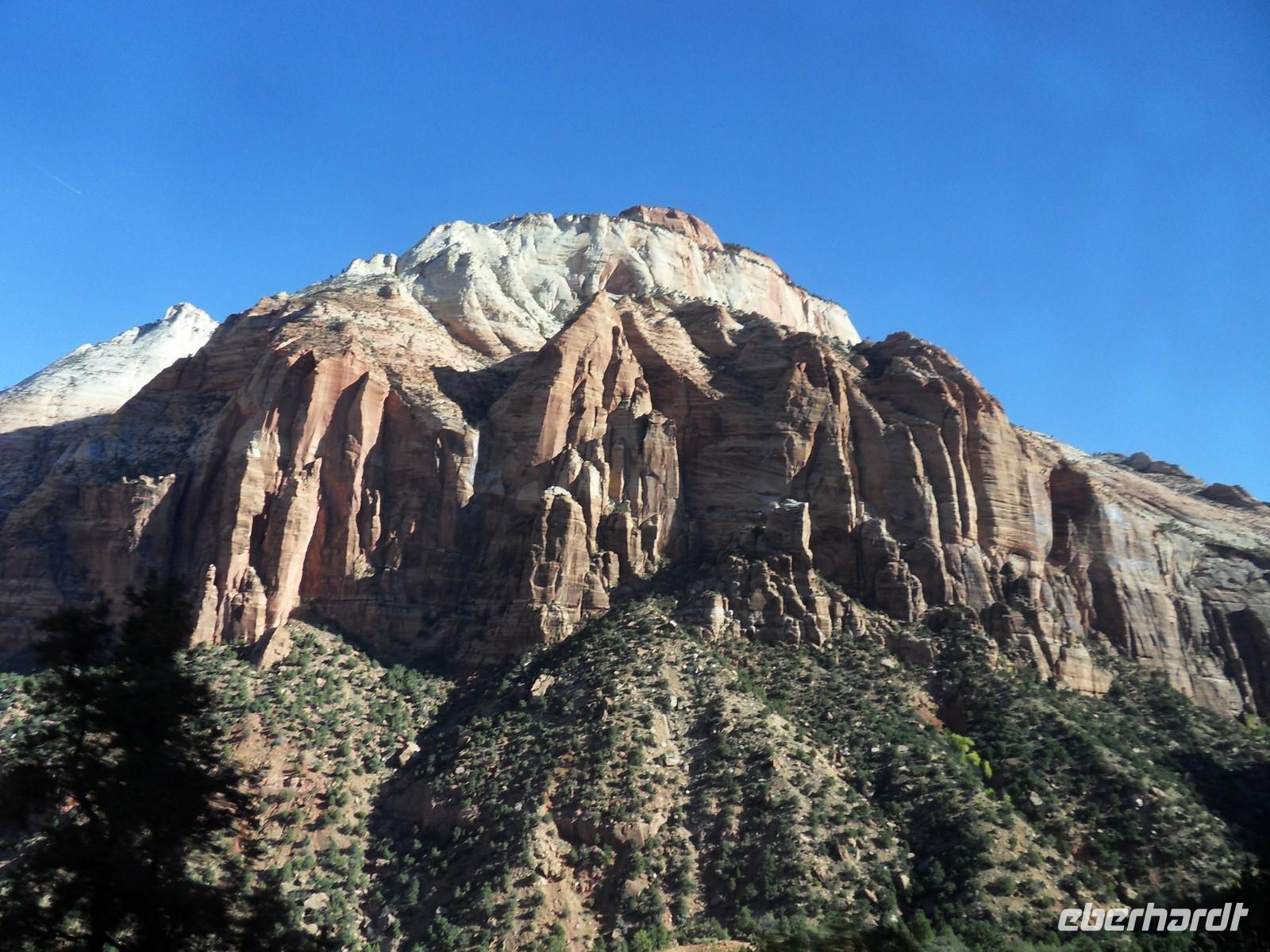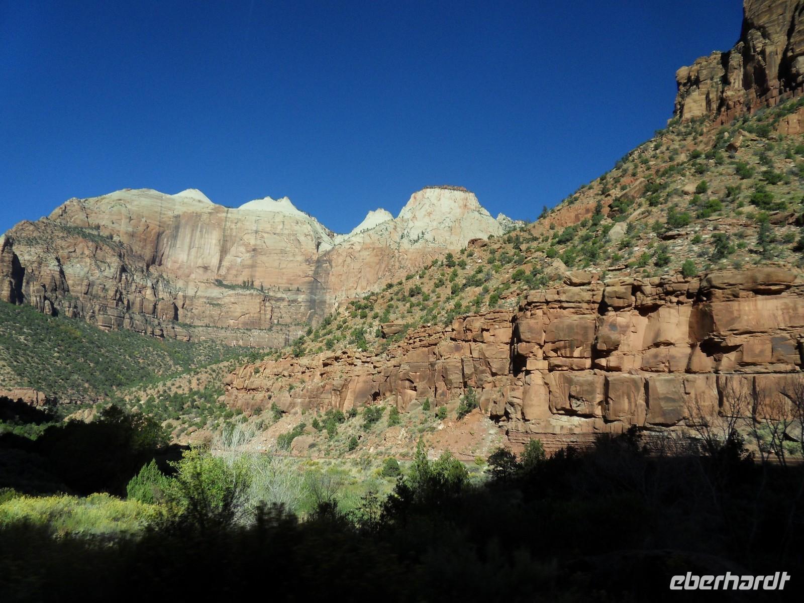 Nach dem Frühstück fuhren wir heute in den Zion-Nationalpark. Am „Checkerboard Mesa“ legten wir einen Fotostopp ein, so dass wir auch hier wieder andere Felsarten fotografisch festhalten konnten. Danach fuhren wir langsam durch die engen Straßen des Nationalparks. Unterwegs entdeckten wir „Schafe mit großen Hörnern“, die aber leider immer viel zu schnell verschwunden waren, sei es, weil sie sich versteckten oder weil der Bus dort nicht für ein Foto halten konnte. Nach der Fahrt durch einen zwei Kilometer langen Tunnel wurden wir dafür mit dem Blick auf den „großen weißen Thron“, einen riesigen Felsen, belohnt. Bei einem Fotostopp konnten wir so auch einen Kletterer an einer steilen Felswand entdecken, in der wir gerade den Tunnel durchquert hatten. An einer Raststätte am Zion-Nationalpark legten wir eine kleine Mittagspause ein, wobei wir aber kaum etwas gegessen haben, denn heute Abend wartete ein zeitiges Abendessen in Las Vegas auf uns. Die dreistündige Fahrt verkürzte uns Marguerite, in dem sie uns von der amerikanischen Tradition des „Thanksgiving“ und von Pocahontas erzählte. In Las Vegas angekommen besuchten wir das Outlet-Center am Rande der Stadt, wo viele Gäste die Gelegenheit nutzen um bei Levi’s nach Jeanshosen für sich oder ihre Lieben daheim zu schauen. Am Nachmittag erreichten wir dann unser Hotel Treasure Island, doch leider waren bei unserer Ankunft nur die Hälfte aller Zimmer bezugsfertig, so dass einige Gäste ca. 30 Minuten auf ihre Zimmerschlüssel warten mussten. 17.30 Uhr trafen wir uns dann zum Abendessen, wobei wir von einer riesigen Buffetauswahl überrascht wurden. So gestärkt konnte unsere Las Vegas-bei-Nacht-Tour beginnen. Zunächst zu Fuß liefen wir zu den Hotels, die unserem nahe waren. Dabei sahen wir das Wynn-Hotel, das Palazzo-Hotel, das Venetian mit dem künstlichen Himmel über den Gassen und Kanälen von Venedig, und später dann mit dem Bus das Märchenschloss Excalibur, die „ägyptische“ Pyramide des Hotels Luxor, aber auch die Fontänenshow vor dem Hotel Bellagio, von wo aus man einen tollen Blick auf den Eiffelturm hat. Anschließend fuhren wir entlang des „Strip“ vorbei an den zahlreichen Hochzeitskapellen und dem Stratosphere Tower bis nach Downtown zur Freemont Street. Hier sehen wir auf einer riesigen, die Einkaufsstraße überspannenden Leinwand eine tolle Show zur Band Queen, wobei natürlich auch Klassiker wie „We are the champions“ und „We will rock you“ nicht fehlen durften. Gut gelaunt fuhren wir nach ca. vierstündiger Tour durch Las Vegas zurück zum Hotel.