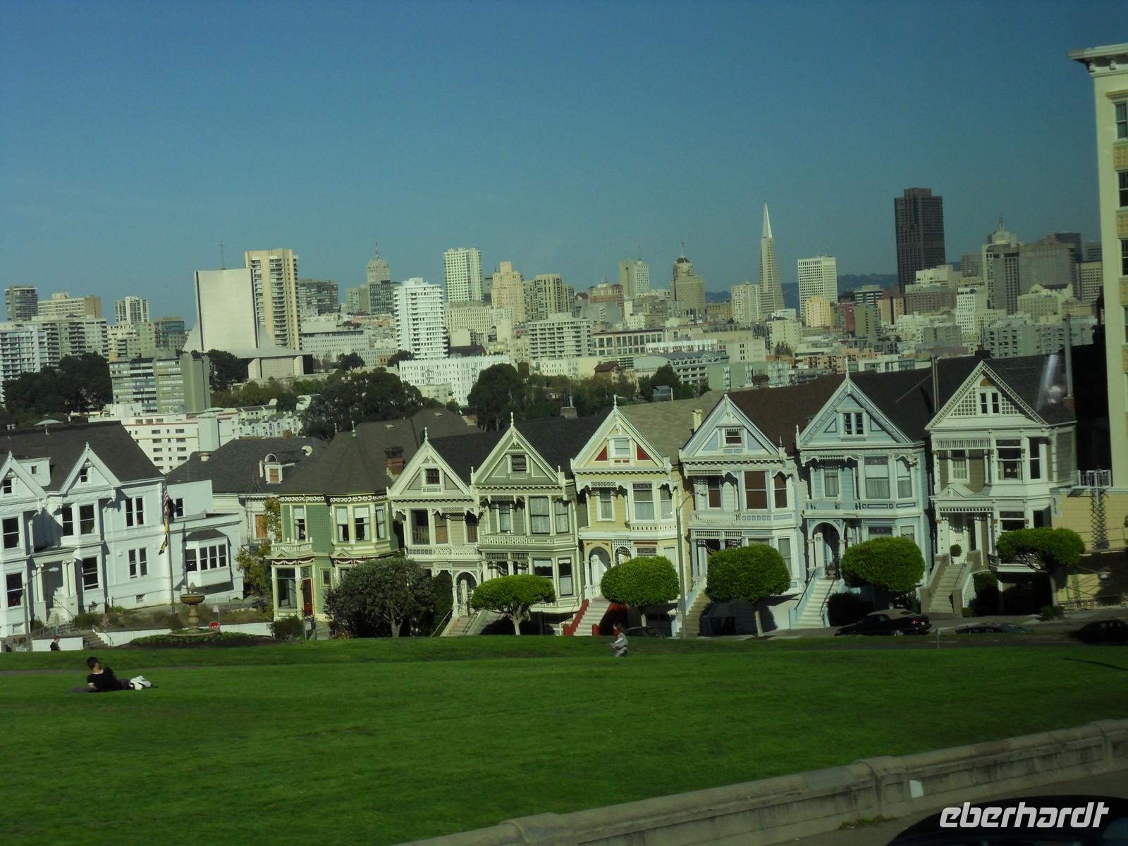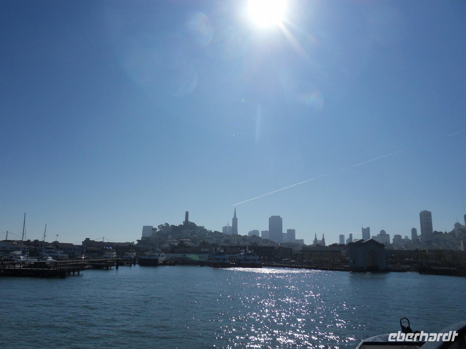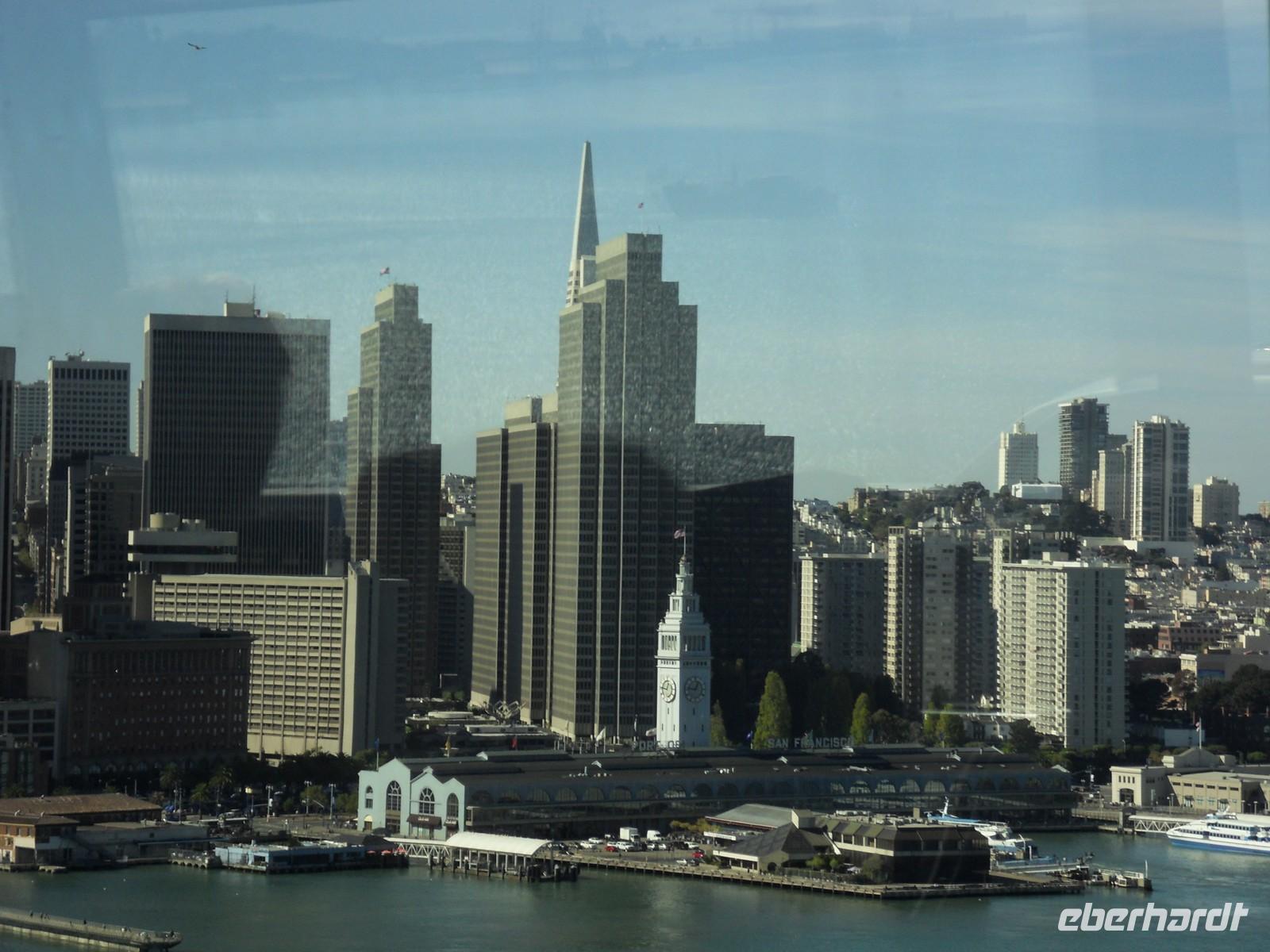 Nach dem Frühstück und einem tollen Blick auf die sonnenangestrahlten Bergkuppen machten wir uns am Morgen auf den Weg nach San Francisco, der letzten Station unserer Rundreise. Marguerite erzählt uns schon unterwegs über die erste Besiedlung des Gebietes, den Goldrausch 1849 und auch die allen bekannte und für San Francisco sehr prägende Hippie-Zeit. Schließlich ist es soweit: wir fahren über die 13 km lange Oakland Bay Bridge nach San Francisco und haben von der Brücke einen tollen Blick sowohl auf die Bucht, auf die Stadt selbst und auch auf die Gefängnisinsel Alcatraz. Am Fährgebäude (Ferry Building) neben Pier 2 machen wir unsere Mittagspause und können hier frisches Brot oder ein Sandwich kaufen, dass bei frischer Meeresluft und in der Sonne gleich noch viel besser schmeckt. Danach beginnen wir mit der Stadtrundfahrt. So sehen wir das Geschäftsviertel mit den Banken und der Trans-Amerika-Pyramide, den Alamo Square mit den „Painted Ladies“ sowie Teile des Hippieviertels „Haight-Ashbury“. Weiter geht es auf die Twin Peaks - die Zwillingsspitzen, von wo aus wir eine tolle Aussicht über die ganze Stadt bis zur Golden Gate Brücke und darüber hinaus haben. Der letzte Punkt der Stadtrundfahrt ist ein Stopp am Pazifikstrand, wo wir nicht nur die Strandpatrouille sehen, sondern einige mutige Gäste auch ihre Zehen ins kalte Wasser halten. Dann geht es zunächst einmal zum Hotel, wo wir in Ruhe unsere Zimmer beziehen und uns frisch machen konnten, bevor wir zum Abendessen nach Chinatown fuhren. Hier wurden uns verschiedenste Speisen auf einer Drehplatte serviert, die uns sehr gut schmeckten. Zum Nachtisch gab es für jeden Gast auch einen Glückskeks. Nach dem Essen unternahmen wir einen kleinen Spaziergang - zum Glück bergab - bis zum Bus, der uns dann nach einem weiteren Tag voller Eindrücke wieder zu unserem Hotel brachte.