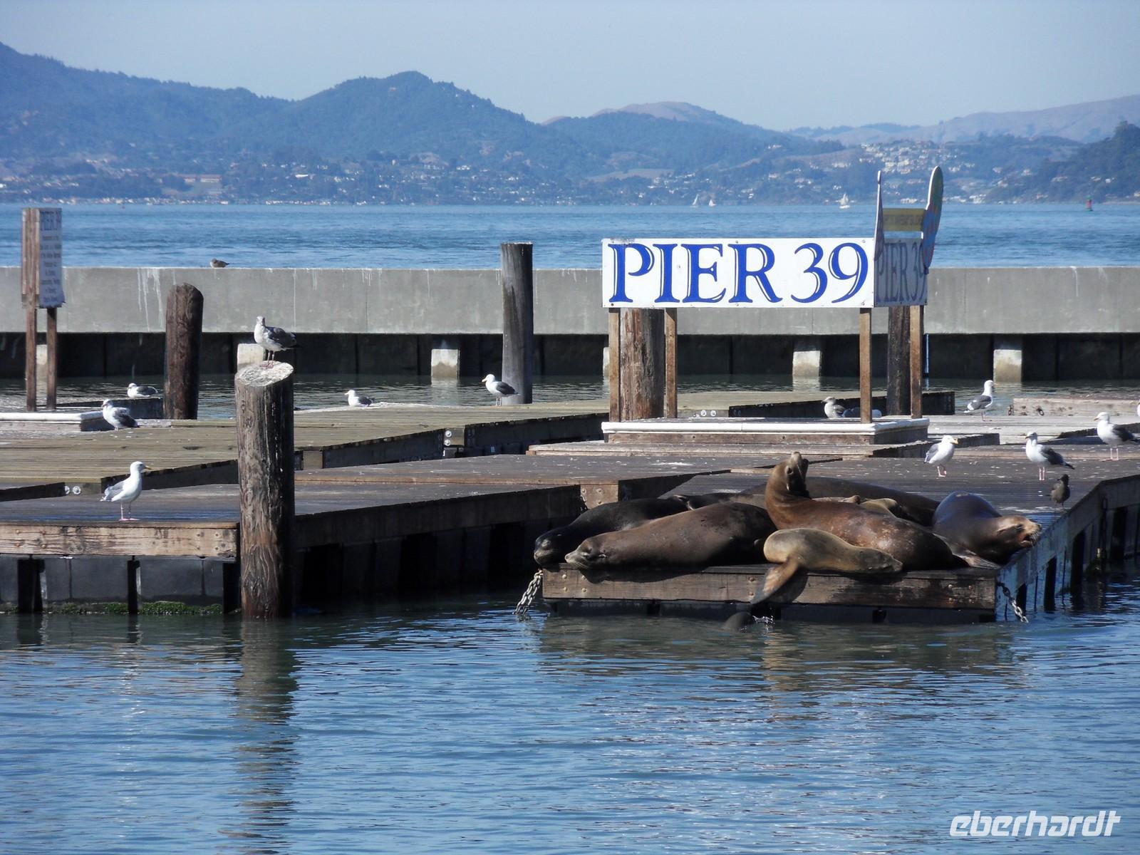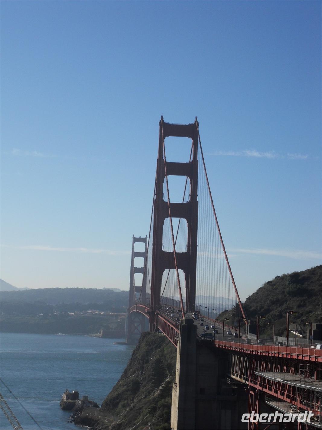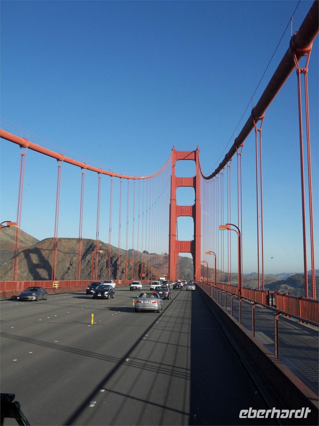 Nach dem Frühstück wartete eine der bedeutendsten Sehenswürdigkeiten San Franciscos auf uns - die Golden Gate Brücke. Nachdem wir ein Gruppenbild gemacht hatten, ging Marguerite mit unseren Reisegästen mehr als zwei Kilometer über die Brücke. Eigentlich sollte der Bus auf der anderen Seite der Brücke auf die Gäste warten, doch bei der Überfahrt sahen Dennis und ich, dass der Fußweg nach 2,2 km plötzlich wegen Bauarbeiten gesperrt war. So kehrten wir mit dem Bus dahin zurück, wo die Gruppe ausgestiegen war. Nicht zuletzt wegen des Sonnenscheins werden unsere Gäste diese Wanderung, bei der sie fast zweimal die Golden Gate Brücke abgelaufen haben, mit Sicherheit in guter Erinnerung behalten. Und nur durch die Sperrung war es möglich, dass wir dann noch einmal gemeinsam mit dem Bus über die Brücke fahren konnten. ;) Dennis brachte uns im Anschluss nach Sausolito, eine kleine, wohlhabende Gemeinde am anderen Ende der Bucht. Nach etwas Freizeit fuhren wir schließlich mit der Fähre in knapp 30 Minuten vorbei an der Golden Gate Brücke und mit einem tollen Blick auf Alcatraz bis hinüber zur Fisherman’s Wharf nach San Francisco. Von hier aus hatten wir nun die Möglichkeit, die Stadt auf eigene Faust zu erkunden. Dabei bot sich das Pier 39 mit den Geschäften und den Seelöwen an, die ganze Promenade der Fisherman’s Wharf, aber natürlich auch das Fahren mit einem Cable Car oder ein Besuch der Lombard Street. Am Abend trafen wir uns im Hotel, um gemeinsam zu unserem Restaurant „Neptune’s Palace“ am Pier 39 zu fahren. Das Restaurant mit Blick auf die Bucht sowie das leckere Essen waren ein toller Abschluss für unsere Amerikareise. Beim Dessert verabschiedeten wir uns offiziell von Dennis, unserem Busfahrer, mit dem wir insgesamt ca. 2800 Meilen durch Amerika gefahren sind. Danach fuhren wir zurück ins Hotel, wo uns das Kofferpacken den Abschied erst so richtig bewusst machen sollte.