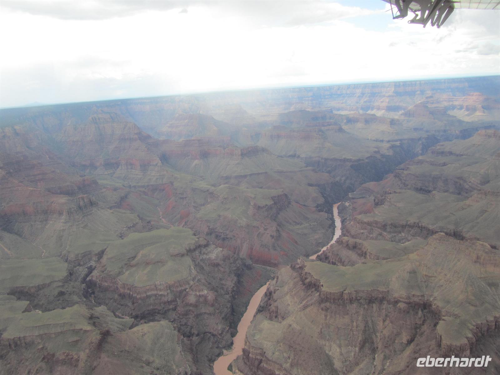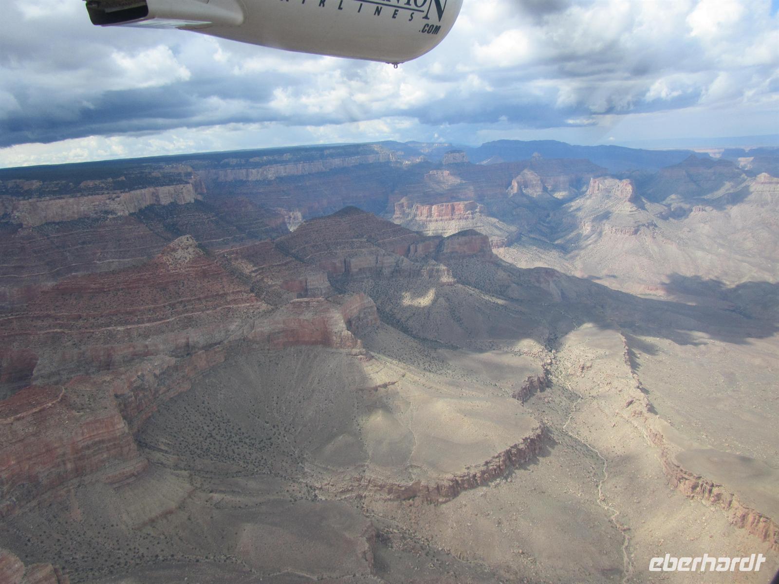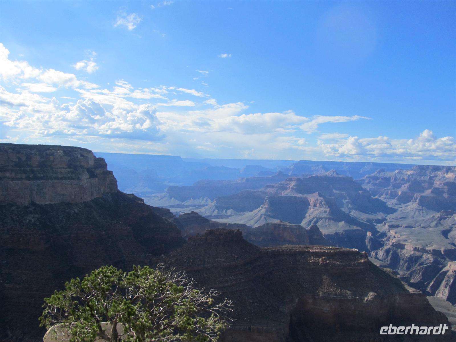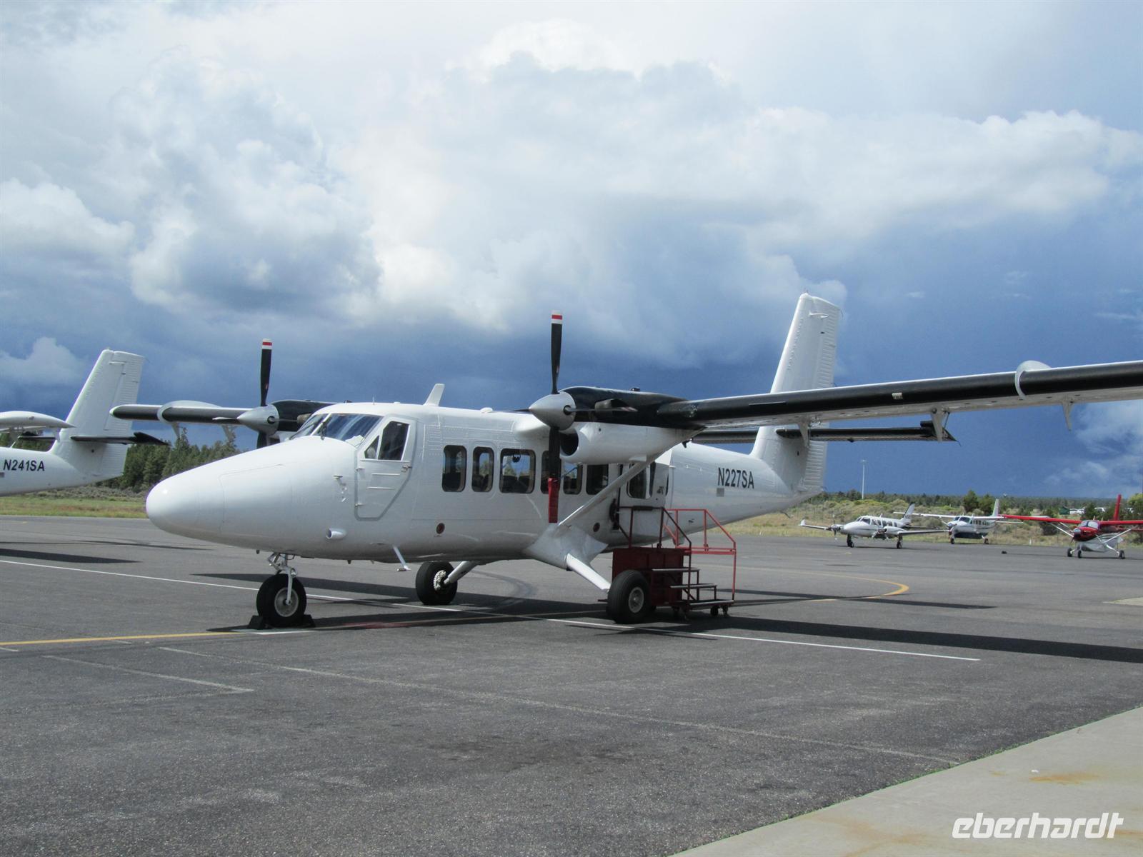 Heute Morgen starten wir zu einem der Höhepunkte der Reise, dem Grand Canyon. Wir passieren die Grenzen zum Canyon State Arizona, bekannt auch als Land der 3 Seelen (Kupfer, Kühe, Baumwolle). Hauptstadt von Arizona ist Phoenix. Je näher wir dem Grand Canyon kommen umso schlechter wird das Wetter und es fängt an zu regnen. Es geht ständig bergauf zum Coloradoplateau. Wir stoppen in Seligman, einen Ort an der Route 66. Hier erleben wir kurz das Flair der legendären Straße. Überall stehen Cadillacs und alte Pickups. Weiter geht die Fahrt und der Himmel wir immer dunkler. Bange Blicke aus den Fenstern... Unser Flug über den Canyon ist für 14 Uhr gebucht. Wir fahren zum Flughafen und suchen am Himmel blaue Flecken. Uns wird mitgeteilt, dass definitiv geflogen wird. Nun diskutieren wir kurz, ob wir auch ohne Sonne das Abenteuer wagen. Einheitlich entscheiden wir uns dafür. Und es ist eine gute Entscheidung. Kaum gestartet bricht die Wolkendecke auf und wir erleben einen unvergesslichen und tief beeindruckenden Flug, untermalt von teils dramatischer Musik, über den Canyon. Später spazieren wir noch 2 Stunden an der Kante entlang und staunen und fotografieren ununterbrochen... Der Grand Canyon Nationalpark wurde 1919 gegründet und hat jährlich 4 Mio. Besucher.
