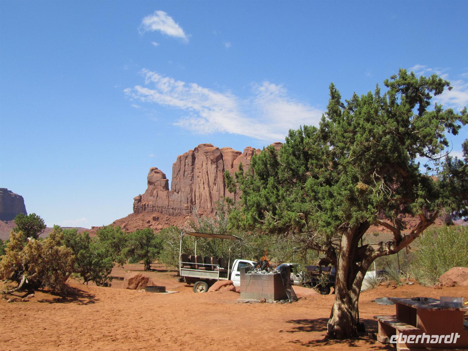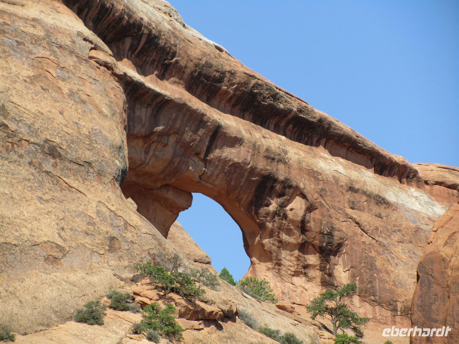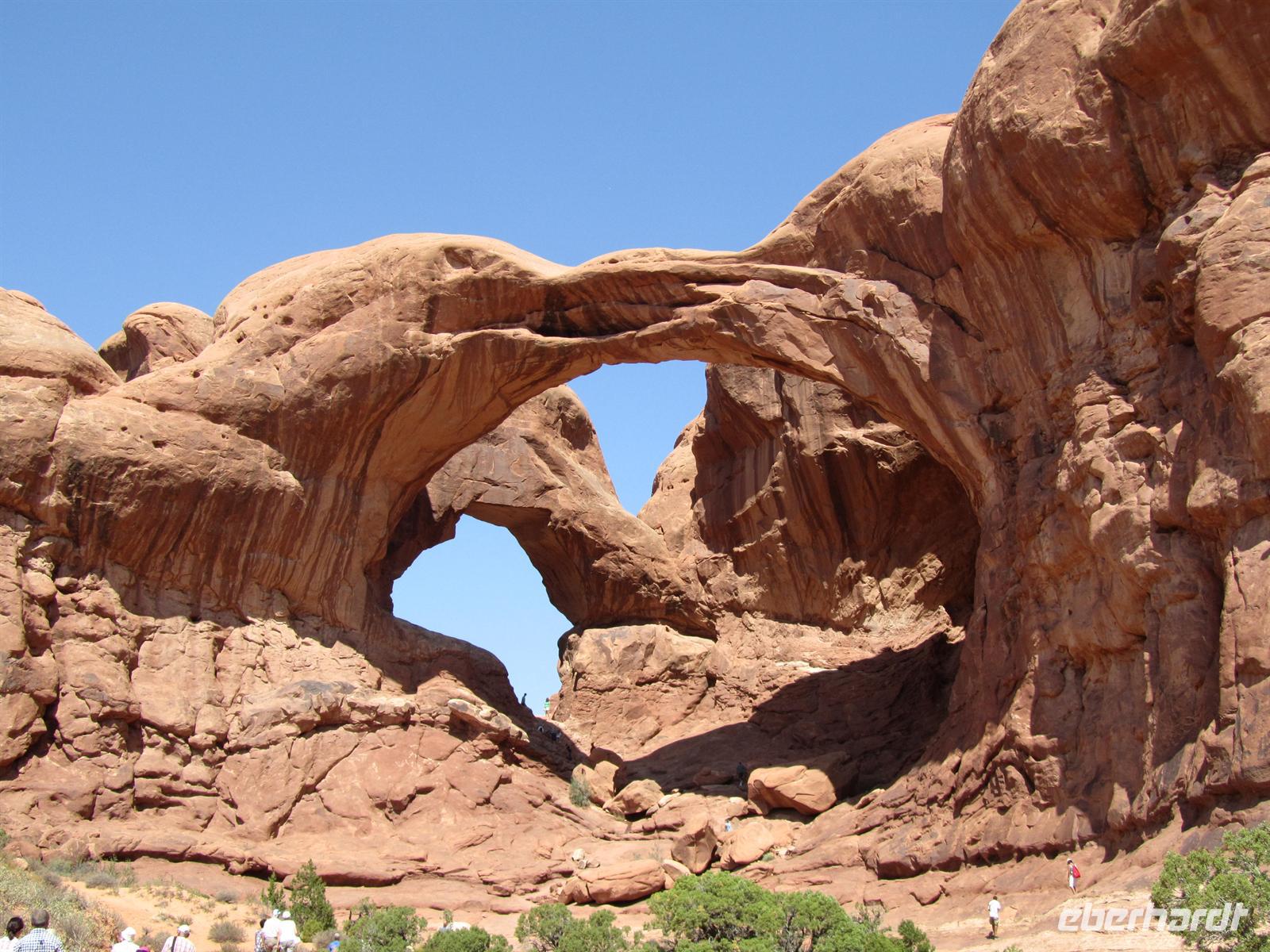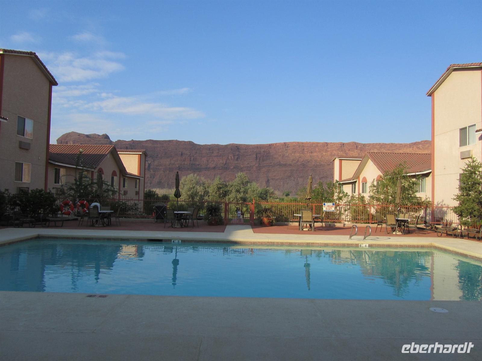 Heute erwartet uns ein weiteres Highlight, die Bögen und Fester des Arche Nationalparks. Unser erster Stopp ist der Balanced Rock. Knapp 50 Meter hoch, kann man kaum verstehen, wie sich dieser schiefe Koloss überhaupt aufrecht halten kann. Die Auslöser der Fotoapparate klicken und weiter gehts zum nächsten Highlight. Wir wandern ca. 30 Minuten zum Landscape Arche. Aber den schönsten Blick haben wir auf den Doppelbogen. Hier spazieren wir ganz nah heran und einige wagemutige Gäste klettern sogar in die Bögen hinein. Nach diesem tollen Erlebnis fahren wir zurück nach Moab und kaufen für ein kleines Picknick ein. Im tollen Hotelgarten unter einem Olivenbaum lassen wir uns Brot, Wurst, Käse, Bier, Weintrauben und Wasser schmecken. Da es heute sehr heiß ist, ist dieses Päuschen während der Mittagszeit eine willkommene Erholung. Einige Gäste nutzen die Gelegenheit um sich im Pool zu erfrischen. Gegen Abend fahren wir in die Canyon Lands. Hier erwartet uns wieder eine grandiose Landschaft und unfassbare Weite und Ruhe. Unseren Tag beschließen wir in einer Westernshow. Bei einer kleinen Show wird kurz etwas geschossen und die Cowboys stehen wenig später an der Bar und bedienen uns. Auf Blechtellern und aus Blechtassen wird uns typischen Essen und Zitronenlimo serviert. Nach dem Essen lauschen wir noch Cowboymusik, die sehr gut dargeboten wird. Ein toller Tag findet einen sehr schönen Abschluss.