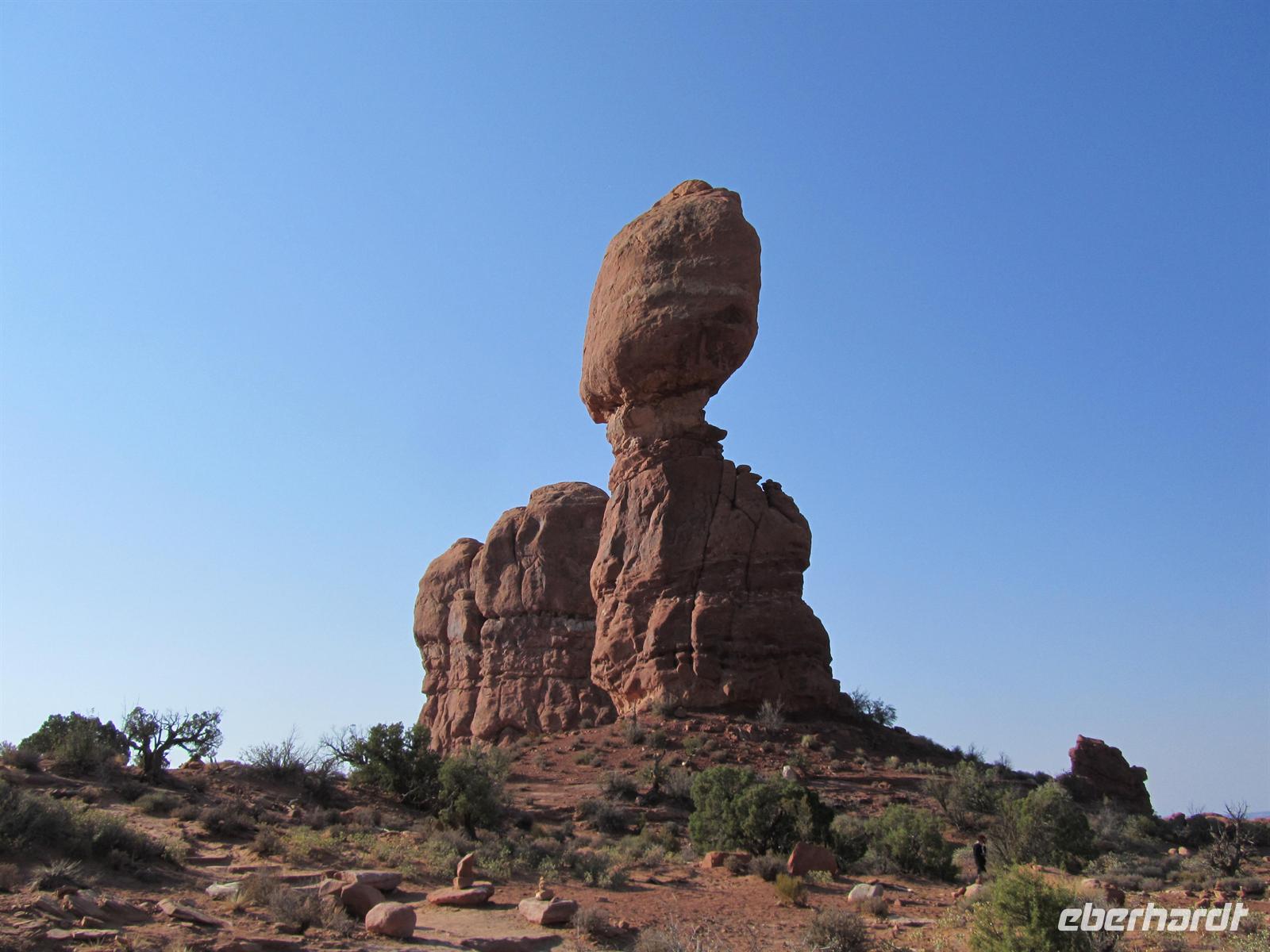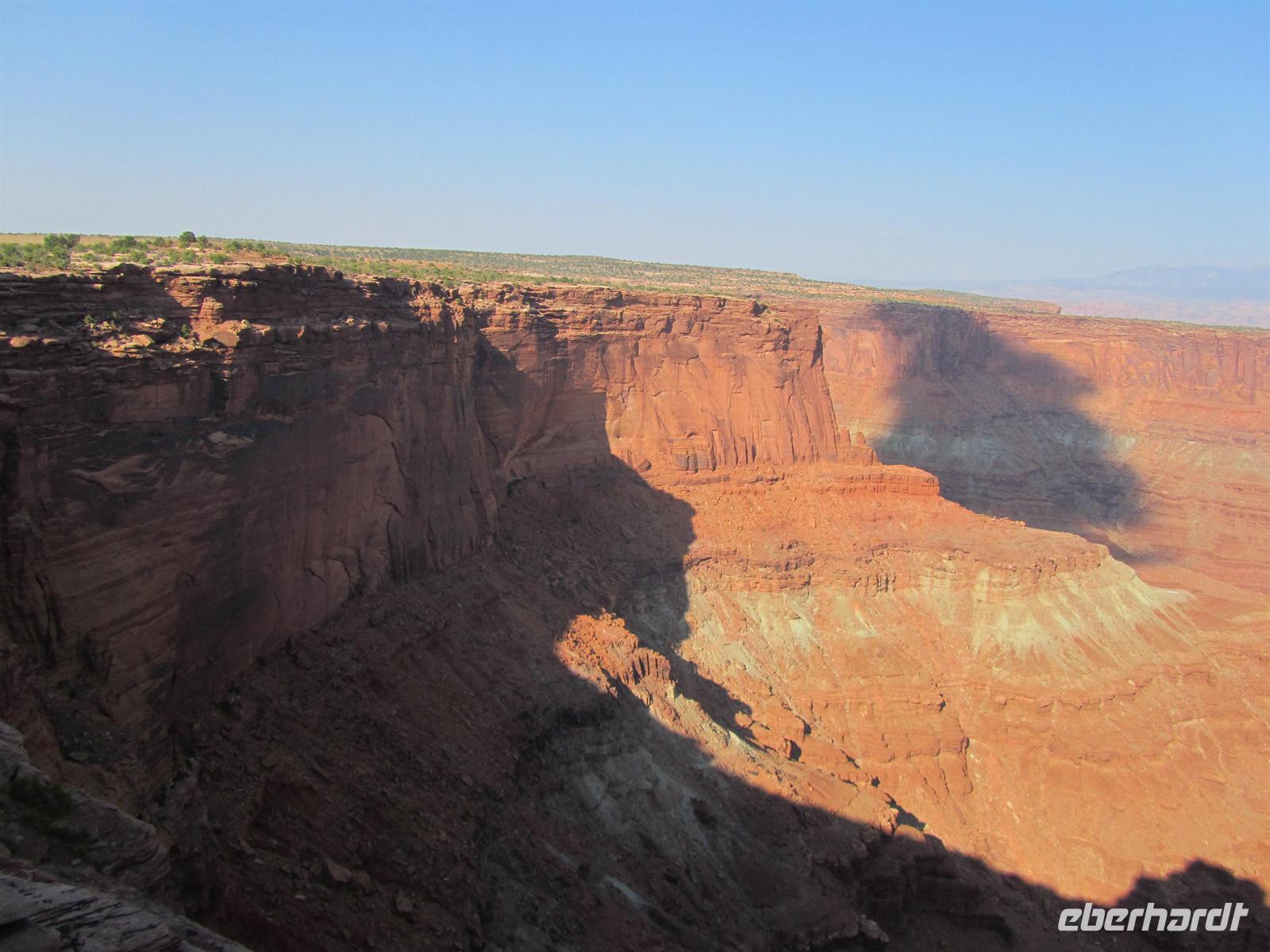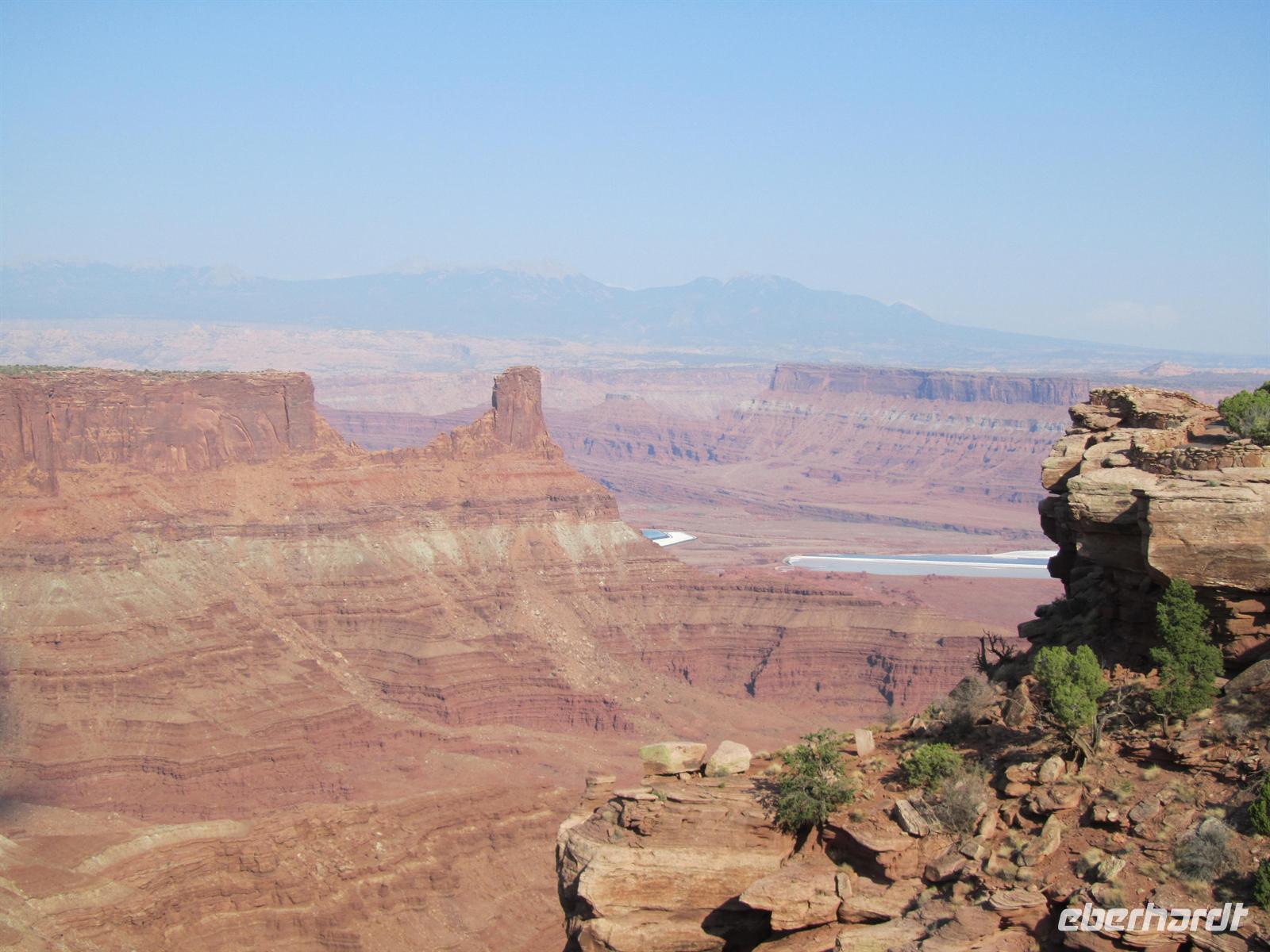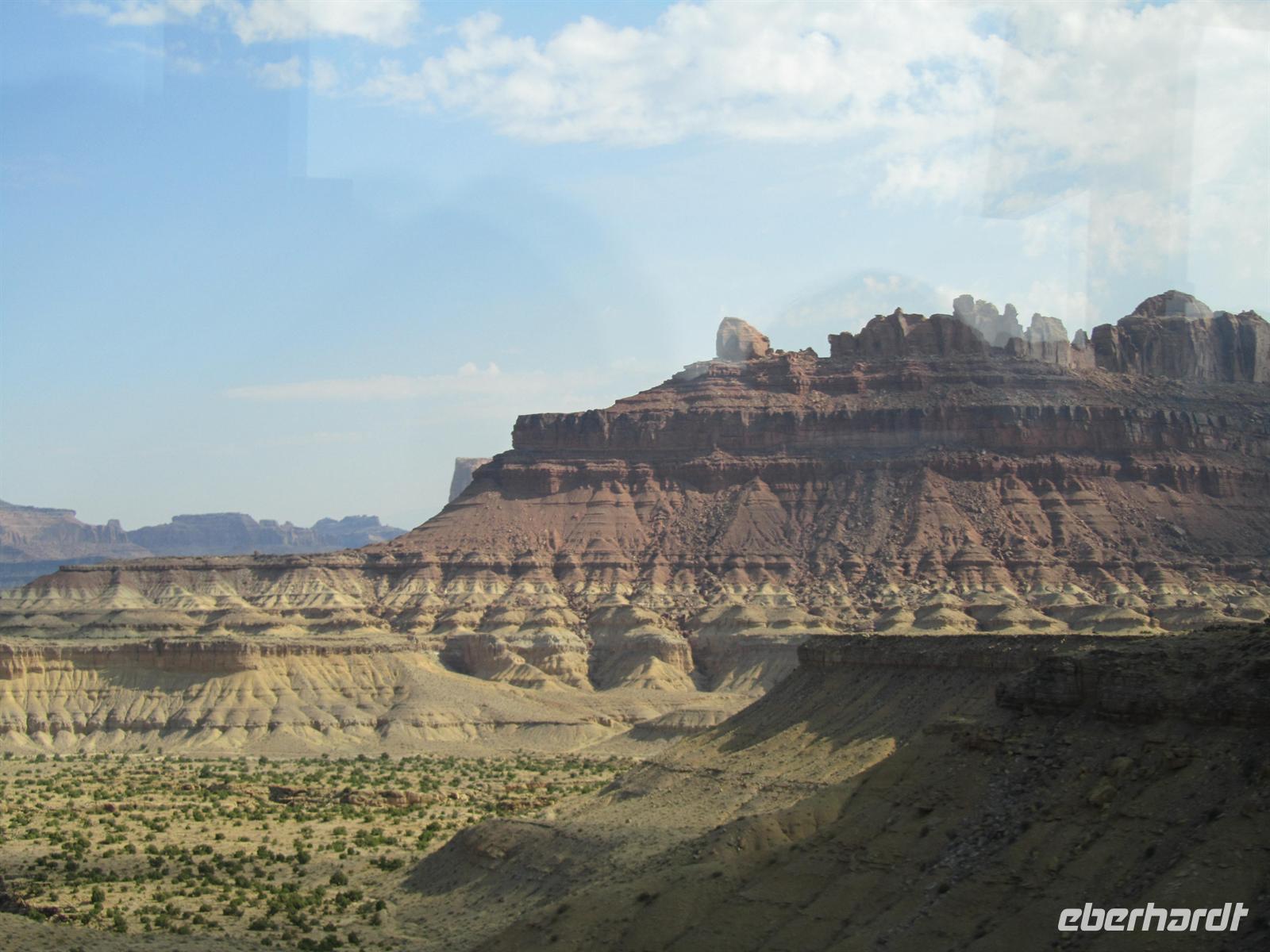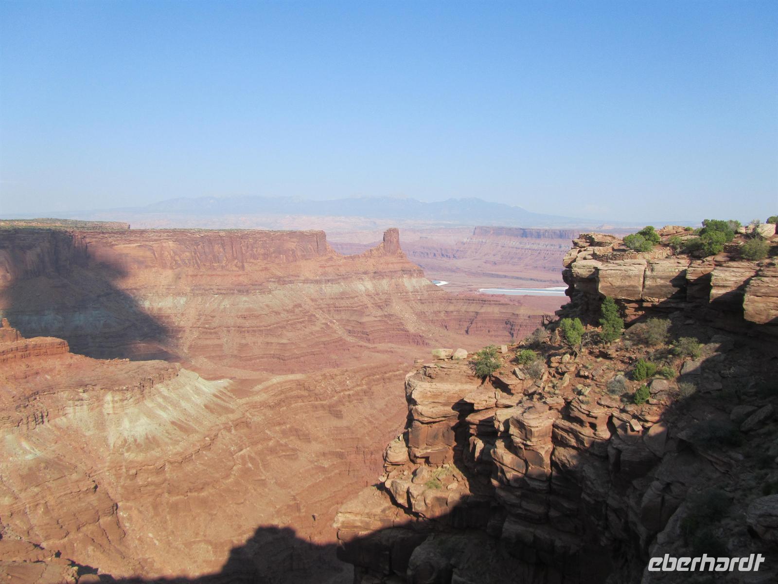 Heute erwartet uns ein weiteres Highlight, die Bögen und Fester des Arche Nationalparks. Unser erster Stopp ist der Balanced Rock. Knapp 50 Meter hoch, kann man kaum verstehen, wie sich dieser schiefe Koloss überhaupt aufrecht halten kann. Die Auslöser der Fotoapparate klicken und weiter gehts zum nächsten Highlight. Wir wandern ca. 30 Minuten zum Landscape Arche. Aber den schönsten Blick haben wir auf den Doppelbogen. Hier spazieren wir ganz nah heran und einige wagemutige Gäste klettern sogar in die Bögen hinein. Nach diesem tollen Erlebnis fahren wir zurück nach Moab und kaufen für ein kleines Picknick ein. Im tollen Hotelgarten unter einem Olivenbaum lassen wir uns Brot, Wurst, Käse, Bier, Weintrauben und Wasser schmecken. Da es heute sehr heiß ist, ist dieses Päuschen während der Mittagszeit eine willkommene Erholung. Einige Gäste nutzen die Gelegenheit um sich im Pool zu erfrischen. Gegen Abend fahren wir in die Canyon Lands. Hier erwartet uns wieder eine grandiose Landschaft und unfassbare Weite und Ruhe. Unseren Tag beschließen wir in einer Westernshow. Bei einer kleinen Show wird kurz etwas geschossen und die Cowboys stehen wenig später an der Bar und bedienen uns. Auf Blechtellern und aus Blechtassen wird uns typischen Essen und Zitronenlimo serviert. Nach dem Essen lauschen wir noch Cowboymusik, die sehr gut dargeboten wird. Ein toller Tag findet einen sehr schönen Abschluss.
