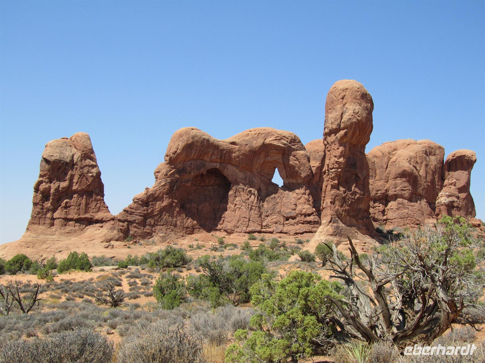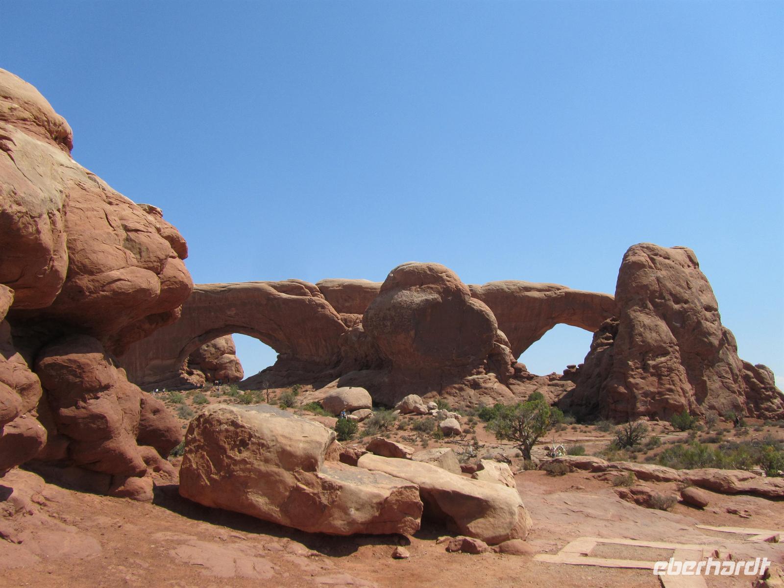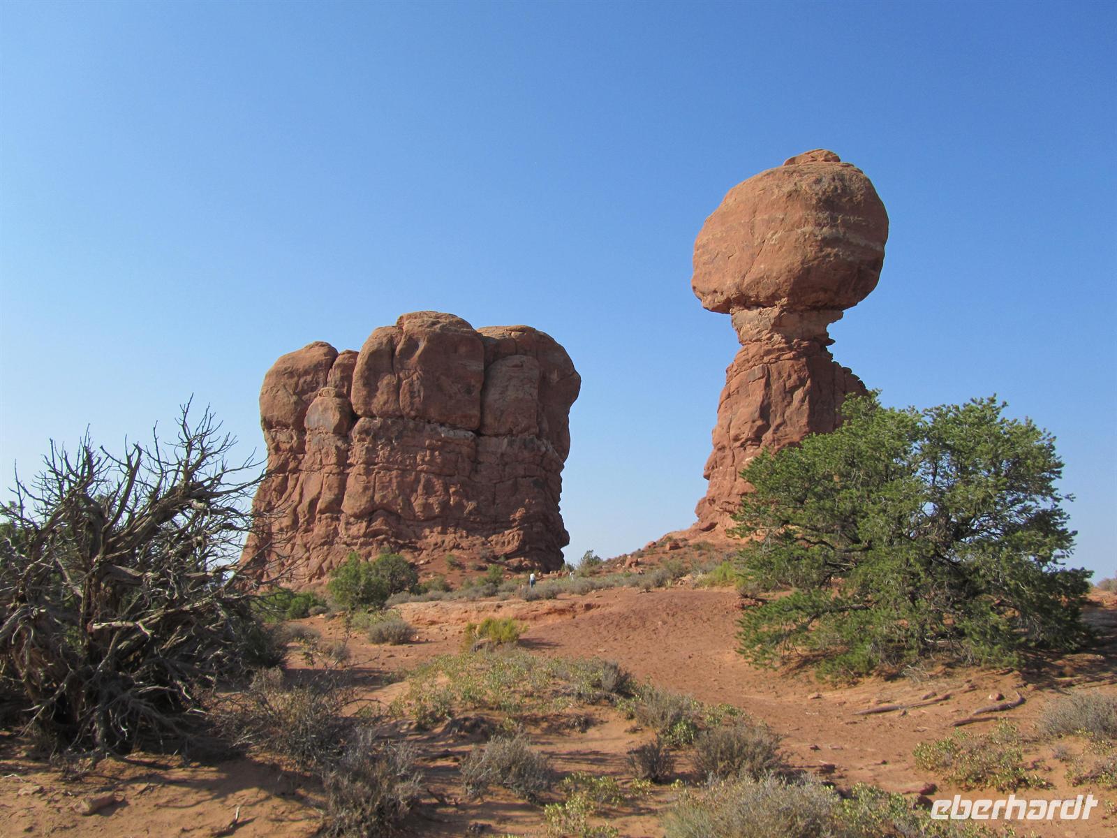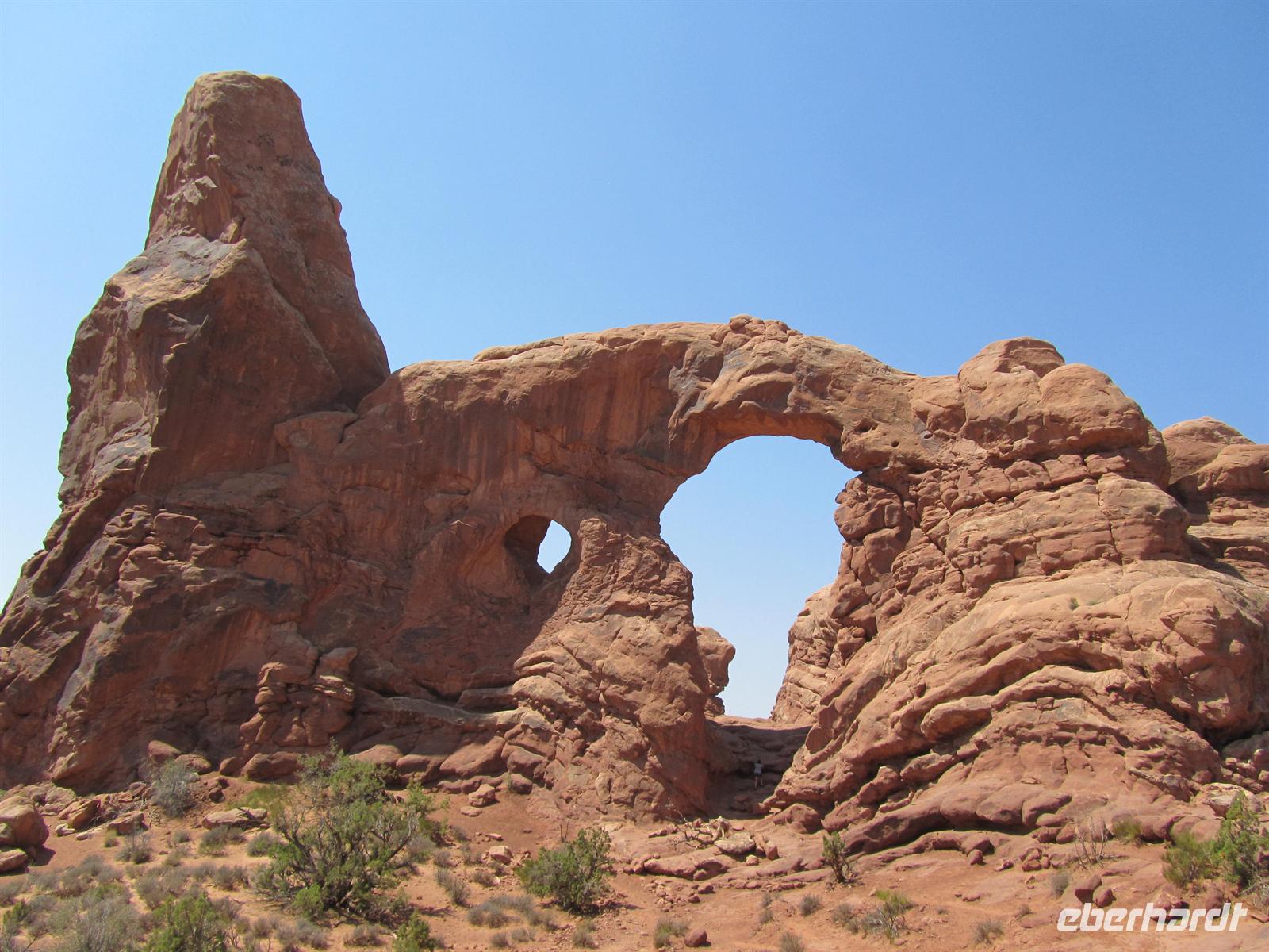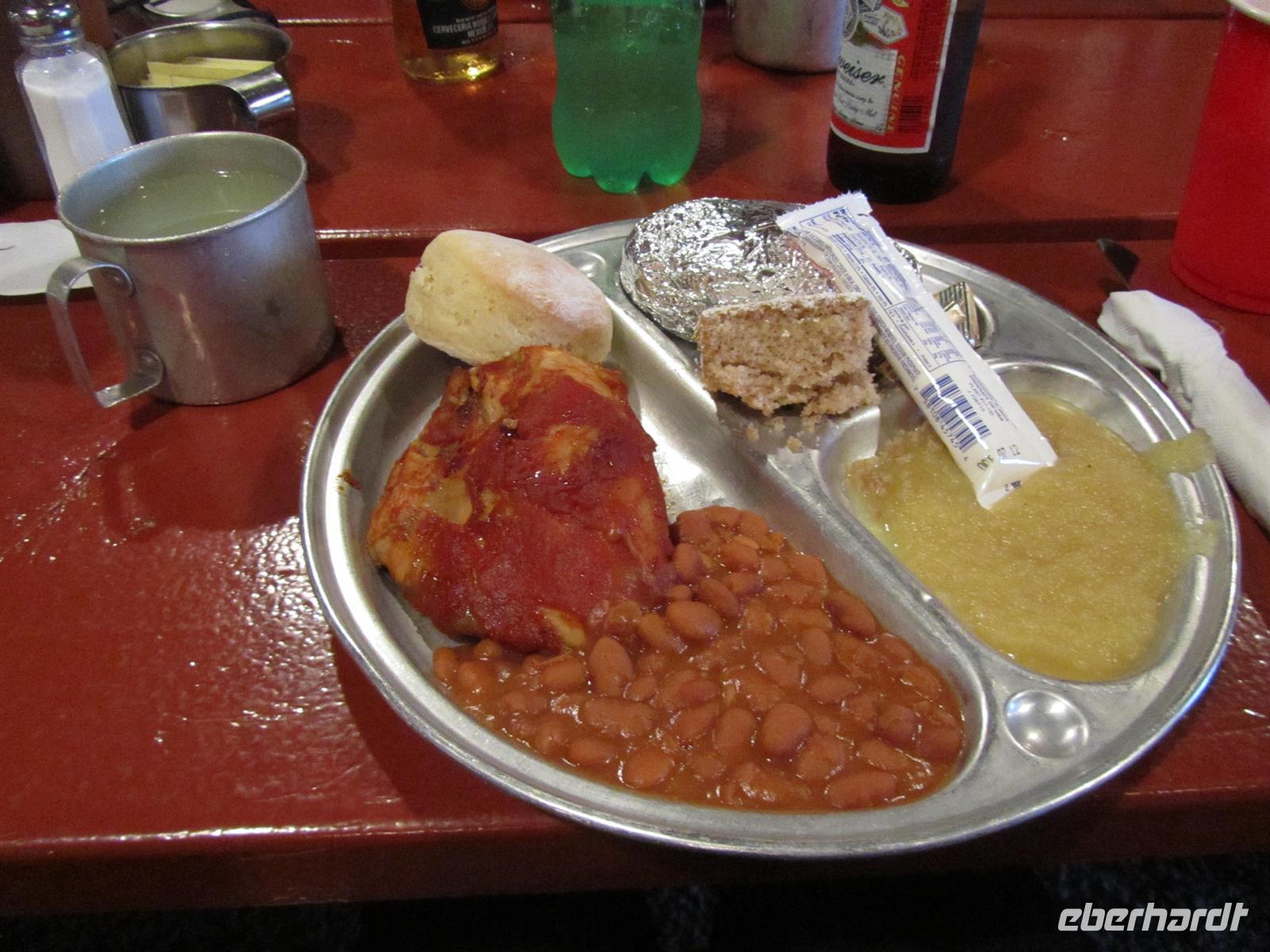 Heute erwartet uns ein weiteres Highlight, die Bögen und Fester des Arche Nationalparks. Unser erster Stopp ist der Balanced Rock. Knapp 50 Meter hoch, kann man kaum verstehen, wie sich dieser schiefe Koloss überhaupt aufrecht halten kann. Die Auslöser der Fotoapparate klicken und weiter gehts zum nächsten Highlight. Wir wandern ca. 30 Minuten zum Landscape Arche. Aber den schönsten Blick haben wir auf den Doppelbogen. Hier spazieren wir ganz nah heran und einige wagemutige Gäste klettern sogar in die Bögen hinein. Nach diesem tollen Erlebnis fahren wir zurück nach Moab und kaufen für ein kleines Picknick ein. Im tollen Hotelgarten unter einem Olivenbaum lassen wir uns Brot, Wurst, Käse, Bier, Weintrauben und Wasser schmecken. Da es heute sehr heiß ist, ist dieses Päuschen während der Mittagszeit eine willkommene Erholung. Einige Gäste nutzen die Gelegenheit um sich im Pool zu erfrischen. Gegen Abend fahren wir in die Canyon Lands. Hier erwartet uns wieder eine grandiose Landschaft und unfassbare Weite und Ruhe. Unseren Tag beschließen wir in einer Westernshow. Bei einer kleinen Show wird kurz etwas geschossen und die Cowboys stehen wenig später an der Bar und bedienen uns. Auf Blechtellern und aus Blechtassen wird uns typischen Essen und Zitronenlimo serviert. Nach dem Essen lauschen wir noch Cowboymusik, die sehr gut dargeboten wird. Ein toller Tag findet einen sehr schönen Abschluss.