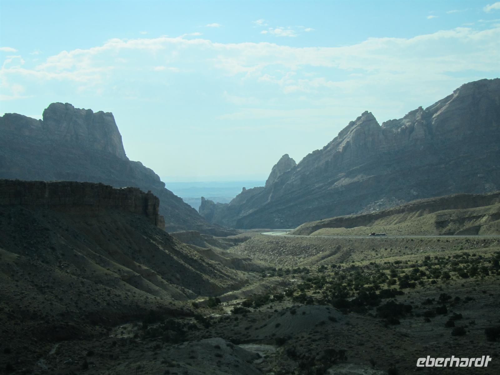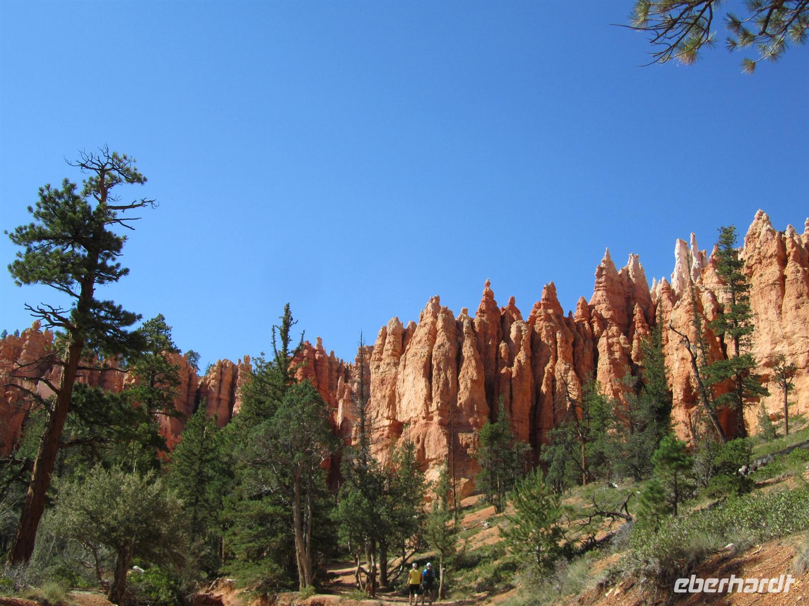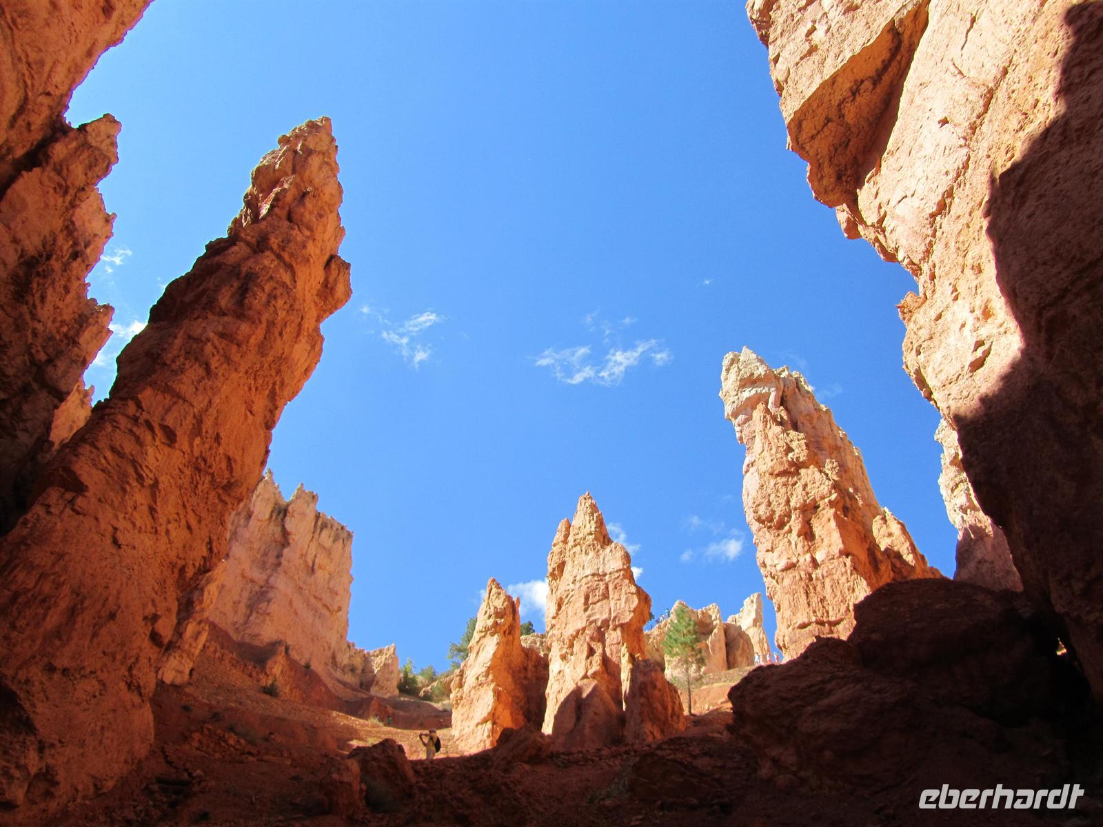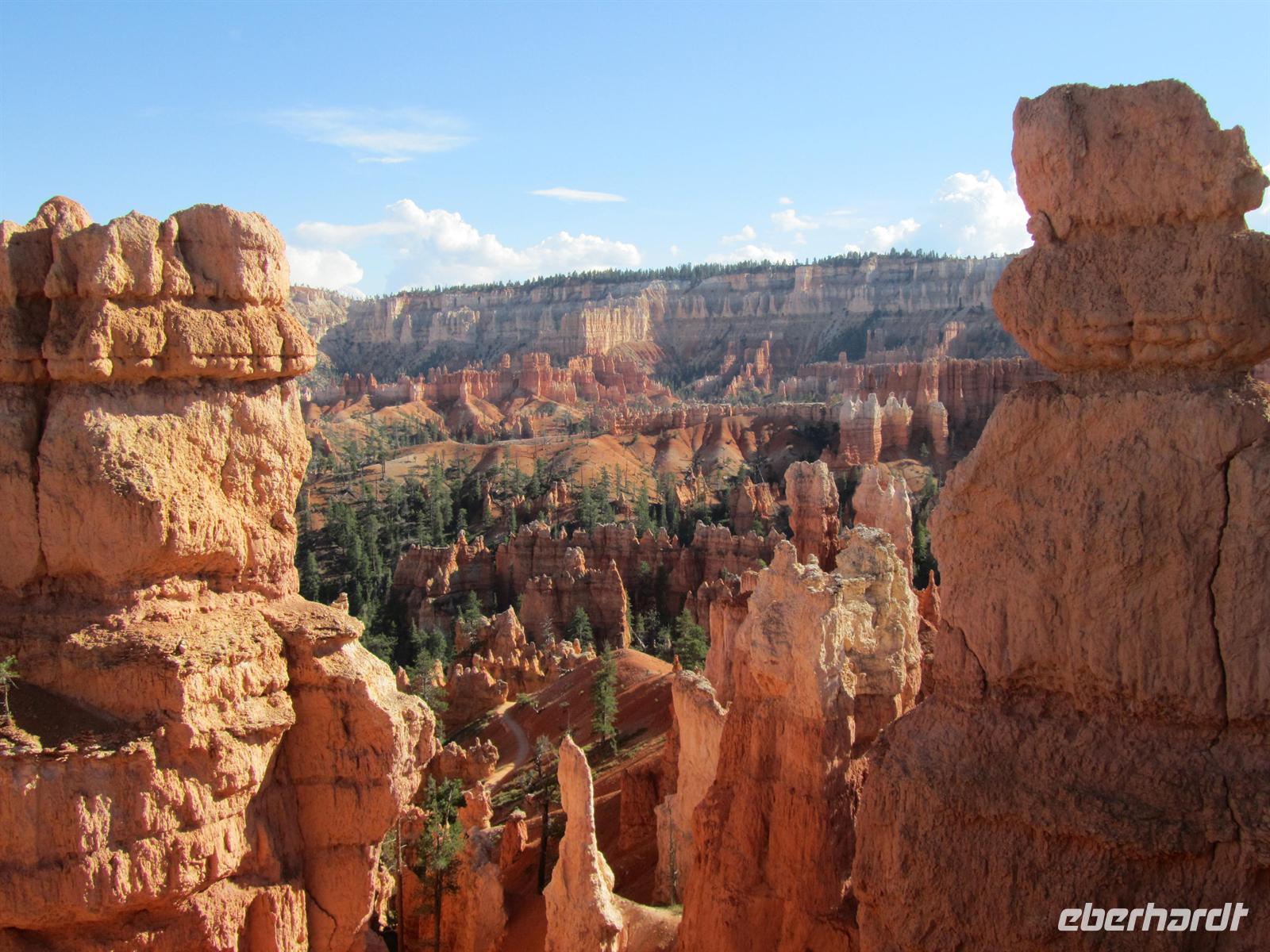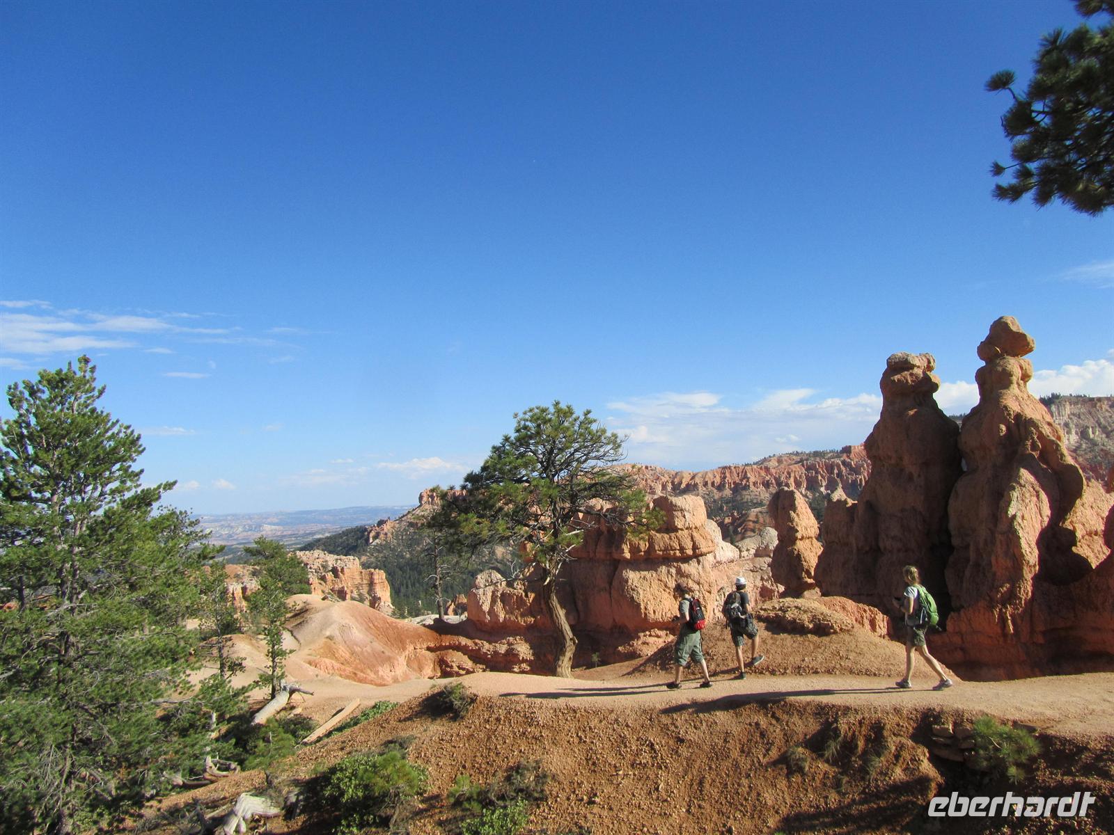 Wieder startet unser Tag mit strahlend blauem Himmel. Wir verspeisen die Reste unseres Picknicks und auf geht es Richtung Brice Canyon. Wir passieren den Green River, welches als Melonenanbaugebiet bekannt ist. Musik von Jonny Cash begleitet uns vorbei an grandiosen Gesteinsformationen. Angekommen am Canyon sind wir tief beeindruckt von der tollen Aussicht. Keiner hat dies erwartet. Danach starten wir unsere Wanderung hinein den Canyon. Ausgerüstet mit festem Schuhwerk, Kopfbedeckung und Wasser steigen wir hinab. 2 Stunden wandern wir entlang des Tals.