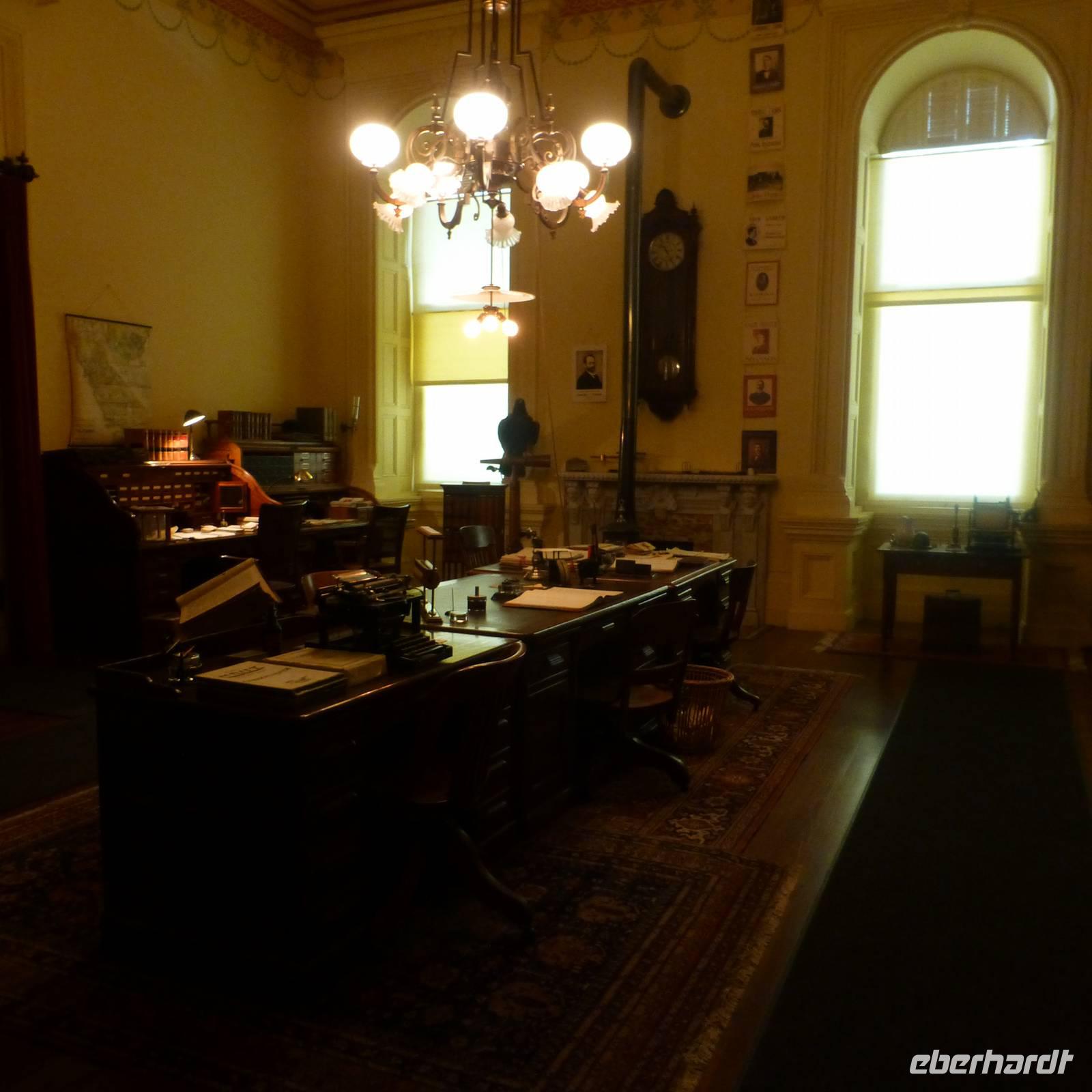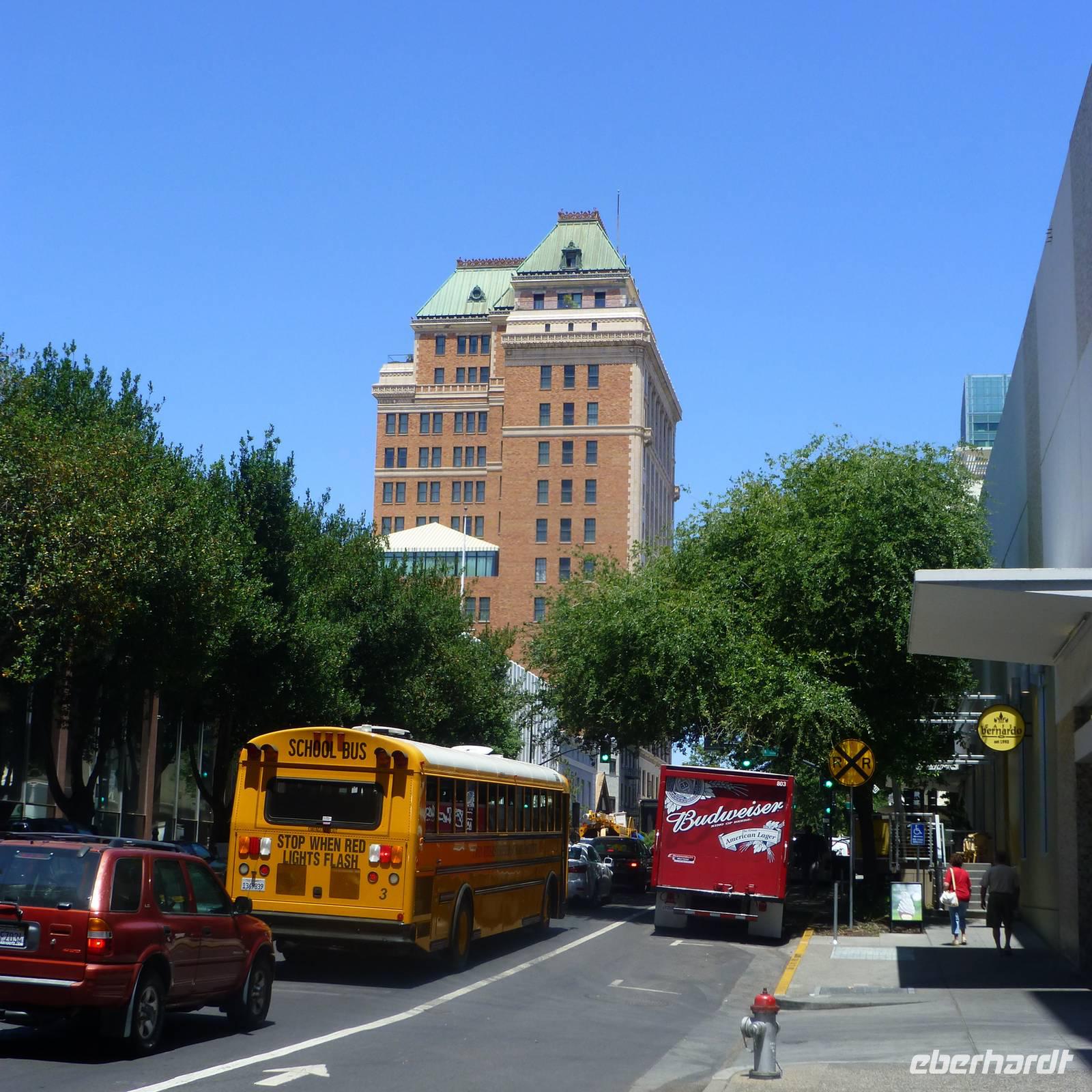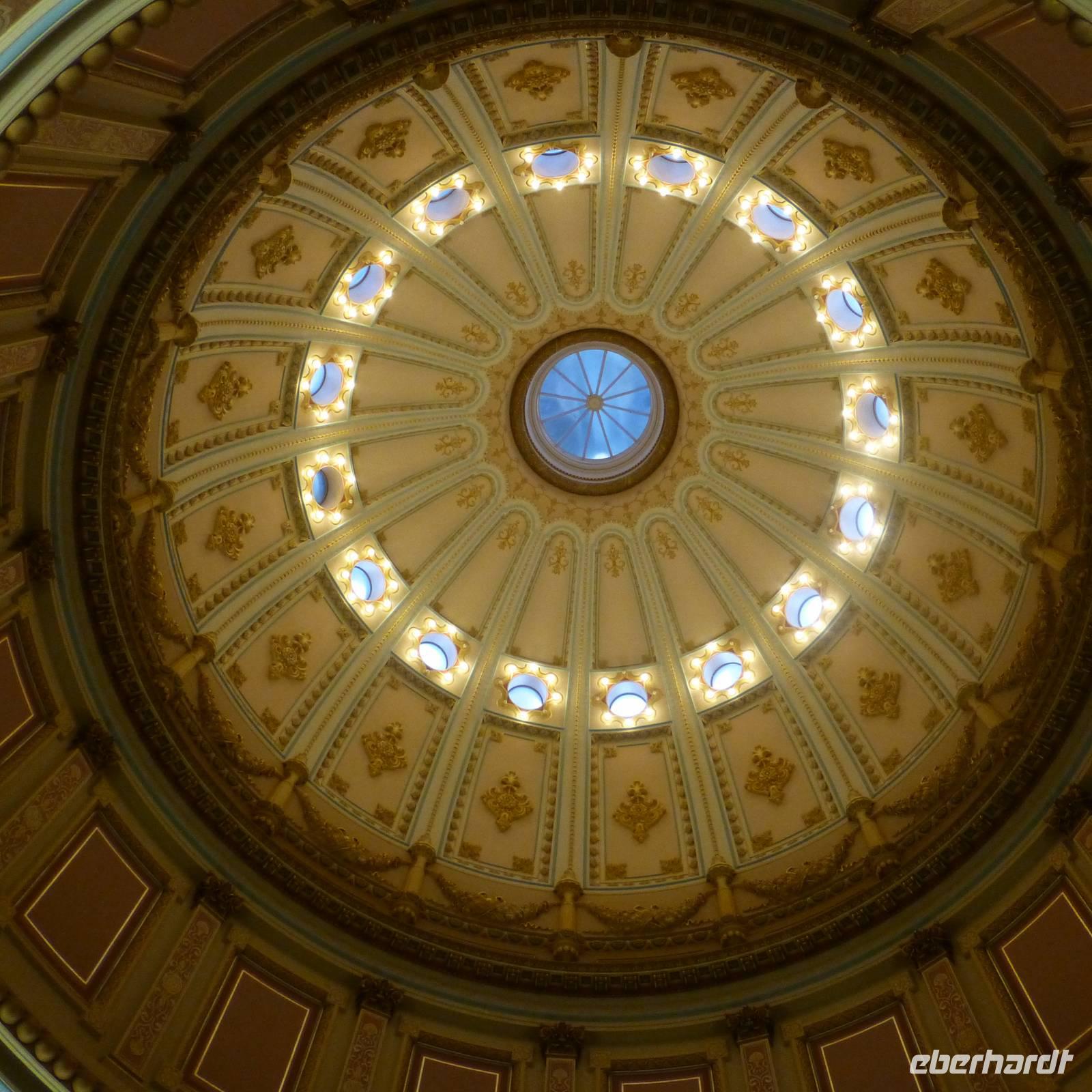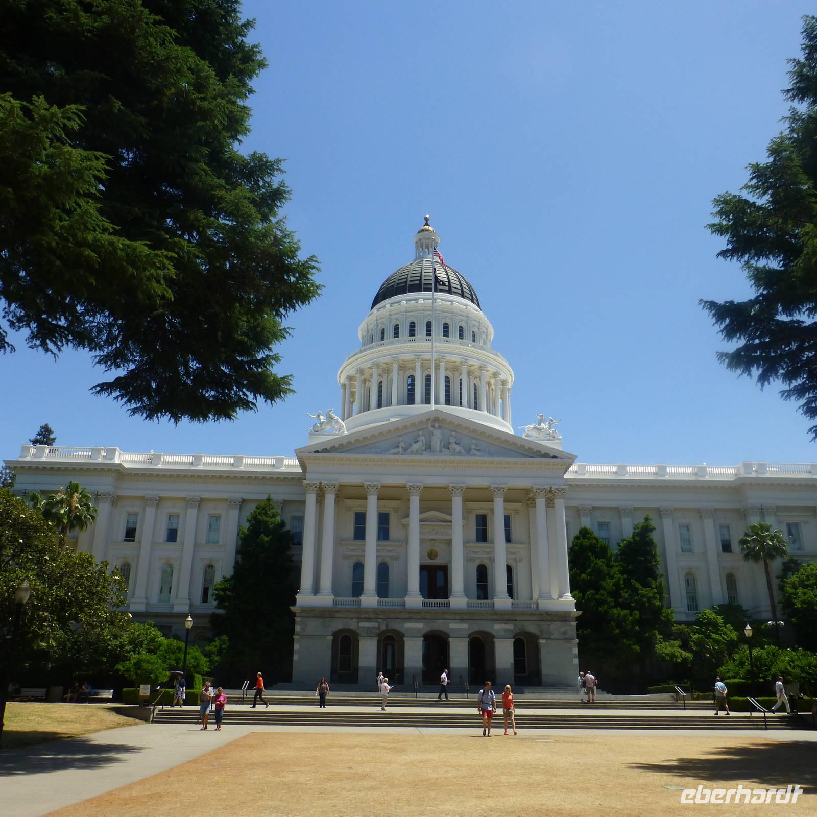 Als wir am heutigen Morgen erwachen, ist es zum ersten Mal auf der Reise richtig kalt-frisch draußen. Aber das ist auch kein Wunder, haben wir die letzte Nacht doch im Tal umgeben von bewaldeten Bergen verbracht. Entgegen der letzten Tage fahren wir heute schon früher ab und begeben uns in Richtung Sacramento, Brians Heimatstadt. Nach rund vier Stunden verdichtet sich der Verkehr - wir haben die kalifornische Hauptstadt erreicht. Beim Capitol steigen wir aus. Wir am Flughafen oder jedem anderen Regierungsgebäude werden wir auf Waffen o.ä. Gegenstände durchsucht und können alsbald das wunderschöne Capitol von innen besichtigen. Schon der Blick hoch zur Kuppel ist toll, den das Licht, das hier hereinfällt, strahlt so schön auf die gelb verzierten Kuppelwände. Das Erdgeschoss ist wie eine Art Museum. In verschiedenen Räumen sind die Büroeinrichtungen von 1902 bis 1906 nachgestellt. Immer wieder laufen wichtige Geschäftsleute mit Handy am Ohr. In der obersten Etage ist während unseres Aufenthalts eine Senatssitzung, an der wir Besucher auch teilnehmen können - natürlich müssen wir dabei mucksmäuschenstill sein aber wir haben ja in der USA ja eh nichts zu sagen;-) und interessant ist es allemal.