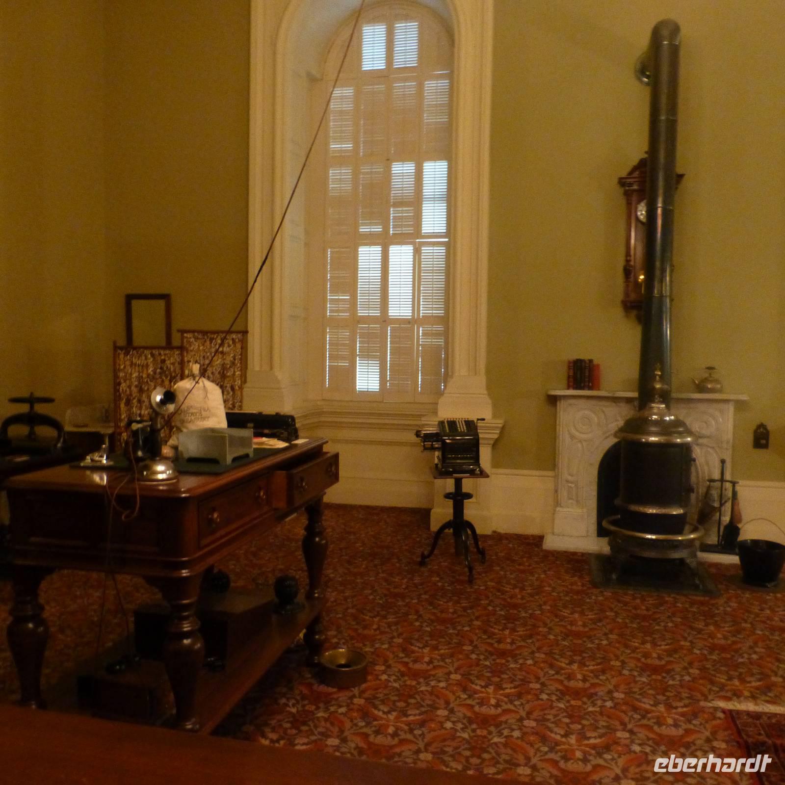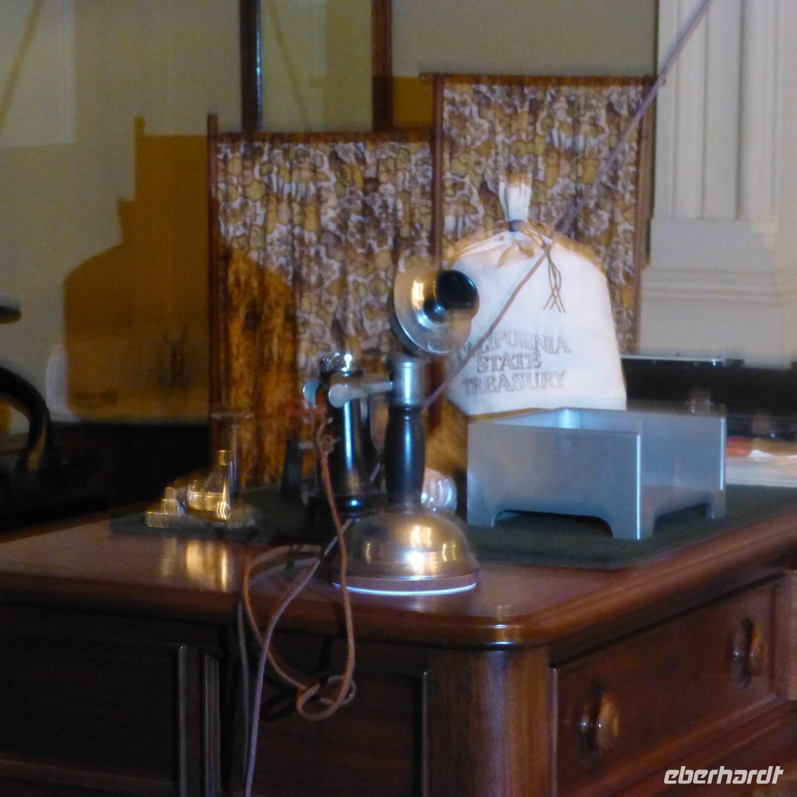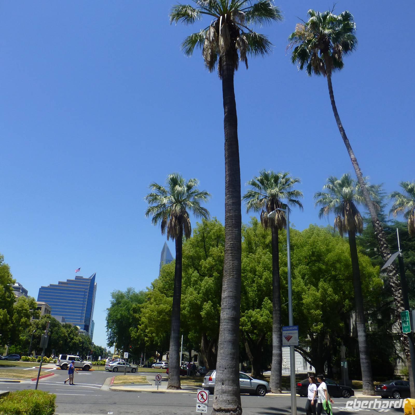 Als wir am heutigen Morgen erwachen, ist es zum ersten Mal auf der Reise richtig kalt-frisch draußen. Aber das ist auch kein Wunder, haben wir die letzte Nacht doch im Tal umgeben von bewaldeten Bergen verbracht. Entgegen der letzten Tage fahren wir heute schon früher ab und begeben uns in Richtung Sacramento, Brians Heimatstadt. Nach rund vier Stunden verdichtet sich der Verkehr - wir haben die kalifornische Hauptstadt erreicht. Beim Capitol steigen wir aus. Wir am Flughafen oder jedem anderen Regierungsgebäude werden wir auf Waffen o.ä. Gegenstände durchsucht und können alsbald das wunderschöne Capitol von innen besichtigen. Schon der Blick hoch zur Kuppel ist toll, den das Licht, das hier hereinfällt, strahlt so schön auf die gelb verzierten Kuppelwände. Das Erdgeschoss ist wie eine Art Museum. In verschiedenen Räumen sind die Büroeinrichtungen von 1902 bis 1906 nachgestellt. Immer wieder laufen wichtige Geschäftsleute mit Handy am Ohr. In der obersten Etage ist während unseres Aufenthalts eine Senatssitzung, an der wir Besucher auch teilnehmen können - natürlich müssen wir dabei mucksmäuschenstill sein aber wir haben ja in der USA ja eh nichts zu sagen;-) und interessant ist es allemal.
