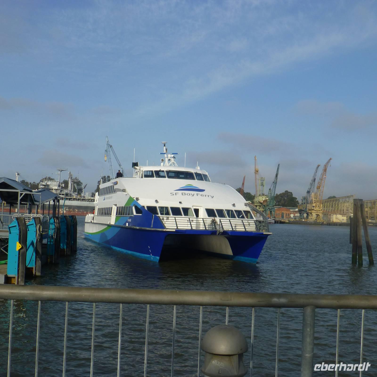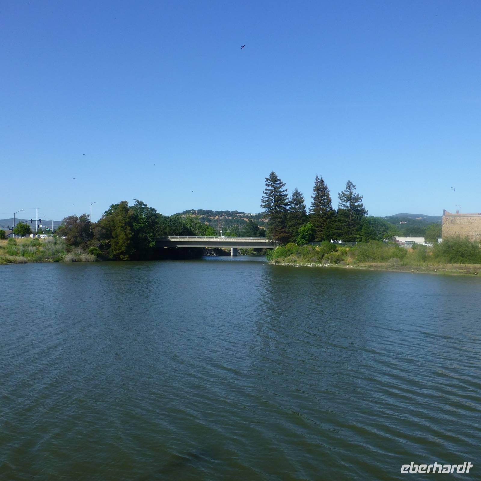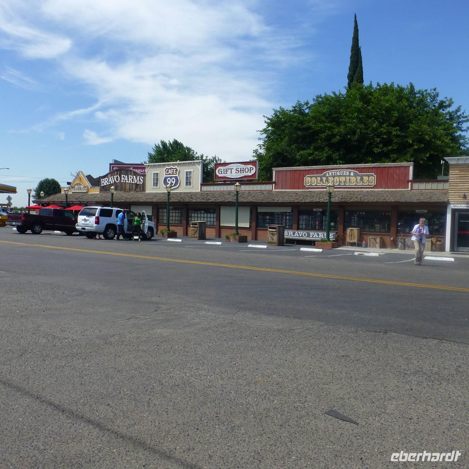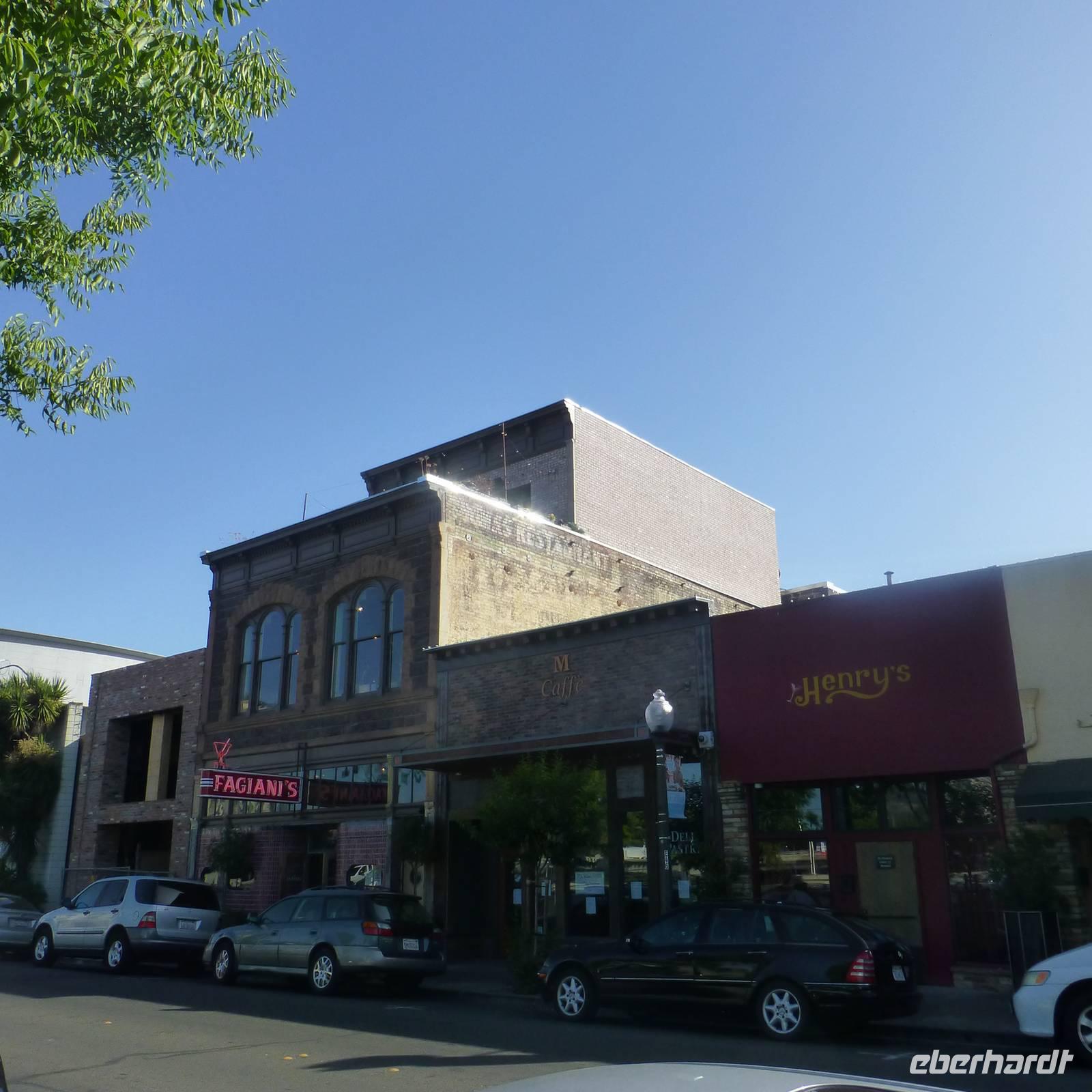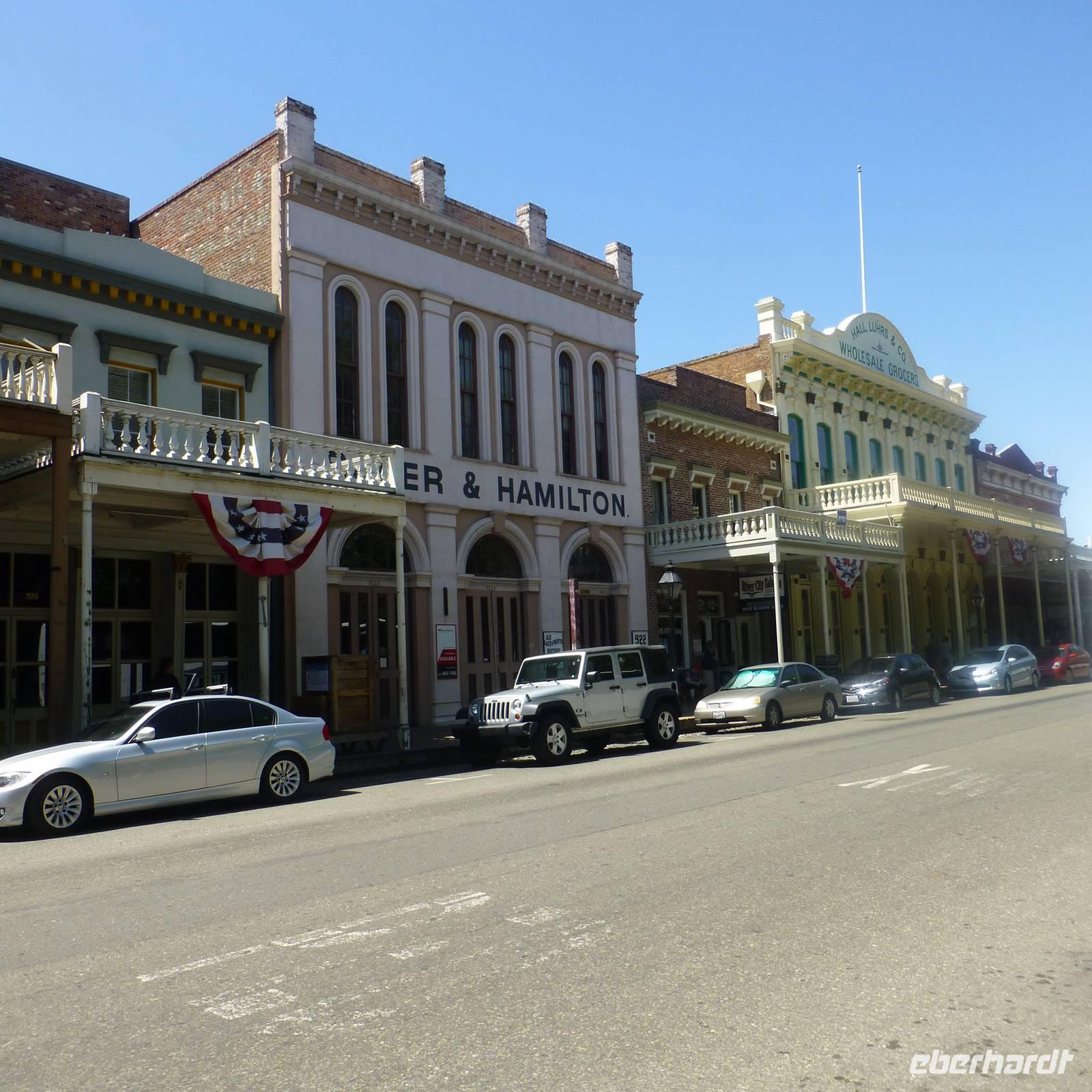 Zurück am Bus wollen wir weiter in Richtung Old Sacramento starten. Aber oje, unser Bus springt nicht mehr an. Daher entscheiden wir, das wir Pause im Regierungsviertel machen. Es gibt hier zahlreiche Restaurants und Cafés. Wer möchte, kann auch nochmal zurück in das Capitol. Nach rund einer Stunde kehren wir zurück zum Bus. Leider ist dieser immer noch kaputt aber der Ersatzbus ist schon auf dem Weg (glücklicherweise ist der Sitz der Busfirma hier in Sacramento). Nachdem alle Koffer und Handgepäck im neuen Bus verstaut sind, fahren wir nach Old Sacramento. Durch den Busdefekt reicht es hier leider nur zu einem kurzen Fotostopp aber meine Gruppe hat glücklicherweise Verständnis für die Situation. Und wir freuen uns, das wir Old Sacramento überhaupt sehen konnte, denn es ist wirklich hübsch. Bunte Holzhäuser verziert mit amerikanischen Flaggen erinnern uns an eine alte Western- und Cowboystadt. Wir verlassen Sacramento über den amerikanischen Fluss und Brian fährt uns weiter Richtung Napa-Valley, dem Weinanbaugebiet in Kalifornien. In einer kleinen Weinkellerei kurz hinter dem Städtchen Napa werden wir bereits erwartet. In einer vor uns doch ungewohnten Art der Weinführung probieren von den kalifornischen Weinen. Man muss sich das so vorstellen, dass wir in einem großen Raum zum ersten Wein eingeladen werden. Es gibt hier keinen Weinkeller, so wie wir das kennen. Im Nebenraum sind ein paar Weinfässer aufgebaut. Nachdem wir vom zweiten Wein probiert haben, gehen wir hinaus zum Weinfeld. Die zwei netten Damen erzählen uns von Ihren Trauben und leider auch den negativen Schädlingen, mit denen der Weinbau zu kämpfen hat. Wieder zurück in den klimatisierten Räumlichkeiten probieren wir auch noch von zwei roten Weinen. Wir verlassen das Weingut und Brian fährt uns in das kleine Örtchen Napa, wo wir bei etwas Freizeit durch den schönen kleinen Ort flanieren. Wir übernachten heute in der Nähe des Fähranlegers, damit wir am nächsten Morgen relativ zügig dort sind.