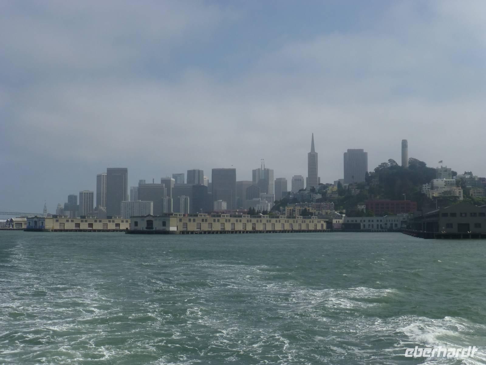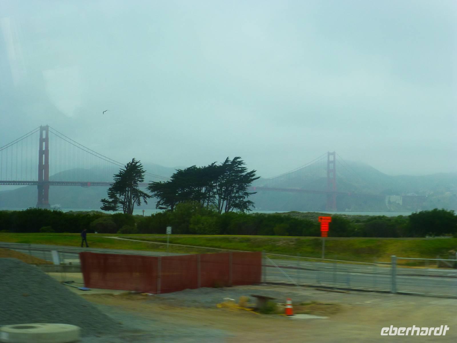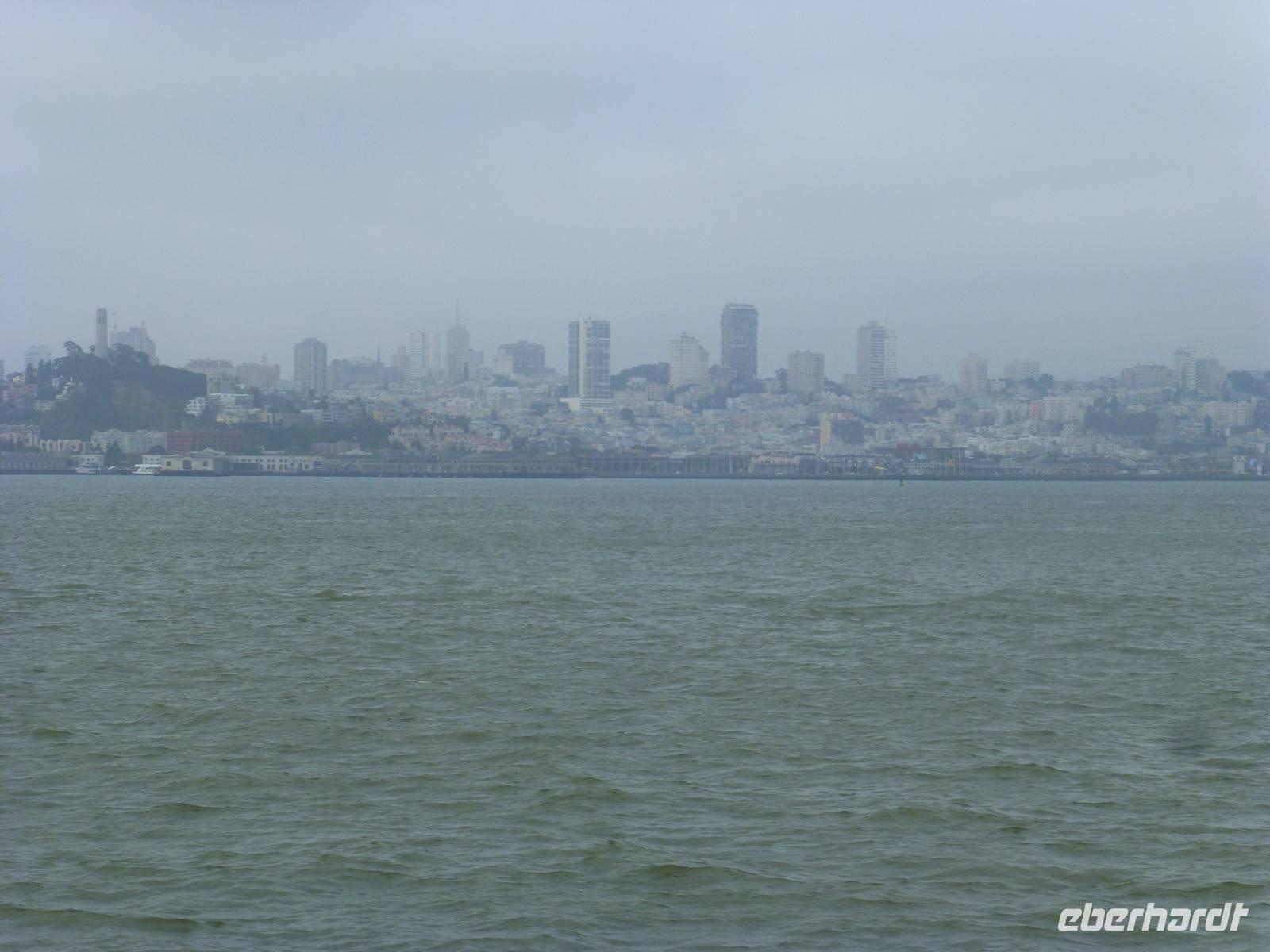 Der nächste Morgen ist angebrochen und wir müssen heute sehr zeitig aufstehen. Bereits dreiviertel acht geht unsere Fähre, die uns direkt in den Hafen von San Fransisco bringt. Wir fahren noch bei schönstem Wetter los aber leider zieht es sich dann doch über San Fransisco zu (Marguerite sagt, das ist typische San Fransisco-Wetter) und wir sehen die Golden-Gate-Bridge sowie Alcatraz nur im Nebelschleier. Wir erreichen schließlich Pier 1. Als wir aus dem Hafengebäuder heraus kommen, wartet Brian bereits auf uns, der natürlich auf dem Landweg nach San Fransisco gekommen ist. Nun beginnen wir doch gleich mit unserer Stadtrundfahrt. Ich bemerke, das jedes Haus in der Stadt tatsächlich über eine eigene Feuerleitung verfügt - für mich persönlich wäre dies ja ein "Angst-Problem";-) Wir halten am Rathaus, ein Abbild des römischen Peterdoms. Weiter geht durch das italienische und chinesische Viertel sowie durch den Finanzdistrikt. Brian hält für uns sogar in der Nähe der "painted ladies". Seit einigen Jahren dürfen keine Busse mehr an den schönen Häusern vorbei fahren, weil sich die Anwohner gestört fühlen und auch ringsumher ist überall Parkverbot. Aber Brian findet einen Platz zum Parken für uns und wir steigen ganz schnell aus dem Bus aus, gehen zu den "painted ladies", fotografieren sie, gehen zurück zum Bus und verschwinden so schnell, wie wir gekommen sind;-). Marguerite meint es auch gut mit uns und möchte mit uns unbedingt auf dem Hausberg. Sie hofft, dass sich der Nebelschleier verzieht aber dem ist leider nicht so und man sieht von oben, also von Twin Peaks, nicht wirklich was von der Stadt - aber, der Gute Wille zählt;-).