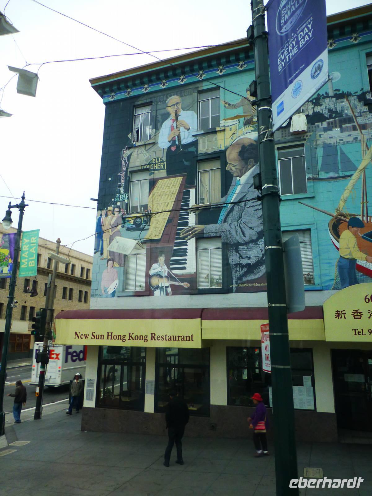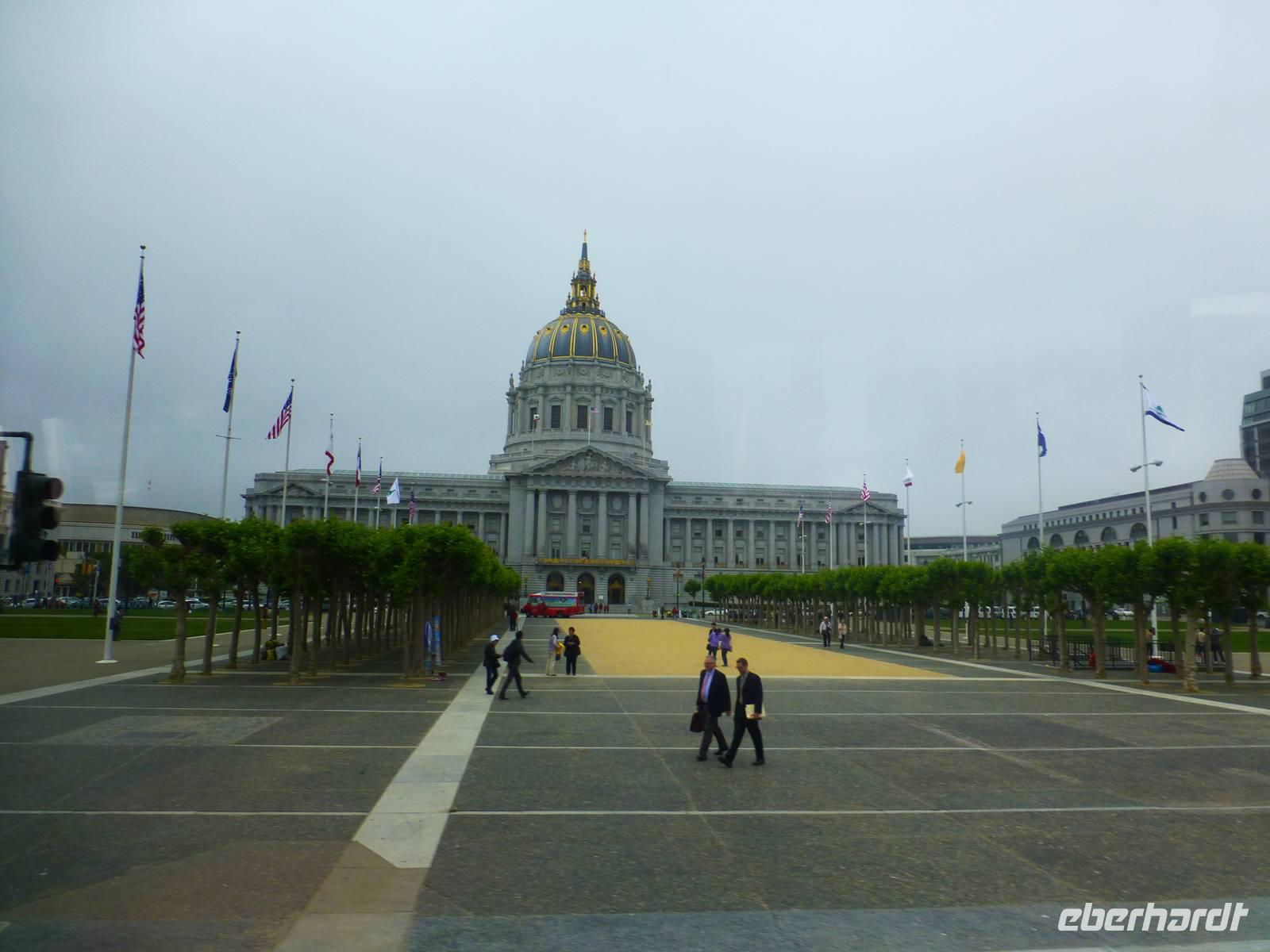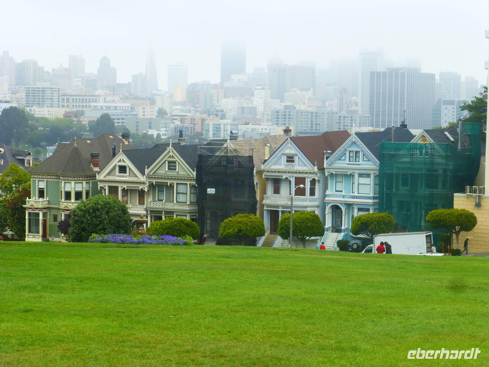 Der nächste Morgen ist angebrochen und wir müssen heute sehr zeitig aufstehen. Bereits dreiviertel acht geht unsere Fähre, die uns direkt in den Hafen von San Fransisco bringt. Wir fahren noch bei schönstem Wetter los aber leider zieht es sich dann doch über San Fransisco zu (Marguerite sagt, das ist typische San Fransisco-Wetter) und wir sehen die Golden-Gate-Bridge sowie Alcatraz nur im Nebelschleier. Wir erreichen schließlich Pier 1. Als wir aus dem Hafengebäuder heraus kommen, wartet Brian bereits auf uns, der natürlich auf dem Landweg nach San Fransisco gekommen ist. Nun beginnen wir doch gleich mit unserer Stadtrundfahrt. Ich bemerke, das jedes Haus in der Stadt tatsächlich über eine eigene Feuerleitung verfügt - für mich persönlich wäre dies ja ein "Angst-Problem";-) Wir halten am Rathaus, ein Abbild des römischen Peterdoms. Weiter geht durch das italienische und chinesische Viertel sowie durch den Finanzdistrikt. Brian hält für uns sogar in der Nähe der "painted ladies". Seit einigen Jahren dürfen keine Busse mehr an den schönen Häusern vorbei fahren, weil sich die Anwohner gestört fühlen und auch ringsumher ist überall Parkverbot. Aber Brian findet einen Platz zum Parken für uns und wir steigen ganz schnell aus dem Bus aus, gehen zu den "painted ladies", fotografieren sie, gehen zurück zum Bus und verschwinden so schnell, wie wir gekommen sind;-). Marguerite meint es auch gut mit uns und möchte mit uns unbedingt auf dem Hausberg. Sie hofft, dass sich der Nebelschleier verzieht aber dem ist leider nicht so und man sieht von oben, also von Twin Peaks, nicht wirklich was von der Stadt - aber, der Gute Wille zählt;-).