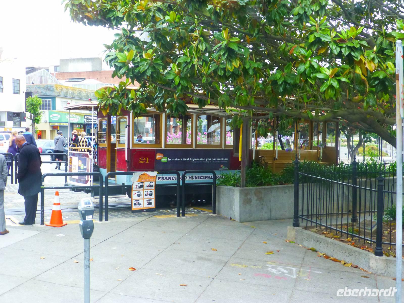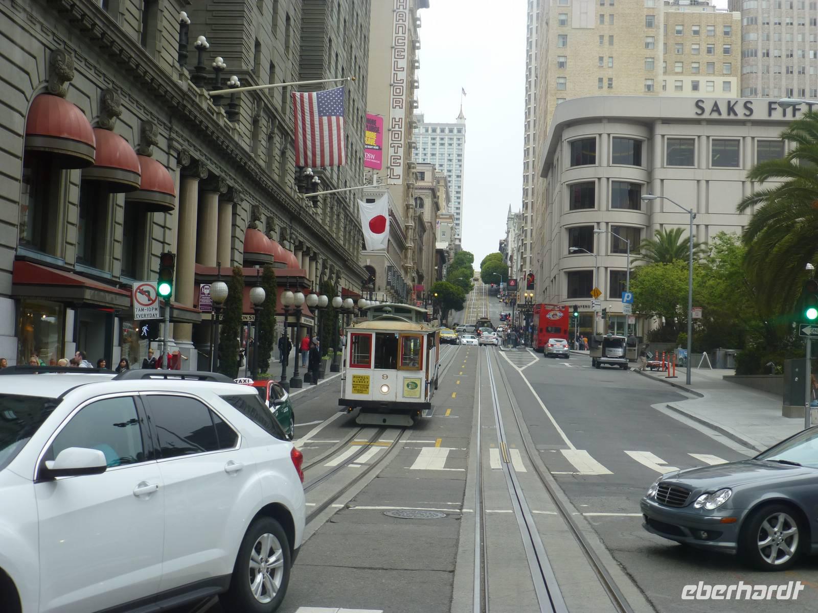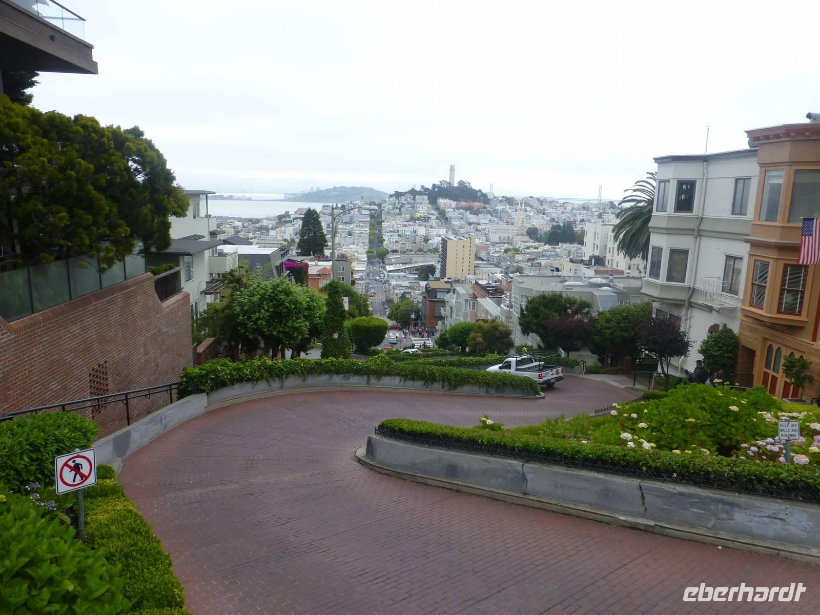Da unser Flieger zurück nach Deutschland erst für heute Nachmittag angesetzt ist, steht uns der Vormittag noch frei zur Verfügung. Ich biete meiner Gruppe an, mit Ihnen gemeinsam mit der bekannten Cable Car zu fahren und ich freue mich wirklich sehr, dass fast alle Gäste mitkommen. Gemeinsam spazieren wir zum Unioun Square, wo sich einer der Endstationen befinden. Leider müssen wir ziemlich lange warten, bis wir endlich dran sind um in das richtige Cable Car einzusteigen. Unser Ziel: die Lombardt Street. Und endlich geht es los! Zunächst bergaufwärts, immer weiter hoch, um anschließend wieder steilabwärts zu fahren...ein Erlebnis, fast so schon wie Achterbahnfahren. Etwas ungünstig ist zwar, dass sehr viele Leute auf solch ein Car gelassen werden aber schließlich wollen wir ja authentische Erlebnisse fühlen. An der Lombardt-Street steigen wir aus und fotografieren die wohl bekannteste Straße in San Fransisco. Von hier aus laufen wir zurück zu unserem Hotel, welches sich ca. eine halbe Stunde Fussweg von hier befindet.