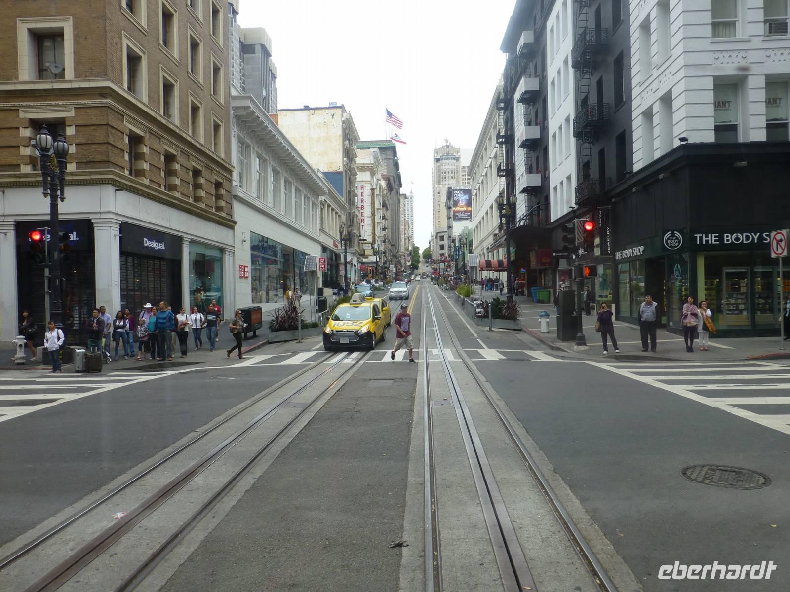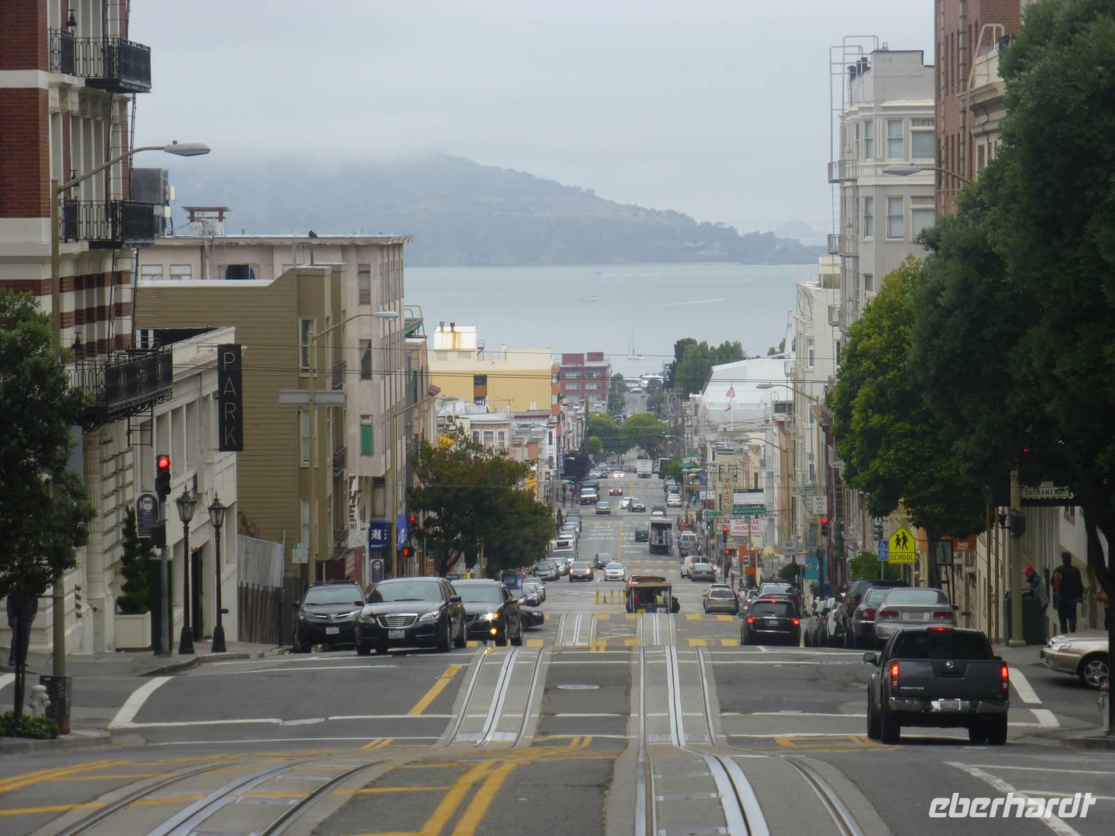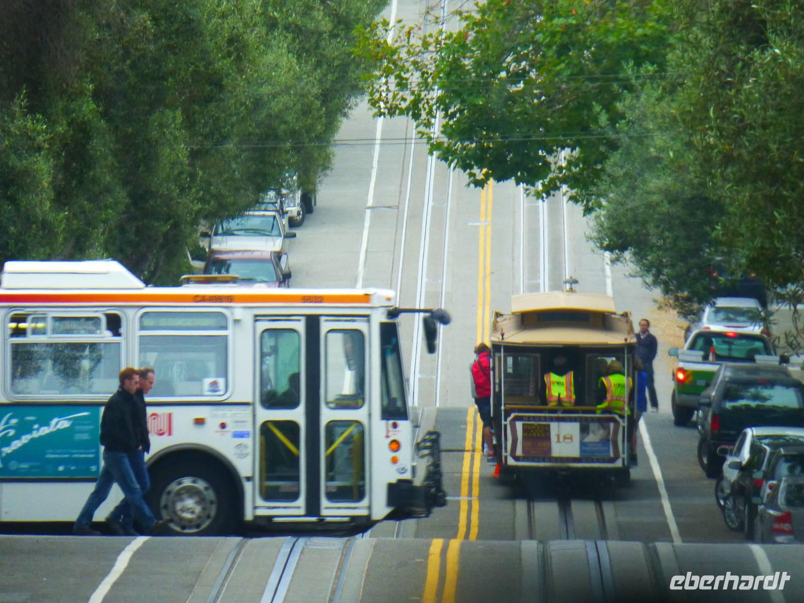 Da unser Flieger zurück nach Deutschland erst für heute Nachmittag angesetzt ist, steht uns der Vormittag noch frei zur Verfügung. Ich biete meiner Gruppe an, mit Ihnen gemeinsam mit der bekannten Cable Car zu fahren und ich freue mich wirklich sehr, dass fast alle Gäste mitkommen. Gemeinsam spazieren wir zum Unioun Square, wo sich einer der Endstationen befinden. Leider müssen wir ziemlich lange warten, bis wir endlich dran sind um in das richtige Cable Car einzusteigen. Unser Ziel: die Lombardt Street. Und endlich geht es los! Zunächst bergaufwärts, immer weiter hoch, um anschließend wieder steilabwärts zu fahren...ein Erlebnis, fast so schon wie Achterbahnfahren. Etwas ungünstig ist zwar, dass sehr viele Leute auf solch ein Car gelassen werden aber schließlich wollen wir ja authentische Erlebnisse fühlen. An der Lombardt-Street steigen wir aus und fotografieren die wohl bekannteste Straße in San Fransisco. Von hier aus laufen wir zurück zu unserem Hotel, welches sich ca. eine halbe Stunde Fussweg von hier befindet.