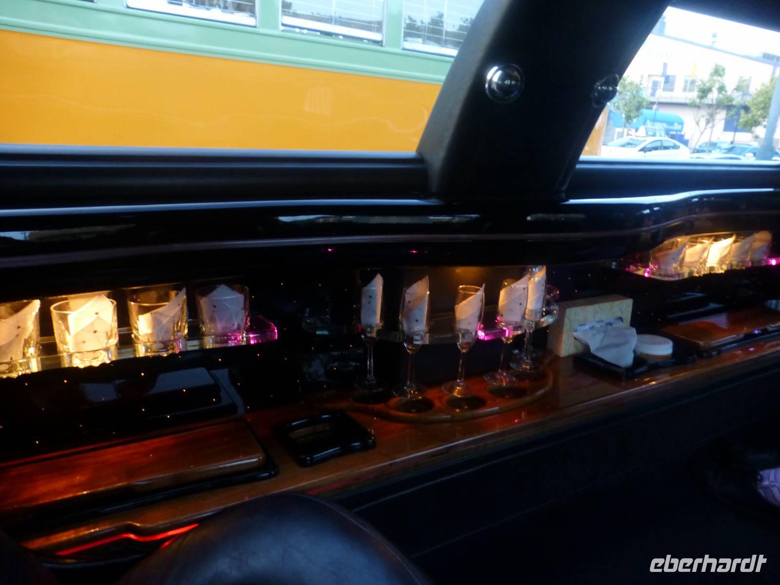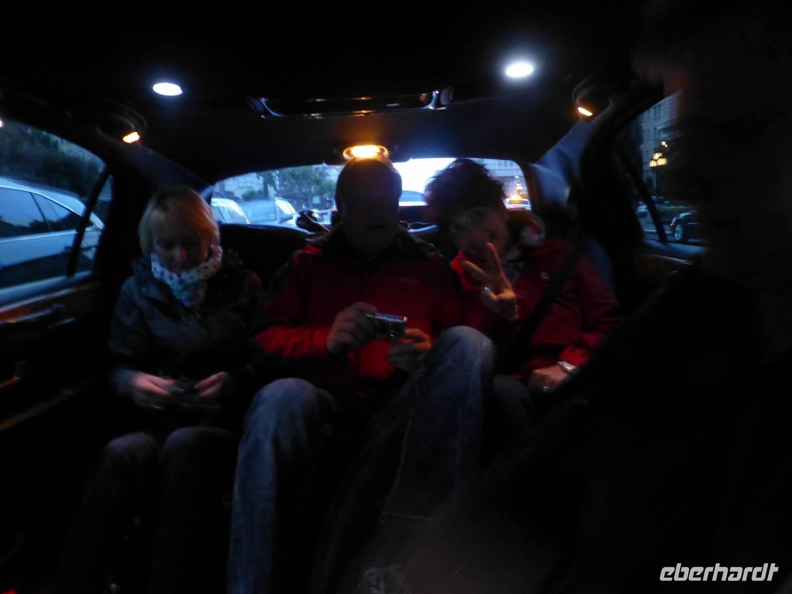 Wir fahren mit der Fähre zurück auf das Festland und ich leite meine Gruppe zur Fisherman's Warf, wo wir im wunderschönen Restaurant "Neptun's Palace" unser Abschiedsabendessen verleben. Das Lokal hat ein wunderbares Ambiente und die Speisen,wir können zwischen Lachs und Scampis wählen, sind köstlich. Nachdem wir alle auf eine schöne Reise angestoßen und das Essen genossen haben, heißt es leider zum ersten Mal Abschied nehmen. "Unser" Brian muss sich auf dem Heimweg machen, da er am nächsten Tag zur neuen Tour nach L.A. aufbrechen muss. Jeder Gast aus meiner Reisegruppe verabschiedet sich persönlich von Brian. Und gleich darauf erleben wir noch ein kleines, letztes Highlight auf unserer Reise: drei Stretch-Limonsinen warten auf uns, in denen wir nun rund eine Stunde San Fransisco in der Abenddämmerung erleben. Die Vorfreude ist groß und da bisher nur wenige von uns in solch einem Auto Platz genommen hat, ist auch ein Anspur von Aufregung zu spüren. Fröhlich amüsierend genießen wir die abendlichen Eindrücke, mit der die Stadt aufwartet. Unser erster Stopp auf der Fahrt ist das 5-Sterne-Hotel "The Fairmont", in das wir auch hineingehen. Dieser Luxus, der uns in der Empfangshalle entgegen strömt, ist doch gewaltig. Einen weiteren Halt machen wir unterhalb der Bay Bridge. Hier stoßen wir gemeinsam mit Sekt auf die tolle Reise an und tanzen zu sambischen Klängen. Leider endet der Ausflug viel zu schnell wieder an unserem Hotel. Wir wünschen uns allen eine "letzte gute Nacht" und gehen schlafen.
