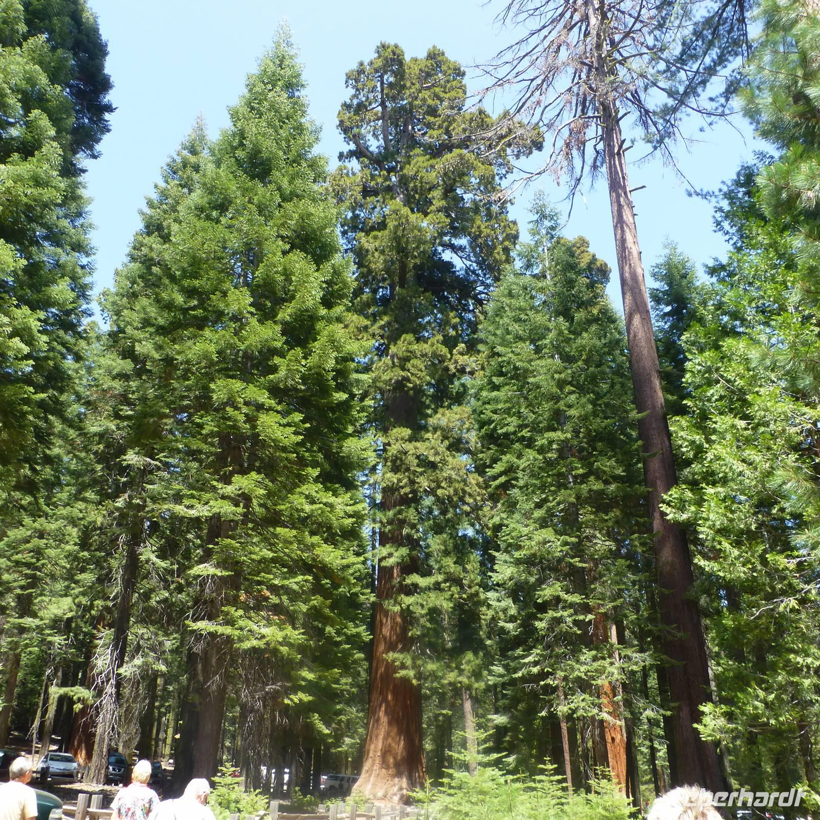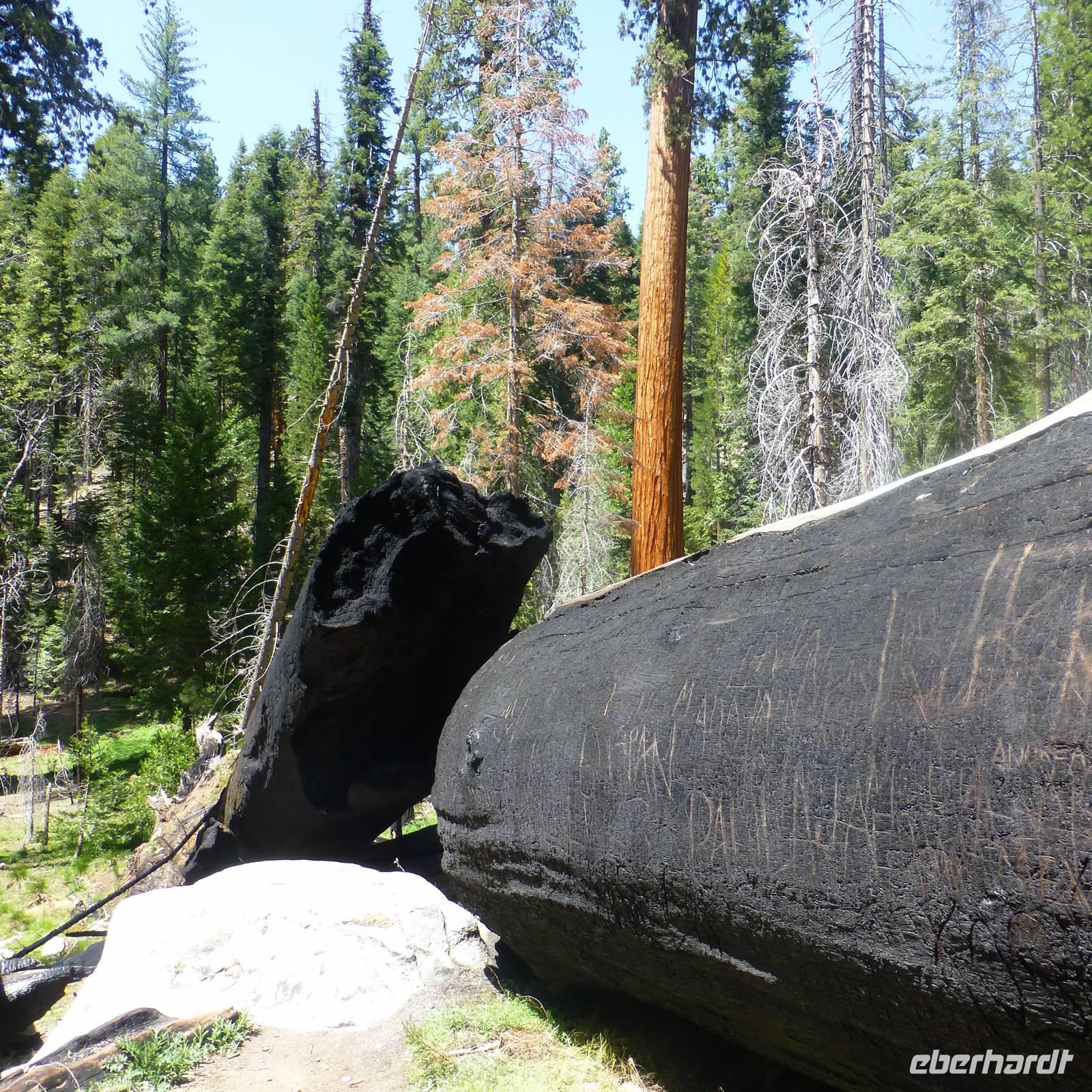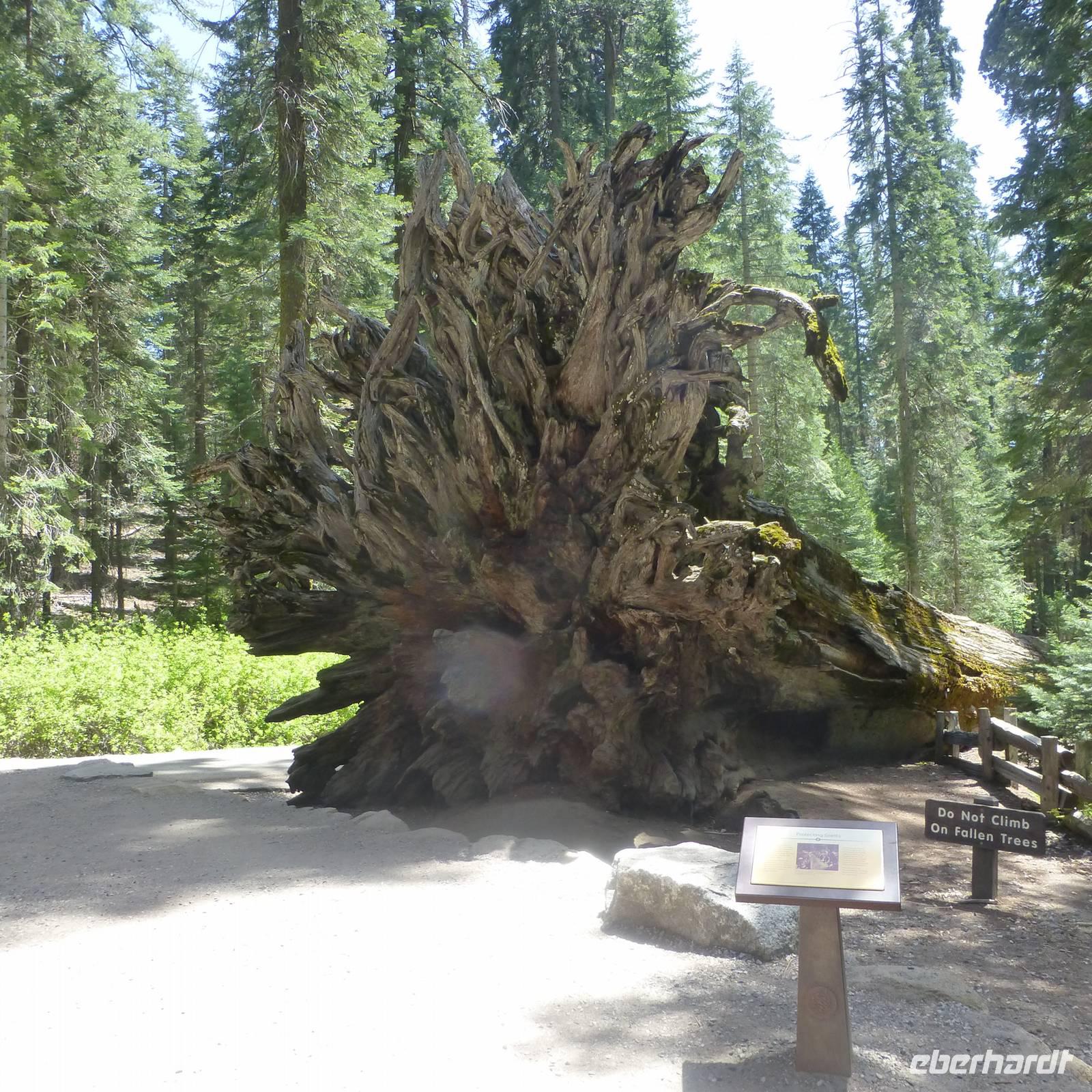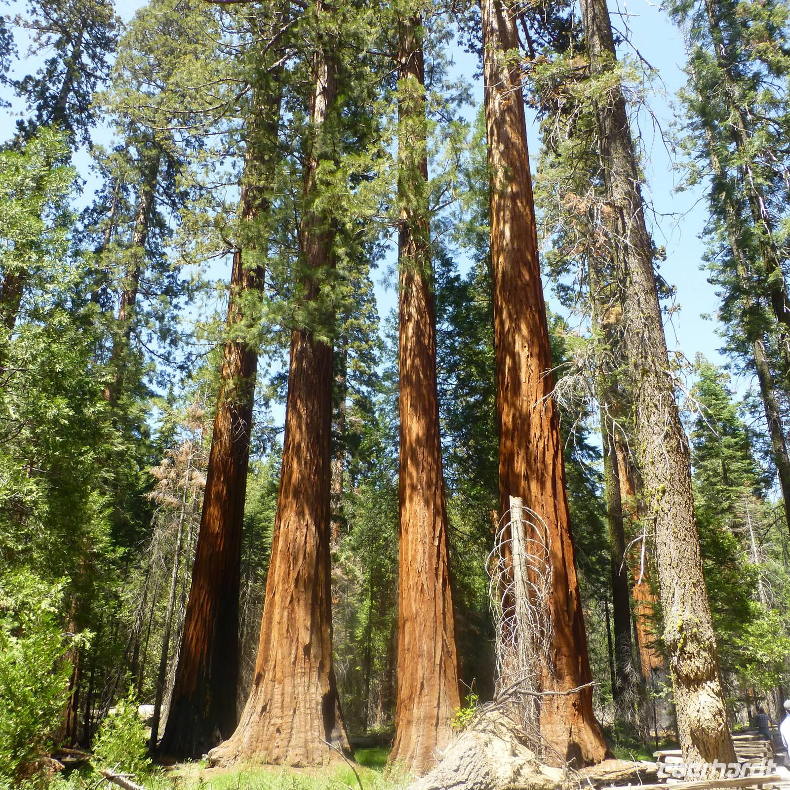 Bakersfield ist nur ein kleiner Abstecher auf unserer Route, einfach nur zum Übernachten. Wir setzen unsere Fahrt in den Yosemite- Nationalpark fort, den wir gegen Mittag erreichen. Jedoch halten wir zunächst an einem Supermarkt an, in dem wir für unser Picknick heute im Yosemite-Nationalpark einkaufen. So ein Besuch im amerikanischen Supermarkt kann ja auch ein Erlebnis sein. Bisher kannte ich die riesigen Eis- und Milchverpackungen aus dem Fernsehen aber wenn man dann tatsächlichen vor diesen überdimensionalen Lebensmittelverpackungen steht, staunt man nicht schlecht. Was für einen Bedarf muss denn jeder einzelne Amerikaner haben;-). Die Verpackungen sind alle wirklich mega...einfach irre. Nachdem wir alles im Bus verstaut haben, erreichen wir recht zügig den Eingang zum Nationalpark. Noch ein paar wenige Kilometer weiter ist der Busparkplatz, wo wir schließlich von unserem Bus in einen örtlichen Bus des Nationalparks umsteigen. Nun fahren wir hinauf zu den Mammutbäumen. Unterwegs auf der Fahrt bewundern wir natürlich die Natur und es ist erstaunlich, dass die sich nun wieder gewandelt hat. So viele unterschiedliche Vegetationszonen in so kurzer Zeit sind schon richtig beeindruckend. Wir erreichen einen weiteren Busparkplatz und wandern nun zu den Mammutbäumen, die wir nach einigen hundert Metern Wanderung erreichen. Der Weg ist leicht ansteigend aber gut zu belaufen. Wir haben unterwegs schon soviele große Bäume und riesige Baumwurzeln zu sehen, dass die Wanderung auch ziemlich schnell vergeht. Und so kommen wir vorbei am "Casanova mit seinen drei Damen" und stehen alsbald vor den "Giant Tree", ein wirklicher beeindruckender Baum. Natürlich müssen wir uns hier sofort aufstellen, um das Eberhardt-Gruppenfoto zu machen. Kurz dahinter ist noch ein wunderschöner Baumstamm, der in der Mitte geteilt und durch den man durchlaufen kann, der zum Fotografieren einlädt