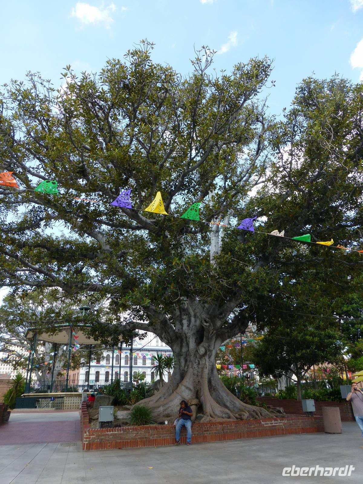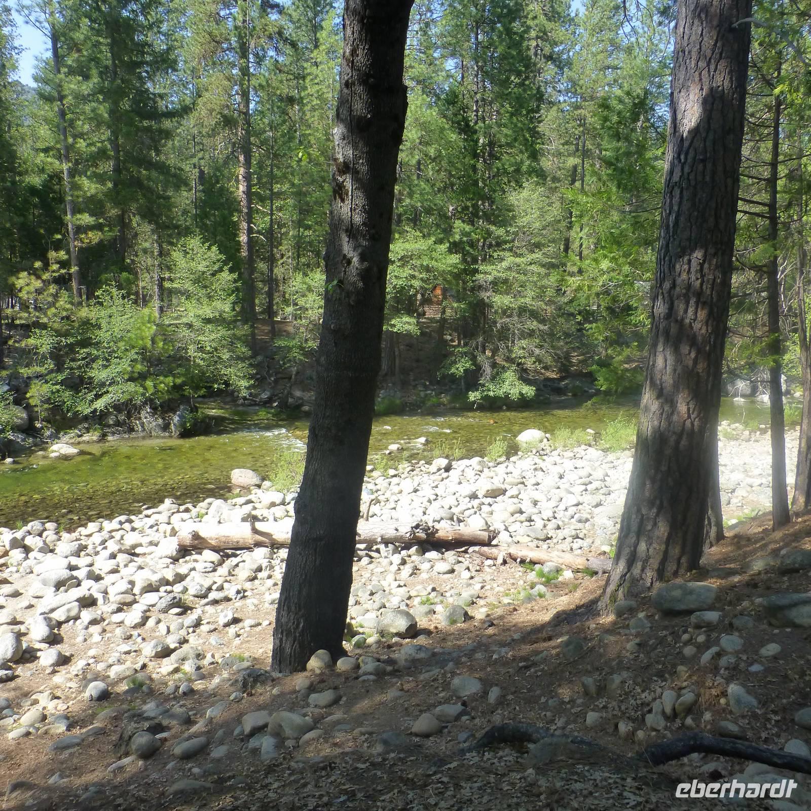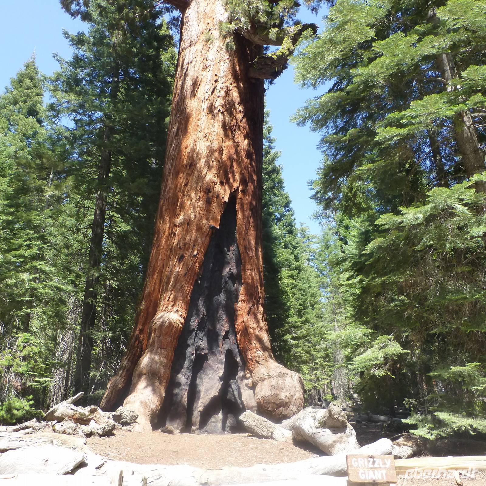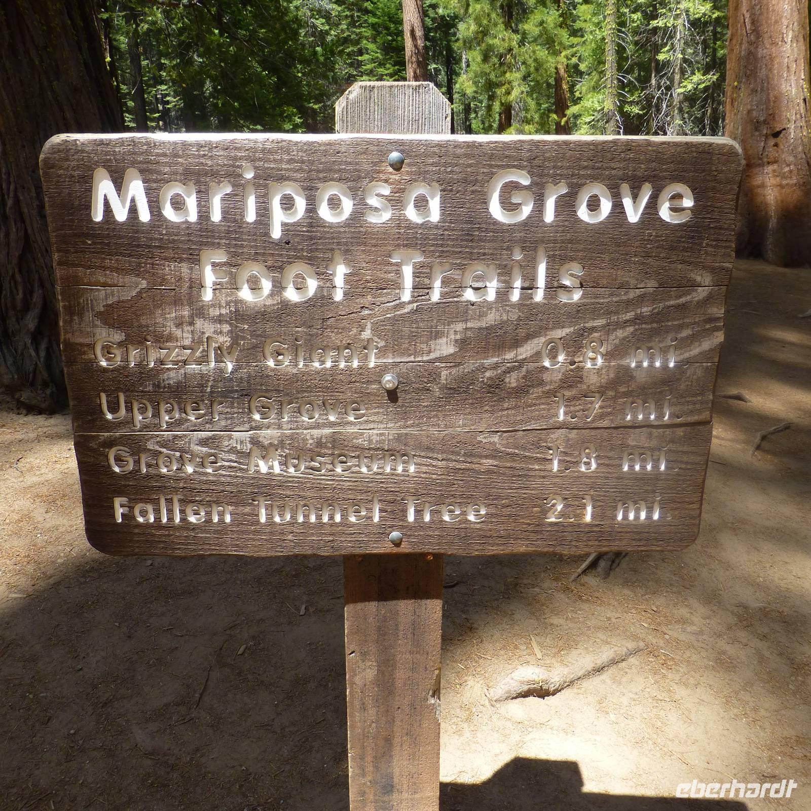 Bakersfield ist nur ein kleiner Abstecher auf unserer Route, einfach nur zum Übernachten. Wir setzen unsere Fahrt in den Yosemite- Nationalpark fort, den wir gegen Mittag erreichen. Jedoch halten wir zunächst an einem Supermarkt an, in dem wir für unser Picknick heute im Yosemite-Nationalpark einkaufen. So ein Besuch im amerikanischen Supermarkt kann ja auch ein Erlebnis sein. Bisher kannte ich die riesigen Eis- und Milchverpackungen aus dem Fernsehen aber wenn man dann tatsächlichen vor diesen überdimensionalen Lebensmittelverpackungen steht, staunt man nicht schlecht. Was für einen Bedarf muss denn jeder einzelne Amerikaner haben;-). Die Verpackungen sind alle wirklich mega...einfach irre. Nachdem wir alles im Bus verstaut haben, erreichen wir recht zügig den Eingang zum Nationalpark. Noch ein paar wenige Kilometer weiter ist der Busparkplatz, wo wir schließlich von unserem Bus in einen örtlichen Bus des Nationalparks umsteigen. Nun fahren wir hinauf zu den Mammutbäumen. Unterwegs auf der Fahrt bewundern wir natürlich die Natur und es ist erstaunlich, dass die sich nun wieder gewandelt hat. So viele unterschiedliche Vegetationszonen in so kurzer Zeit sind schon richtig beeindruckend. Wir erreichen einen weiteren Busparkplatz und wandern nun zu den Mammutbäumen, die wir nach einigen hundert Metern Wanderung erreichen. Der Weg ist leicht ansteigend aber gut zu belaufen. Wir haben unterwegs schon soviele große Bäume und riesige Baumwurzeln zu sehen, dass die Wanderung auch ziemlich schnell vergeht. Und so kommen wir vorbei am "Casanova mit seinen drei Damen" und stehen alsbald vor den "Giant Tree", ein wirklicher beeindruckender Baum. Natürlich müssen wir uns hier sofort aufstellen, um das Eberhardt-Gruppenfoto zu machen. Kurz dahinter ist noch ein wunderschöner Baumstamm, der in der Mitte geteilt und durch den man durchlaufen kann, der zum Fotografieren einlädt
