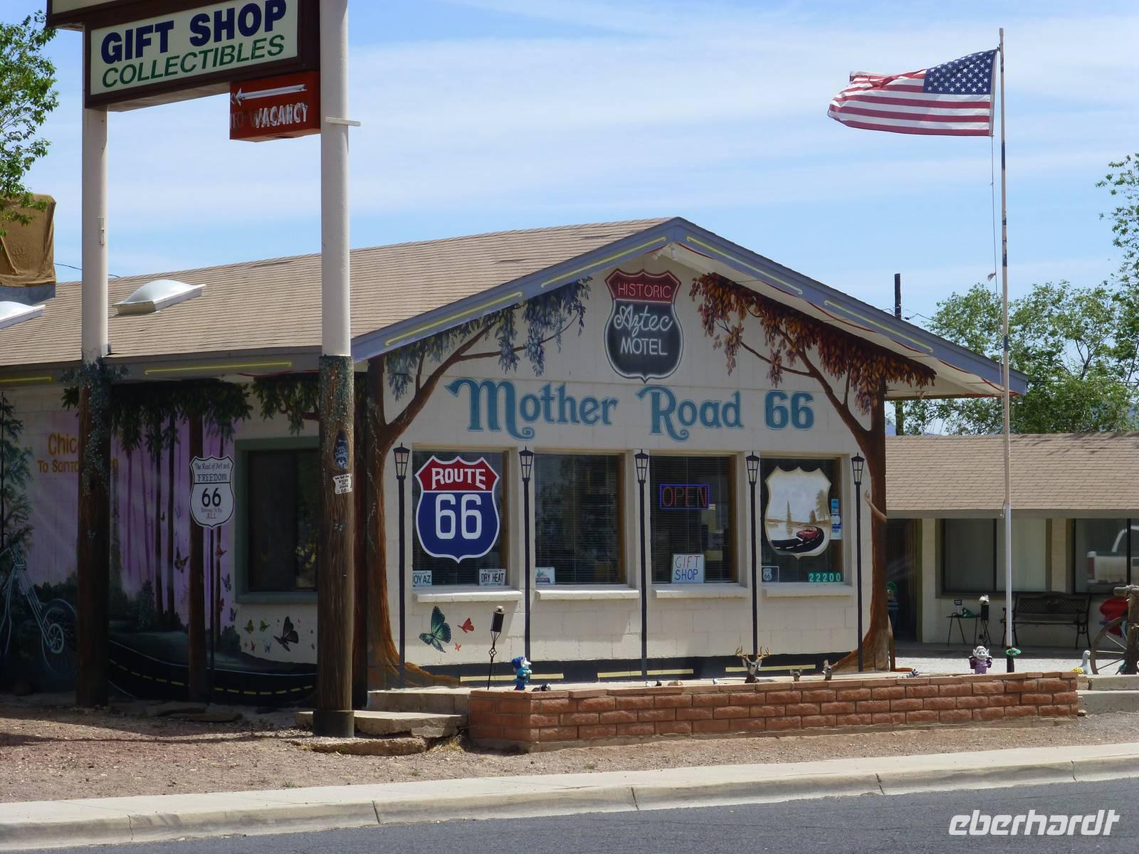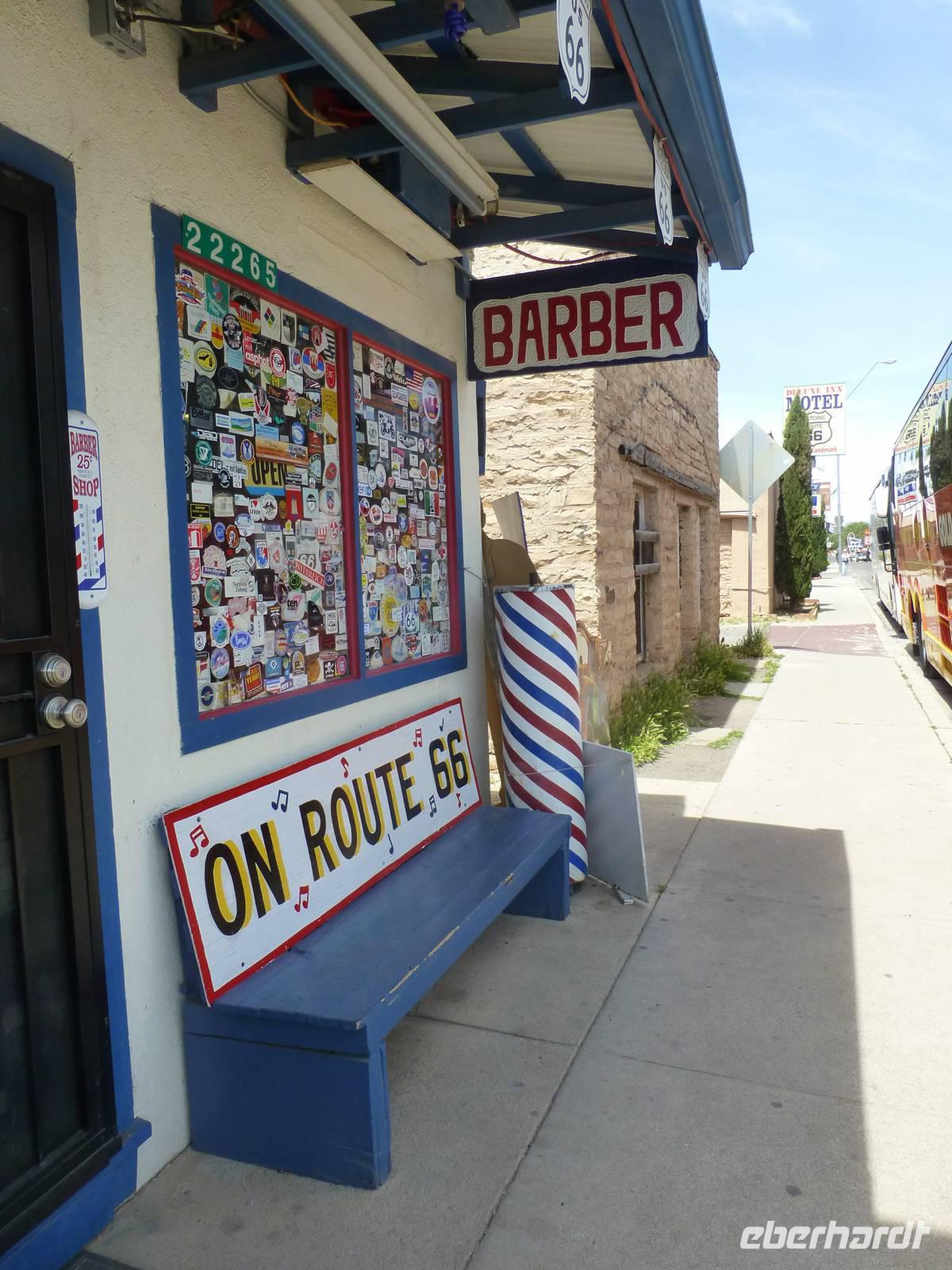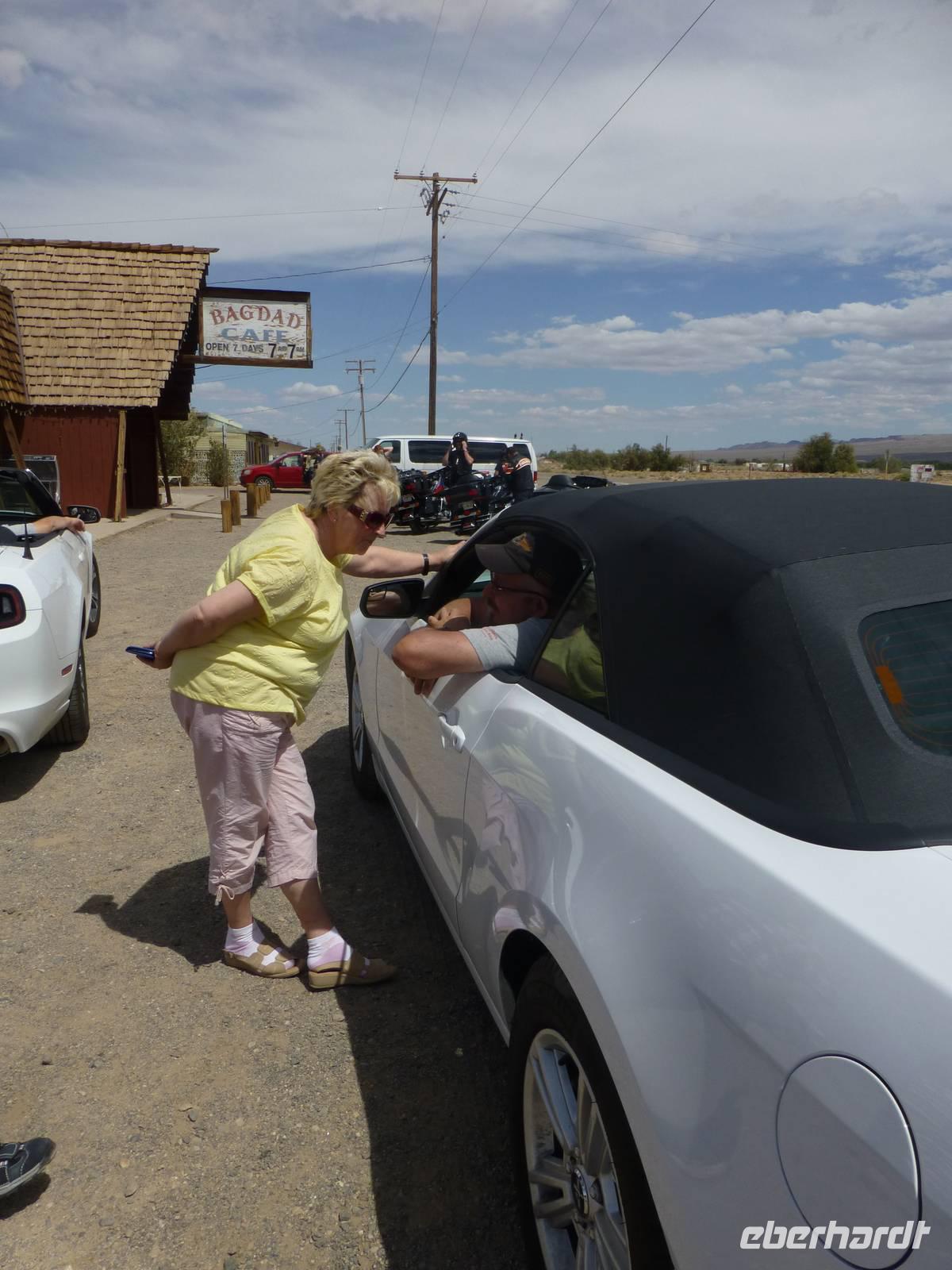 Nach einer Nacht verlassen wir schon wieder Laughlin und begeben uns auf die Interstate 40. Aber nicht für allzulange Zeit, denn Margaruite und Brian haben die schöne Idee, ein Stück auf der Originalroute 66 entlang zu fahren. Dies dauert zwar ein paar Minuten länger aber bei Musik von Elvis Presley bekommen wir doch richtiges ¨Wild-West-Feeling¨. Die unendlichen Weiten der Wüste zieht an unserem Fenster vorbei. Ab und zu sieht man einen dieser langen Züge, die kein Ende nehmen wollen. Schließlich erreichen wir Seligman, ein kleines Örtchen, das sich dem Erhalt der Route 66 verschrieben hat. Zahlreiche bunte Holzhäuschen aus den 60iger Jahren verkaufen verschiedenartige Souvenirs und Postkarten. In einem der Häuschen kann man auch noch den alten Barbier-Salon bewundern. Leider ist der Eigentümer, der schon weit in die 80 sein muss, nicht da. Aber auch vor den Häuser gibt es allerelei Skuriles zu bestaunen. Besonders alte Oldtimer, die bunt geschmückt sind mit Plastikpuppen verziert, erhaschen unsere Aufmerksamkeit. Im Hintergrund hört man immer wieder die schweren Motoren der Harley Davidson, die hier zahlreich durch Seligman fahren. Ein wirklich kleines amerikanisch-kitschiges Dörfchen, was beeindruckt.