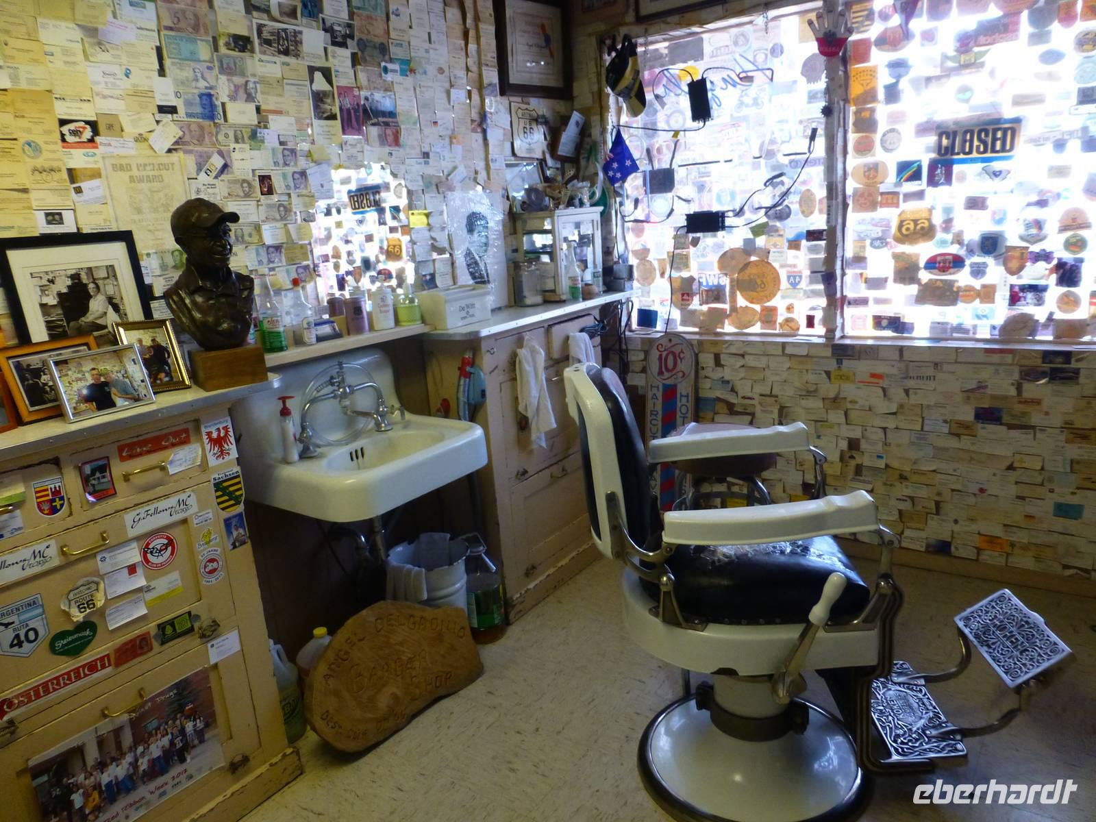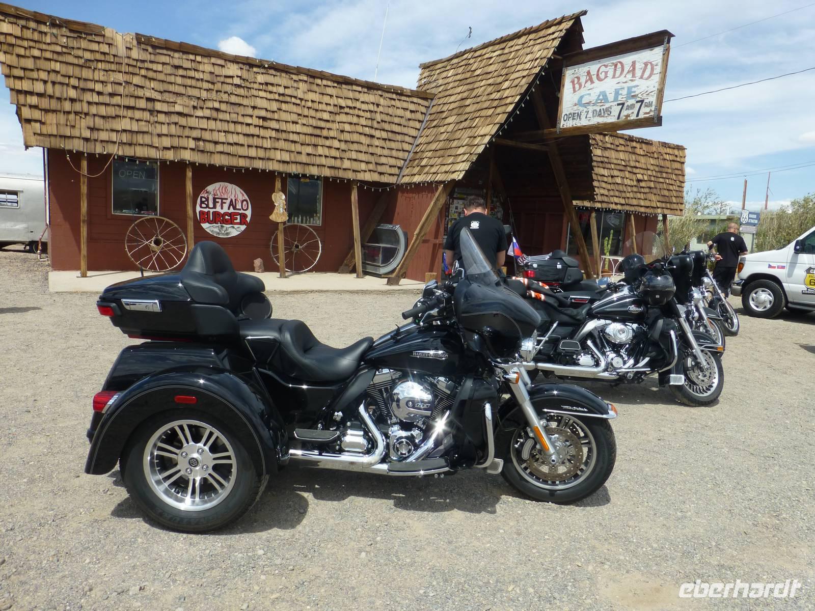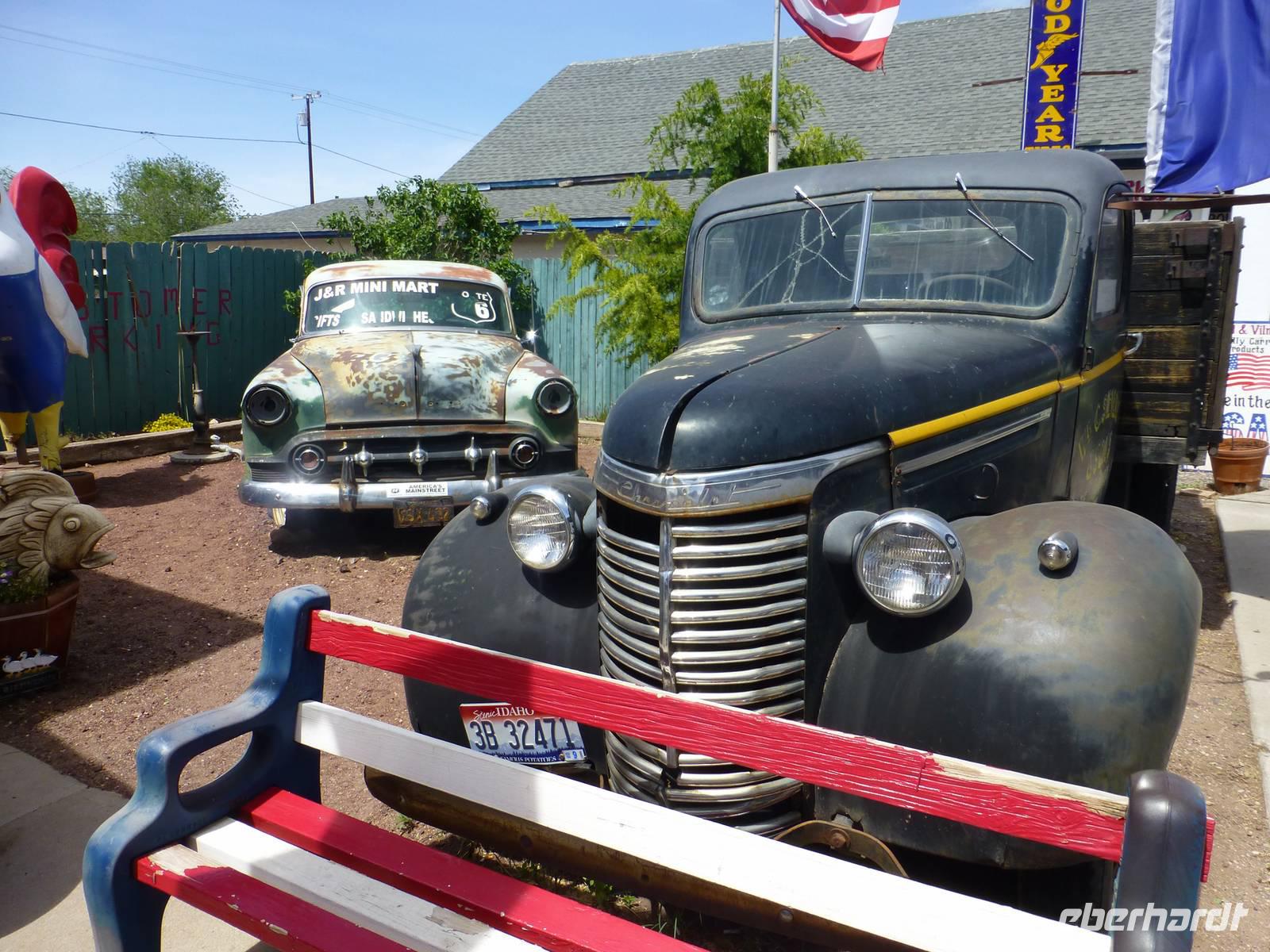Nach einer Nacht verlassen wir schon wieder Laughlin und begeben uns auf die Interstate 40. Aber nicht für allzulange Zeit, denn Margaruite und Brian haben die schöne Idee, ein Stück auf der Originalroute 66 entlang zu fahren. Dies dauert zwar ein paar Minuten länger aber bei Musik von Elvis Presley bekommen wir doch richtiges ¨Wild-West-Feeling¨. Die unendlichen Weiten der Wüste zieht an unserem Fenster vorbei. Ab und zu sieht man einen dieser langen Züge, die kein Ende nehmen wollen. Schließlich erreichen wir Seligman, ein kleines Örtchen, das sich dem Erhalt der Route 66 verschrieben hat. Zahlreiche bunte Holzhäuschen aus den 60iger Jahren verkaufen verschiedenartige Souvenirs und Postkarten. In einem der Häuschen kann man auch noch den alten Barbier-Salon bewundern. Leider ist der Eigentümer, der schon weit in die 80 sein muss, nicht da. Aber auch vor den Häuser gibt es allerelei Skuriles zu bestaunen. Besonders alte Oldtimer, die bunt geschmückt sind mit Plastikpuppen verziert, erhaschen unsere Aufmerksamkeit. Im Hintergrund hört man immer wieder die schweren Motoren der Harley Davidson, die hier zahlreich durch Seligman fahren. Ein wirklich kleines amerikanisch-kitschiges Dörfchen, was beeindruckt.