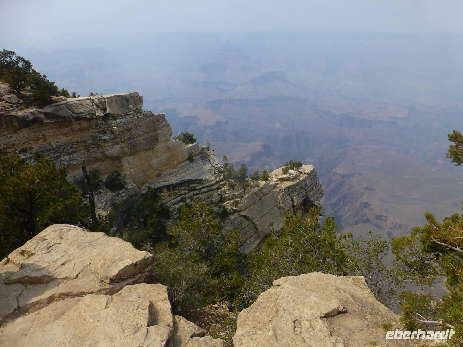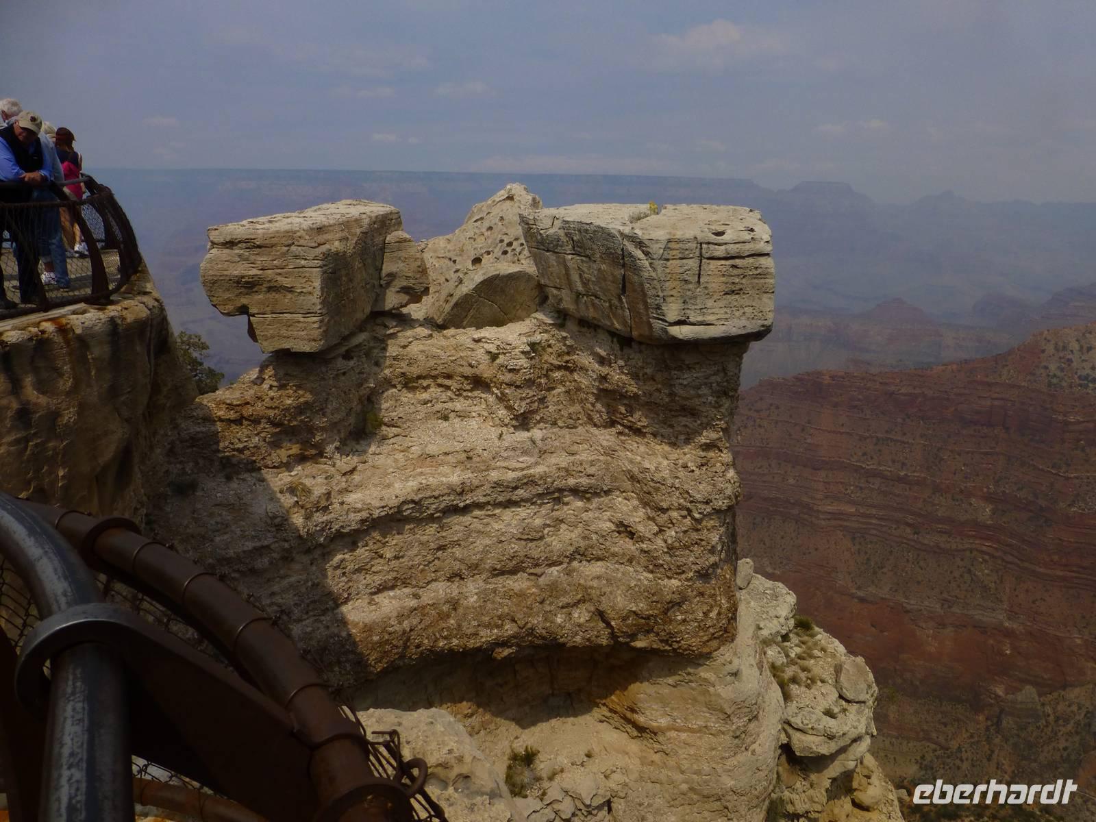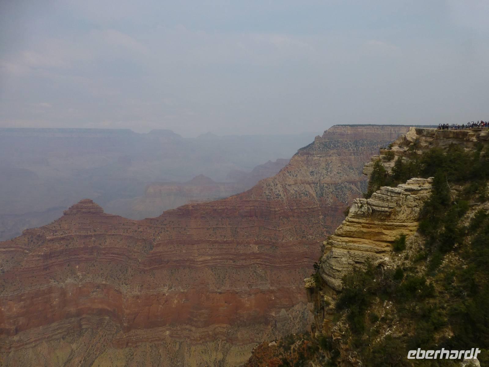 Weiter geht es in Richtung Nationalpark Grand Canyon. Diesen erreichen wir am zeitigen Nachmittag. Wer einen Flug über die Schlucht gebucht hat, hat nur ein wenig mehr als eine Stunde Zeit, sich die atemberaubende Schlucht am Mather Point anzuschauen. Wir, die nicht mitfliegen, haben nun 3,5 Stunden Zeit. Diese möchten wir natürlich im vollen Umfang nutzen. Wir wandern entlang des Canyons vom Aussichtspunkt Mather Point bis zur Bright Angel Lodge. Leider liegt ein kleiner Nebelschleier über der Schlucht, so das wir nicht die gegenüberliegende Seite sehen können aber trotzdem sehen wir die roten Steinfelsen - sehr imposant und eindrucksvoll.Ein paar leichtsinnige Jugendliche springen sogar über die Felsen - hoffentlich haben die eine gute Lebensversicherung abgeschlossen;-).