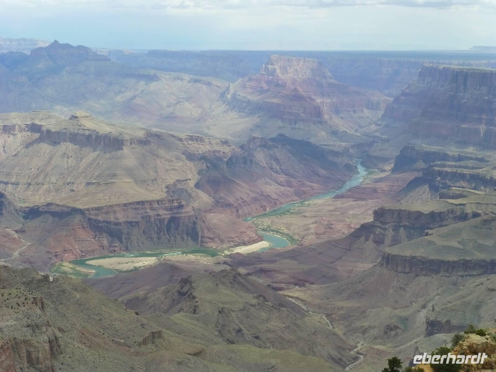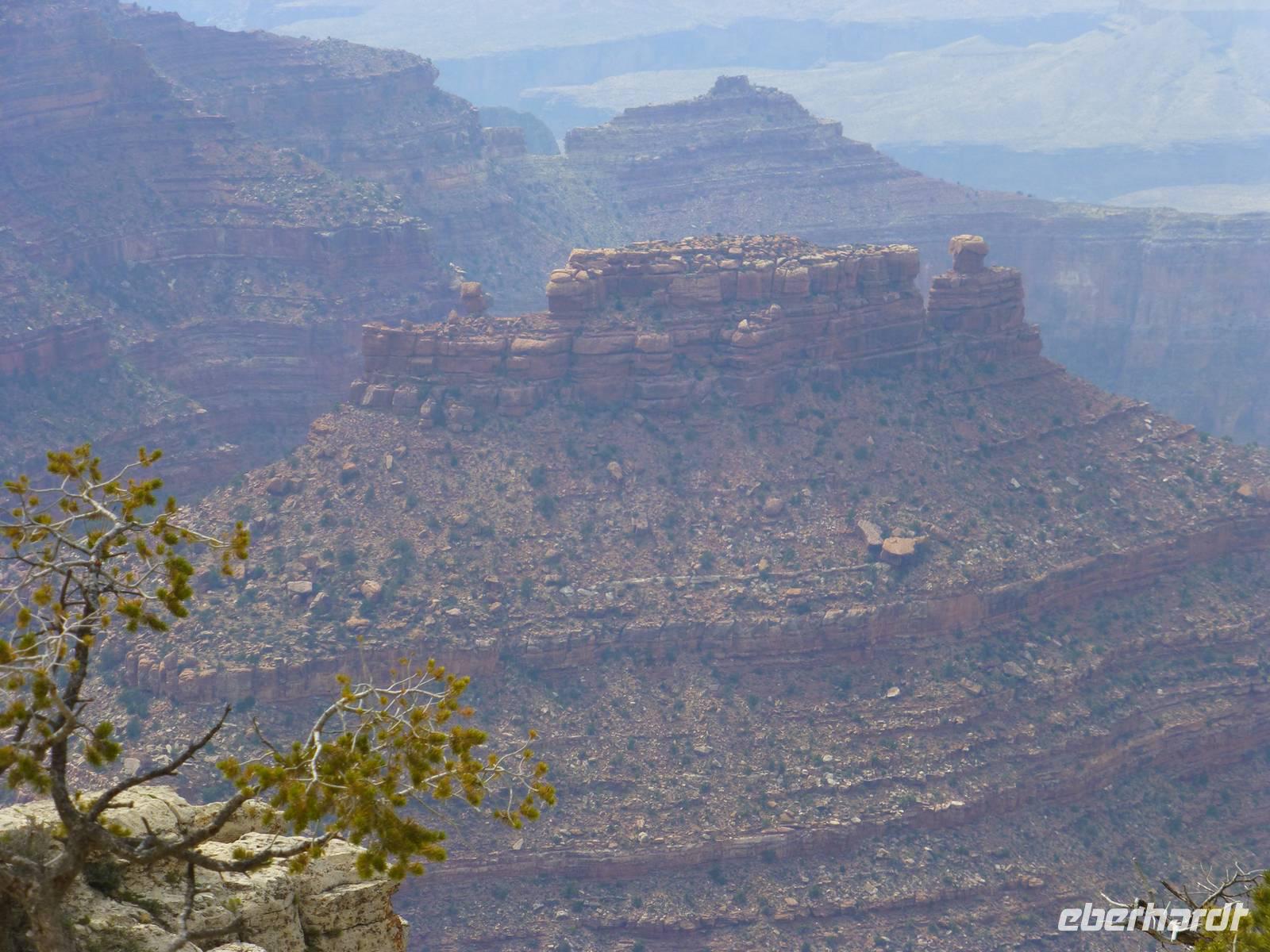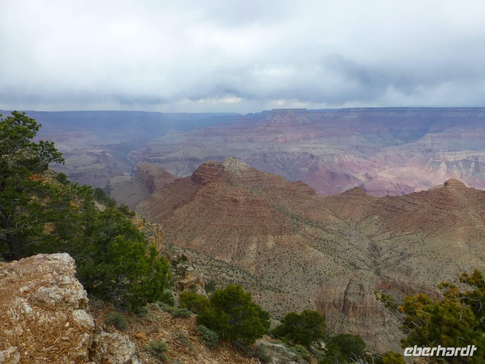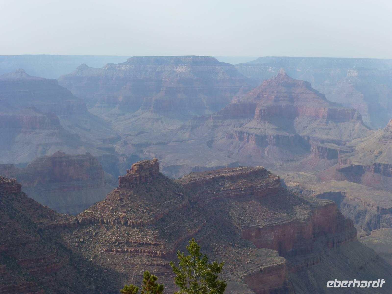 Weiter geht es in Richtung Nationalpark Grand Canyon. Diesen erreichen wir am zeitigen Nachmittag. Wer einen Flug über die Schlucht gebucht hat, hat nur ein wenig mehr als eine Stunde Zeit, sich die atemberaubende Schlucht am Mather Point anzuschauen. Wir, die nicht mitfliegen, haben nun 3,5 Stunden Zeit. Diese möchten wir natürlich im vollen Umfang nutzen. Wir wandern entlang des Canyons vom Aussichtspunkt Mather Point bis zur Bright Angel Lodge. Leider liegt ein kleiner Nebelschleier über der Schlucht, so das wir nicht die gegenüberliegende Seite sehen können aber trotzdem sehen wir die roten Steinfelsen - sehr imposant und eindrucksvoll.Ein paar leichtsinnige Jugendliche springen sogar über die Felsen - hoffentlich haben die eine gute Lebensversicherung abgeschlossen;-).