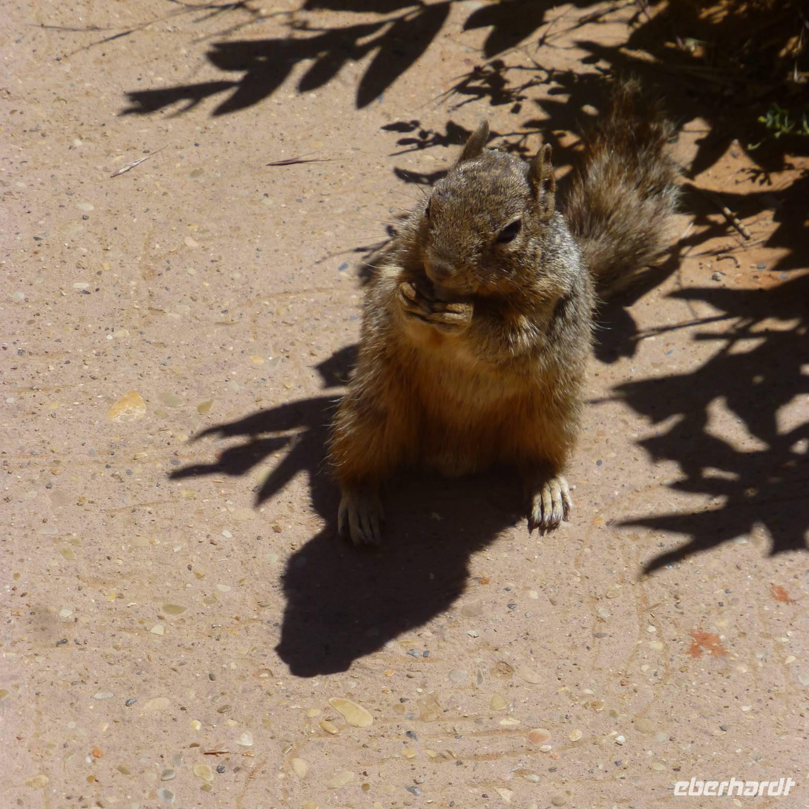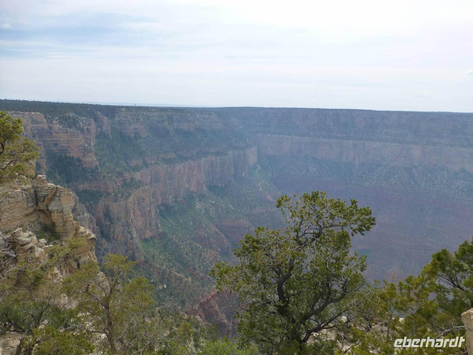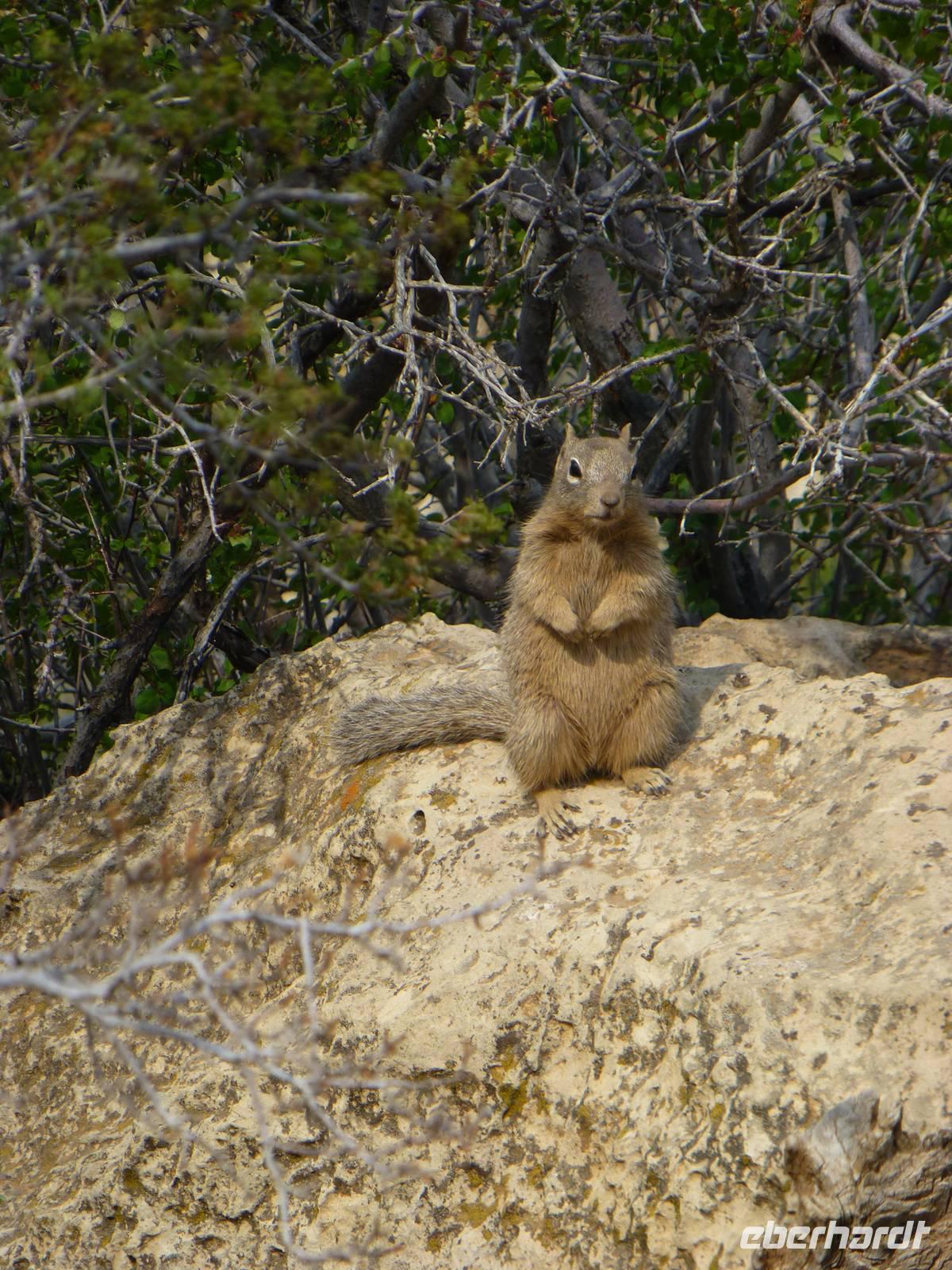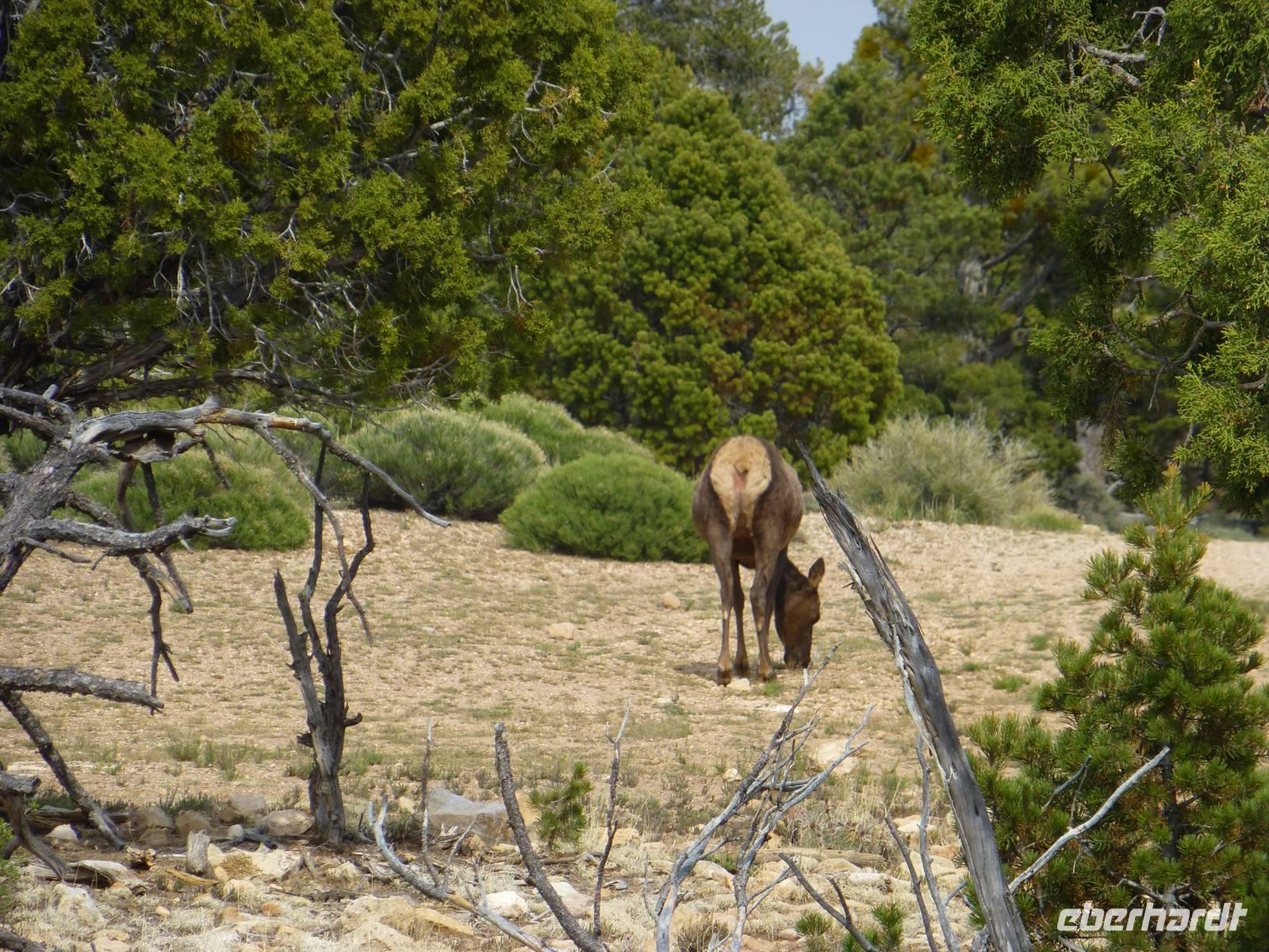Wir spazieren entlang des Rands und durch die Kurven eröffnen sich auch uns immer wieder neue Blicke über die Schlucht. Je länger wir hier sind, desto besser wird auch das Wetter und der Nebelschleier lichtet sich allmählich. Wir bekommen sogar einen Wapitit vor die Kameralinse, der sehr für Erheiterung sorgt...