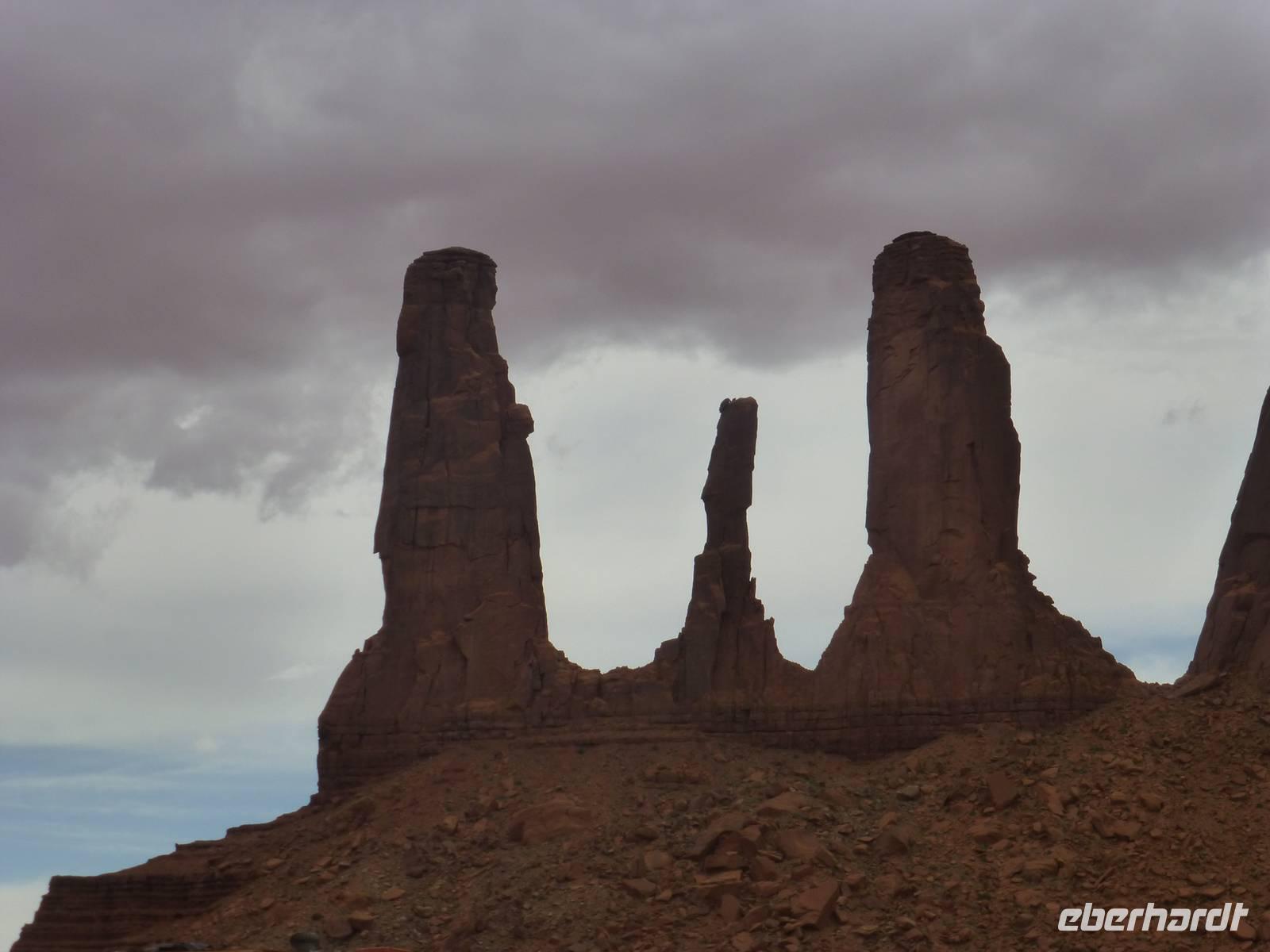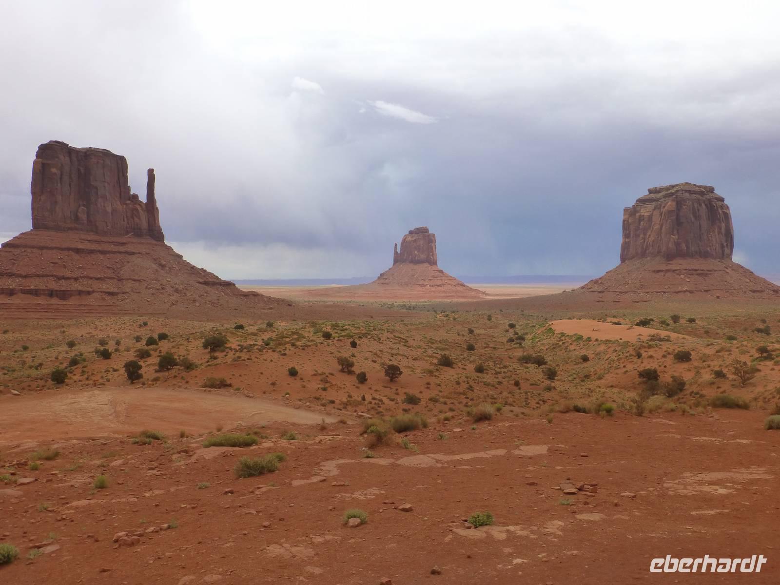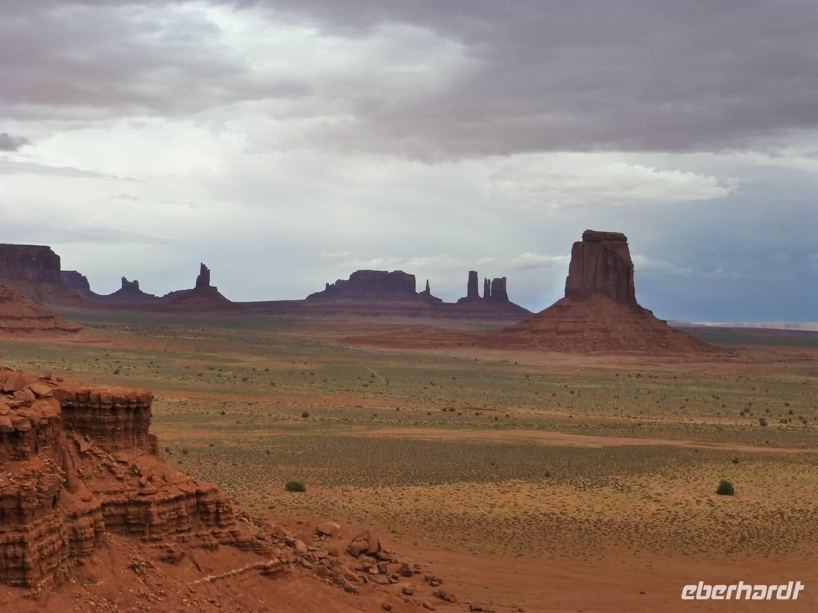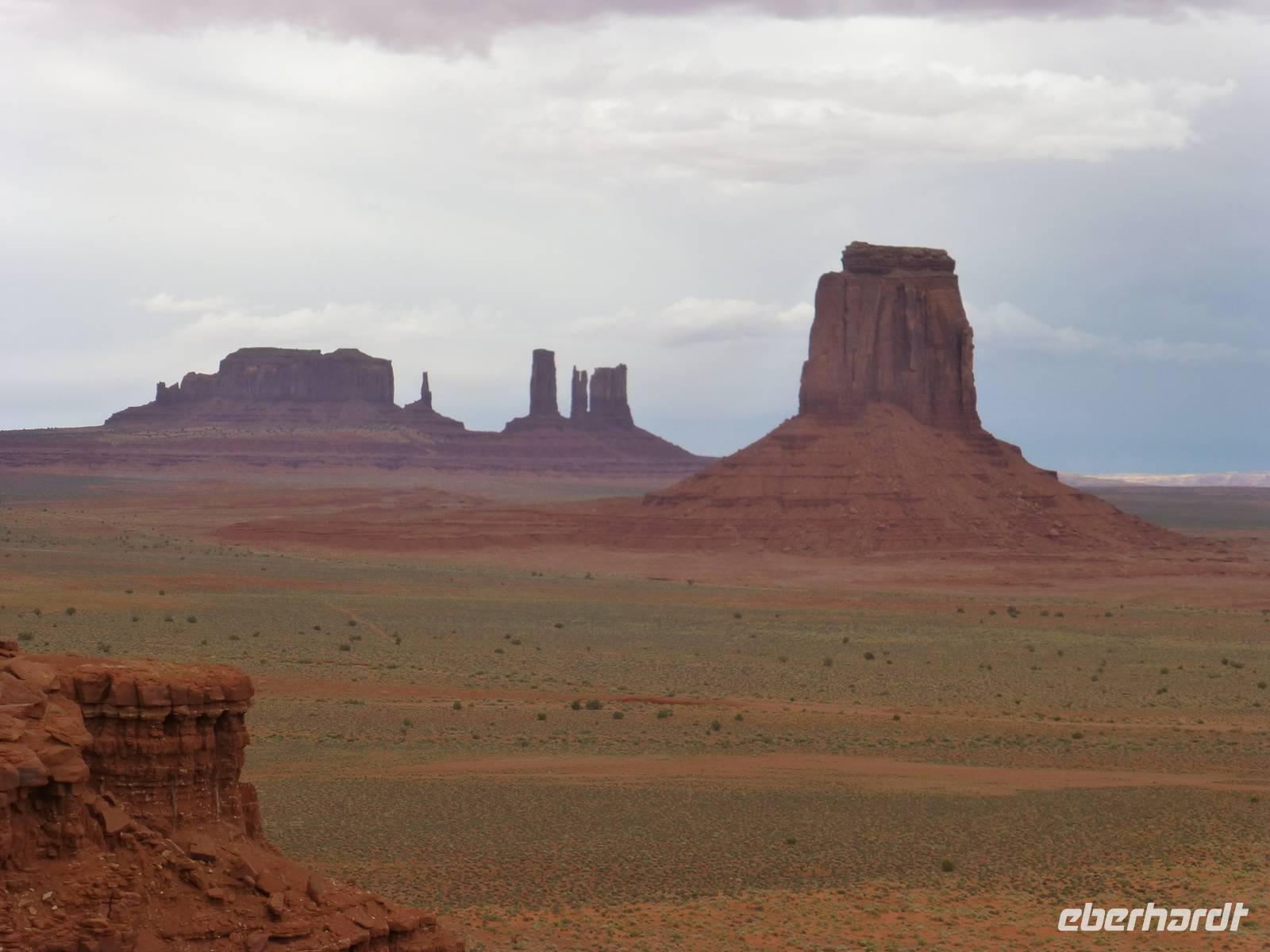 Nach nur einer Nacht packen wir schon wieder die Koffer und fahren erneut zum Grand Canyon Nationalpark. Da es heute kühler ist und die ersten Regentropfen vom Himmel fallen, ist die Sicht heute auf die Schlucht um einiges besser als am Vortag. Wir halten am Aussichtspunkt ¨Dessert View¨ und haben nun, natürlich nach dem ersten Gruppenfoto, Zeit, noch einmal ausreichend den Cran Canyon mit seiner roten Farbe zu fotografieren. Hier gibt es auch einen Aussichtsturm, den wir besteigen und von wo man aus eine noch bessere Aussicht hat. Dann geht es weiter und wir stellen die Uhr um eine Stunden nach vor. Kurz hinter dem Bundesstaatenschild ¨Utah¨ biegen wir zum Nationalpark ¨Monument Valley¨ ab. Es regnet zwar noch aber wir lassen uns nicht entmutigen und steigen auf die offenen Jeeps der Navajo-Indianer um. Bergabwärts geht erstmal unsere Tour und wir fahren vorbei an den ¨Drei Schwestern¨, dem ¨Elefanten¨ und dem ¨Kamelrücken¨. Unser erster Stopp ist an einem Picknickplatz, an dem uns die Frauen der Indianer zum Mittagessen erwarten. Es gibt Tacos (vom Leipziger Hauptbahnhof;-)) mit Bohnen, Käse, Tomaten, Salat und Zwiebeln. Dazu werden Kaffee und Wasser gereicht - natürlich stilecht von Metallgeschirr. Gestärkt schwingen wir uns wieder auf die Jeeps und unternehmen nun eine Rundfahrt durch das Tal - mit diversen Fotostopps inklusive. So haben wir die Chance, wunderschöne Bilder von den roten Steinen in ihren verschiedenen Formen zu machen. Es ist einfach wunderschön hier, unbeschreiblich und für mich persönlich ist der Anblick der Felsformationen noch schöner als die Schlucht vom morgen. Am Ende halten wir noch am Lieblingsplatz von John Ford, der hier auch Filme mit John Wayne gedreht hat. Der Felsen erinnert uns doch stark an die Marlboro-Werbung und tatsächlich reitet besagter Reiter an die Stelle und lässt sich von uns fotografieren. Nach rund zweieinhalb Stunde ist unser Ausflug in das Monument Valley leider schon wieder zu Ende und wir steigen zu Brian in den Bus um. Nun haben wir mehr als zwei Stunden Fart vor uns, bevor wir unser nächstes Ziel, das kleine amerikanische Örtchen Moab erreichen. Da es jetzt schon ziemlich spät geworden ist, gehen wir gleich zum Abendessen ins Restaurant ¨Eddie McStiff¨. Typisch amerikanisch ist es sehr laut in dem Restaurant aber das gehört nun ma dazu. In einem anderen Raum spielt eine 3-Mann-Combo Western-Musik. Nach dem Abendessen fahren wir weiter zu unseren wunderschönen 3-Sterne-Hotel ¨Archway Inn¨ und freuen uns sehr auf unser Bett.