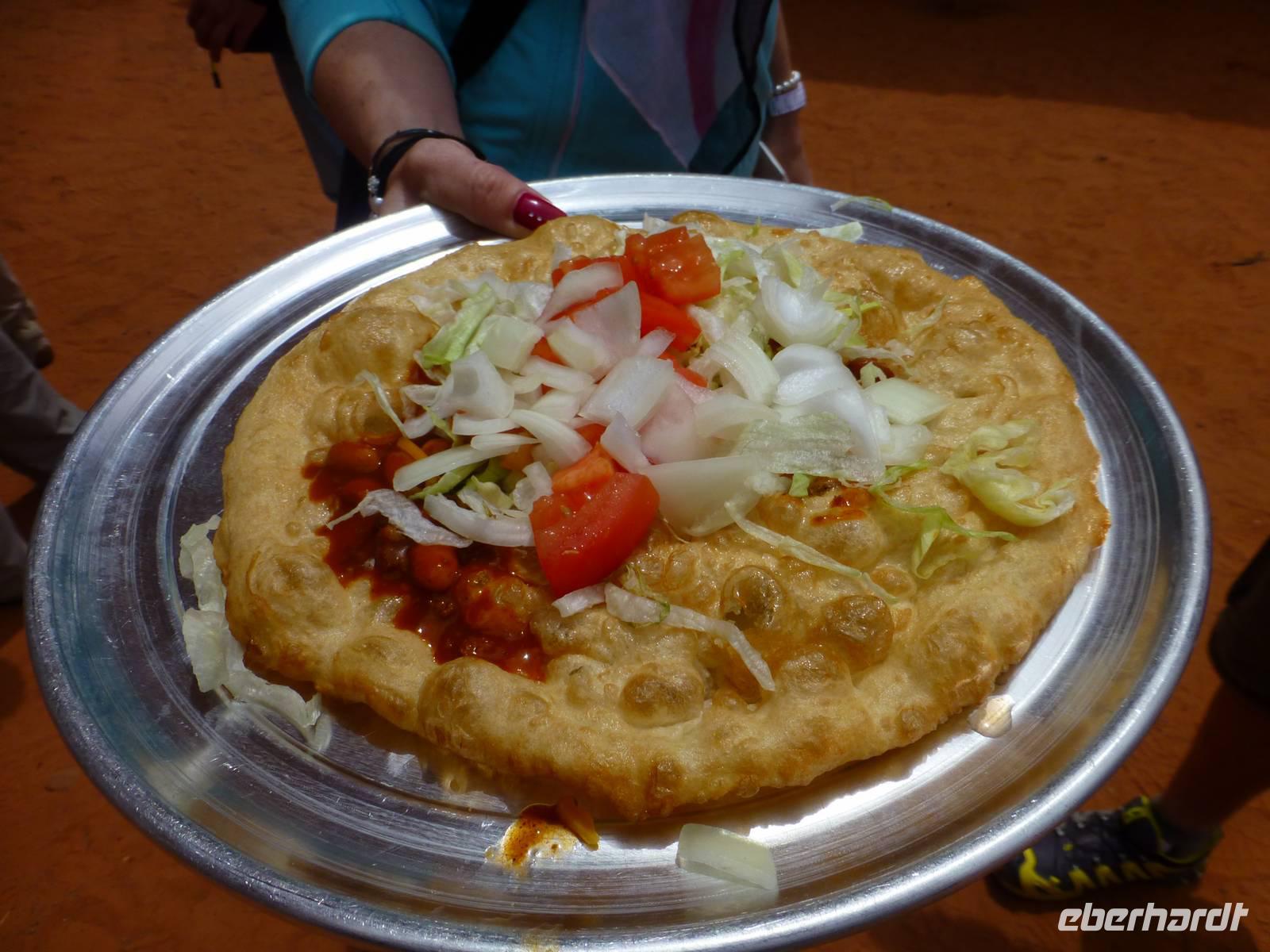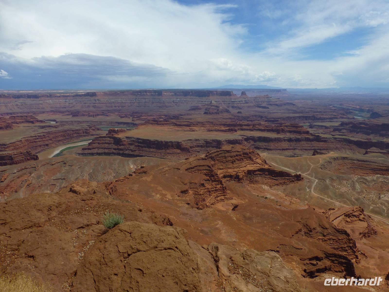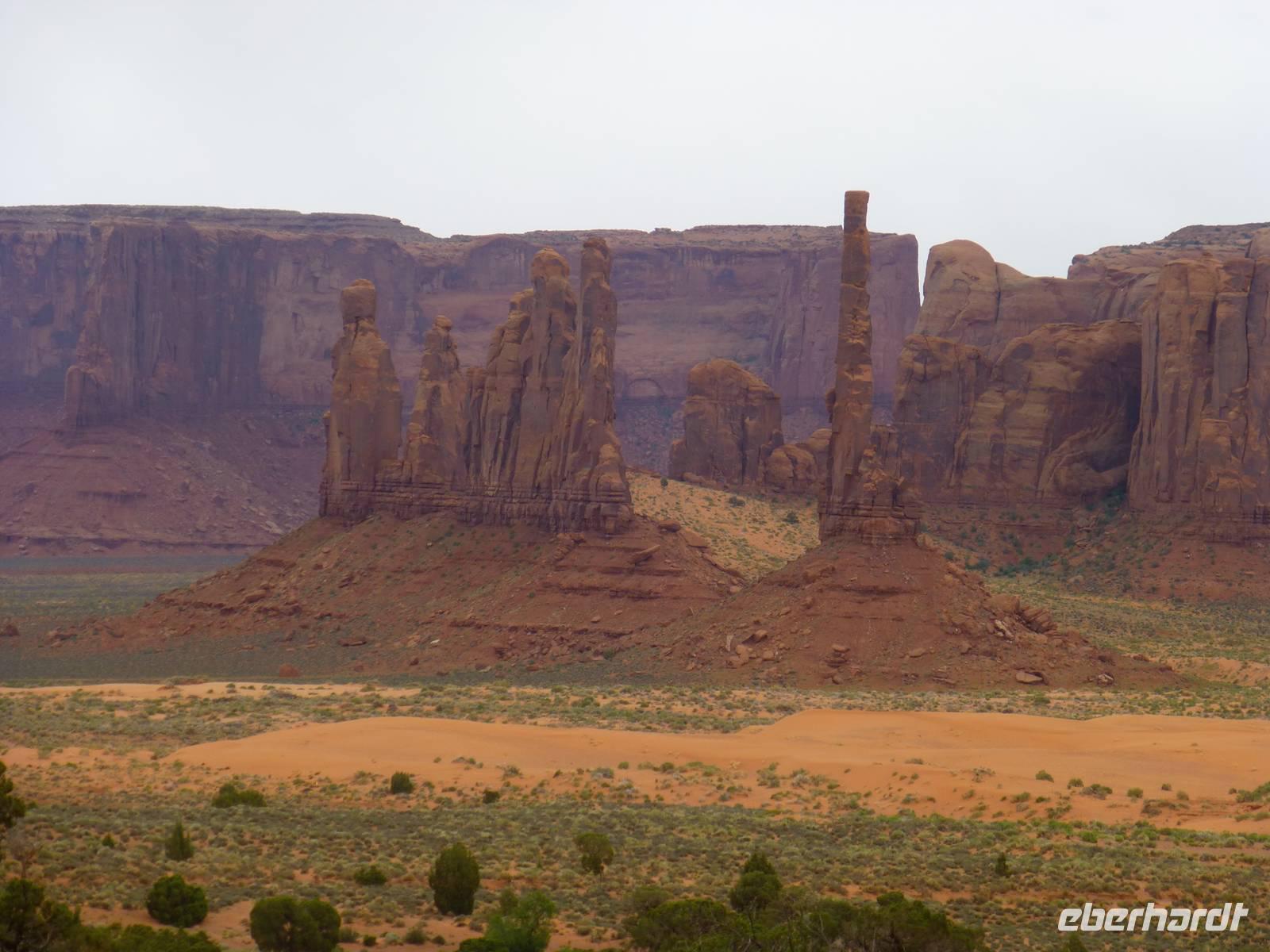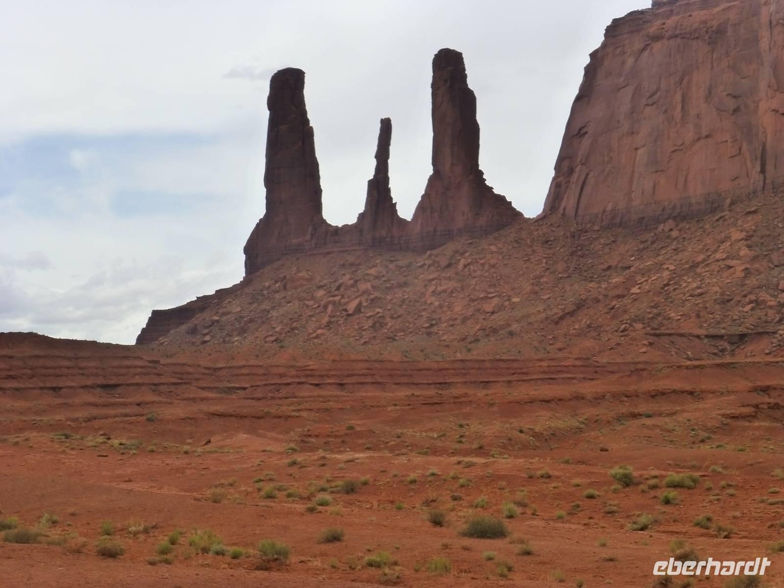 Nach nur einer Nacht packen wir schon wieder die Koffer und fahren erneut zum Grand Canyon Nationalpark. Da es heute kühler ist und die ersten Regentropfen vom Himmel fallen, ist die Sicht heute auf die Schlucht um einiges besser als am Vortag. Wir halten am Aussichtspunkt ¨Dessert View¨ und haben nun, natürlich nach dem ersten Gruppenfoto, Zeit, noch einmal ausreichend den Cran Canyon mit seiner roten Farbe zu fotografieren. Hier gibt es auch einen Aussichtsturm, den wir besteigen und von wo man aus eine noch bessere Aussicht hat. Dann geht es weiter und wir stellen die Uhr um eine Stunden nach vor. Kurz hinter dem Bundesstaatenschild ¨Utah¨ biegen wir zum Nationalpark ¨Monument Valley¨ ab. Es regnet zwar noch aber wir lassen uns nicht entmutigen und steigen auf die offenen Jeeps der Navajo-Indianer um. Bergabwärts geht erstmal unsere Tour und wir fahren vorbei an den ¨Drei Schwestern¨, dem ¨Elefanten¨ und dem ¨Kamelrücken¨. Unser erster Stopp ist an einem Picknickplatz, an dem uns die Frauen der Indianer zum Mittagessen erwarten. Es gibt Tacos (vom Leipziger Hauptbahnhof;-)) mit Bohnen, Käse, Tomaten, Salat und Zwiebeln. Dazu werden Kaffee und Wasser gereicht - natürlich stilecht von Metallgeschirr. Gestärkt schwingen wir uns wieder auf die Jeeps und unternehmen nun eine Rundfahrt durch das Tal - mit diversen Fotostopps inklusive. So haben wir die Chance, wunderschöne Bilder von den roten Steinen in ihren verschiedenen Formen zu machen. Es ist einfach wunderschön hier, unbeschreiblich und für mich persönlich ist der Anblick der Felsformationen noch schöner als die Schlucht vom morgen. Am Ende halten wir noch am Lieblingsplatz von John Ford, der hier auch Filme mit John Wayne gedreht hat. Der Felsen erinnert uns doch stark an die Marlboro-Werbung und tatsächlich reitet besagter Reiter an die Stelle und lässt sich von uns fotografieren. Nach rund zweieinhalb Stunde ist unser Ausflug in das Monument Valley leider schon wieder zu Ende und wir steigen zu Brian in den Bus um. Nun haben wir mehr als zwei Stunden Fart vor uns, bevor wir unser nächstes Ziel, das kleine amerikanische Örtchen Moab erreichen. Da es jetzt schon ziemlich spät geworden ist, gehen wir gleich zum Abendessen ins Restaurant ¨Eddie McStiff¨. Typisch amerikanisch ist es sehr laut in dem Restaurant aber das gehört nun ma dazu. In einem anderen Raum spielt eine 3-Mann-Combo Western-Musik. Nach dem Abendessen fahren wir weiter zu unseren wunderschönen 3-Sterne-Hotel ¨Archway Inn¨ und freuen uns sehr auf unser Bett.
