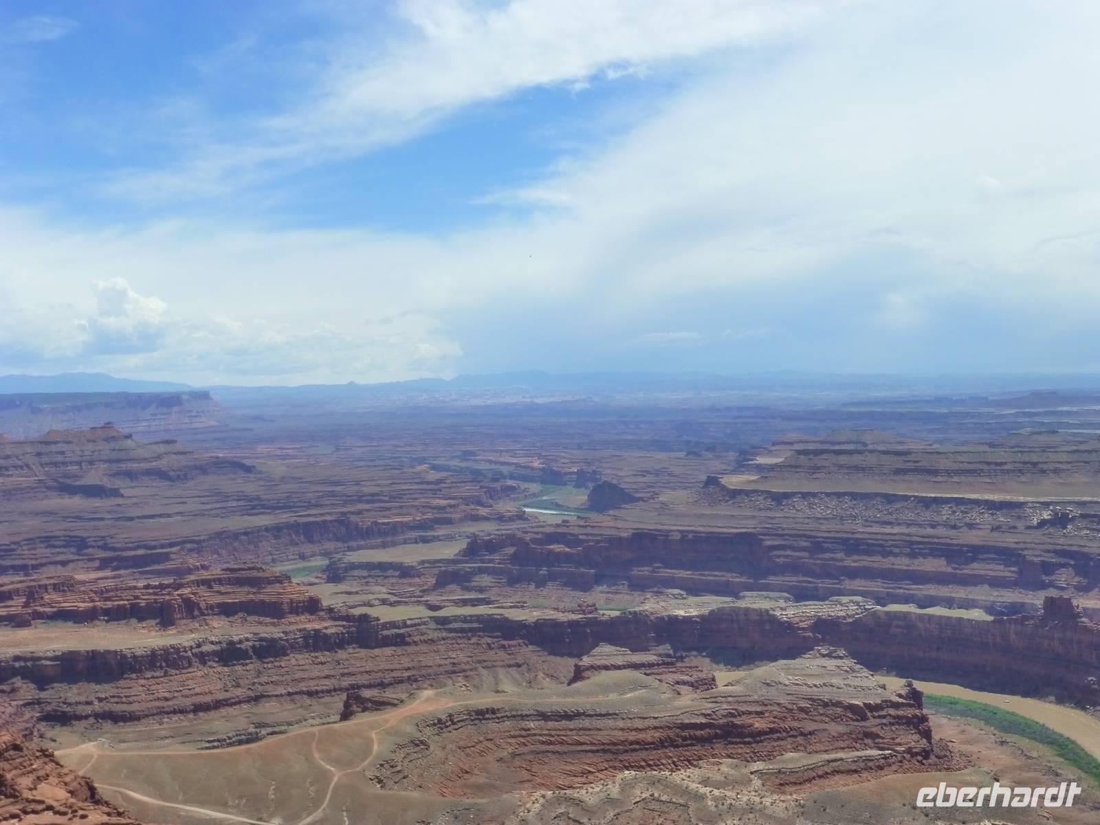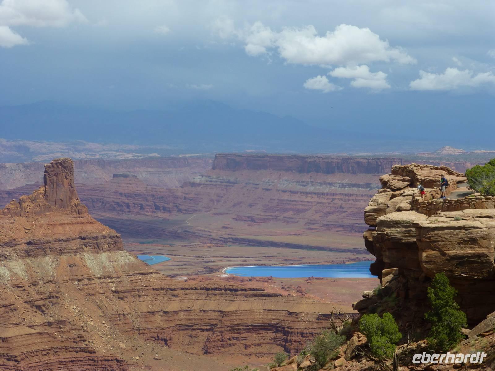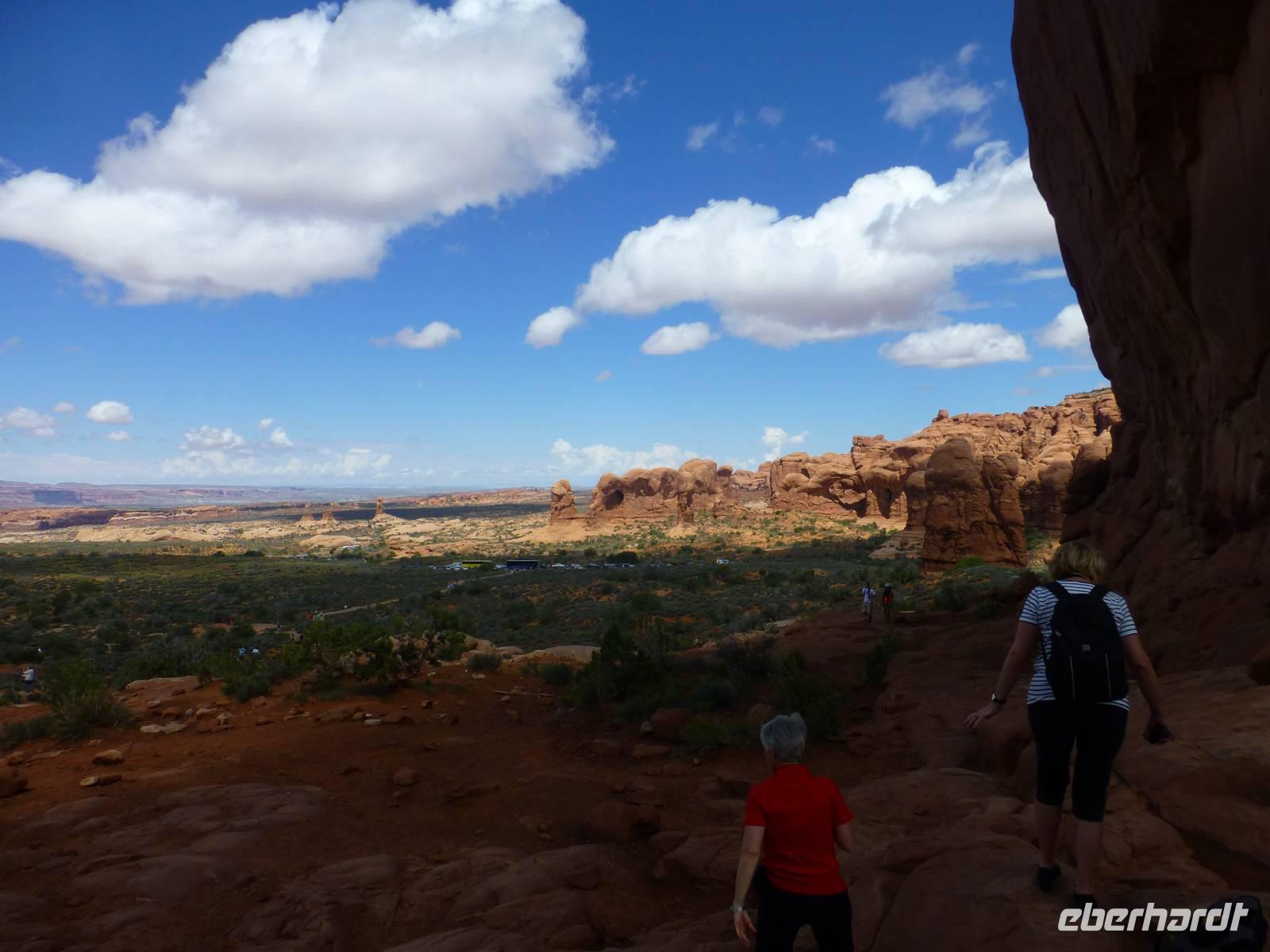 Ein weiteres Naturschauspiel steht heute auf unserem Programm - der Arches-Nationalpark. Unser erster Halt führt uns zum Landscape Arch, wo wir eine kleine Wanderung übernehmen. Das Wetter ist herrlichst, blauer Himmel und Sonnenschein. So bestrahlen die Sonnenstrahlen die Felsformationen im wunderschönen orang an. Die leichte Wanderung führt uns über einen leicht unebenen Weg und weiter bis zu einer Parkbucht, an der unser Fahrer Brian bereits auf uns wartet. Weiter fahren wir zu den sogenannten Windows. Hier haben wir wieder Gelegenheit die Felslandschaft zu erwandern...war wir natürlich auch tatkräftig tun. Zunächst die eine Seite, dann die andere. Die Felsformationen und Fenster sind so beeindruckend, dass wir gar nicht wissen, wo wir zuerst hingucken oder was wir als erstes fotografieren sollen. Dann geht es gegen Nachmittag weiter zu den Canyonlands, eine ebenfalls beeindruckende Naturlandschaft. Zunächst lade ich meine Gäste zu einem kleinen Picknick ein. Bei frischen Dunkelbrot, Trauben, Wurst und Käse sowie Bier stärken wir uns. Danach gehen wir zu einem Aussichtspunkt über den wir einen Großteil des Canyonlands überblicken können. Sogar der Colorado-River ist gut sichtbar für uns. Bevor wir den Naturpark dann wieder verlassen, halten wir noch am Visitorcenter für einen weiteren Fotostopp. Endlich mal nicht allzu spät erreichen wir wieder unser Hotel in Moab um uns für den Abend zurecht zu machen. Brian und Marguerite bringen uns in das Zentrum von Moab und wir haben ein wenig Zeit, die Stadt zu entdecken. Die Hauptstraße ist schon so typisch amerikanisch mit vielen Bars und noch mehr Souvenirläden. Wir werden im Restaurant "Moab Grill" erwartet. Es gibt, mal wieder, Steak. Danach spazieren wir entlang der Hauptstraße zu einer Open-Comedy-Western-Show. Da sie auf englischer Sprache ist, verstehen meine Gäste leider nicht so viel aber auf irgendeine Art und Weise ist die Vorstellung doch sehr amüsant.