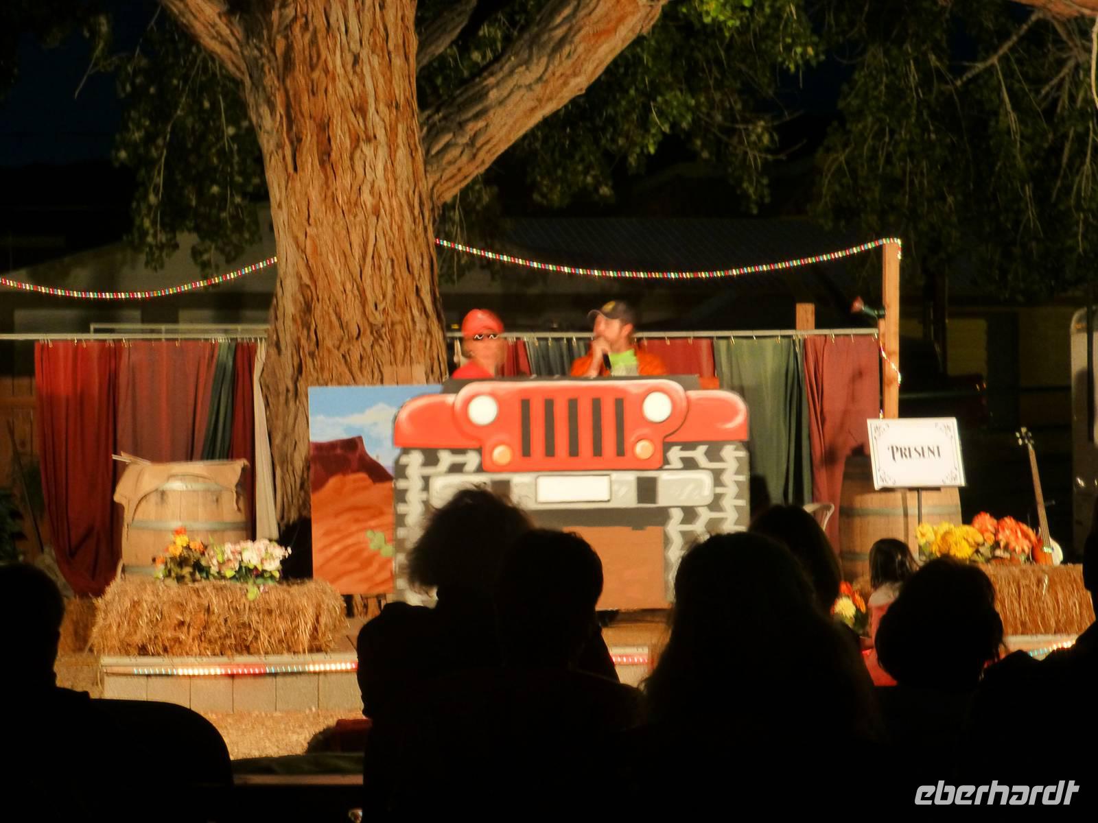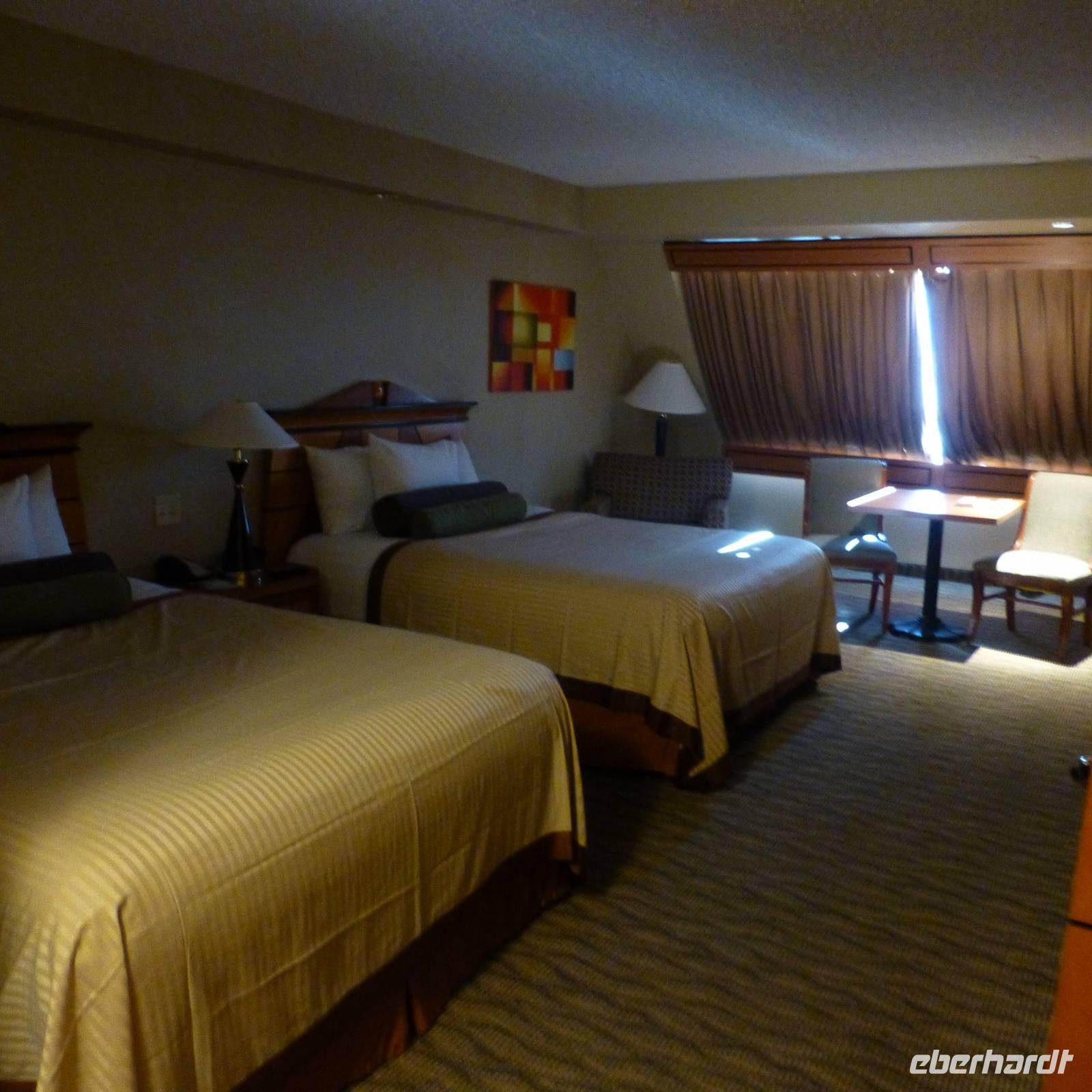 länger verweilt. Der Anstieg war gar nicht sooo schwer wie erwartet. Glücklich und zufrieden erreichen wir am am Nachmittag wieder das "Ruby's Inn" und wir checken ein. Die Zimmer sind sehr großzügig geschnitten und wir haben nun Zeit, uns frisch zu machen. Für das Abendessen haben wir zwei Wahlmöglichkeiten: entweder wir speisen im Hotelrestaurant oder aber, was auch fast alle meiner Gäste gemacht haben, eröffnet gg. 19:00 Uhr die hoteleigene Westernshow ihre Pforten. Zunächst einmal holen wir unser Abendessen am Buffet ab. Erstaunlich ist dabei, dass hier in diesem riesigen Saal rund 300 Personen sitzen aber die Mitarbeiter haben so ein cleveres System ausgetüffelt, dass alle ohne Drängeln und Schubsen innerhalb weniger Minuten ihr Essen auf dem Teller haben. Die Show an sich unterscheidet sich doch schon sehr von der gestrigen. Auf der Bühne steht eine Gruppe bestehend aus vier Musikanten, die die verschiedensten, auch eigen geschriebene, Songs im Western-/Country-Stil präsentieren. Auch dieser Abend ist sehr schön gestaltet und wir gehen satt sowie zufrieden nach der Show zurück zu unserem Hotel.