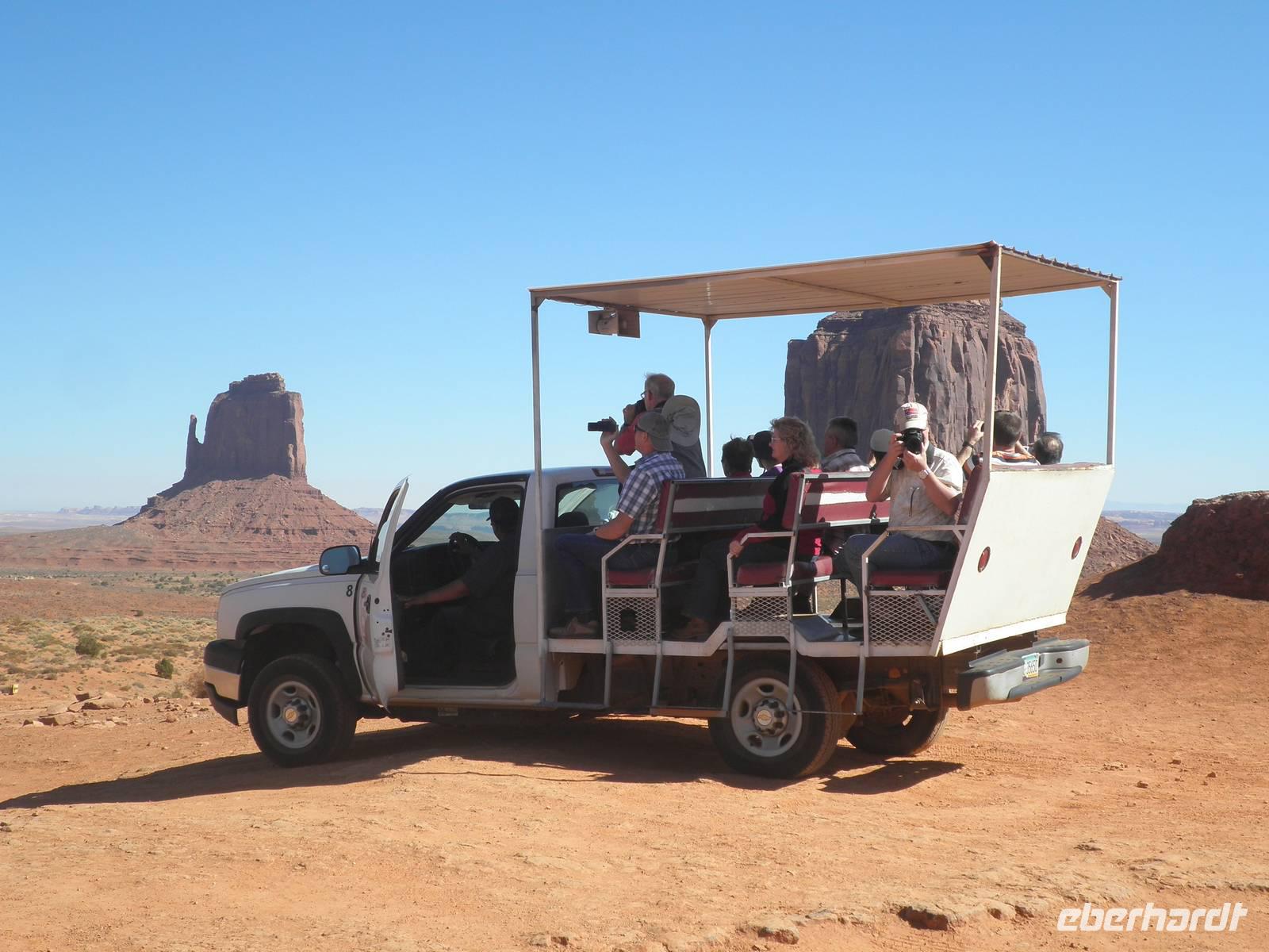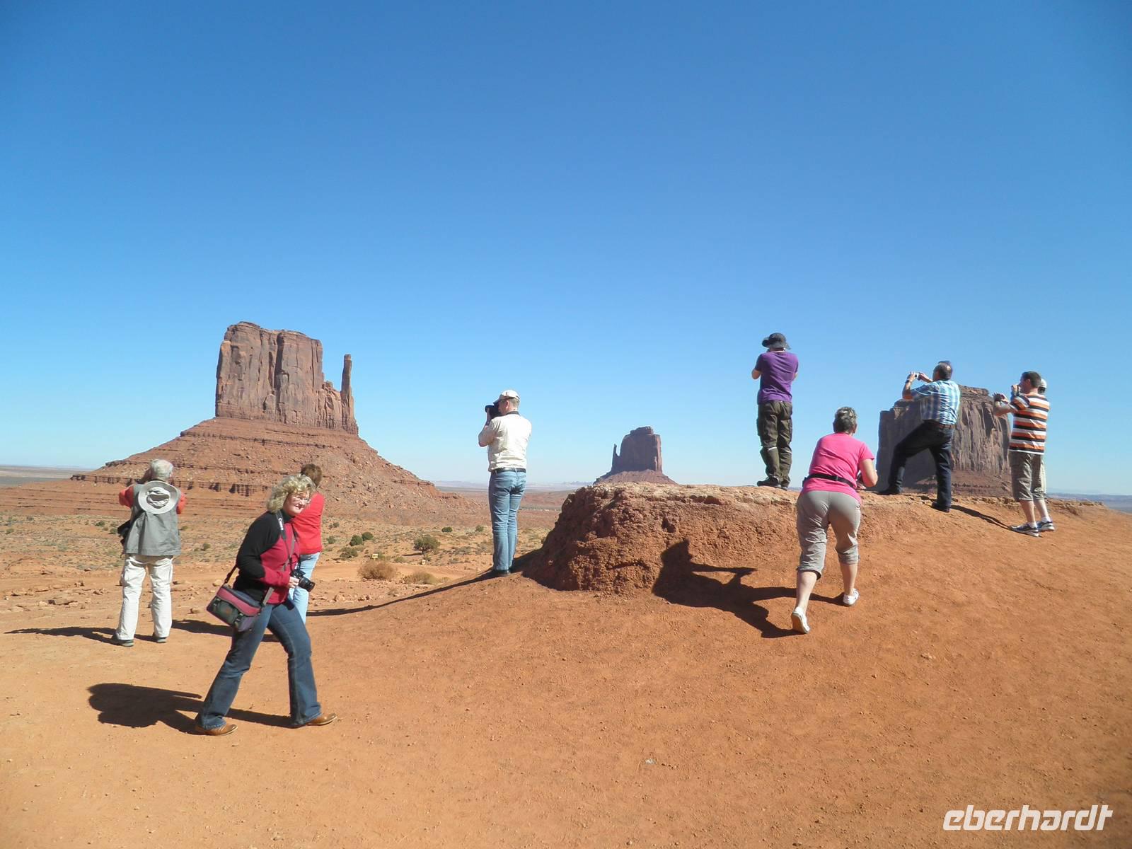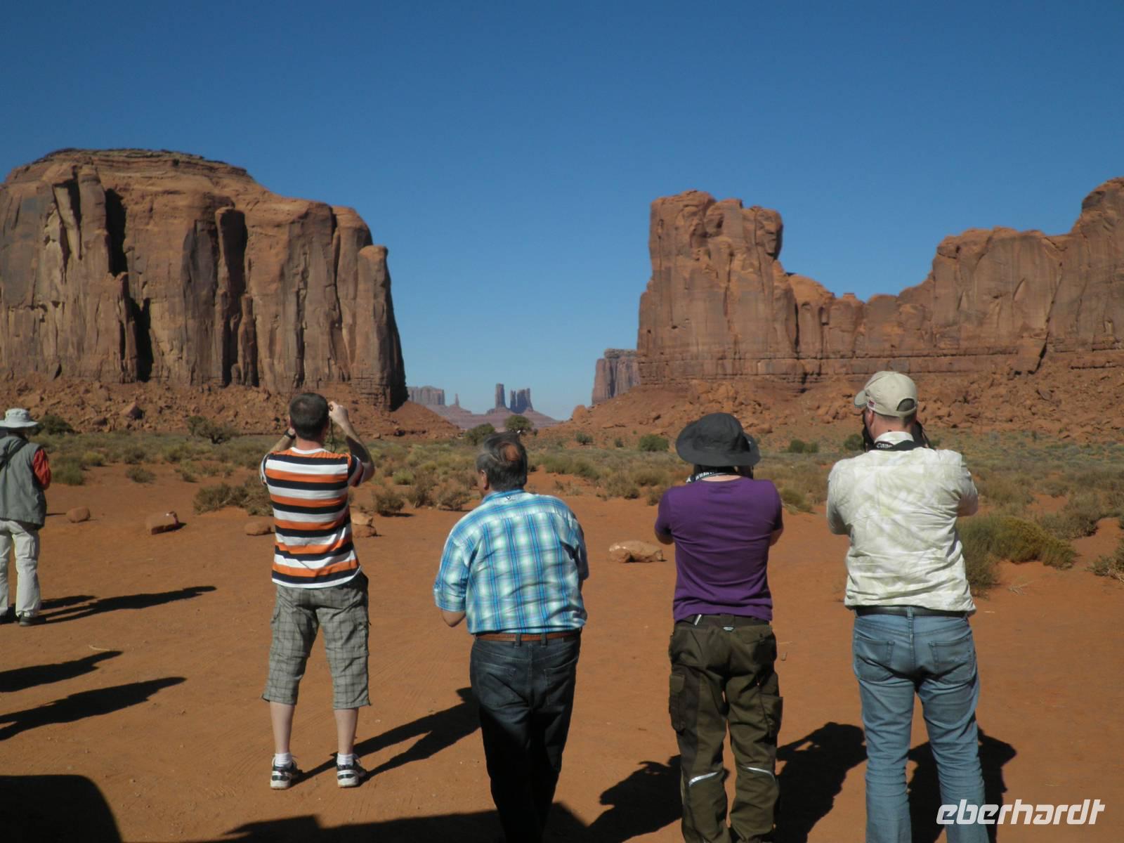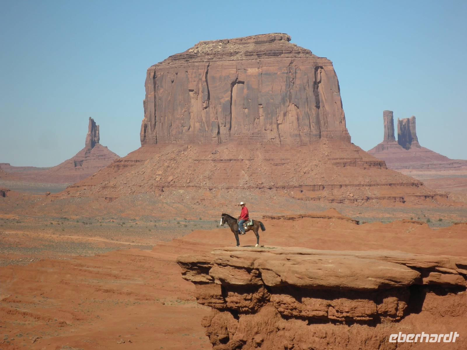Zunächst fuhren wir noch einmal hinein in den Nationalpark, um am Aussichtspunkt Desert View eine beeindruckende Aussicht in den Grand Canyon zu genießen. Danach fuhren wir in das Gebiet der Navajo-Indianer und bekamen einen kleinenEindruck davon, wie die Ureinwohner Amerikas heute leben. Unterwegs erzählte uns unsere Reiseleiterin Janny, wie sie von den ersten Europäern hier behandelt worden sind, wie sie in Reservate gesperrt worden waren. Unser nächster Aufenthalt an diesem Tag war im Monument Valley, sehr bekannt aus Westernfilmen und einer Zigarettenwerbung. Schon John Wayne saß hier hoch zu Ross auf einem der roten Felsen und blickte souverän in die Ferne. Auch wir kamen ganz nah an die Felsformationen heran, die durch Verwitterung im Laufe ewiger Zeiten die seltsamsten Formen angenommen haben. Mit Jeeps, die von Navajos gelenkt wurden, fuhren wir zwischen den Felsen hindurch und bestaunten zum Beispiel den Elefanten, das Kamel und die drei Schwestern, alles phantasievolle Namen für interessant geformte Felsen. Einer der Navajos zog sich für uns ein rotes Hemd an, setzte einen Cowboyhut auf den Kopf und galoppierte auf einem schwarzen Pferd auf eine Felsvorsprung, damit wir das bekannteste Motiv im Monument Valley selbst fotografieren konnten. Aber auch dieser Höhepunkt unserer Reise ging zu Ende und wir verließen das Monument Valley. In einem indianisch geführten Supermarkt kauften wir einen Imbiss ein und gingen wieder auf die Reise. Ein Hotel in Moab erwartete uns heute, dieses Mal für zwei Nächte. Wir wurden sehr freundlich begrüßt und wir bezogen unsere geräumigen Zimmer. viel Zeit verbrachten wir darin zunächst aber nicht, denn wir waren gleich wieder verabredet, um mit unserem Bus in den Ort Moab hineinzufahren. Ein typisch amerikanisches Abendessen mit Burger und Pommes erwartete uns in einem der zahlreichen Restaurants im Ort. Wir genossen ein entspanntes Abendessen und fuhren danach in unser Hotel zurück, um dem neuen Tag entgegen zu träumen.