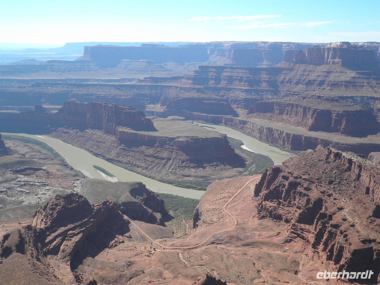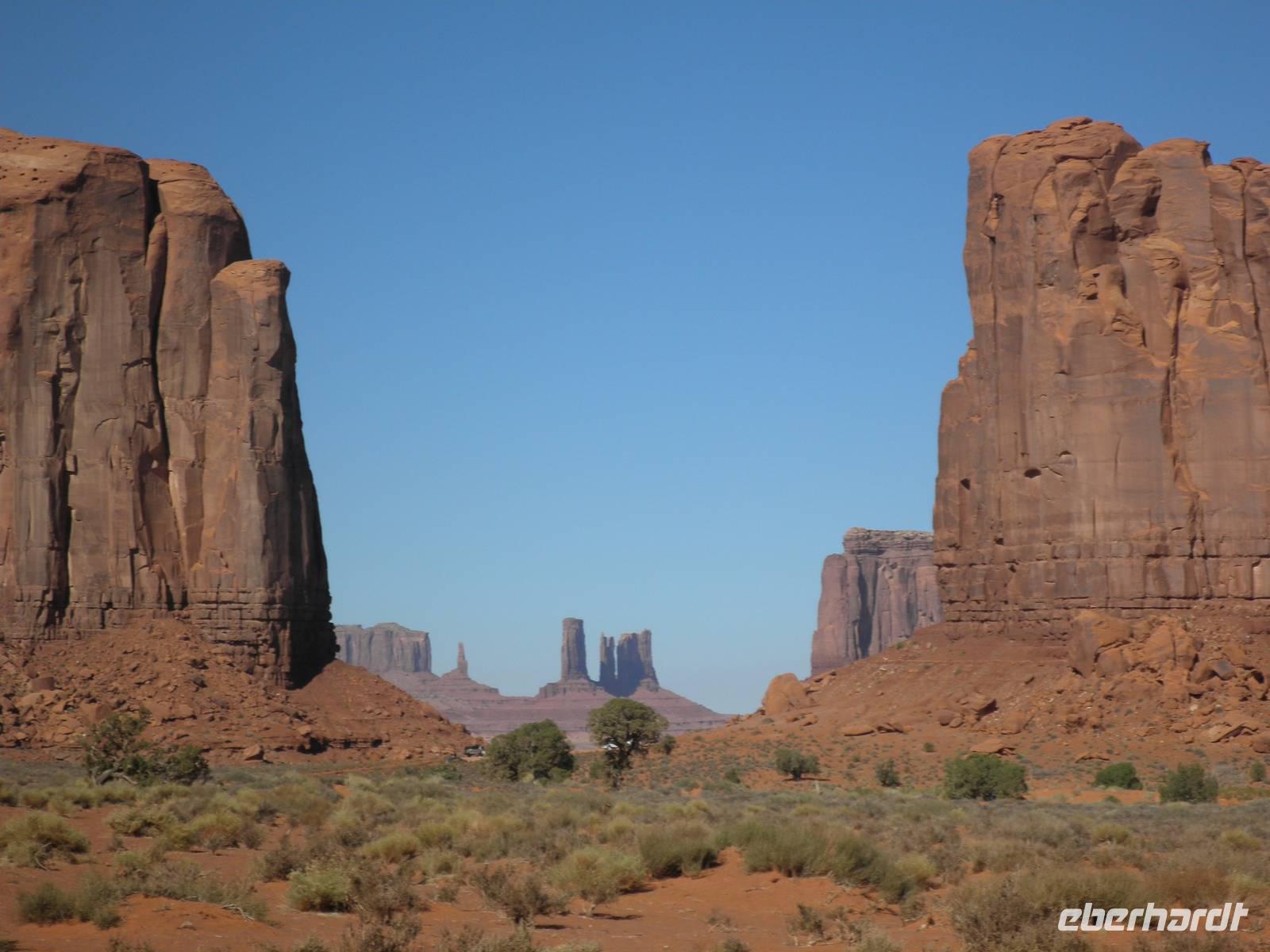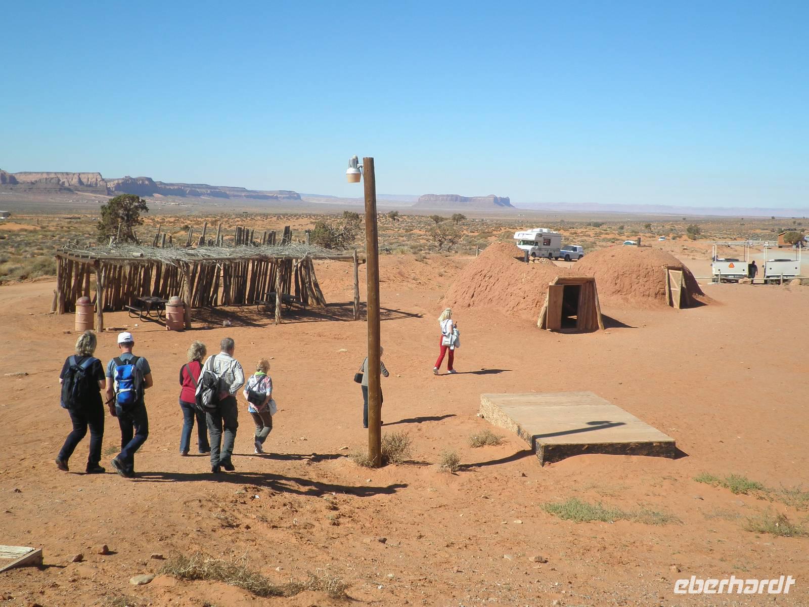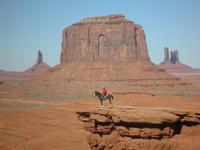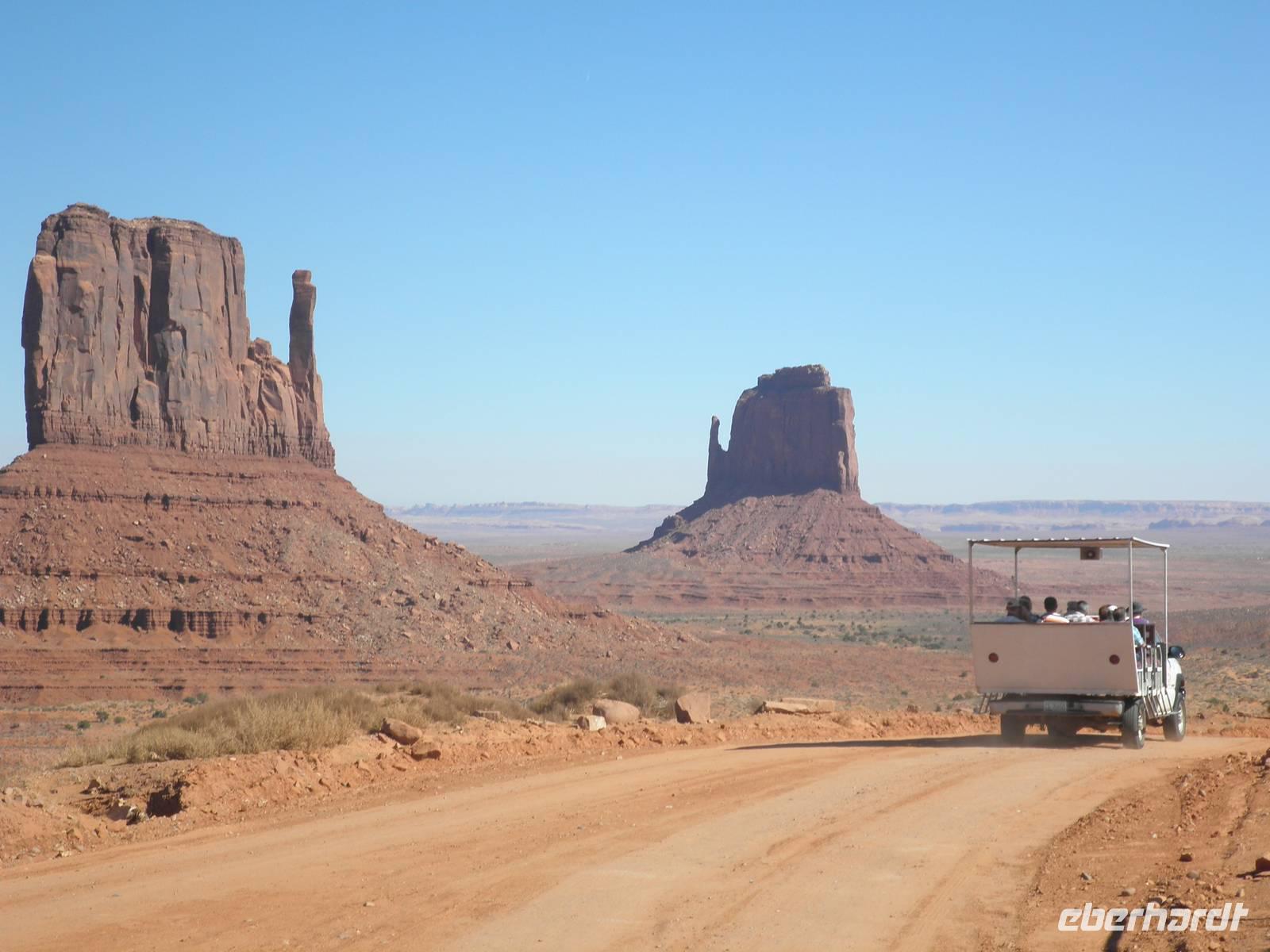 Zunächst fuhren wir noch einmal hinein in den Nationalpark, um am Aussichtspunkt Desert View eine beeindruckende Aussicht in den Grand Canyon zu genießen. Danach fuhren wir in das Gebiet der Navajo-Indianer und bekamen einen kleinenEindruck davon, wie die Ureinwohner Amerikas heute leben. Unterwegs erzählte uns unsere Reiseleiterin Janny, wie sie von den ersten Europäern hier behandelt worden sind, wie sie in Reservate gesperrt worden waren. Unser nächster Aufenthalt an diesem Tag war im Monument Valley, sehr bekannt aus Westernfilmen und einer Zigarettenwerbung. Schon John Wayne saß hier hoch zu Ross auf einem der roten Felsen und blickte souverän in die Ferne. Auch wir kamen ganz nah an die Felsformationen heran, die durch Verwitterung im Laufe ewiger Zeiten die seltsamsten Formen angenommen haben. Mit Jeeps, die von Navajos gelenkt wurden, fuhren wir zwischen den Felsen hindurch und bestaunten zum Beispiel den Elefanten, das Kamel und die drei Schwestern, alles phantasievolle Namen für interessant geformte Felsen. Einer der Navajos zog sich für uns ein rotes Hemd an, setzte einen Cowboyhut auf den Kopf und galoppierte auf einem schwarzen Pferd auf eine Felsvorsprung, damit wir das bekannteste Motiv im Monument Valley selbst fotografieren konnten. Aber auch dieser Höhepunkt unserer Reise ging zu Ende und wir verließen das Monument Valley. In einem indianisch geführten Supermarkt kauften wir einen Imbiss ein und gingen wieder auf die Reise. Ein Hotel in Moab erwartete uns heute, dieses Mal für zwei Nächte. Wir wurden sehr freundlich begrüßt und wir bezogen unsere geräumigen Zimmer. viel Zeit verbrachten wir darin zunächst aber nicht, denn wir waren gleich wieder verabredet, um mit unserem Bus in den Ort Moab hineinzufahren. Ein typisch amerikanisches Abendessen mit Burger und Pommes erwartete uns in einem der zahlreichen Restaurants im Ort. Wir genossen ein entspanntes Abendessen und fuhren danach in unser Hotel zurück, um dem neuen Tag entgegen zu träumen.