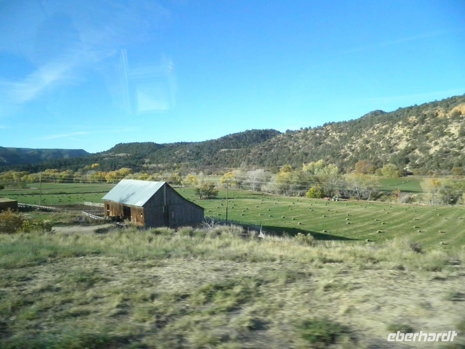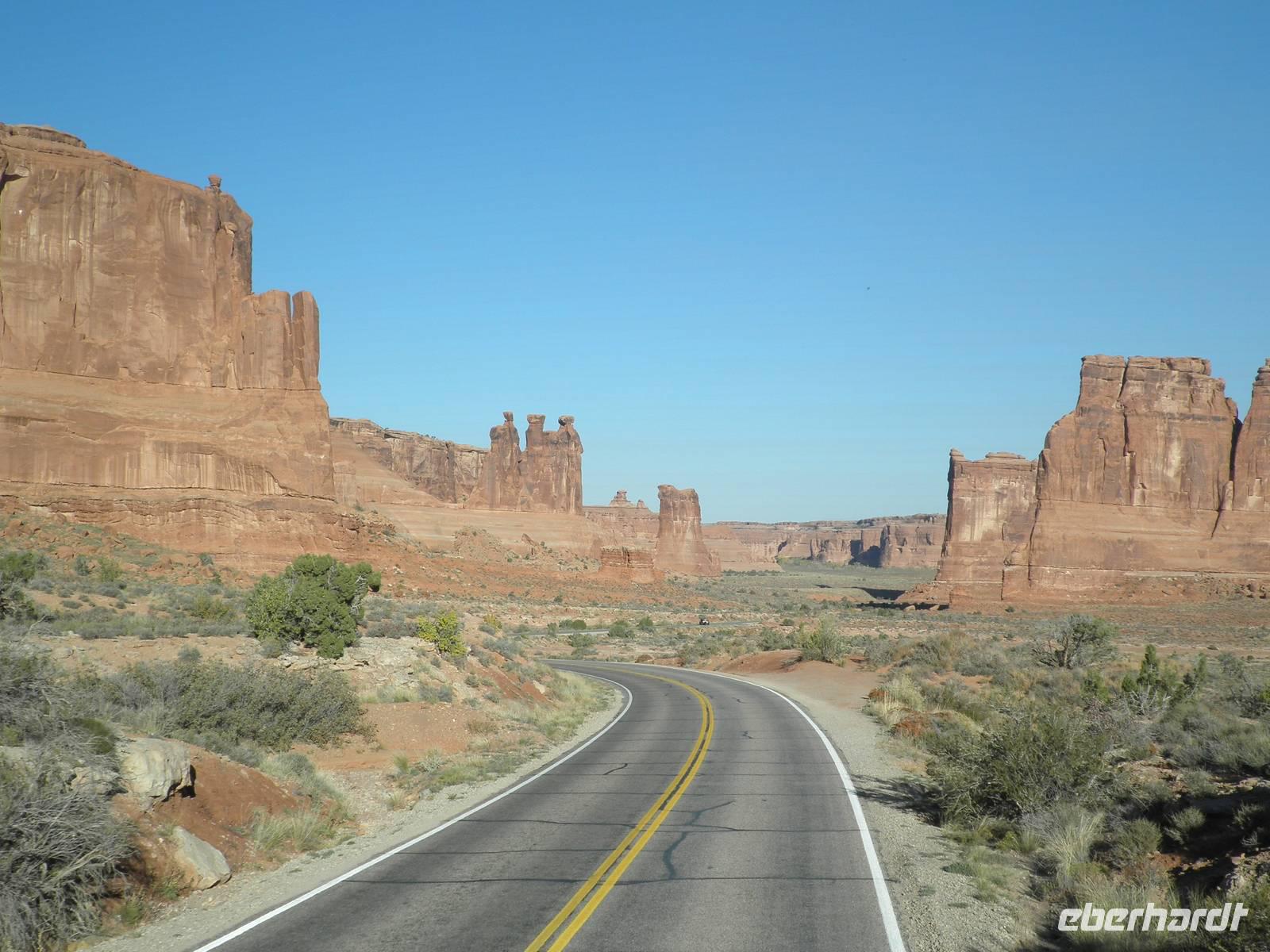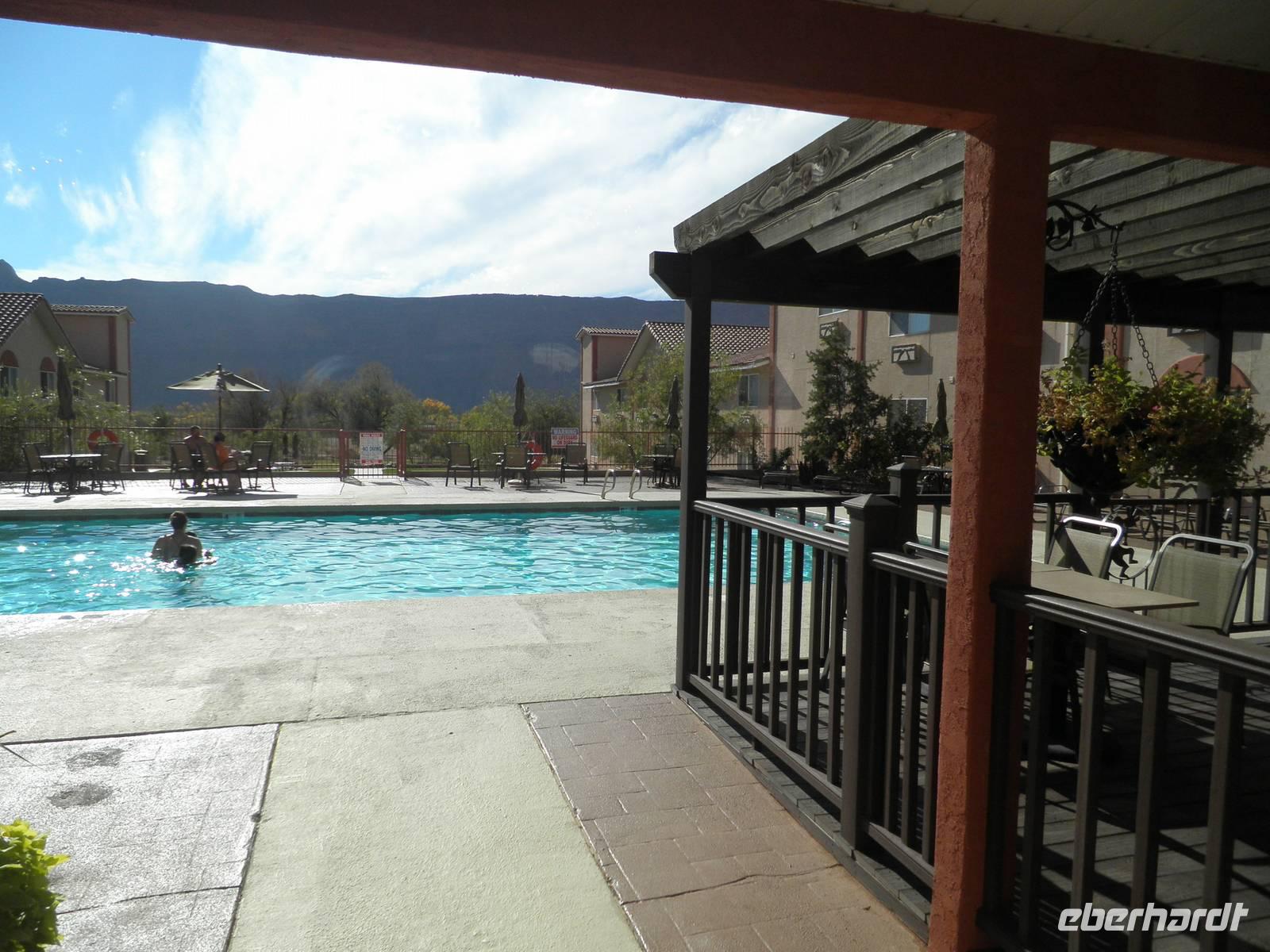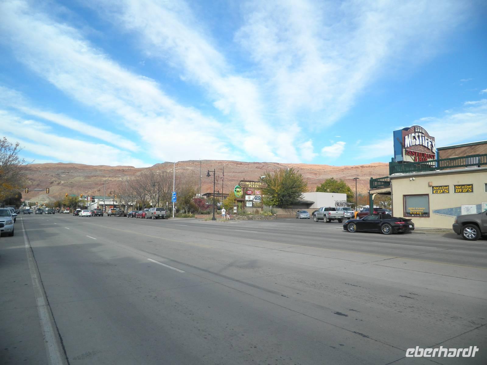 Unser Tag begann im Arches Nationalpark, wo wir außergewöhnliche Felsformationen entdecken konnten, die sehr oft die Form von offenen Bögen haben, eben wie Arkaden. Das Gestein hat zu großen Teilen eine rote Farbe. Die Verbindung mit dem Blau des klaren Himmels des heutigen Tages machte aus den auch "Windows" genannten Felsformationen wahre Kunstwerke. Wir spazierten durch diese phantastische Felslandschaft, staunten und machten wunderschöne Fotos. Gegen Mittag erreichten wir das Wahrzeichen des Bundesstaates Utah: Delicate Arch. hierbei handelt es sich um einen wunderbar ausgeprägten Felsbogen, durch den der blaue Himmel zu sehen war. Bei einem Fotostop konnten wir diesen Gesteinsbogen von ferne betrachten und fotografieren. Am Aussichtspunkt "Dead horse place" verbrachten wir unsere Mittagspause. Wir genossen einen fantastischen Ausblick auf ein Felsplateau, dass in einer Schleife des Colorao River einsam hinausragt. Laut Legende soll dort eine Herde Wildpferde hingetrieben worden sein, die später dort verendete. Auf einer Infotafel erfuhren wir, dass der Colorado etwa 15 Millionen Jahre gebracht hat, um sich so tief in das Felsplateau hineinzufressen. An diesem Tag kamen wir bereits am frühen Nachmittag in unser Hotel zurück. Einige nutzten die Zeit für etwas Erholung oder einen Spaziergang. Die meisten Teilnehmer unserer Gruppe nutzten das Angebot unserer Reiseleiterin Janny, mit dem Bus für ein bisschen Freizeit in die Stadt gefahren zu werden. Moab ist keine große Stadt, aber wir konnten durch kleine Geschäfte bummeln oder einen Kaffee in einem der zahlreichen kleinen Restaurants genießen. Am Abend erwartete uns ein zünftiges Steak in einem Grillrestaurant in Moab. Extra für uns war eine Gruppe Cowboys gekommen, um uns mit Live gespielter Countrymusik zu unterhalten. Das war ein sehr unterhaltsamer Abend. Einige Gäste schwammen zum Abschluss dieses schönen Tages noch im wohltemperierten Hotelpool ein paar Bahnen.